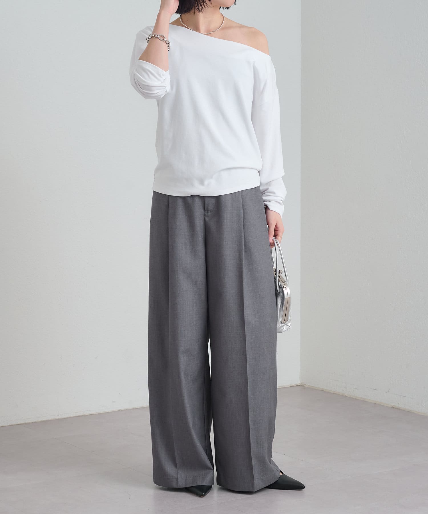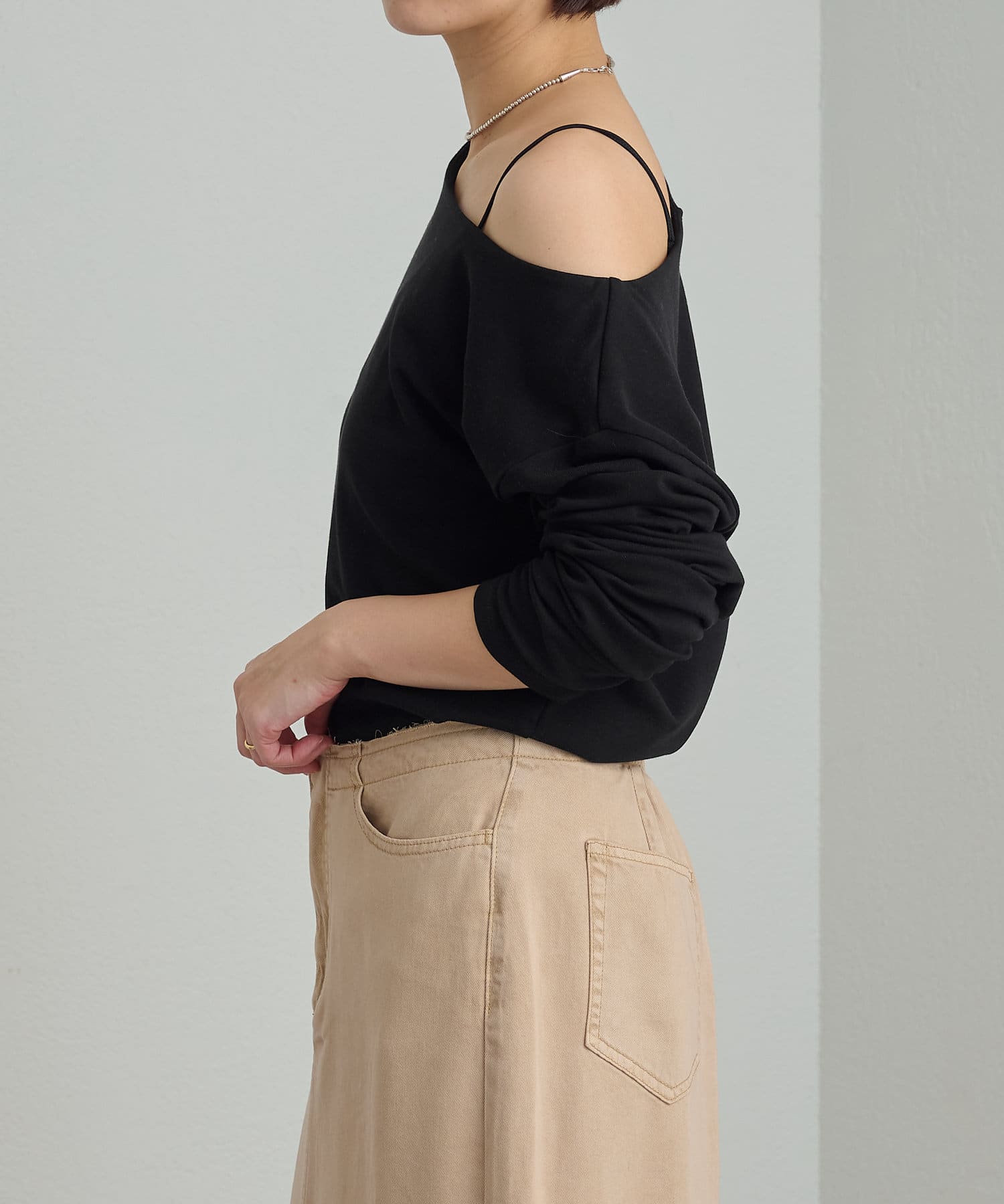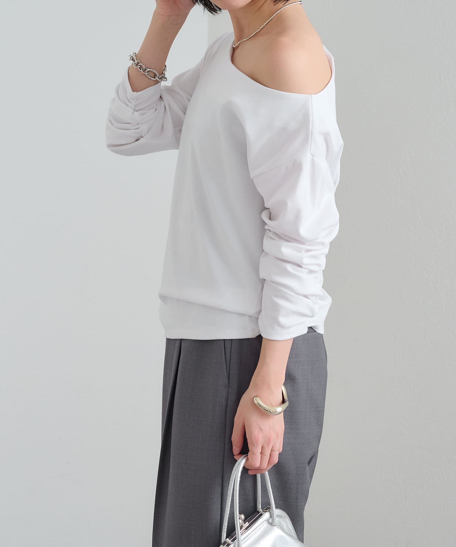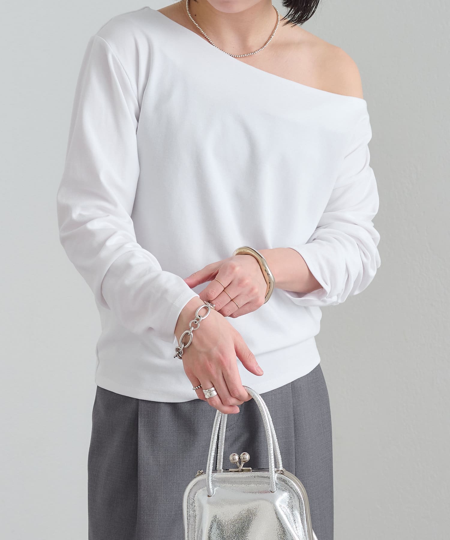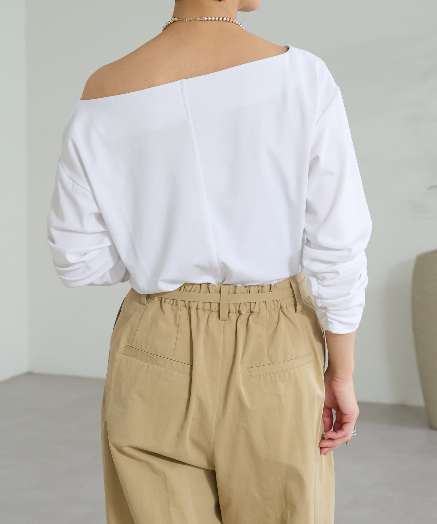 ・ネックの開きを調整することが出来るので、オフショルやボートネックなどその日の気分に合わせて着こなせます。