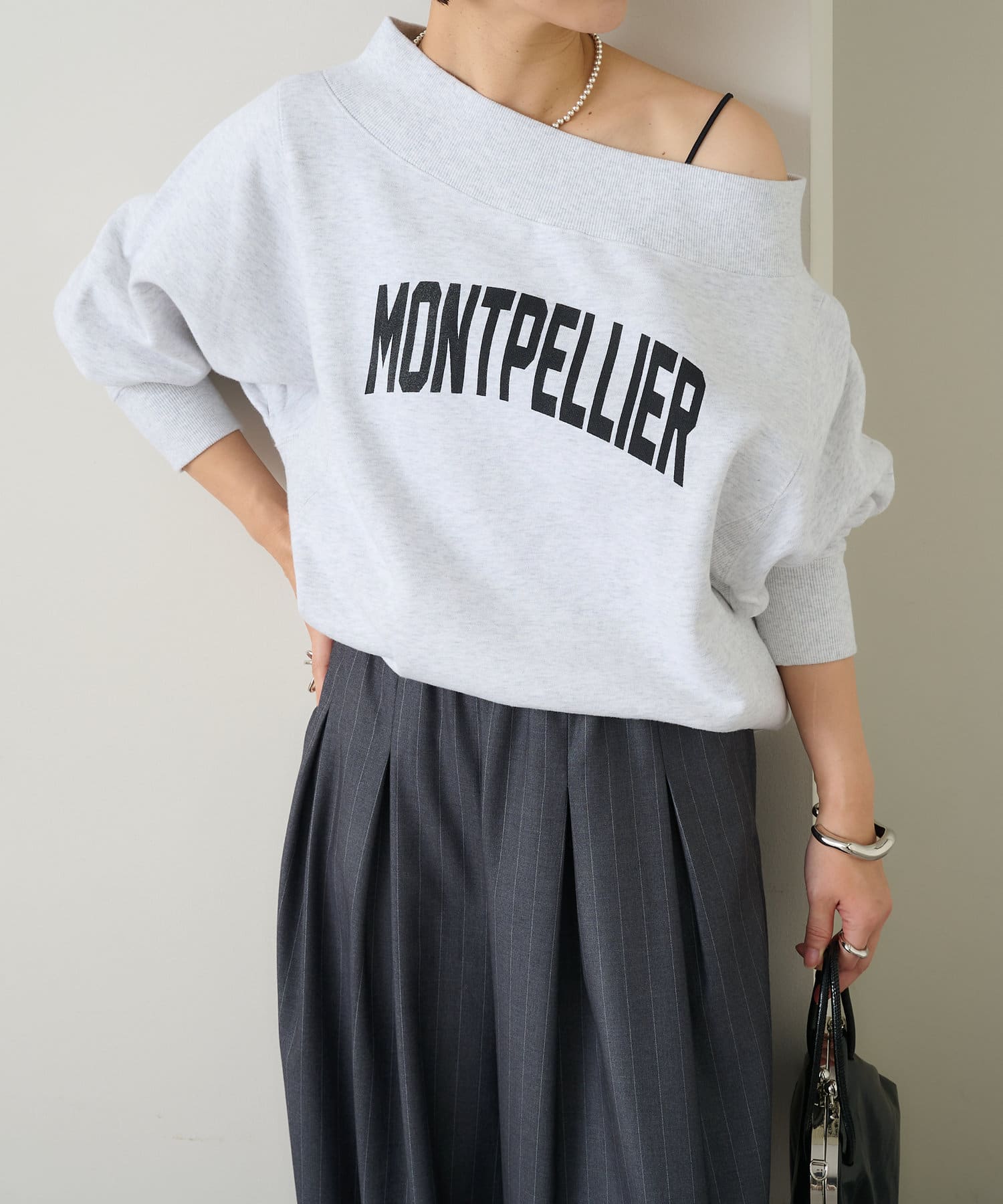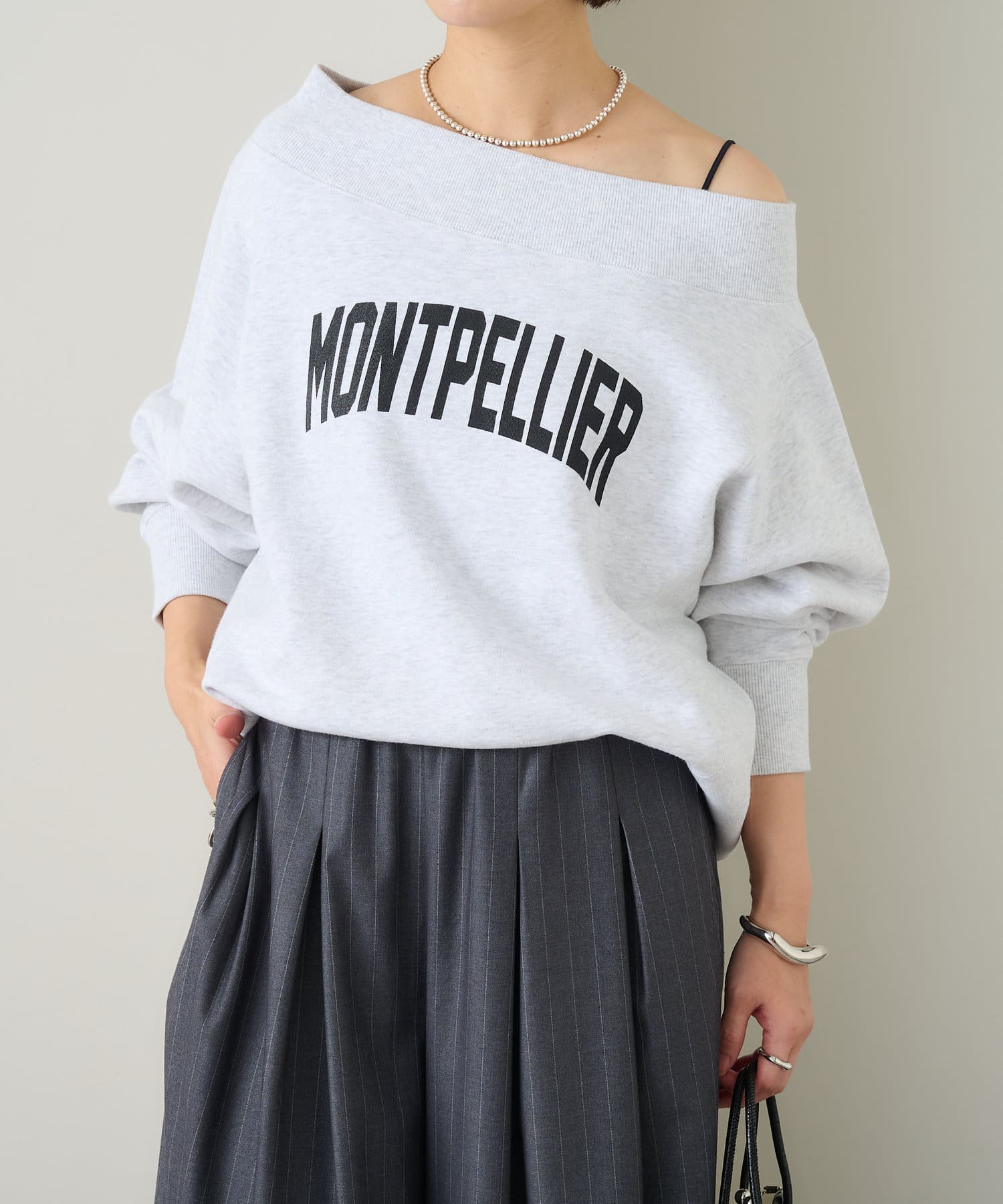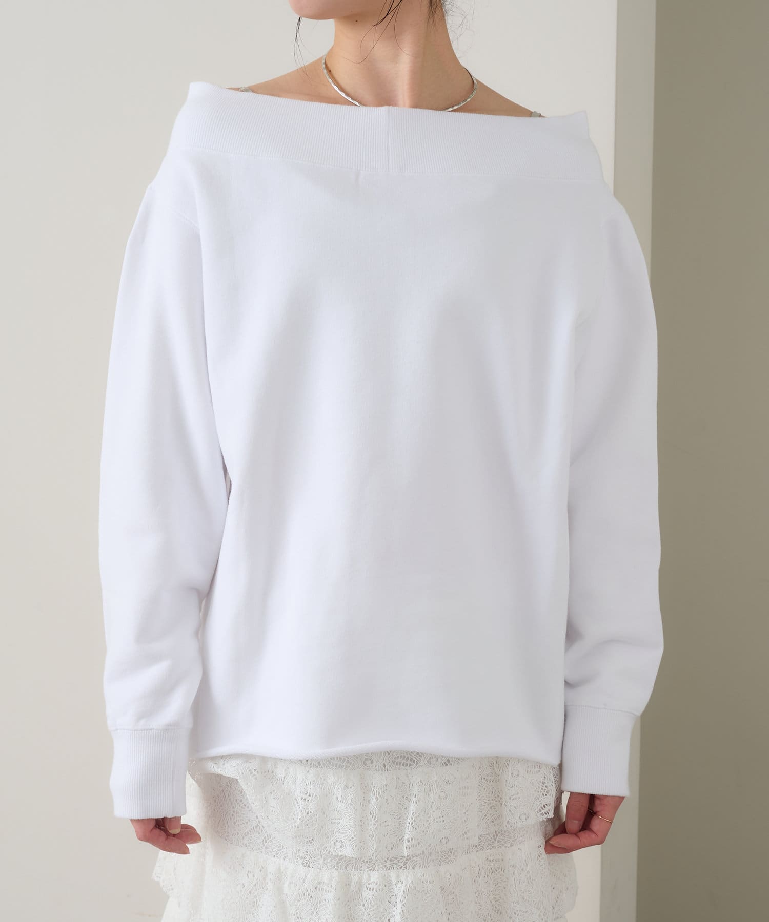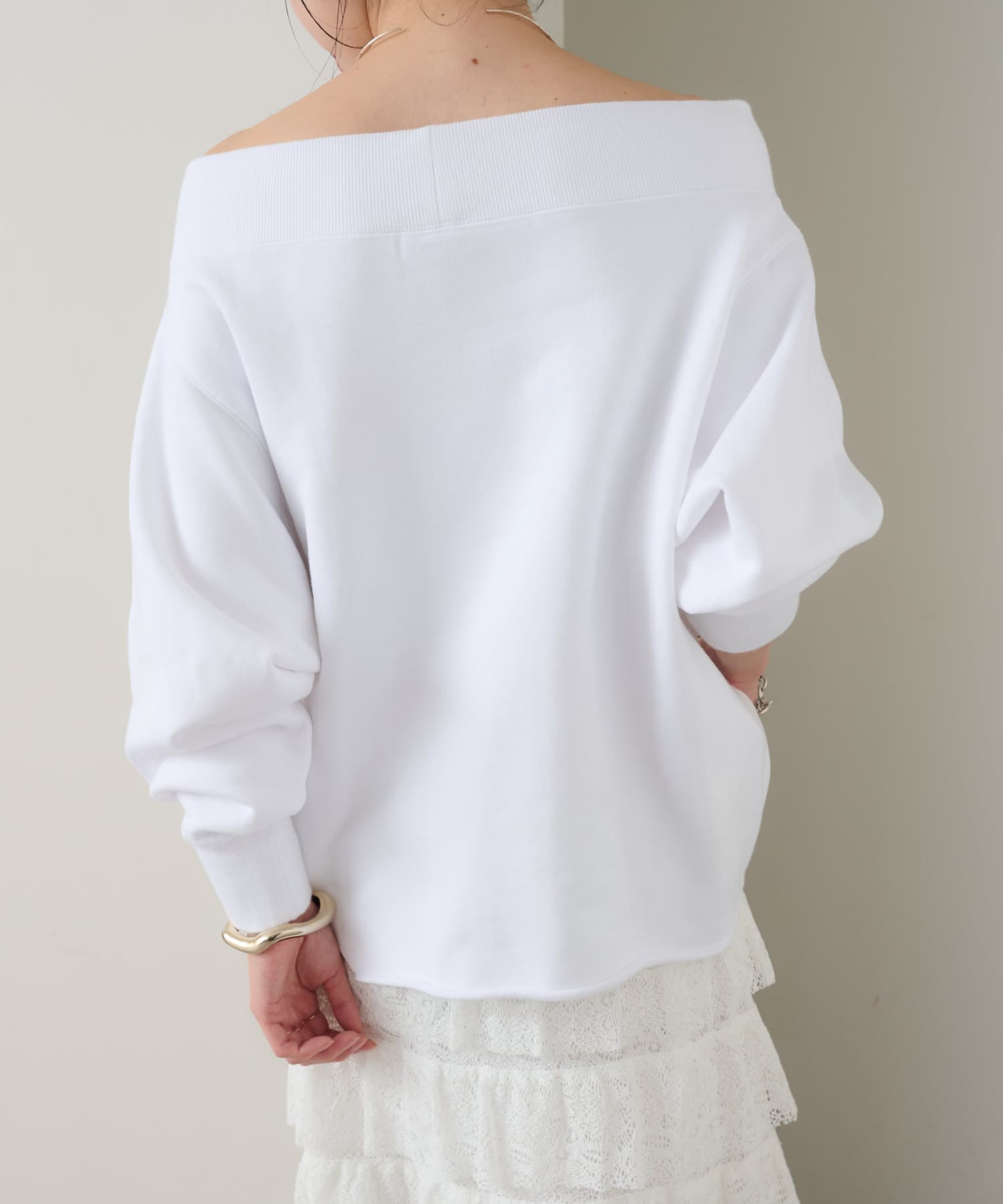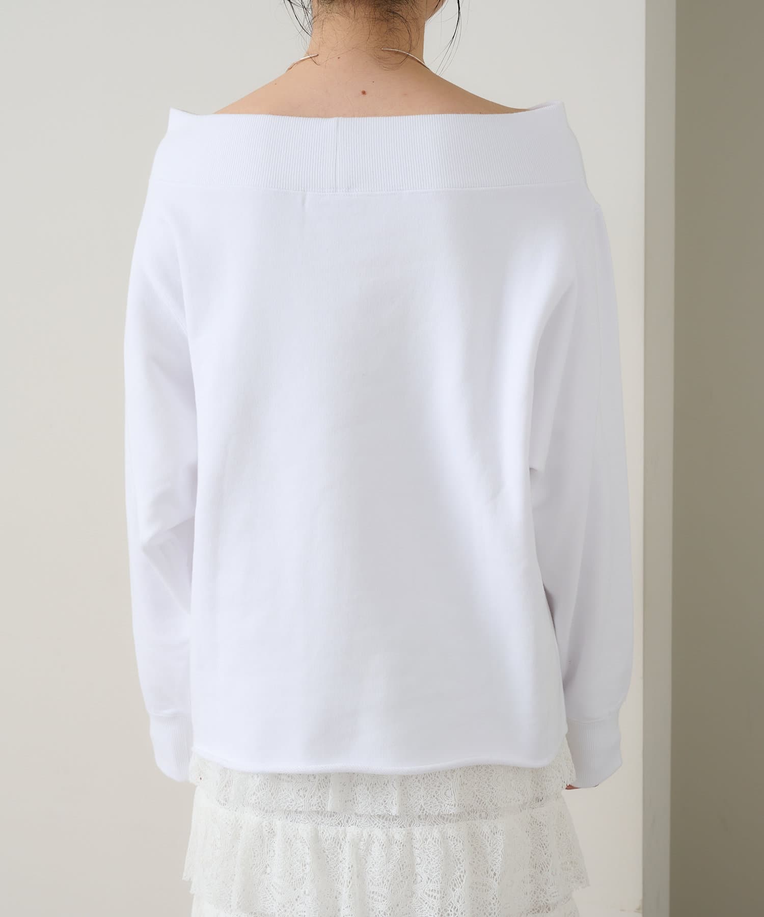 カジュアルと女性らしさを兼ね備えたロゴオフショルスウェット