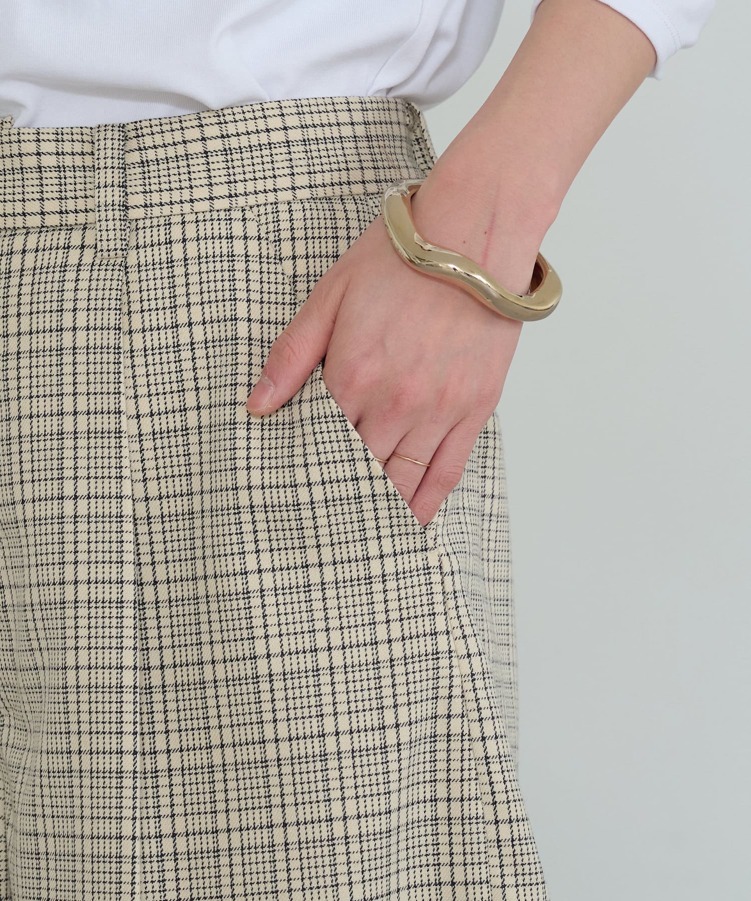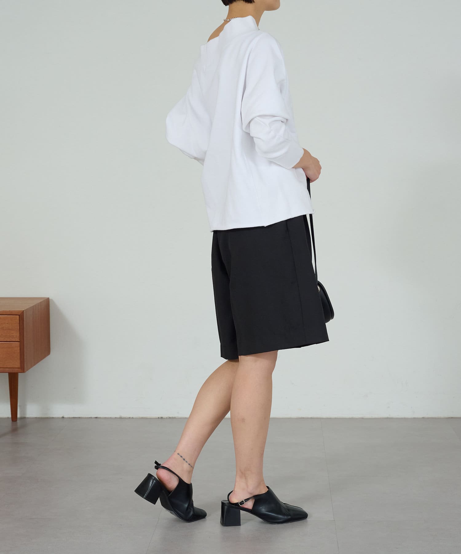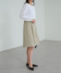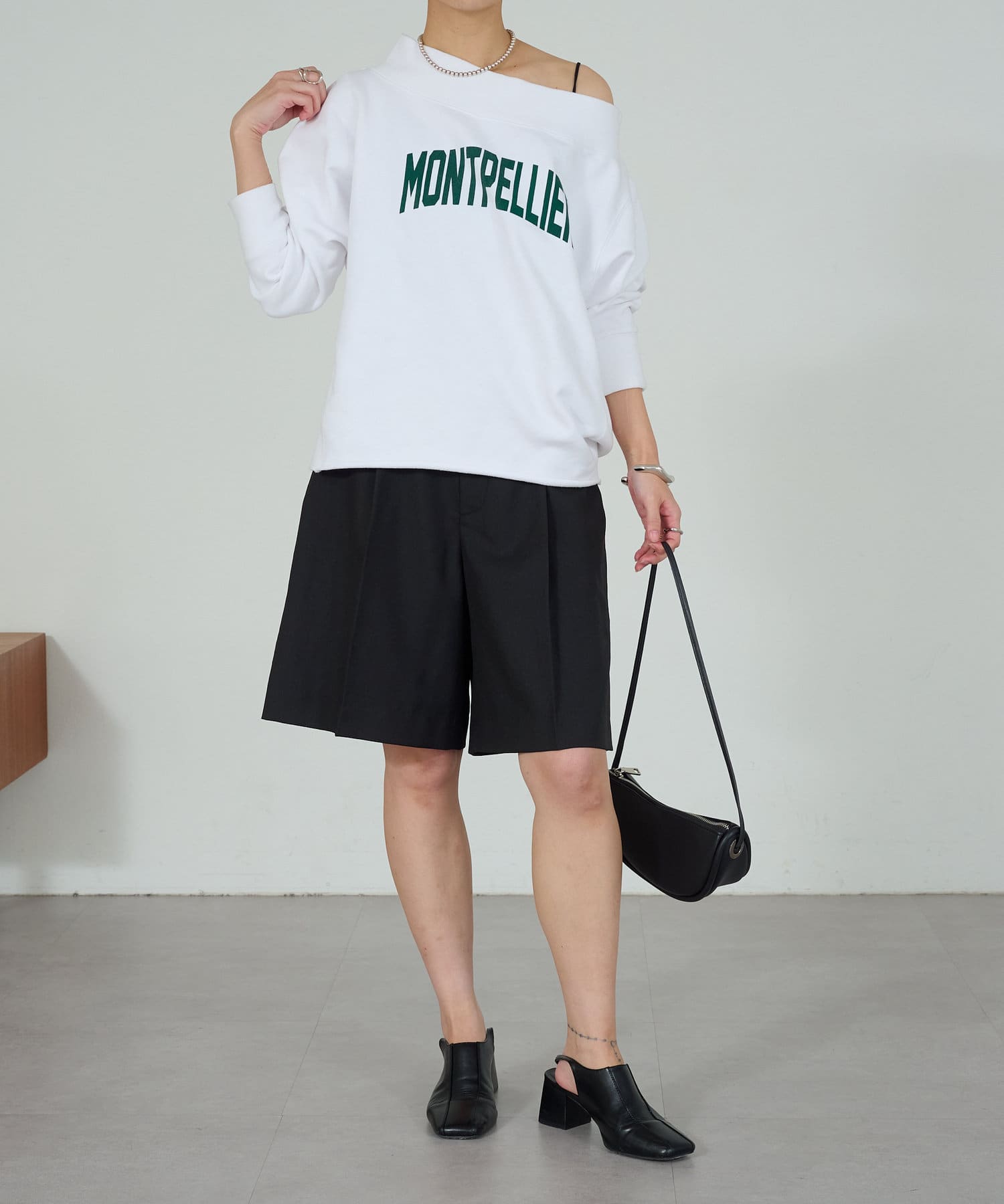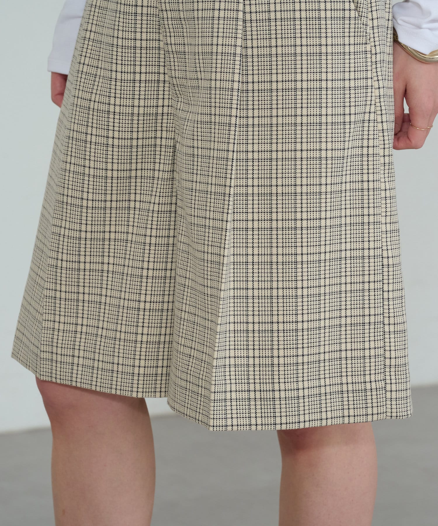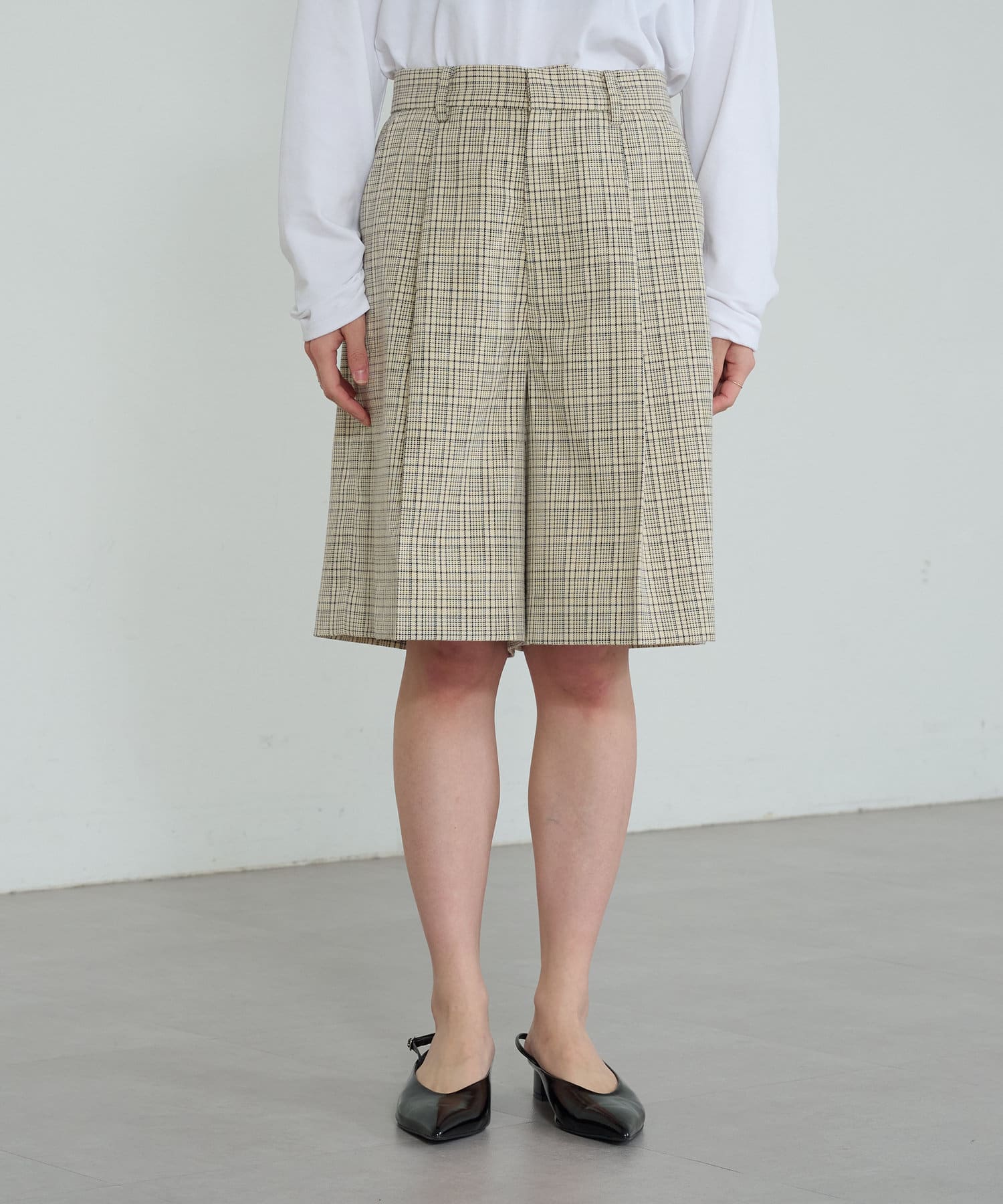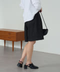 ・膝にかかる丈感と、程よくワイドなパンツ幅で体系を拾いにくいシルエット。
