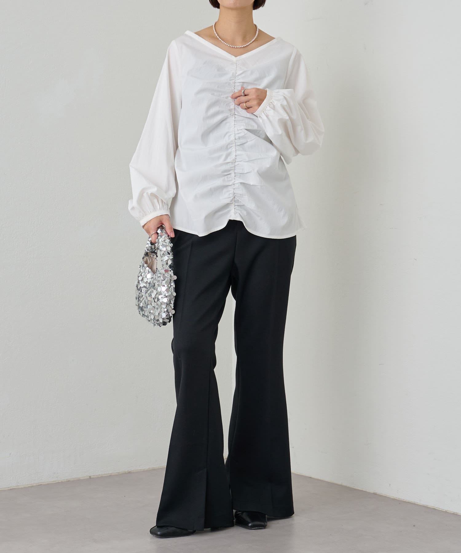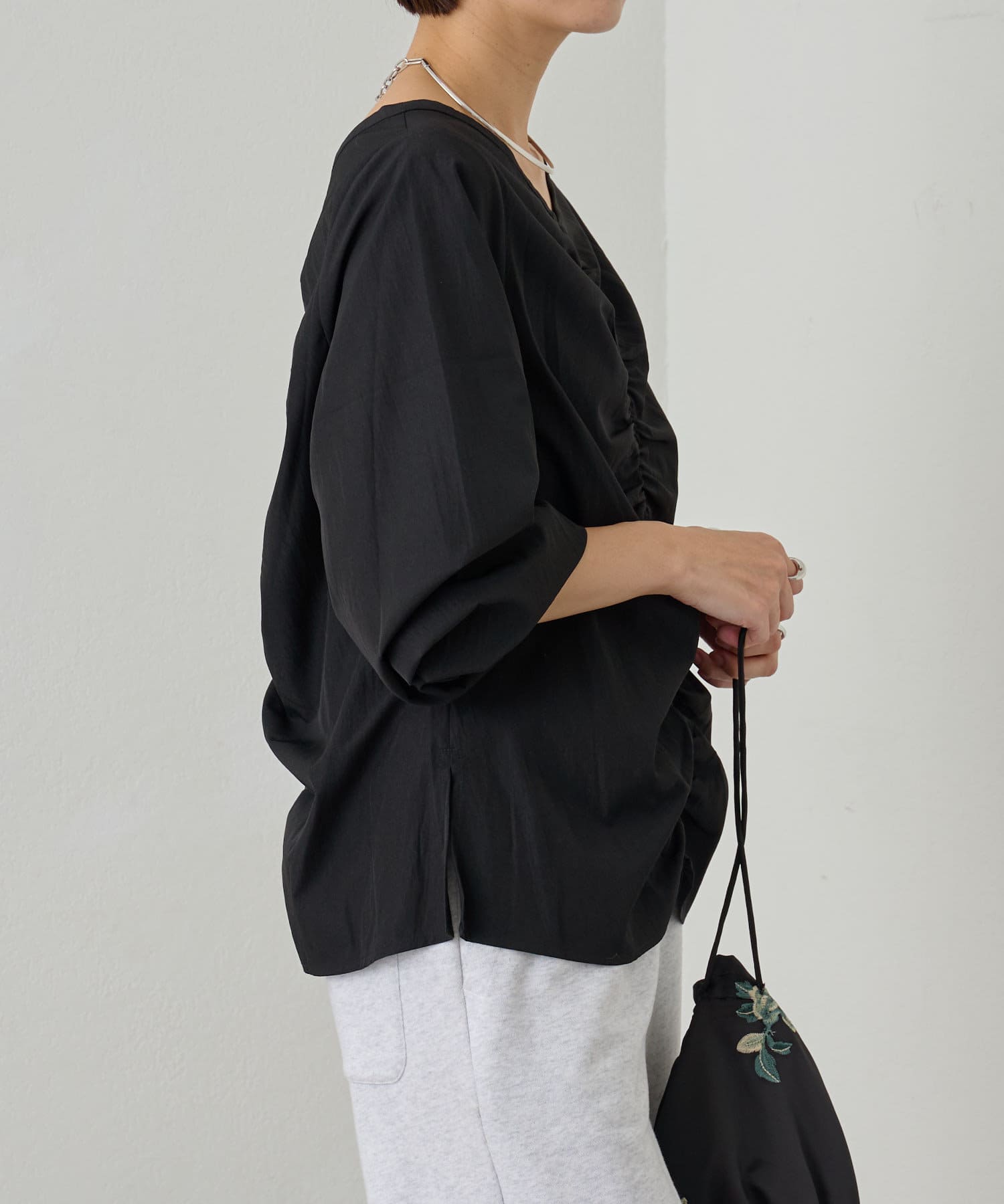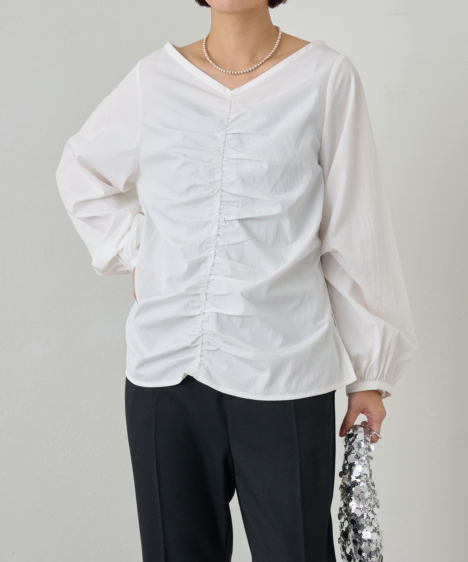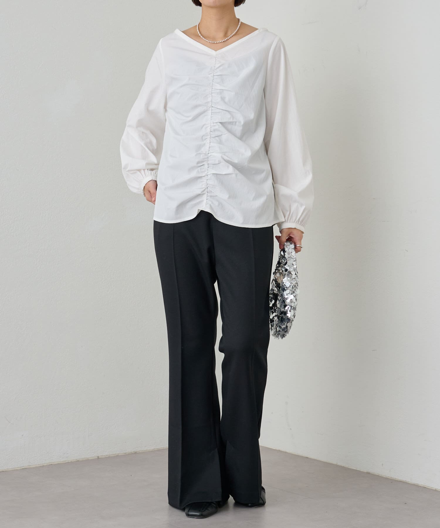 【セレモニースタイルにも活躍◎】Vギャザーブラウス