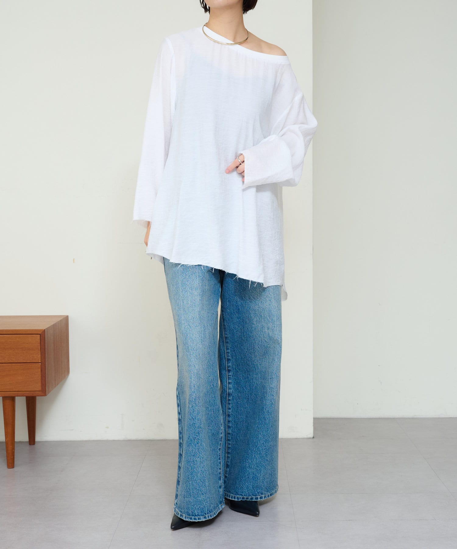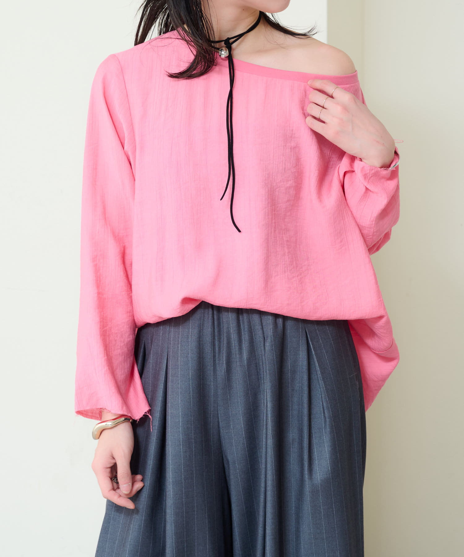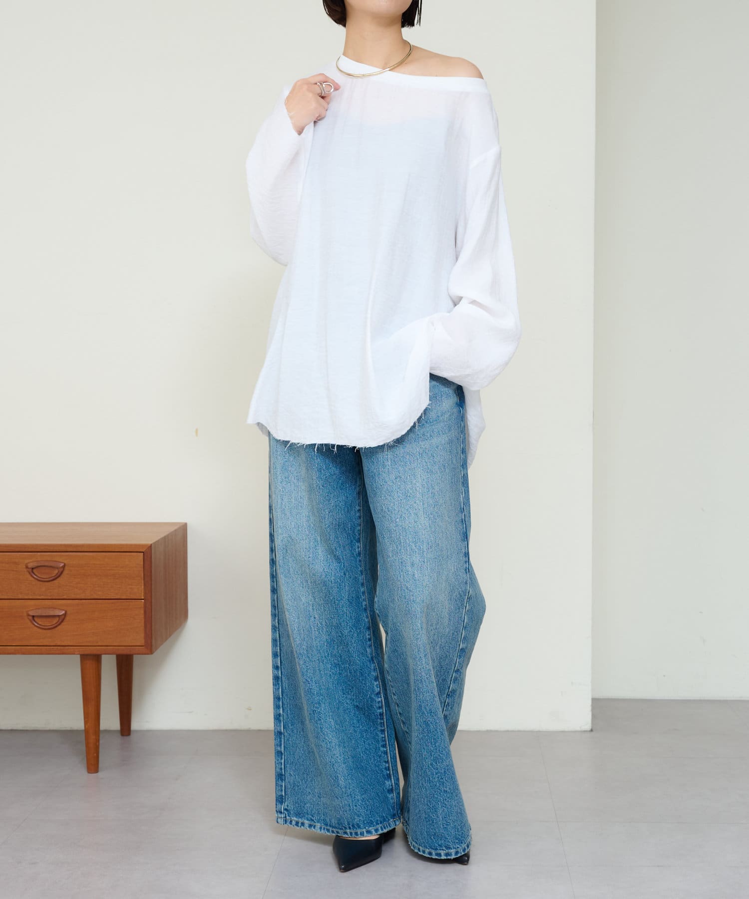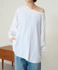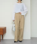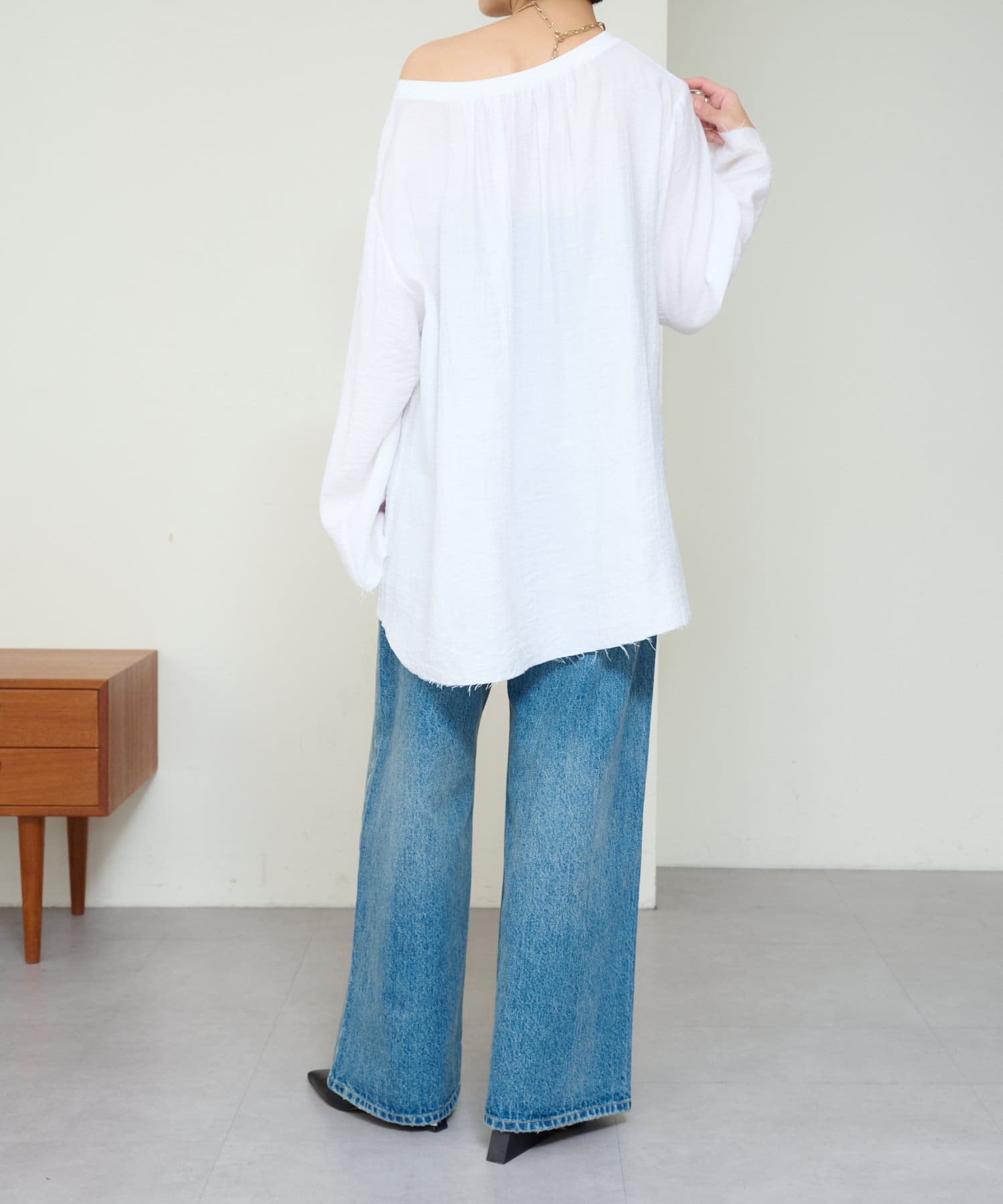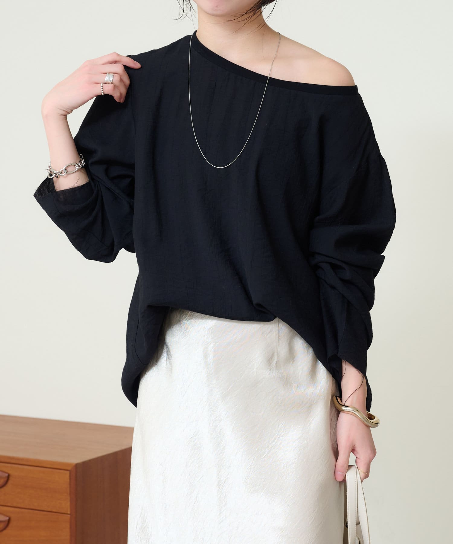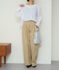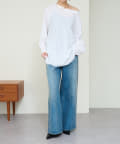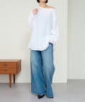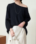 ・やや広めのネックラインはオフショルダーにしてこなれ感を出すのもおすすめ。