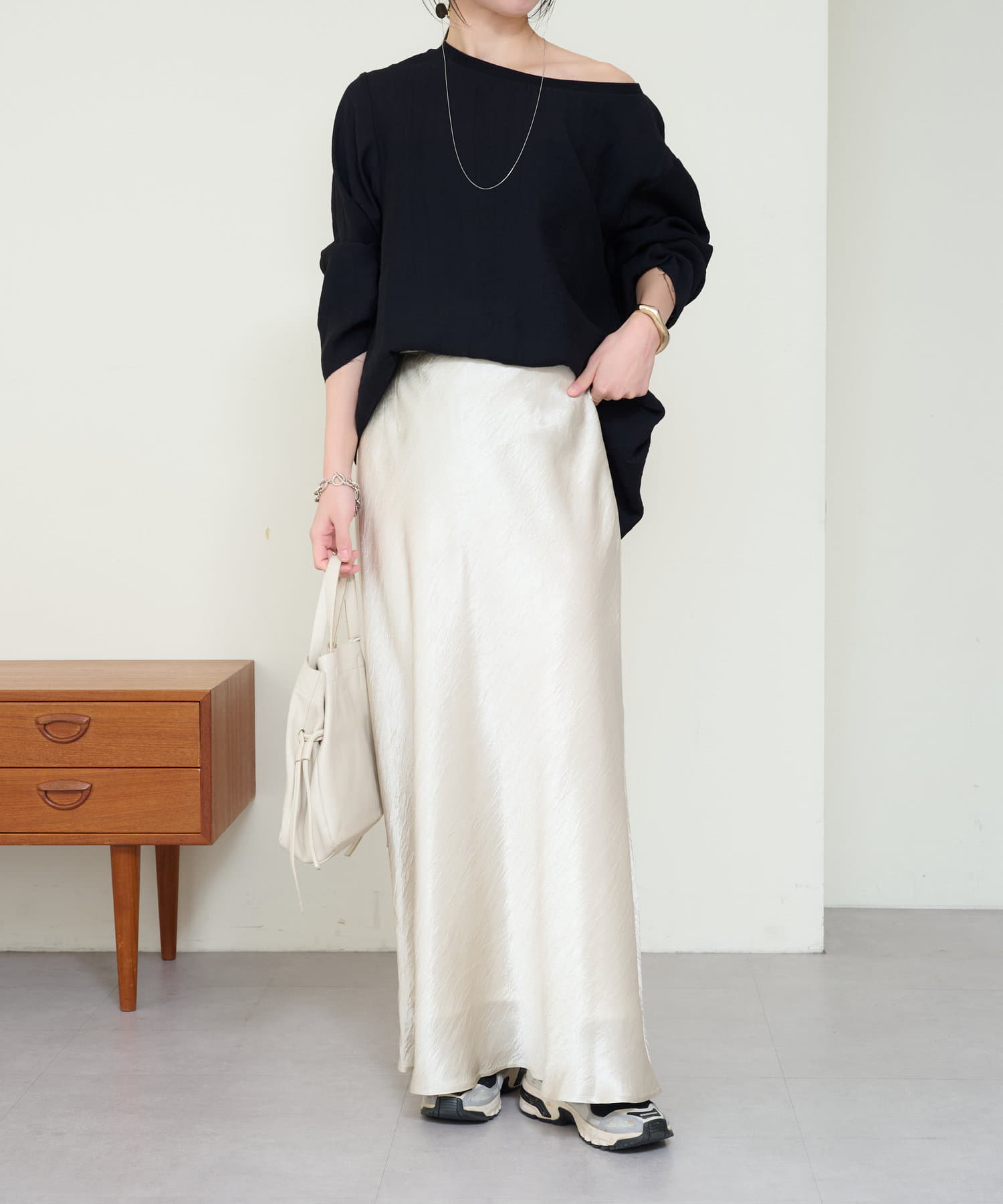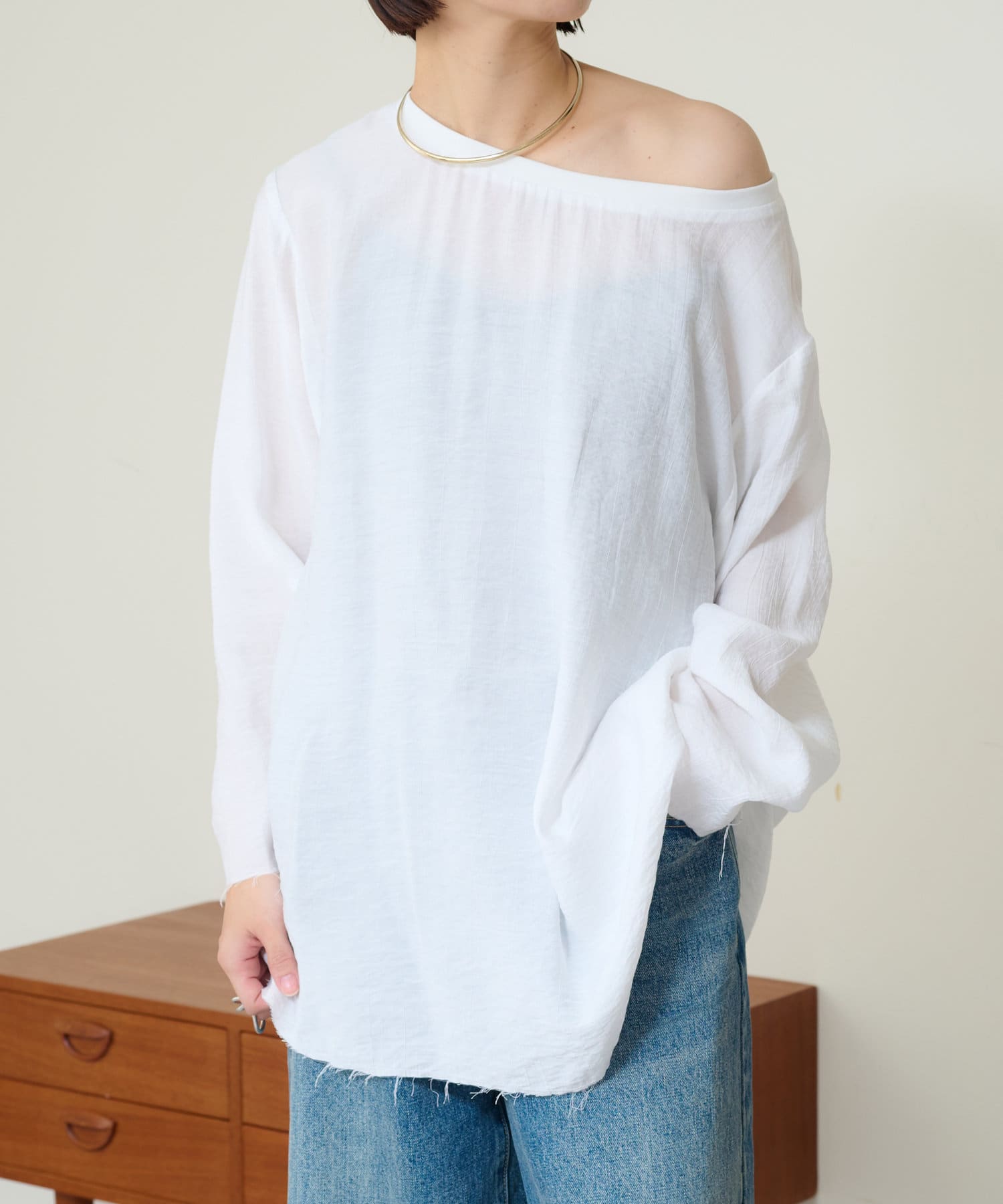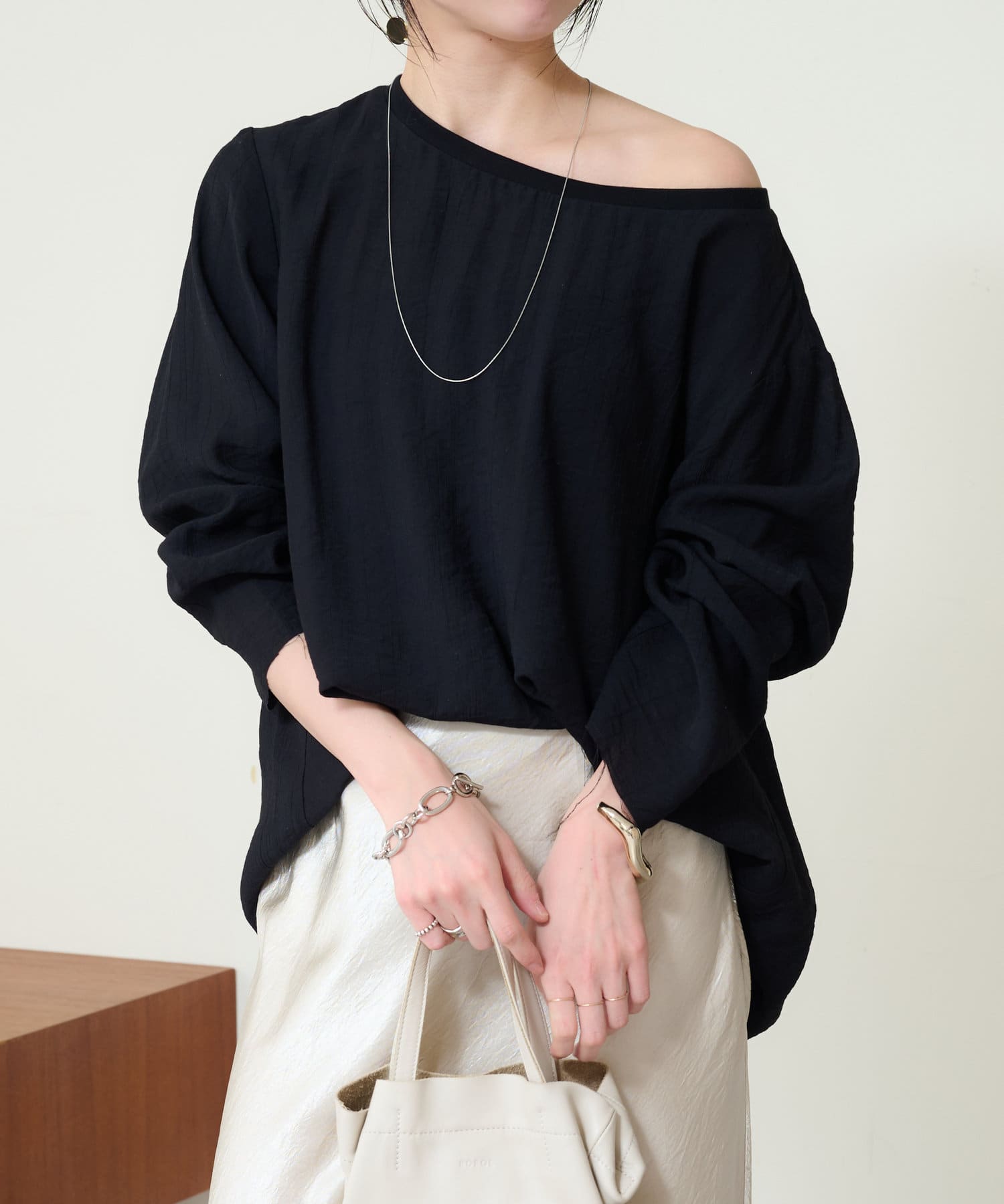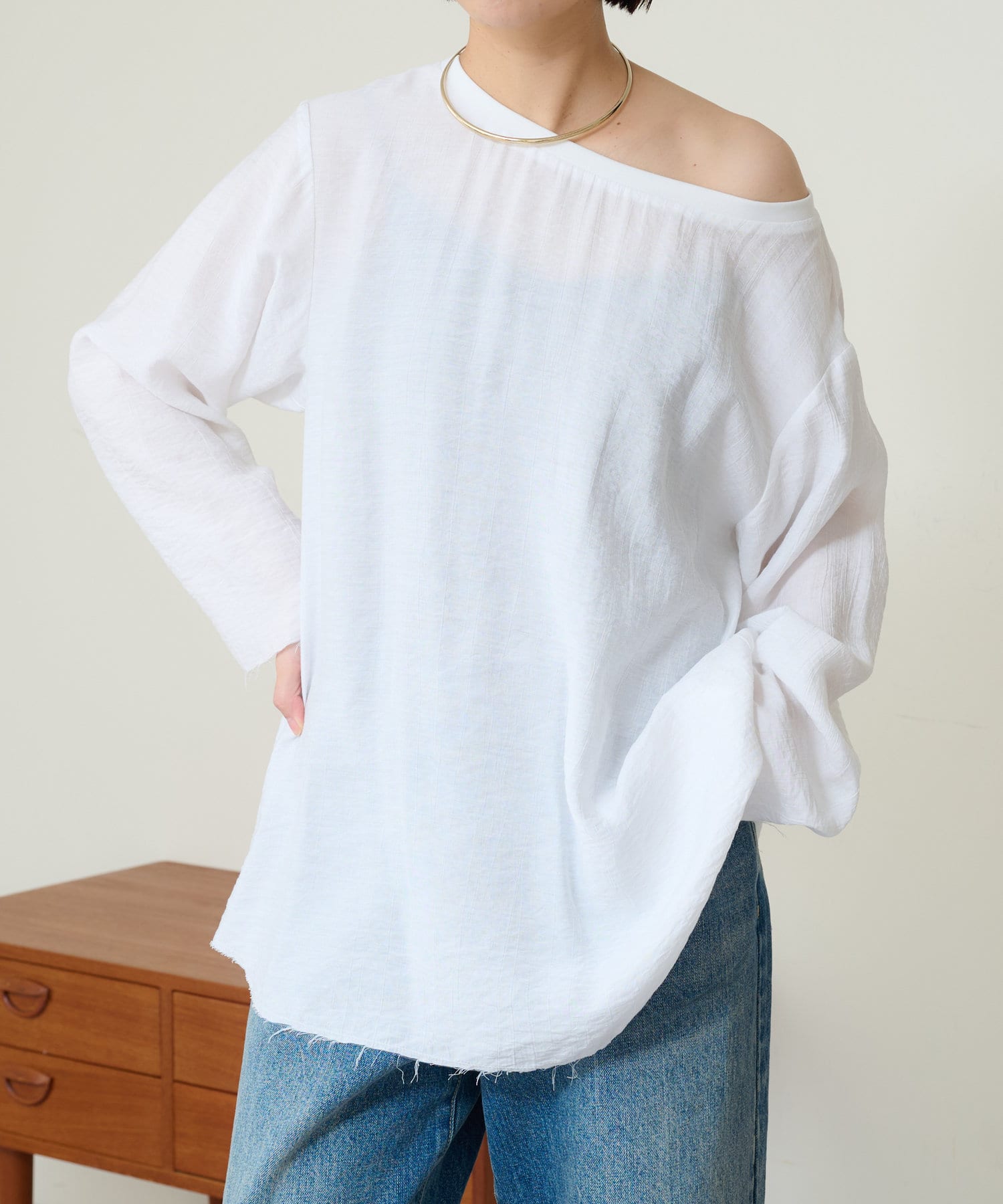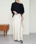 ・やや広めのネックラインはオフショルダーにしてこなれ感を出すのもおすすめ。