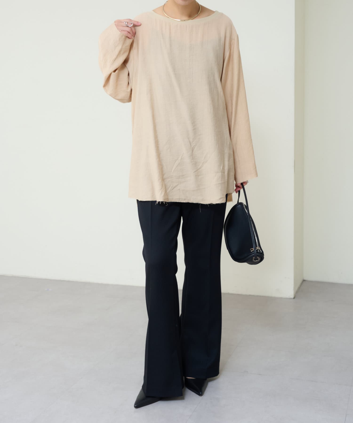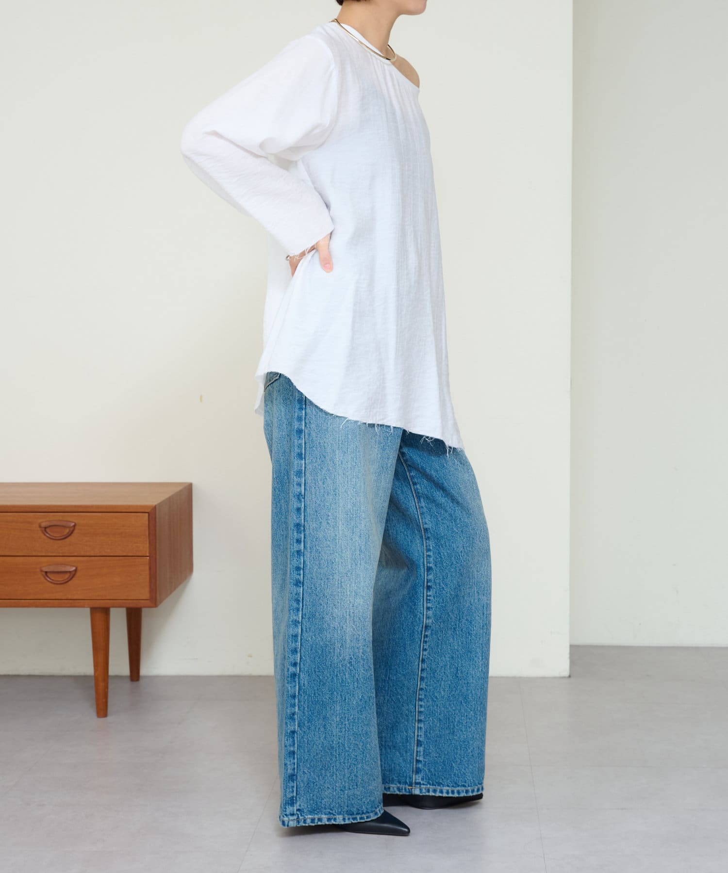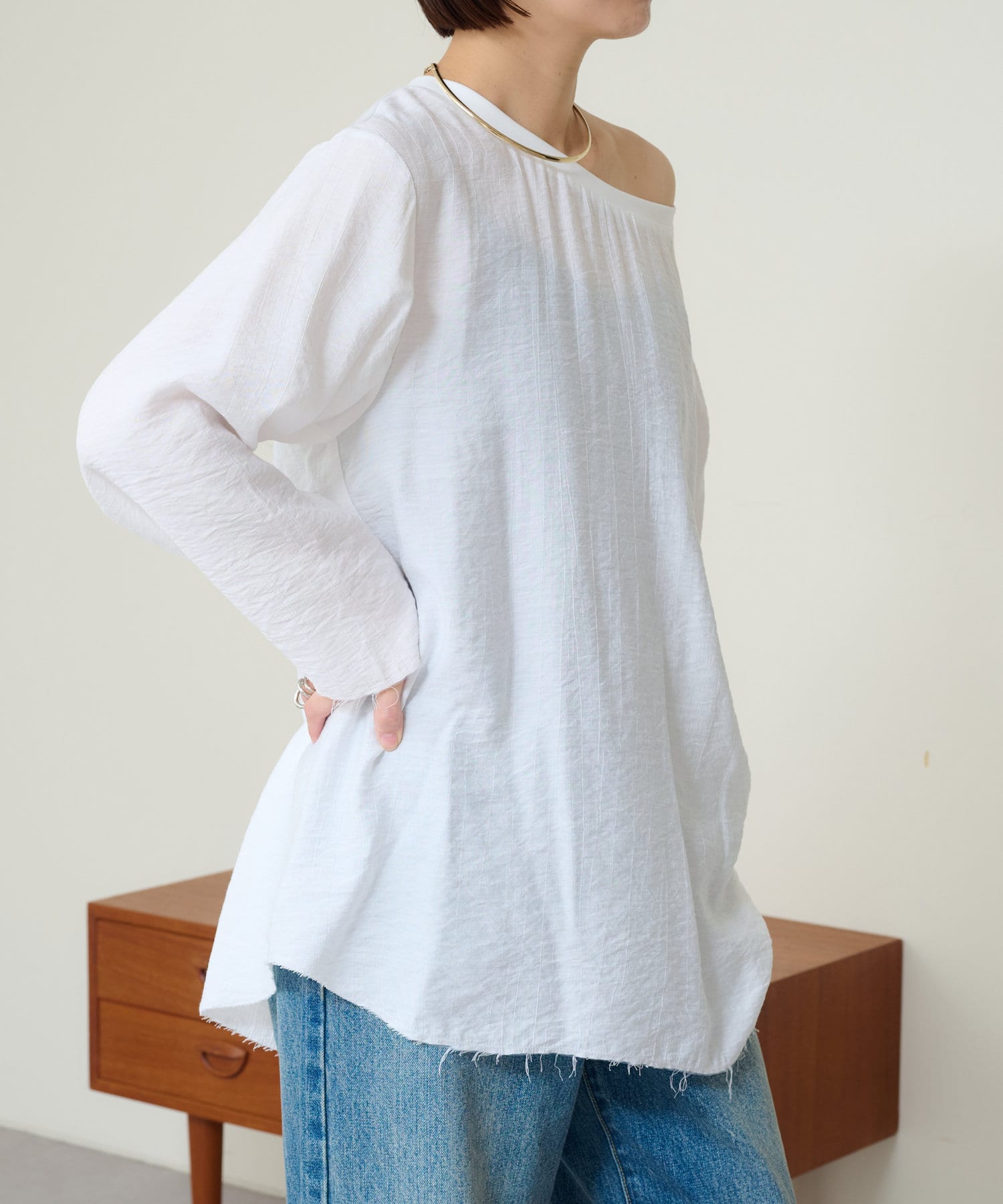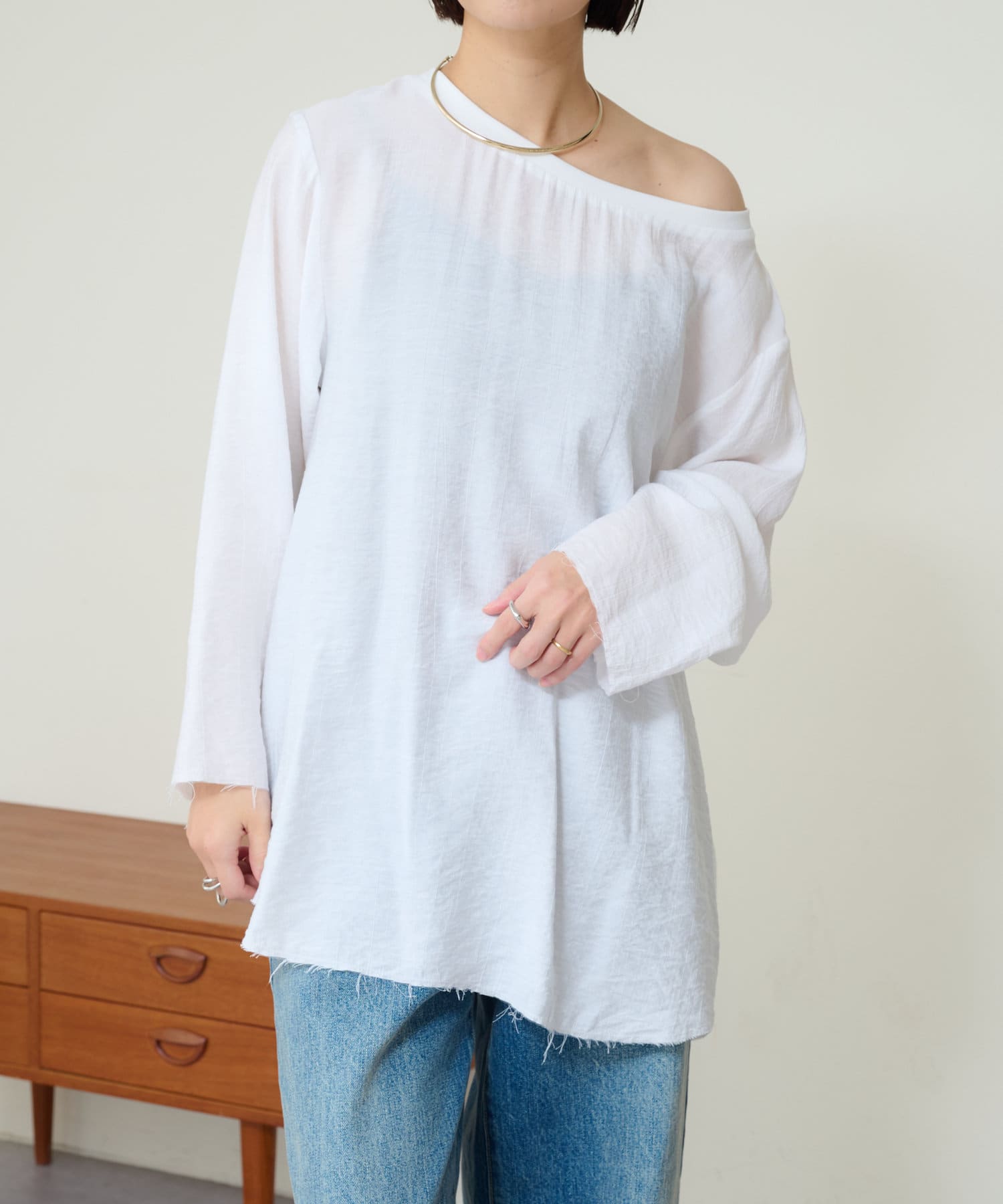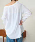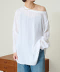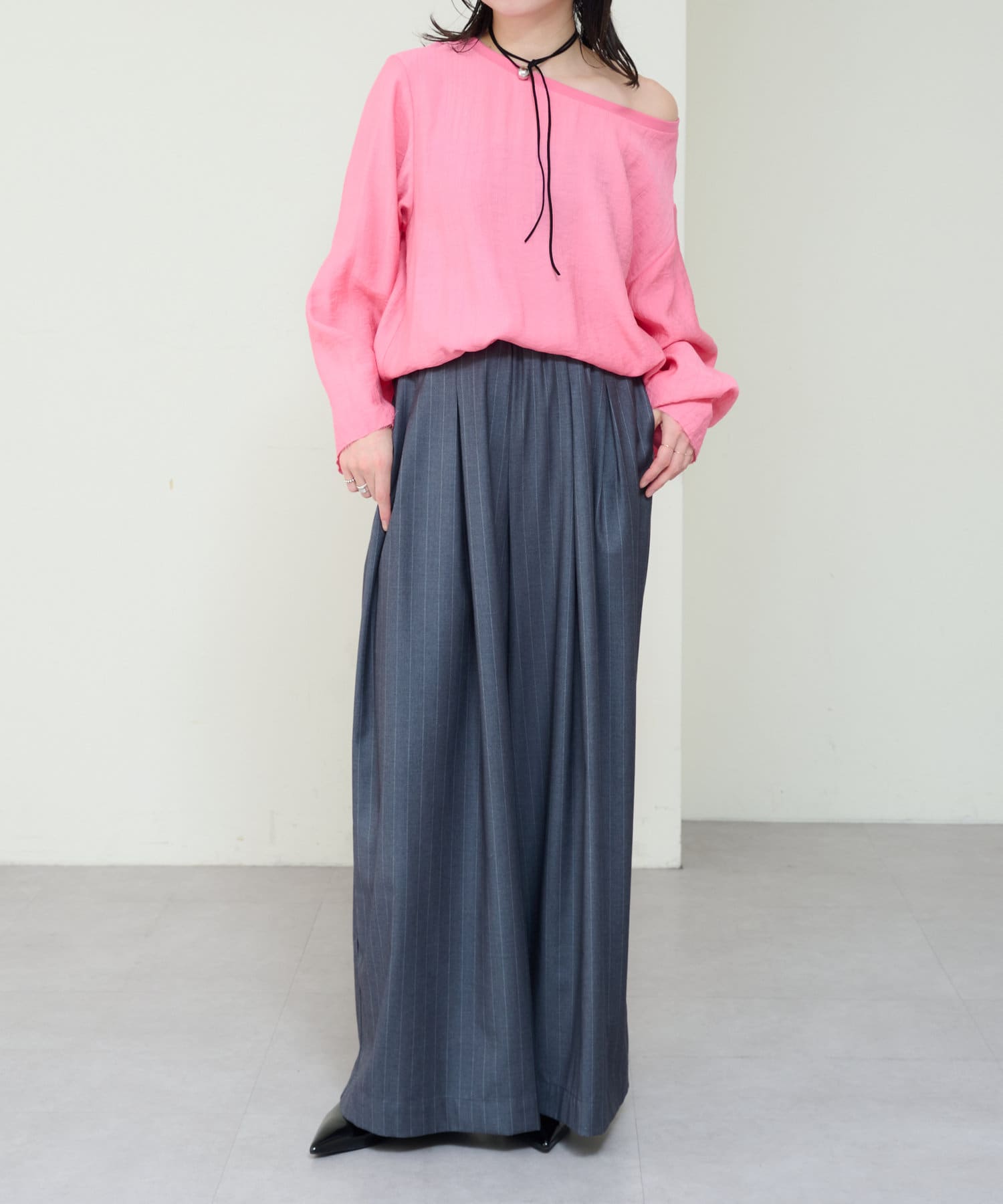 ・やや広めのネックラインはオフショルダーにしてこなれ感を出すのもおすすめ。