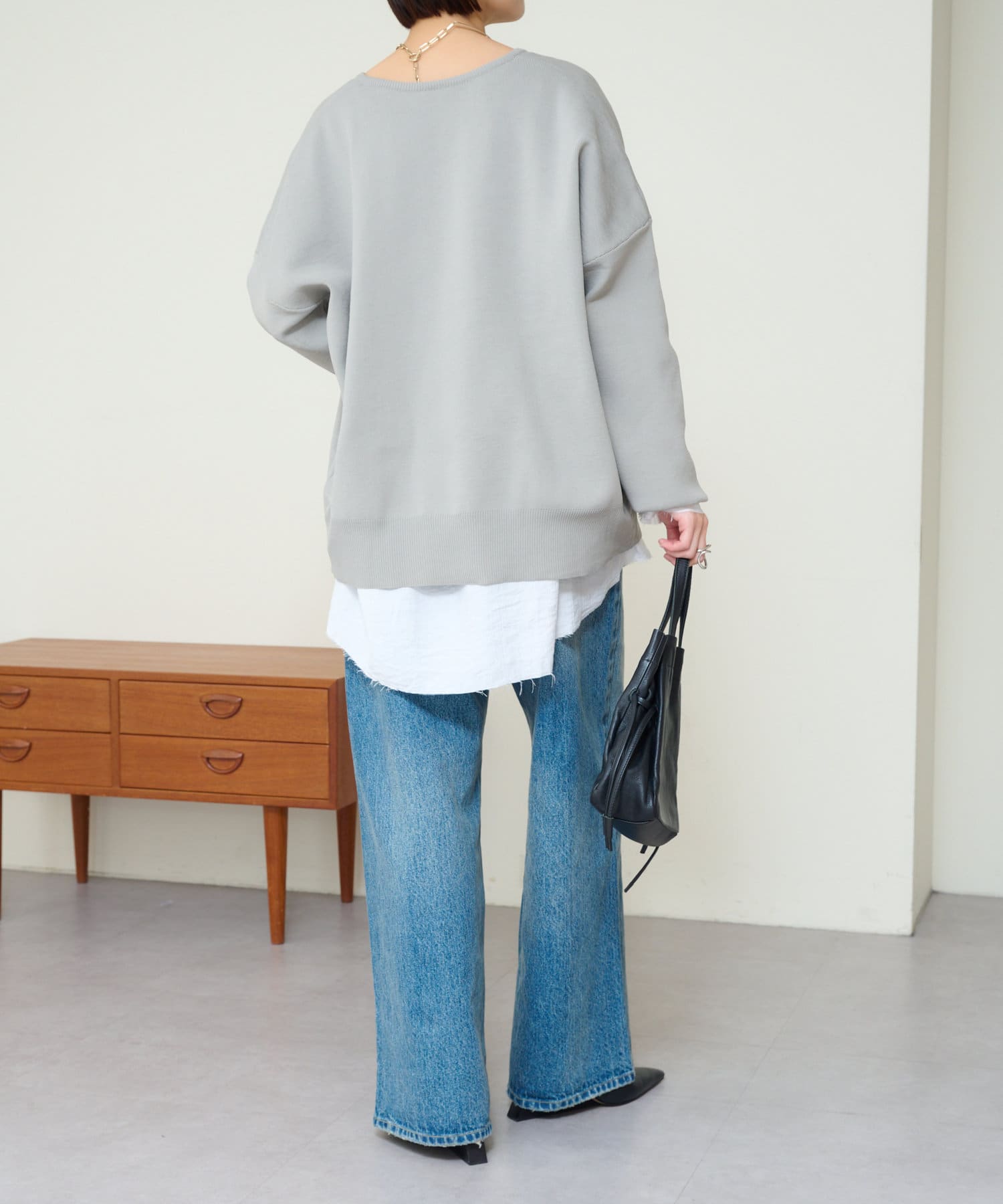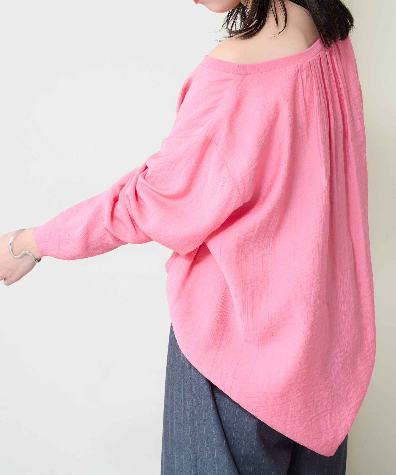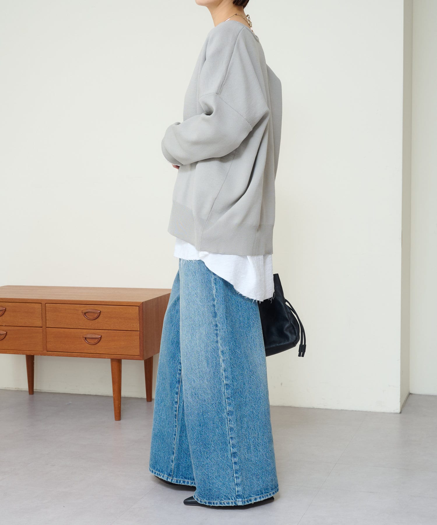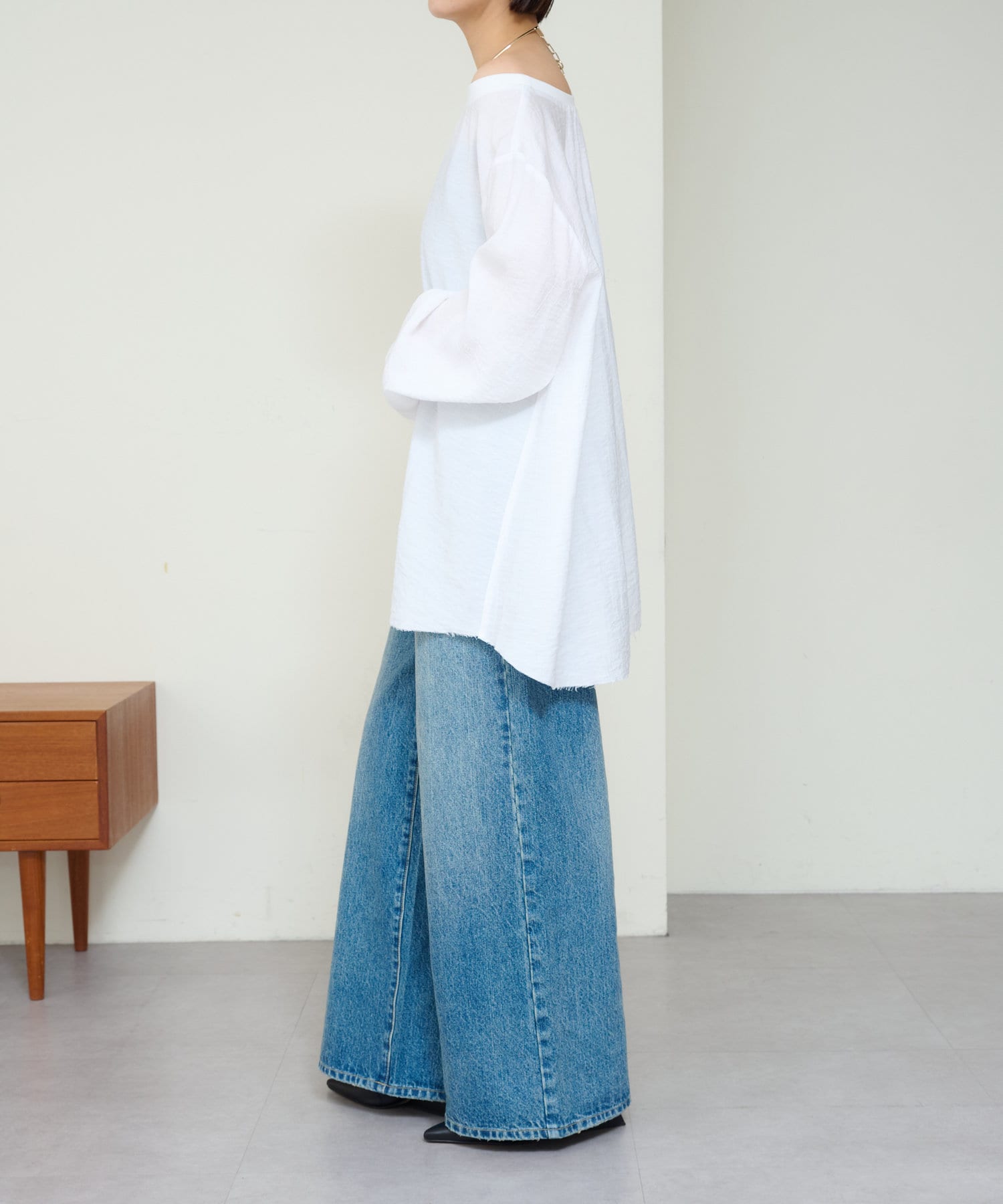 ・やや広めのネックラインはオフショルダーにしてこなれ感を出すのもおすすめ。