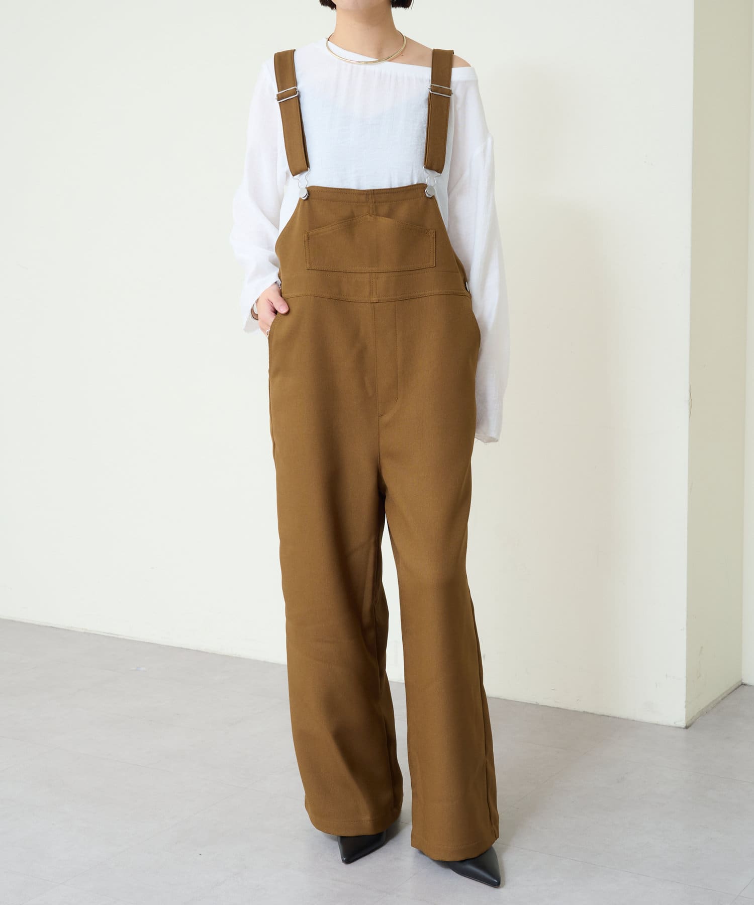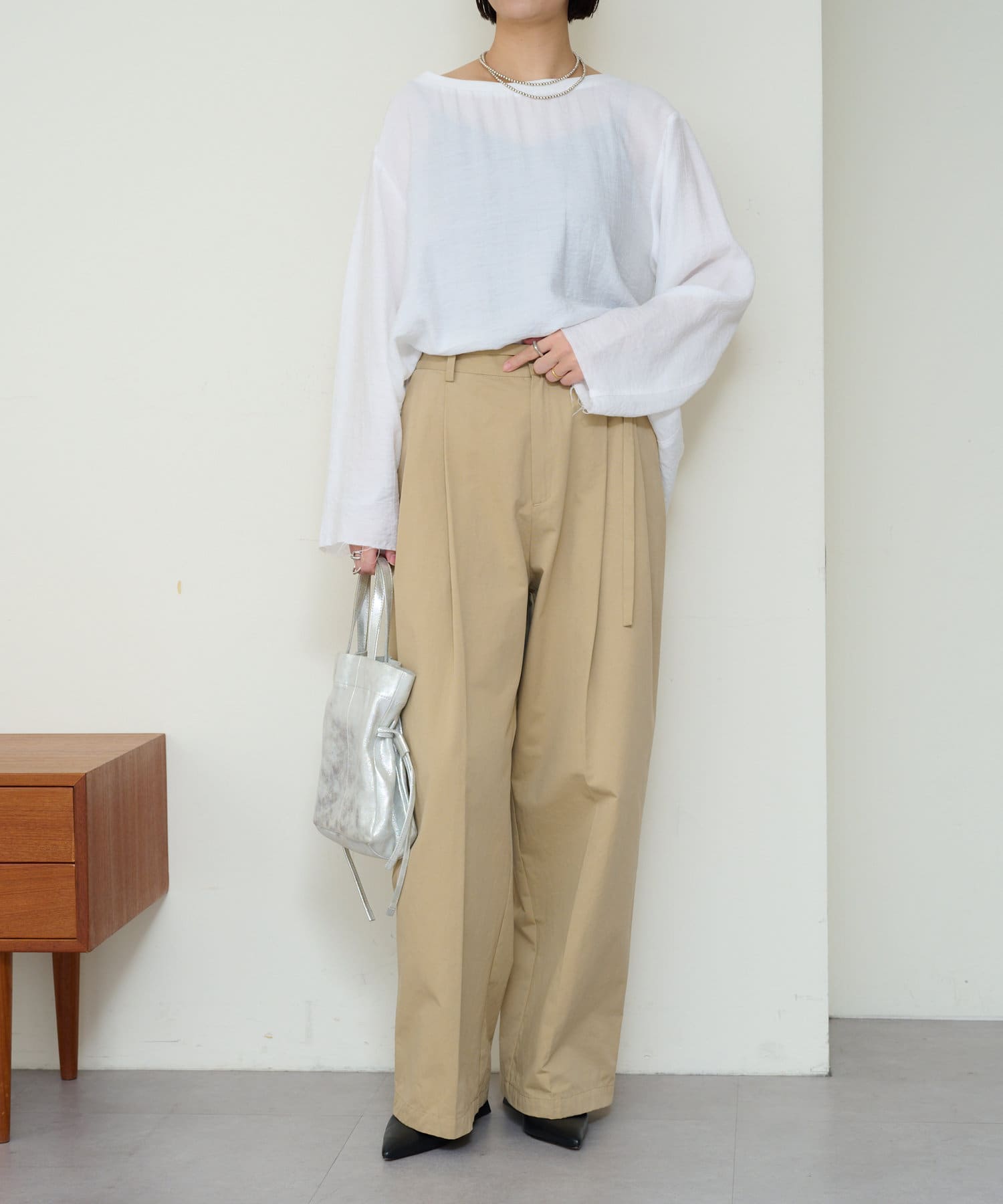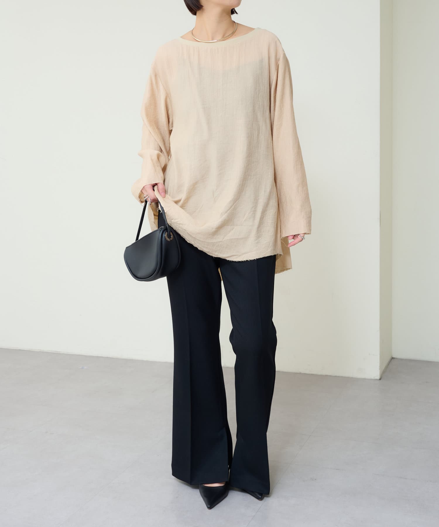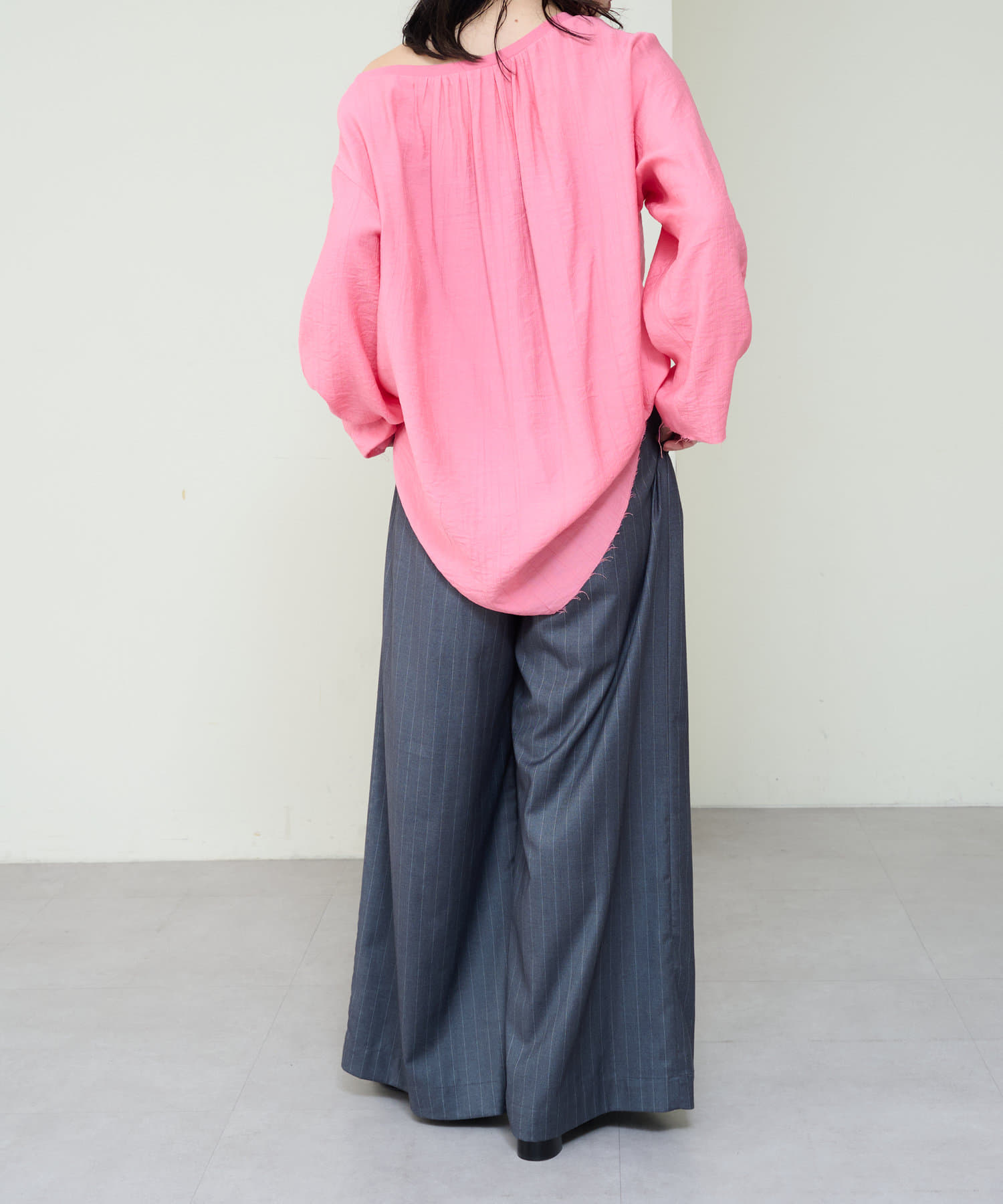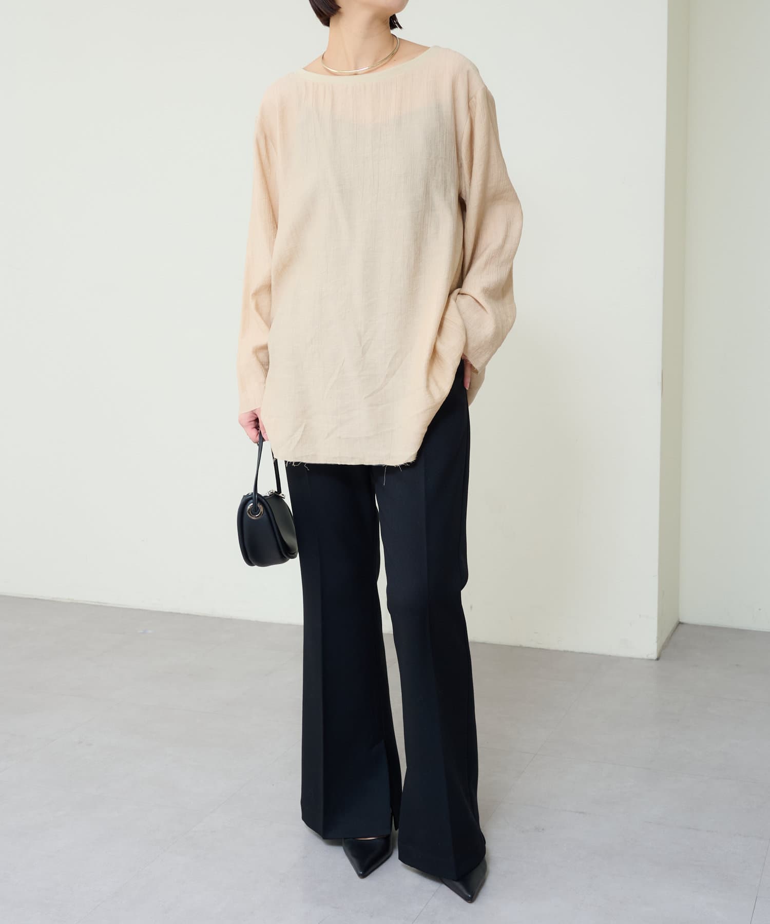 ・やや広めのネックラインはオフショルダーにしてこなれ感を出すのもおすすめ。