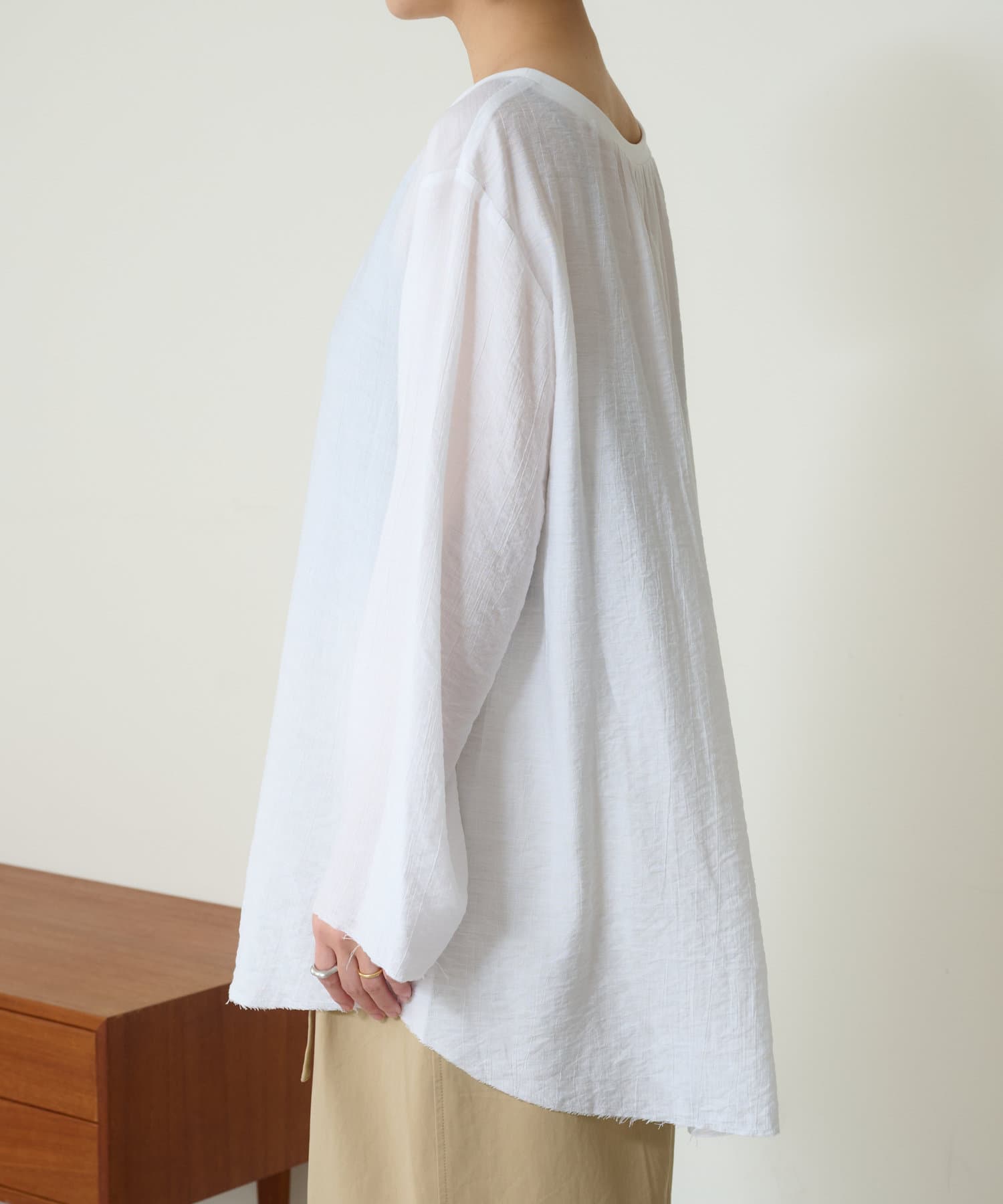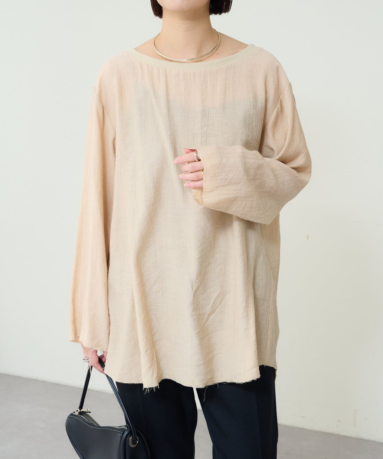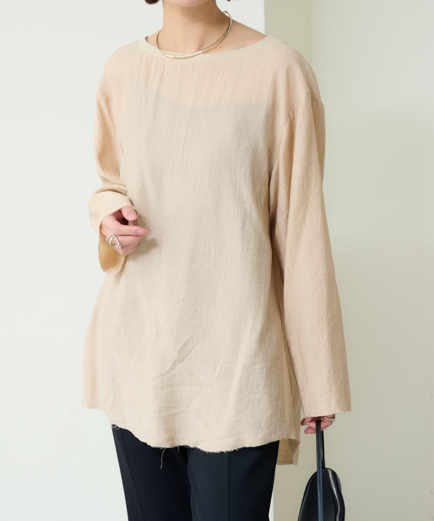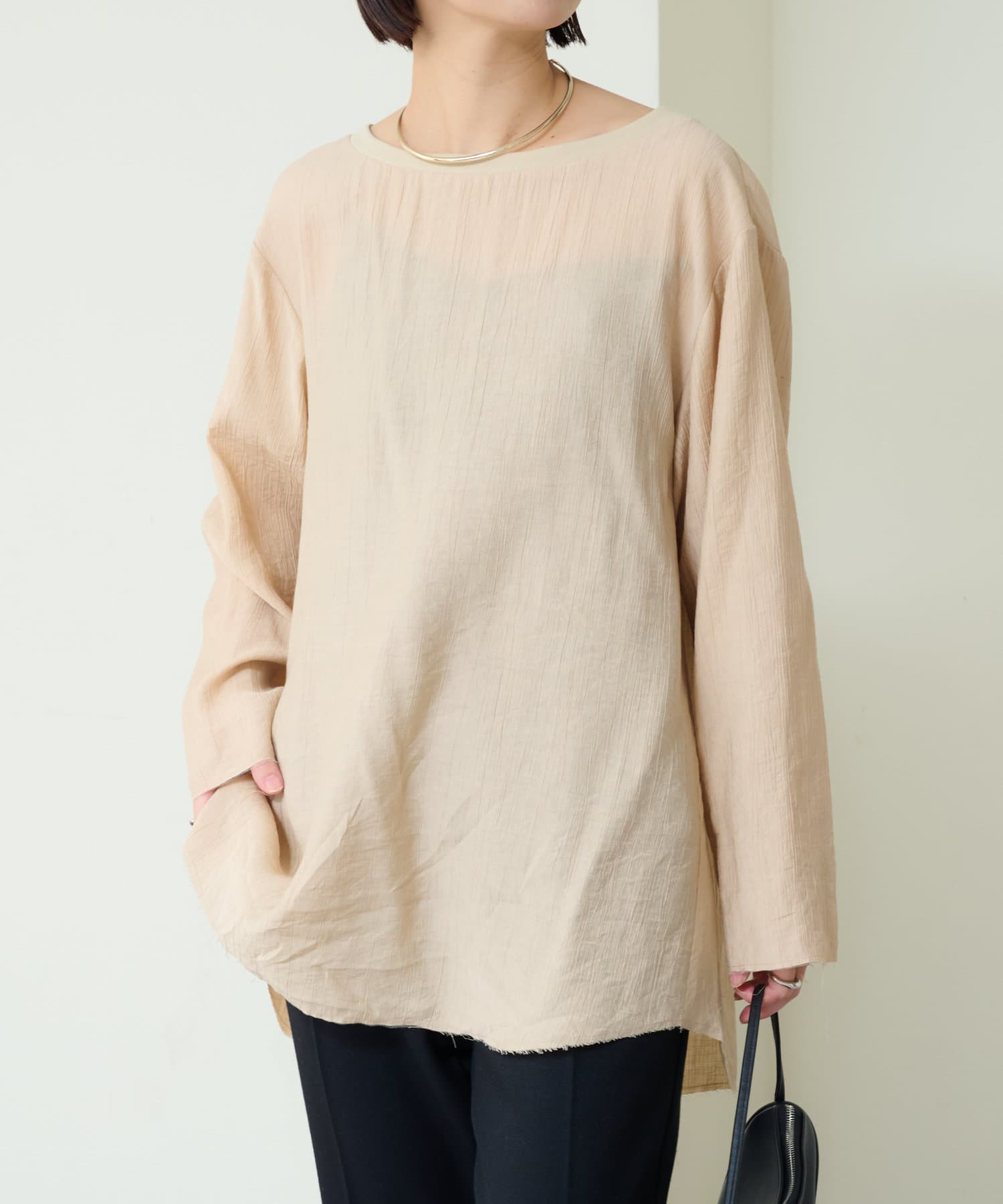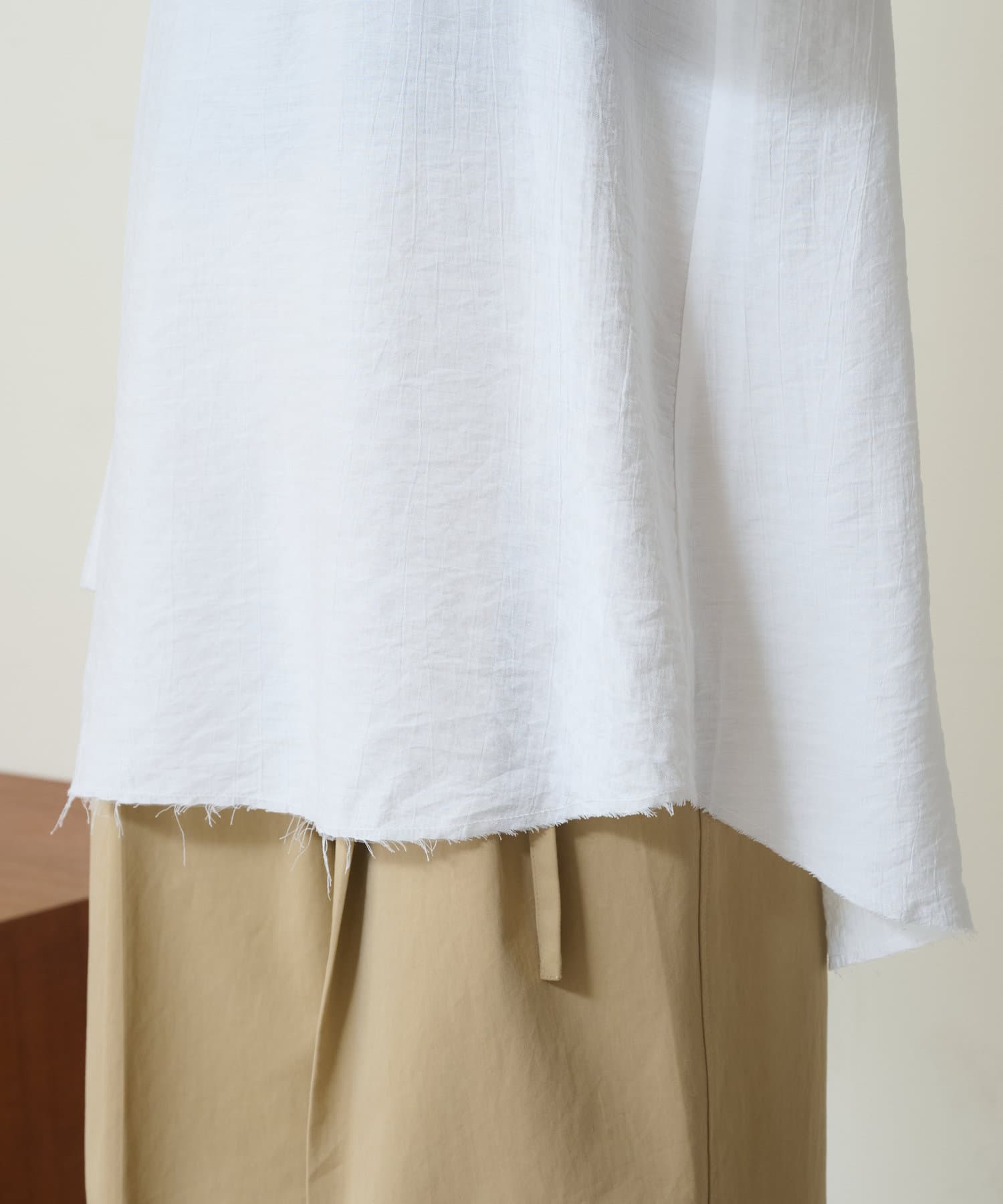・抜け感を演出する切りっぱなしの袖口やヘムライン。