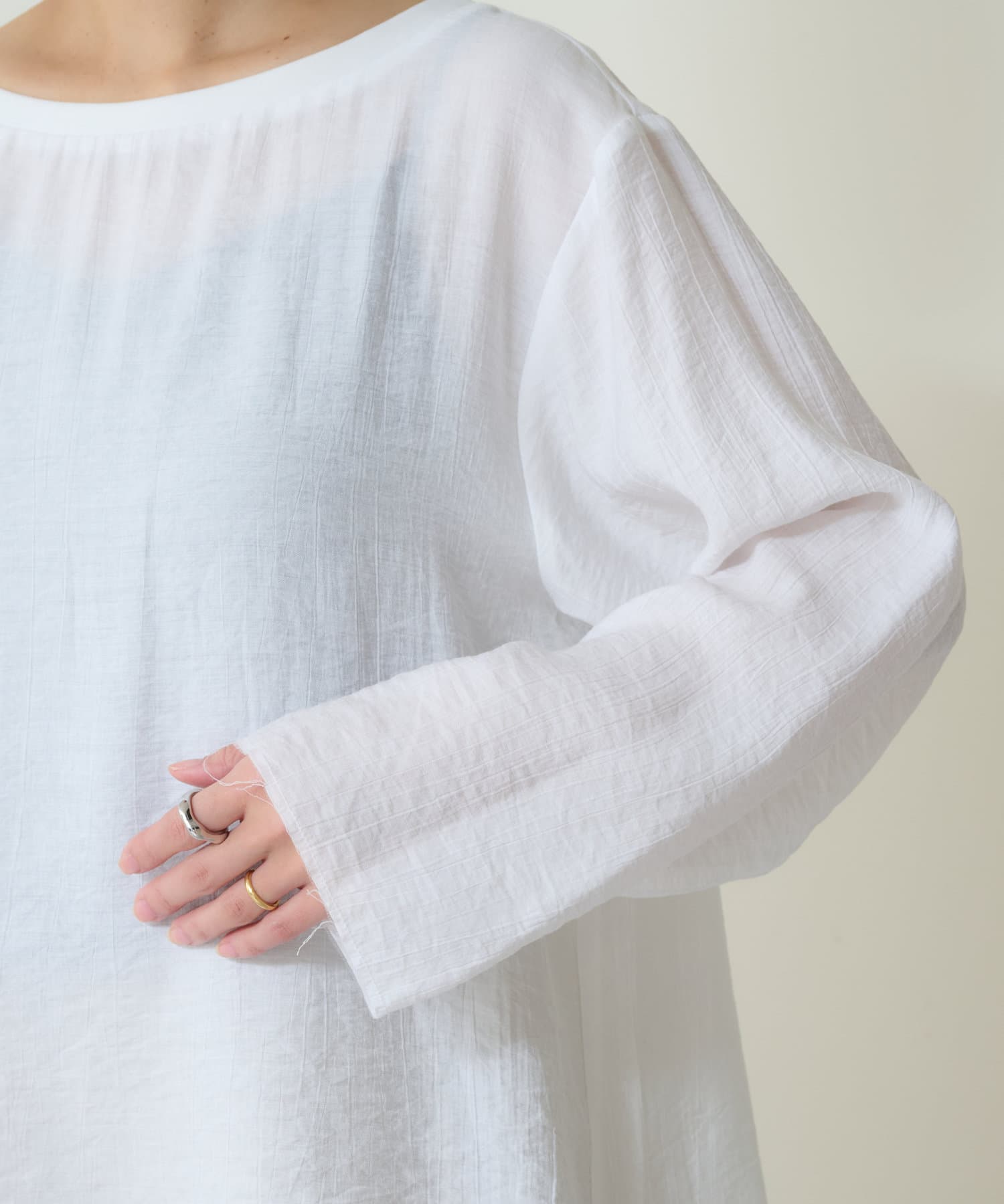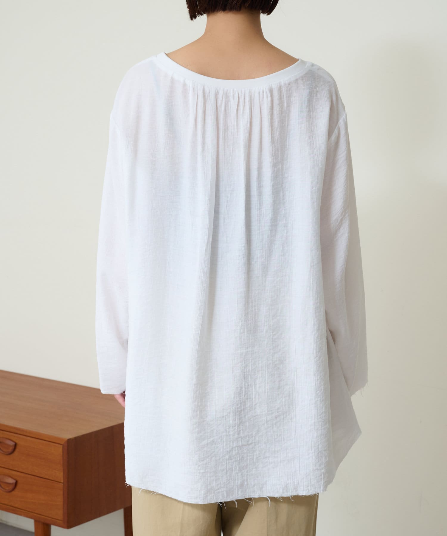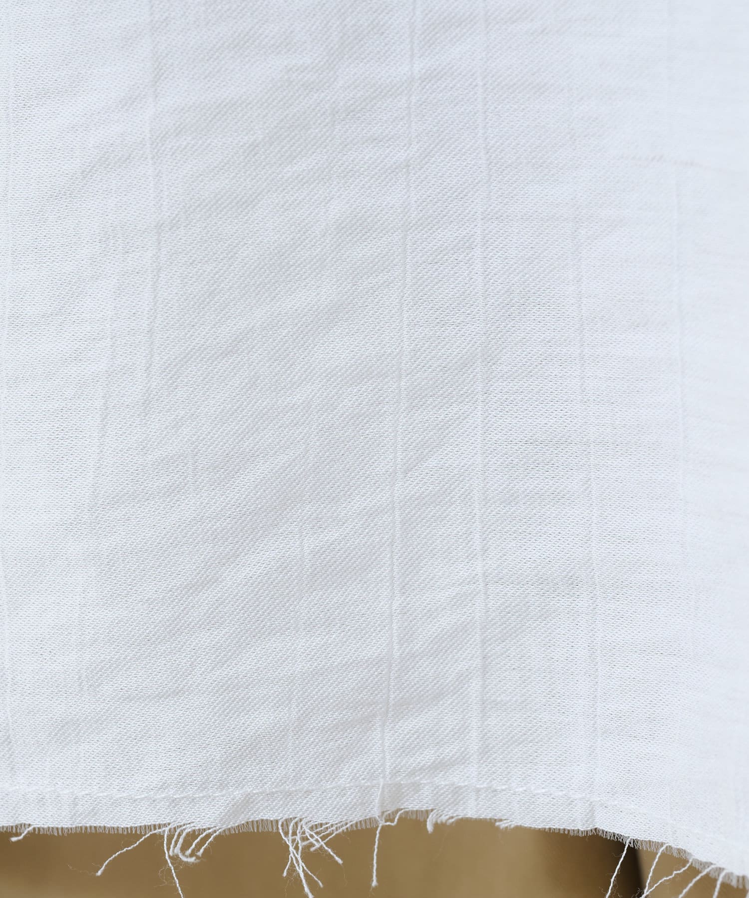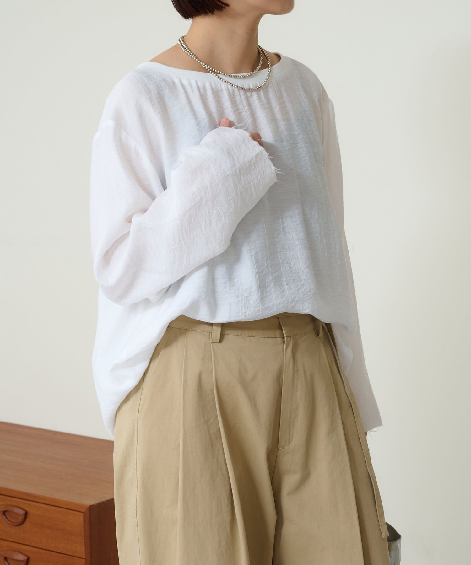 ・抜け感を演出する切りっぱなしの袖口やヘムライン。