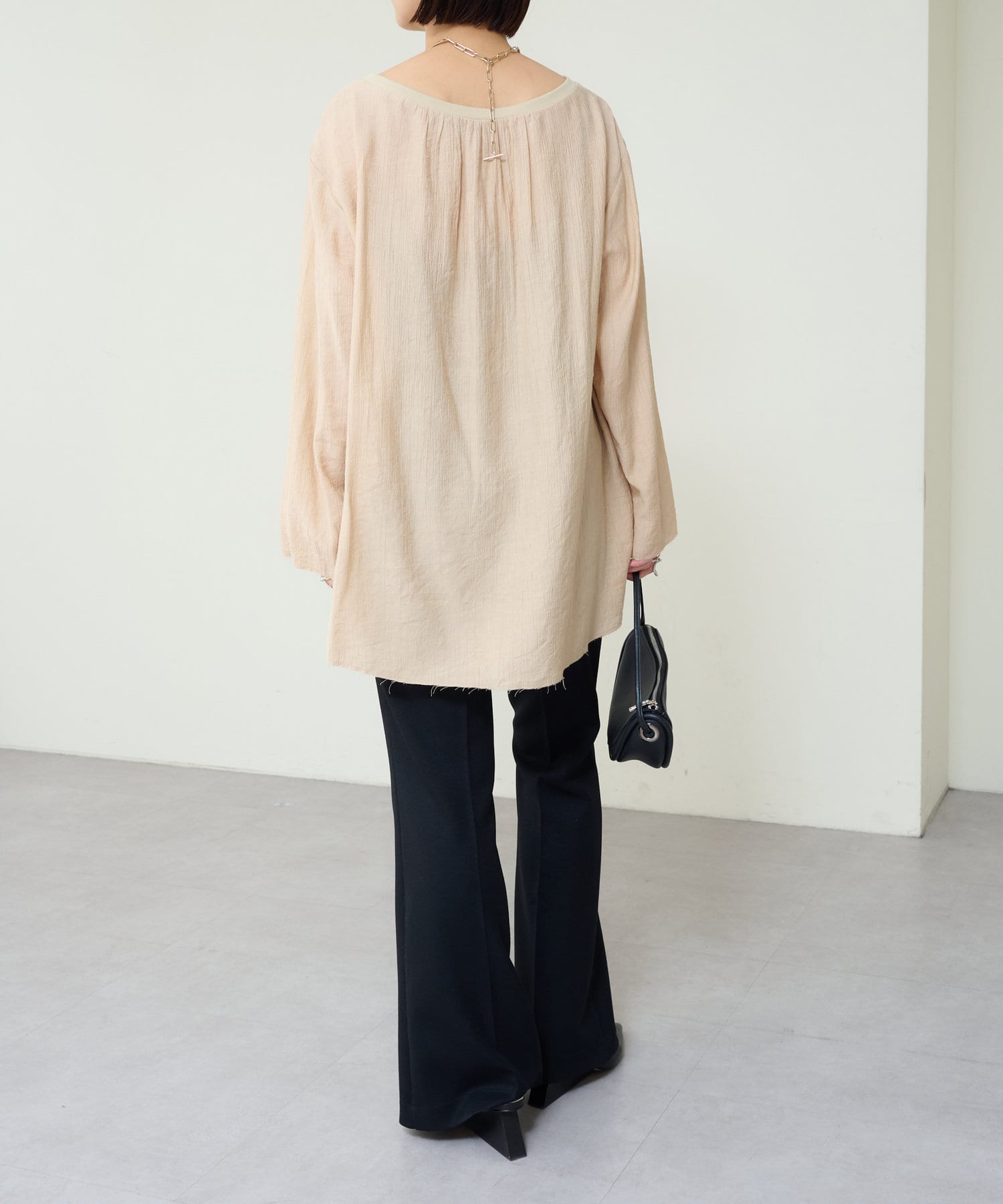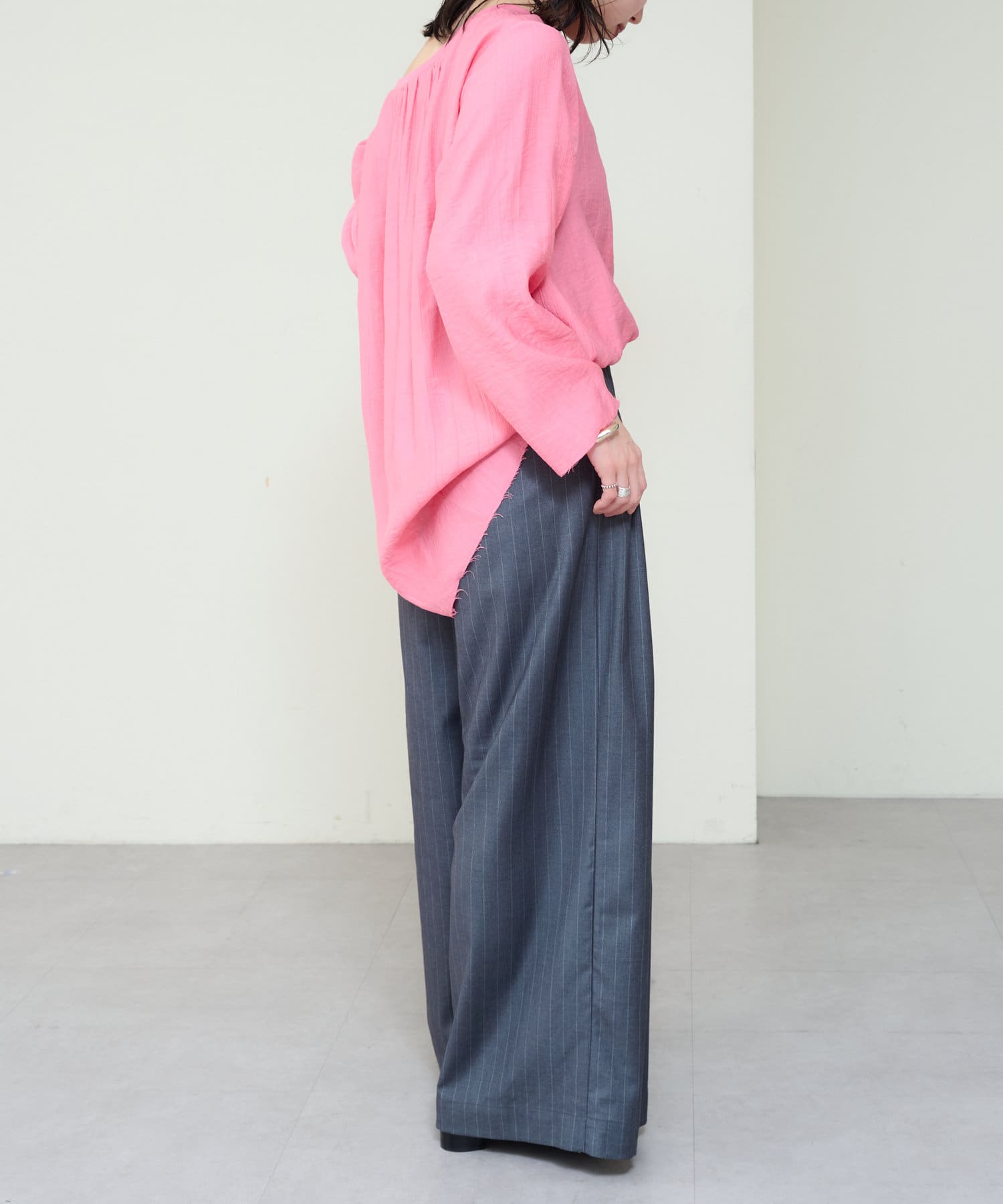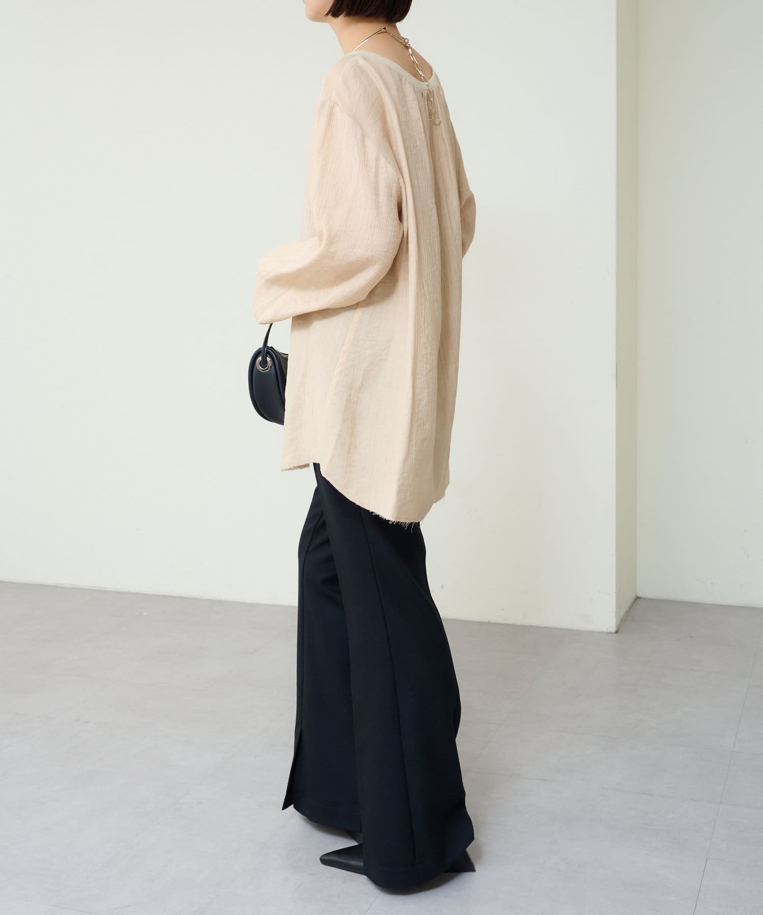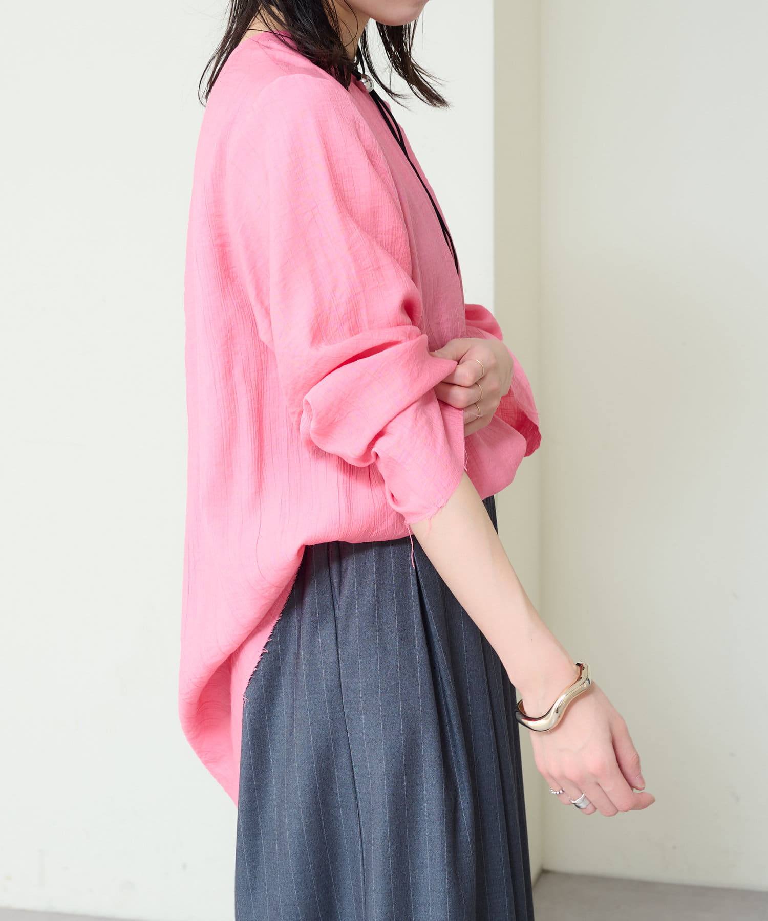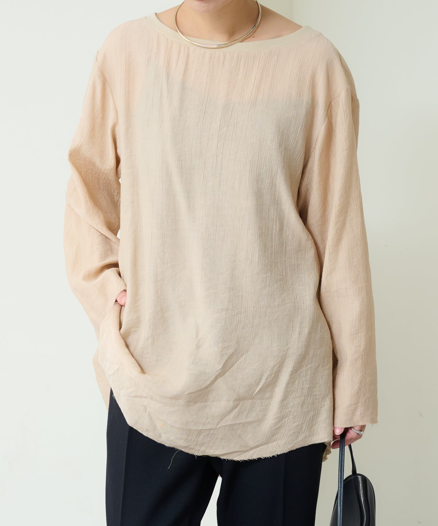 ・抜け感を演出する切りっぱなしの袖口やヘムライン。