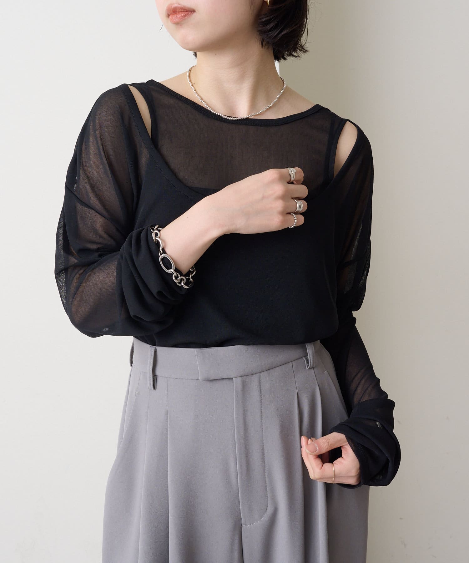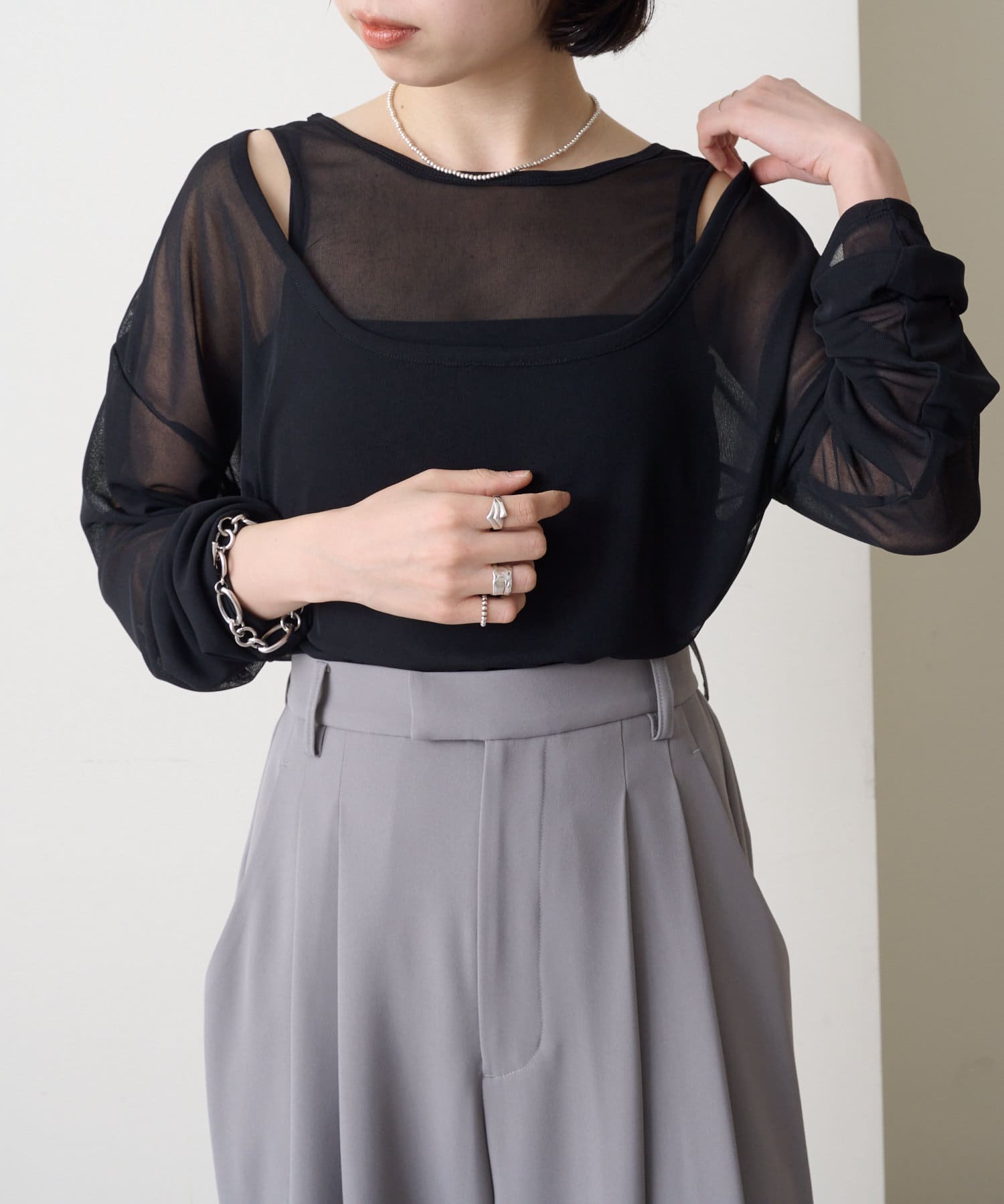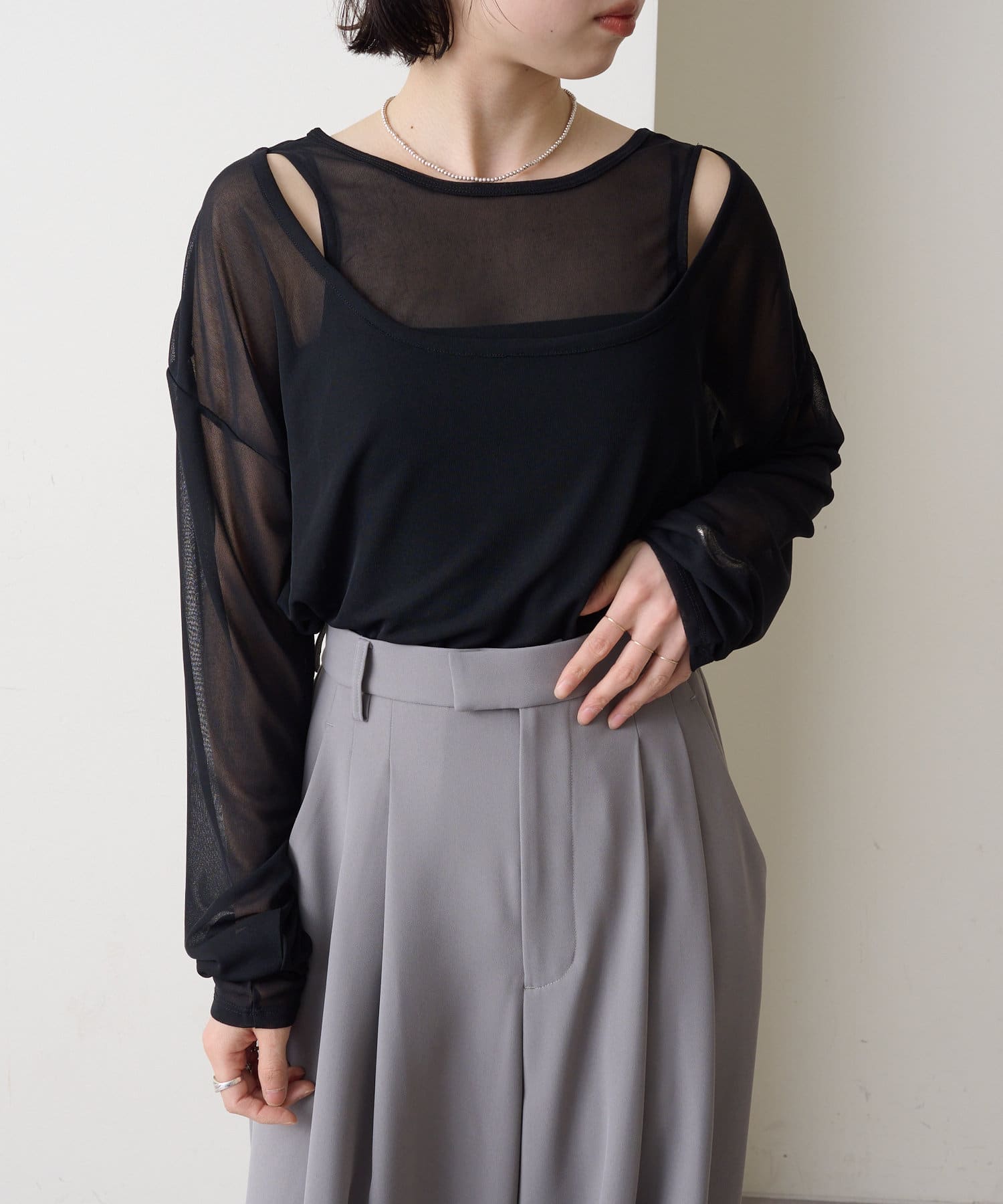 ・レイヤード風の着こなしが一枚で完成するシアーロンT