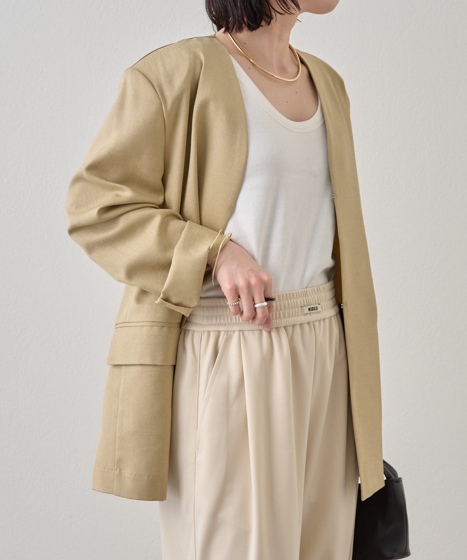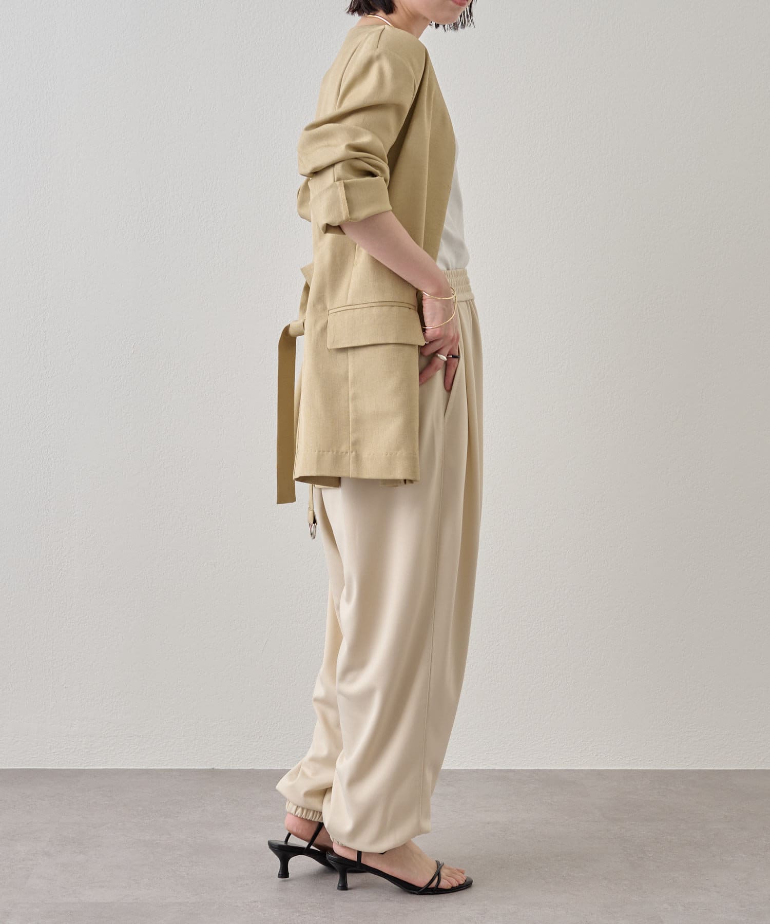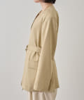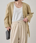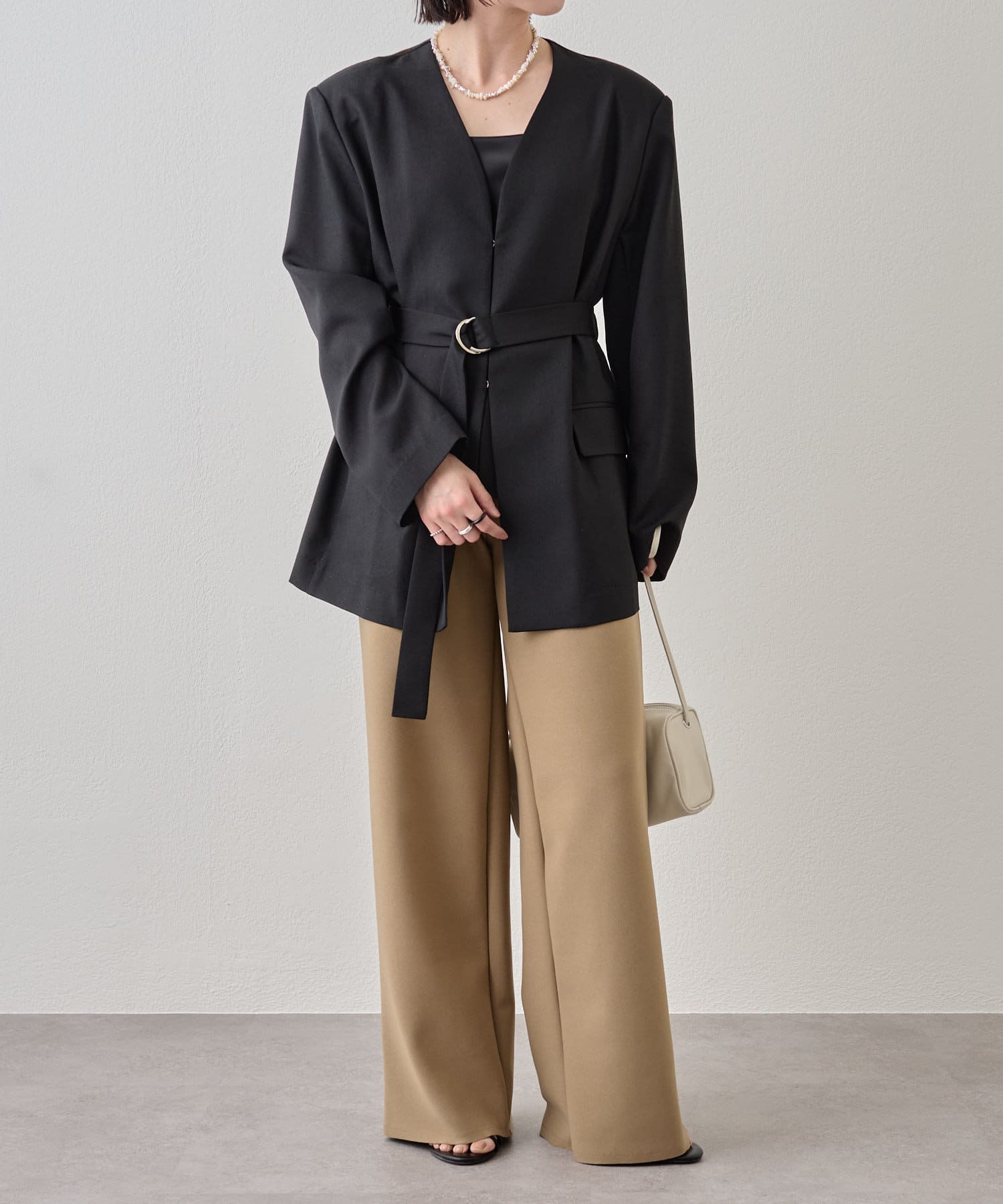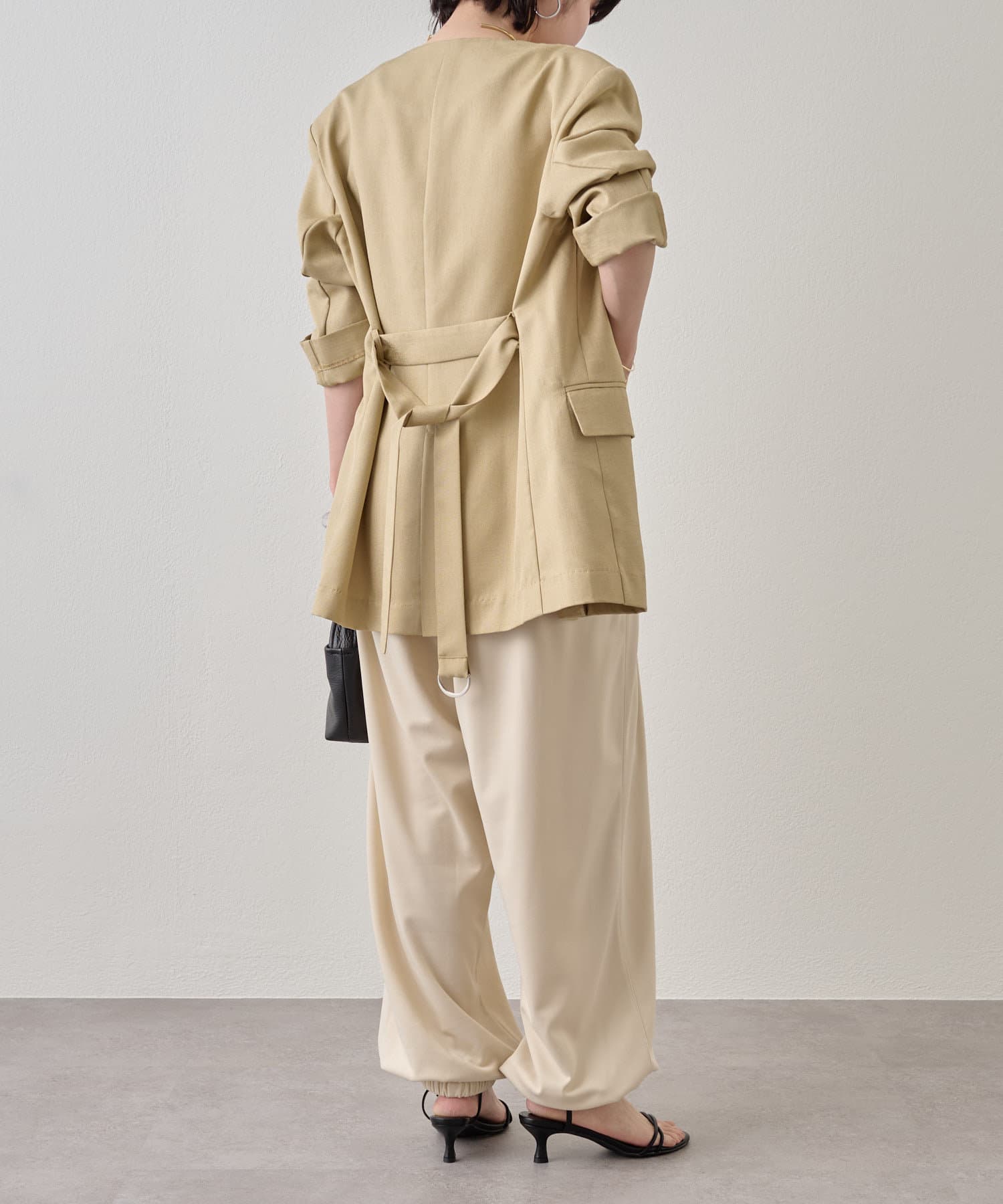 大人のこなれ感を演出するベルト付きのノーカラージャケット