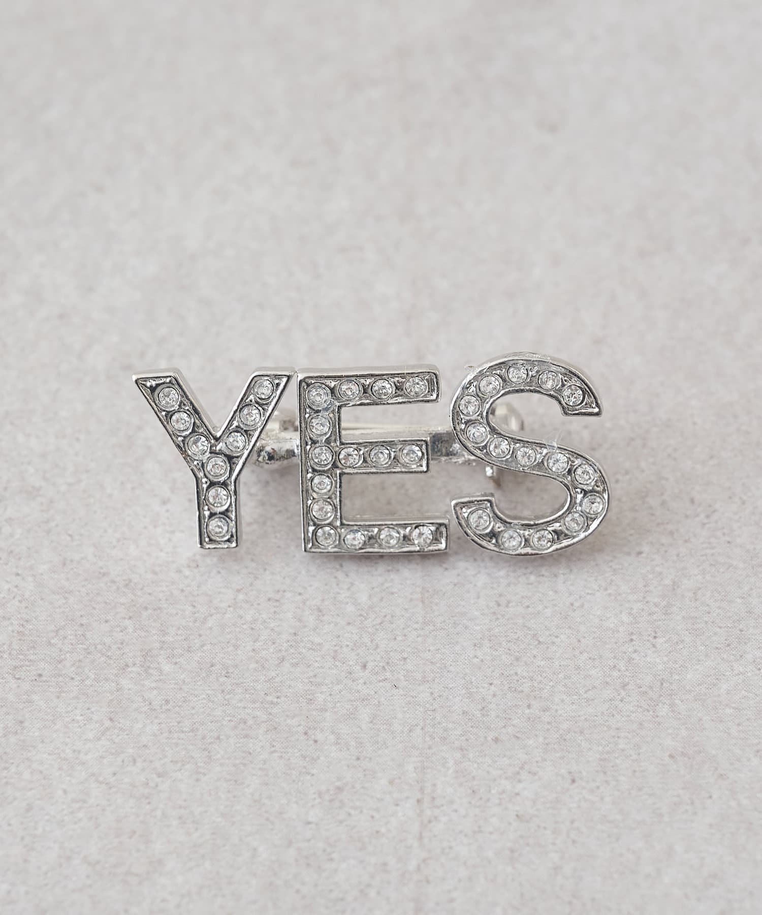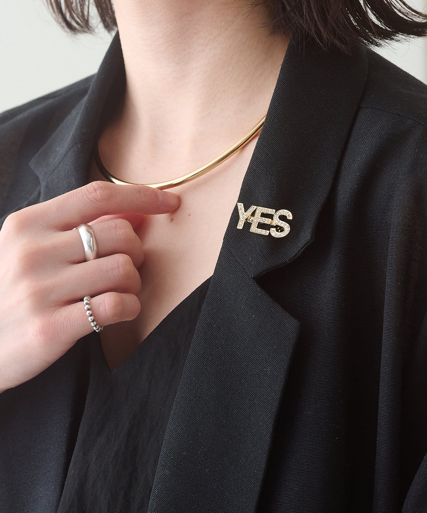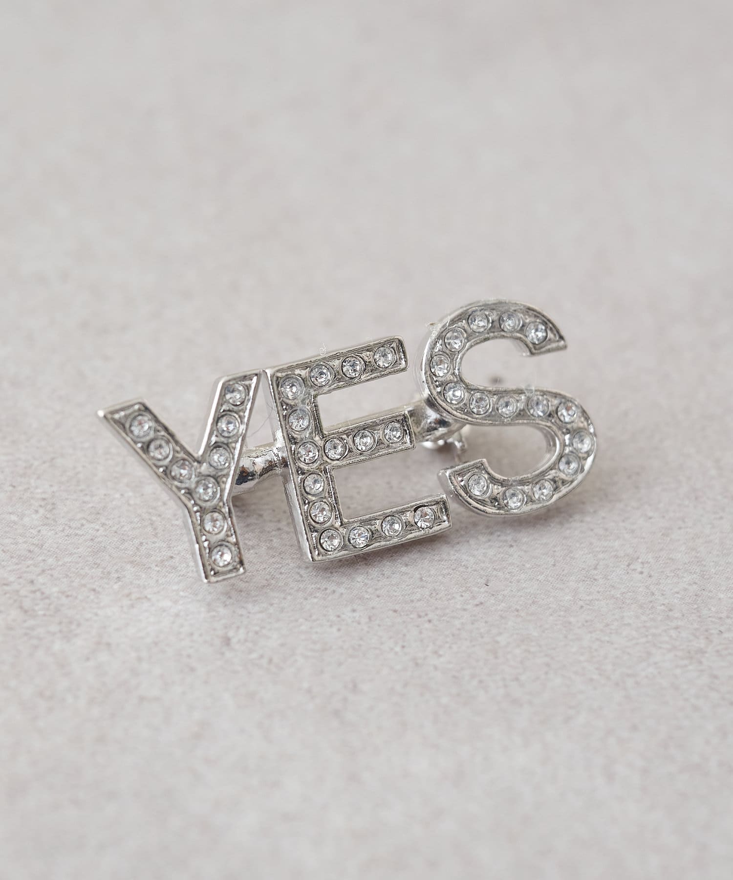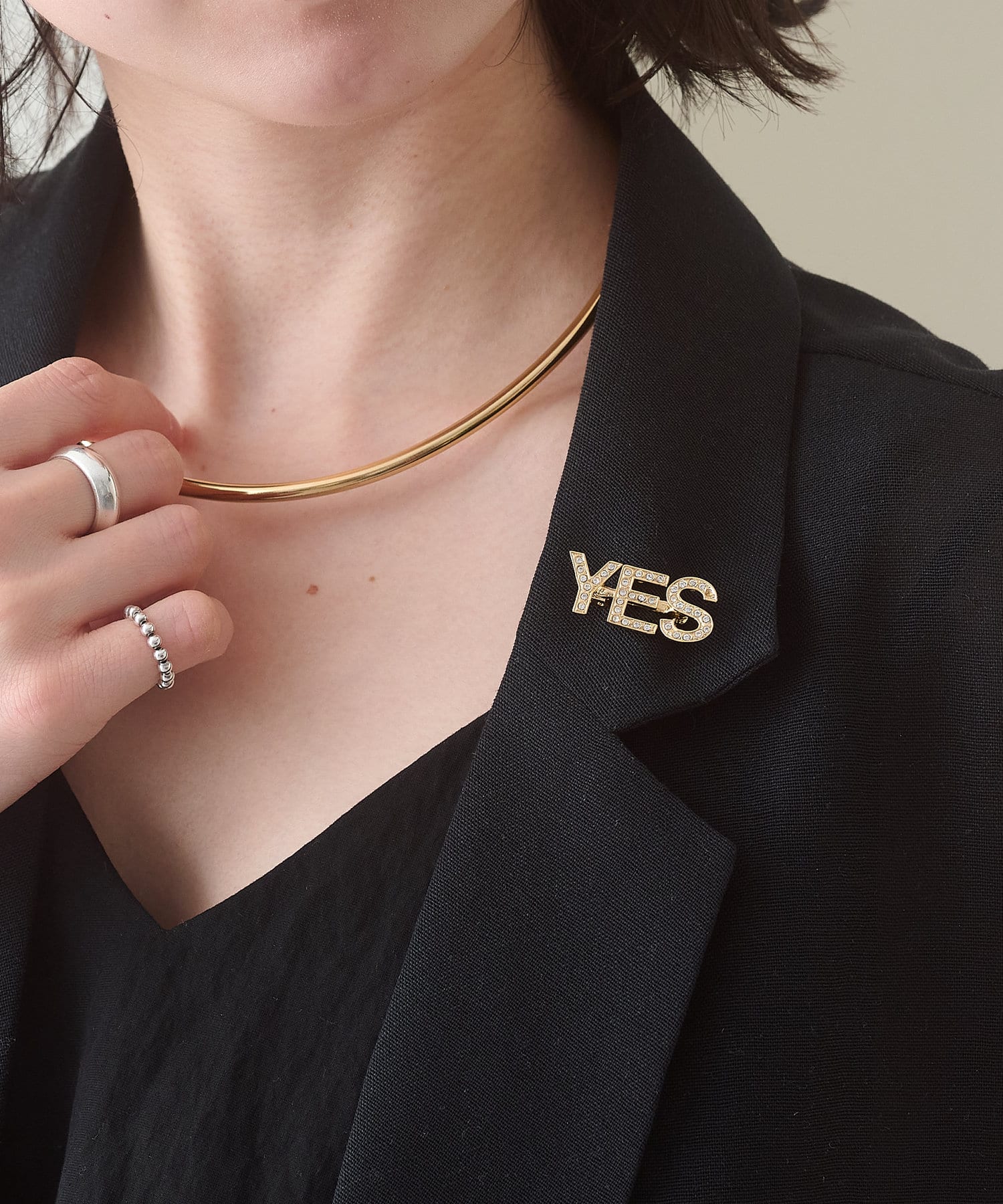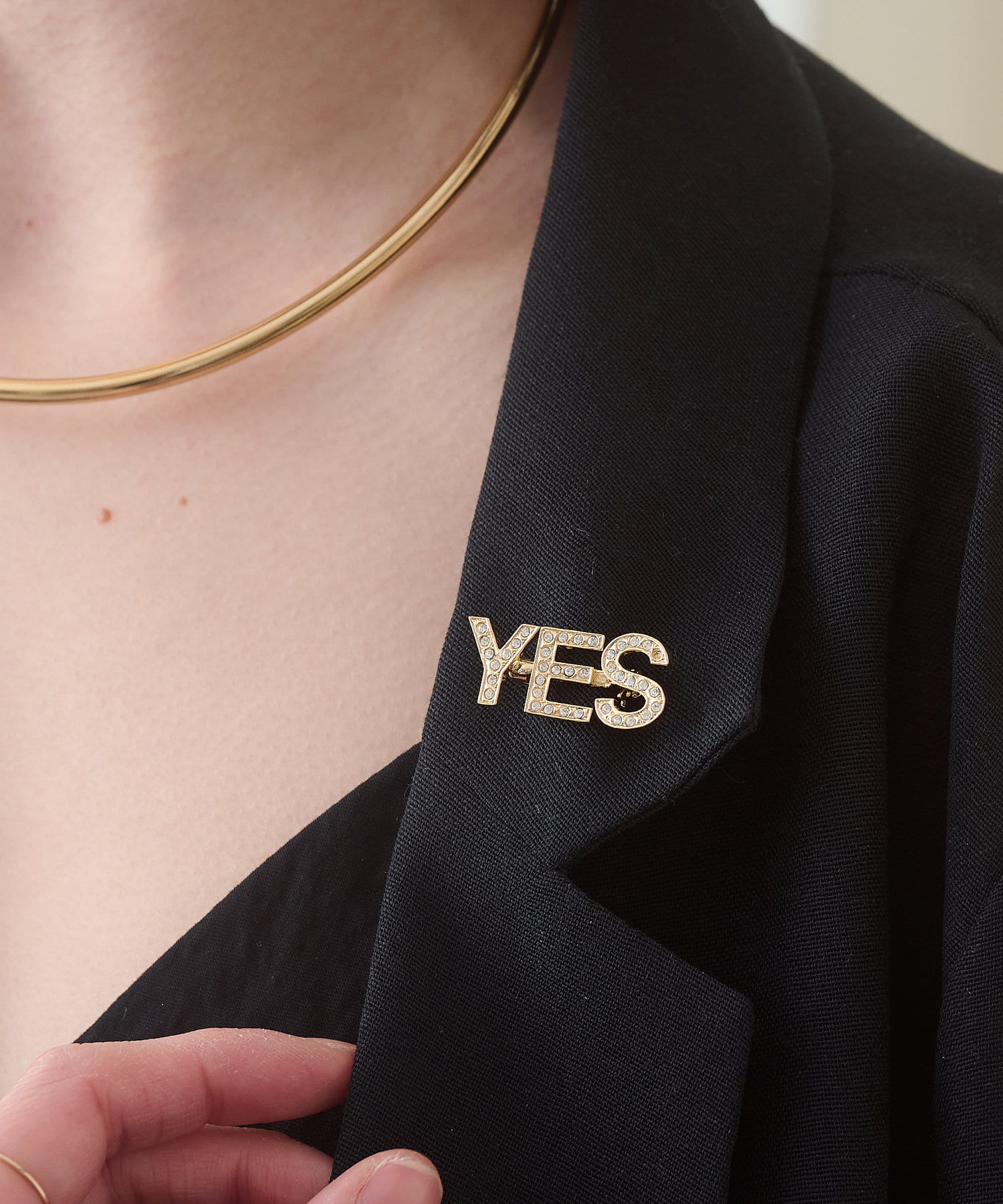 胸元を華やかに彩る「YES」ロゴのピンバッチ