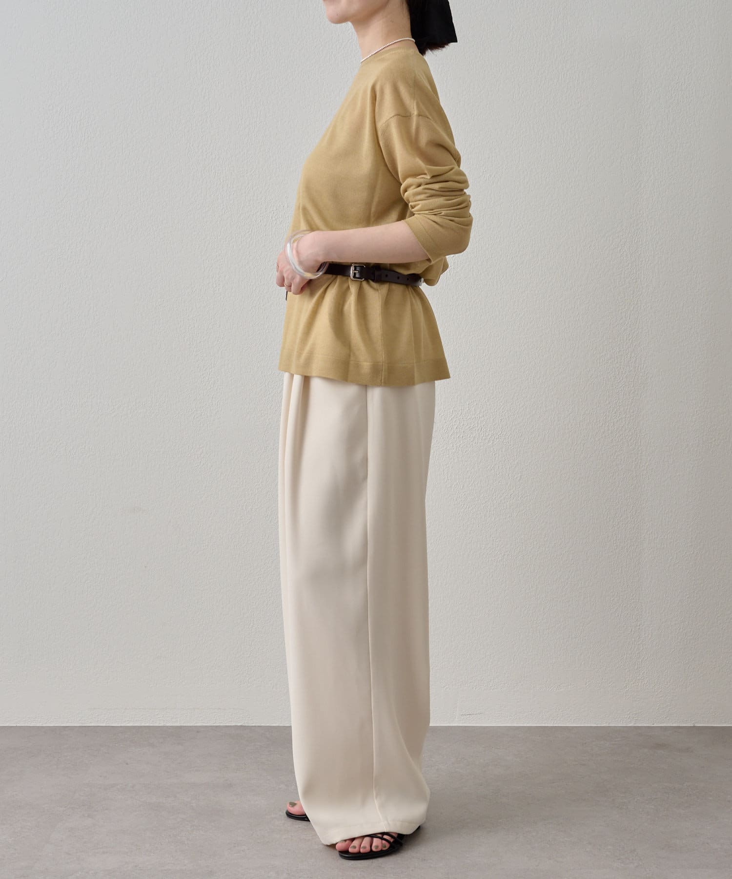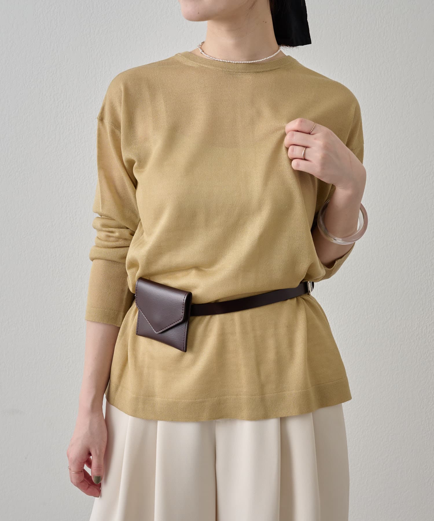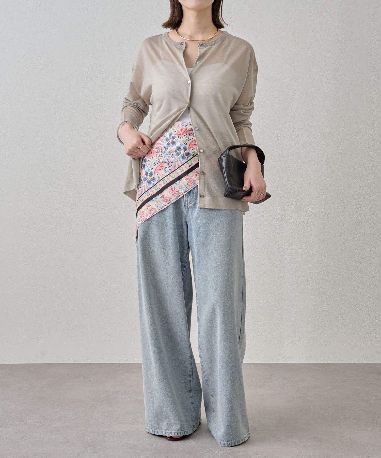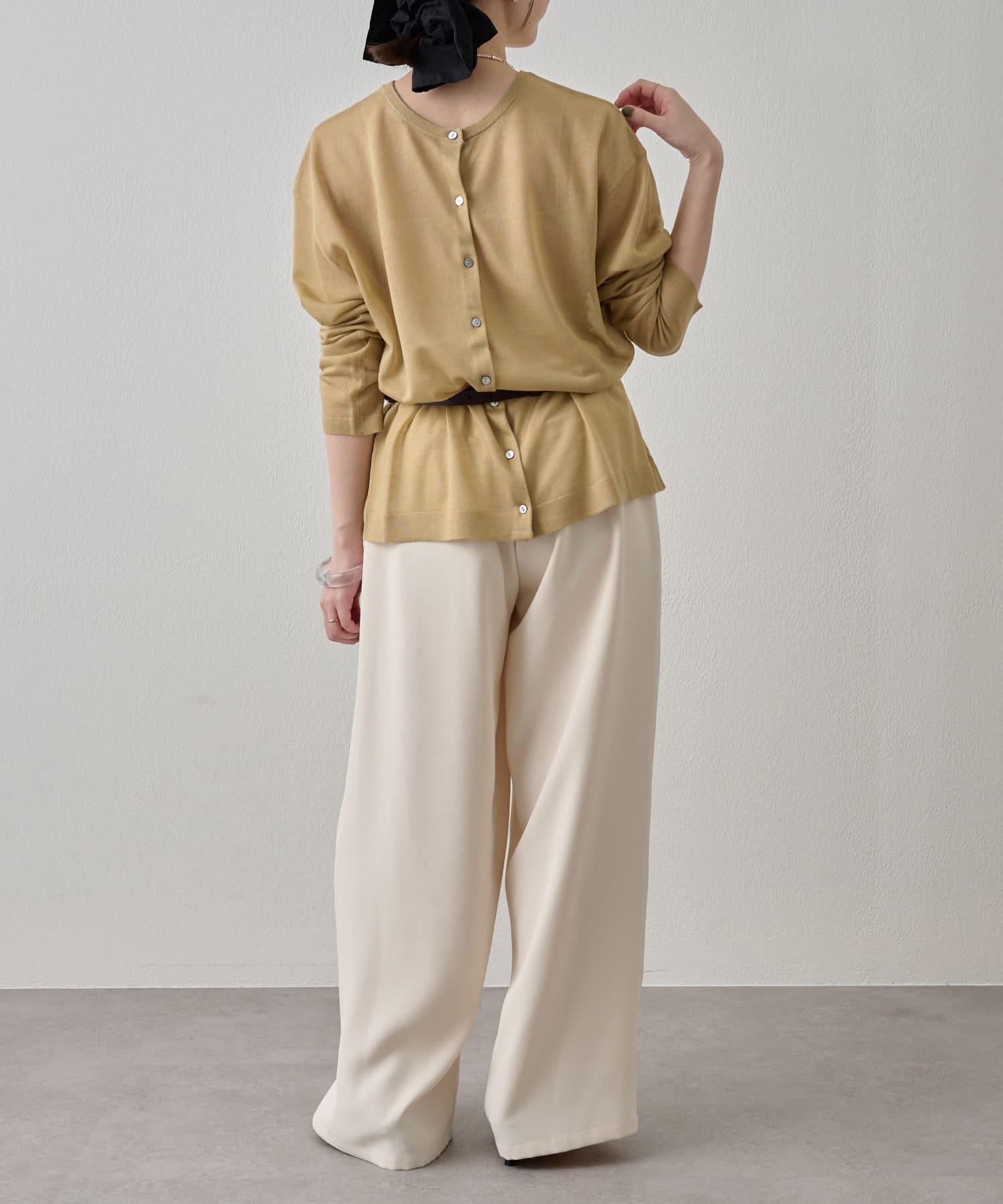 カラーアイテムがスタイリングを彩るシアーカーディガン