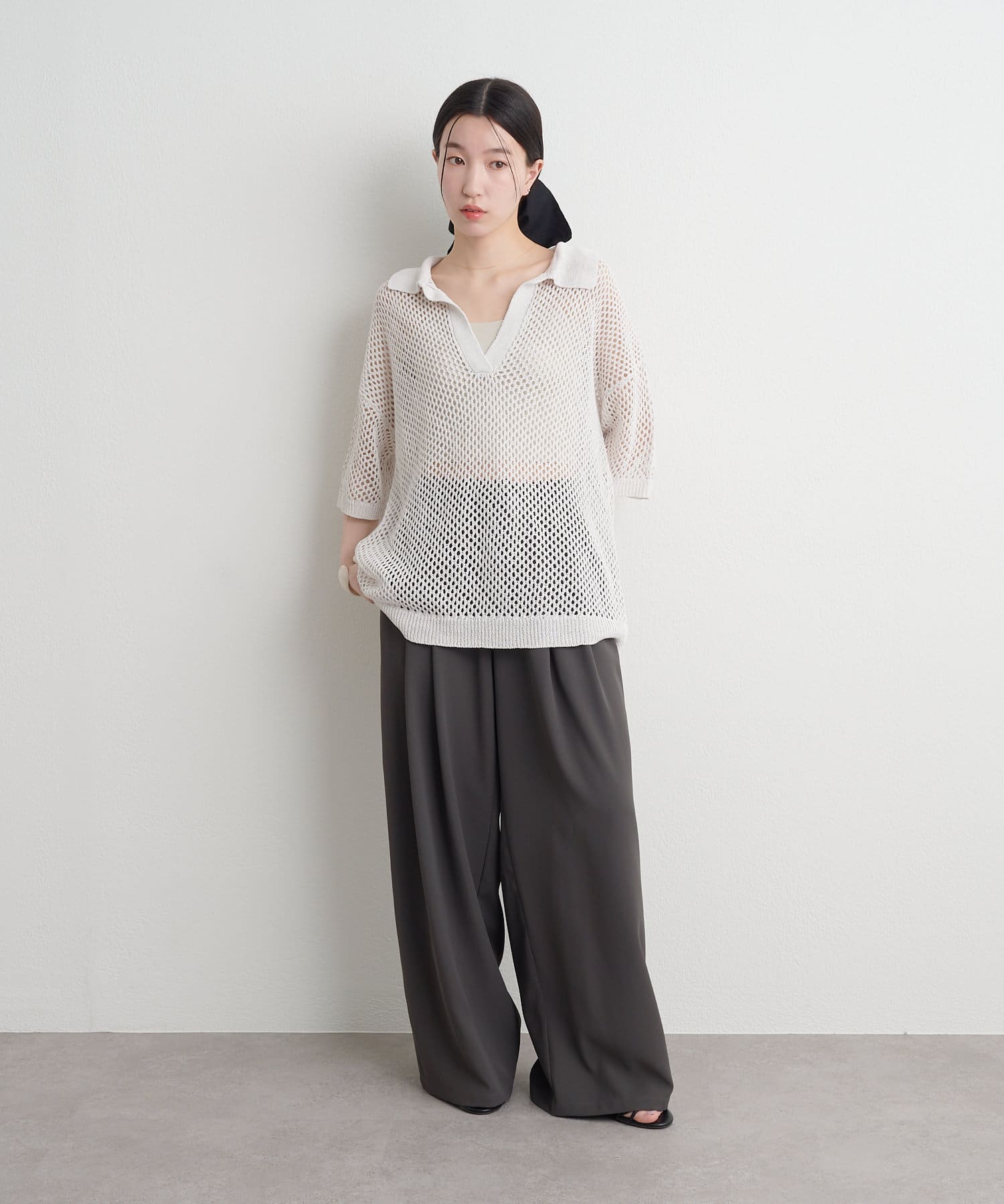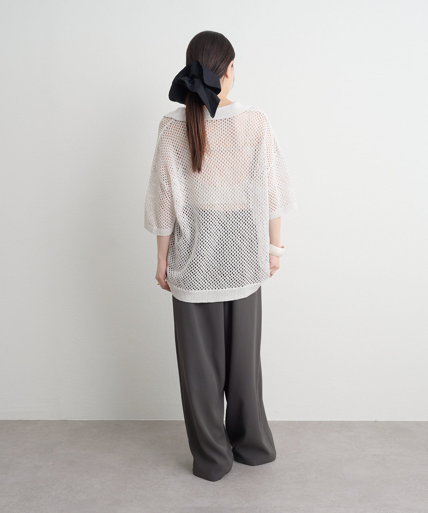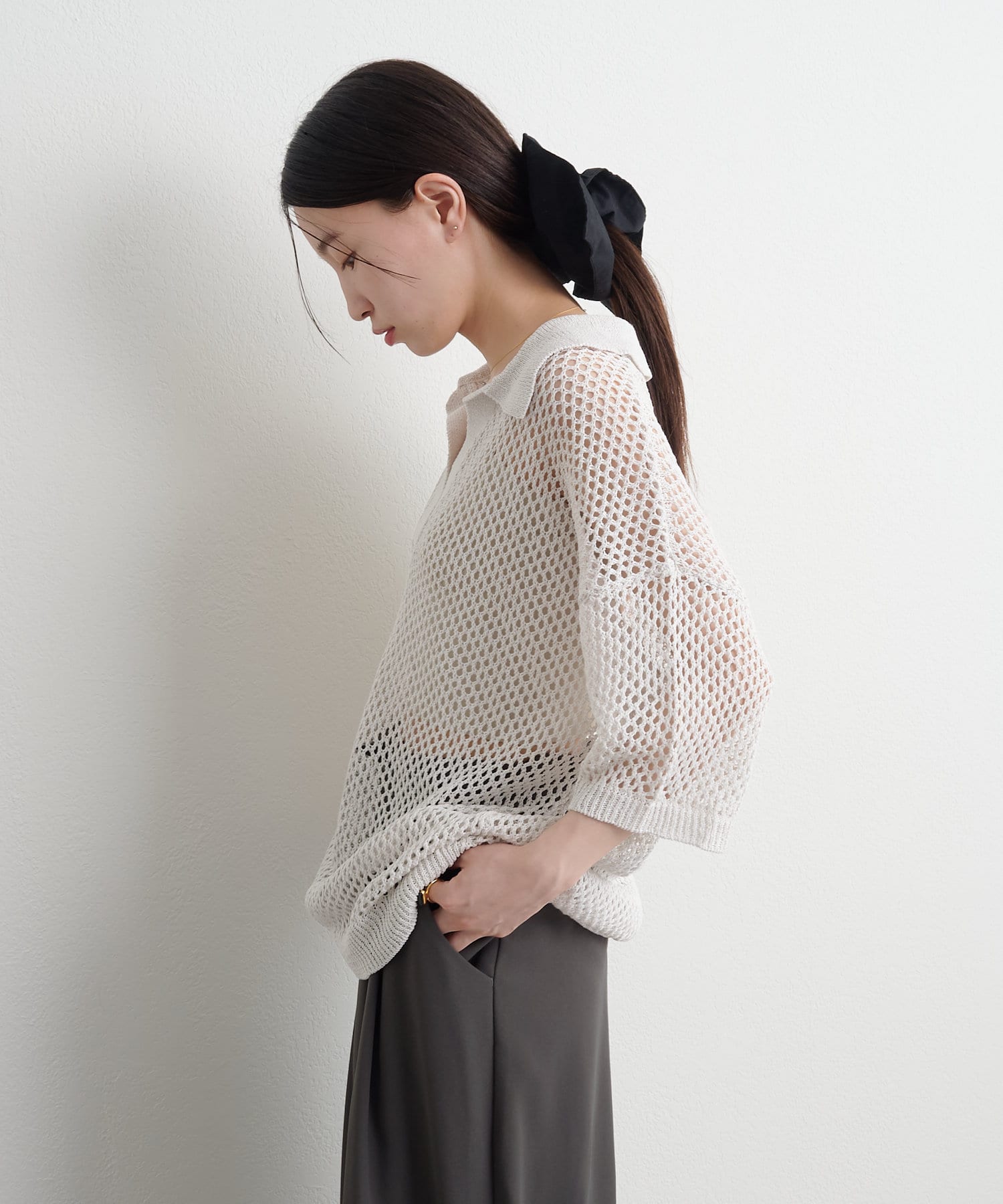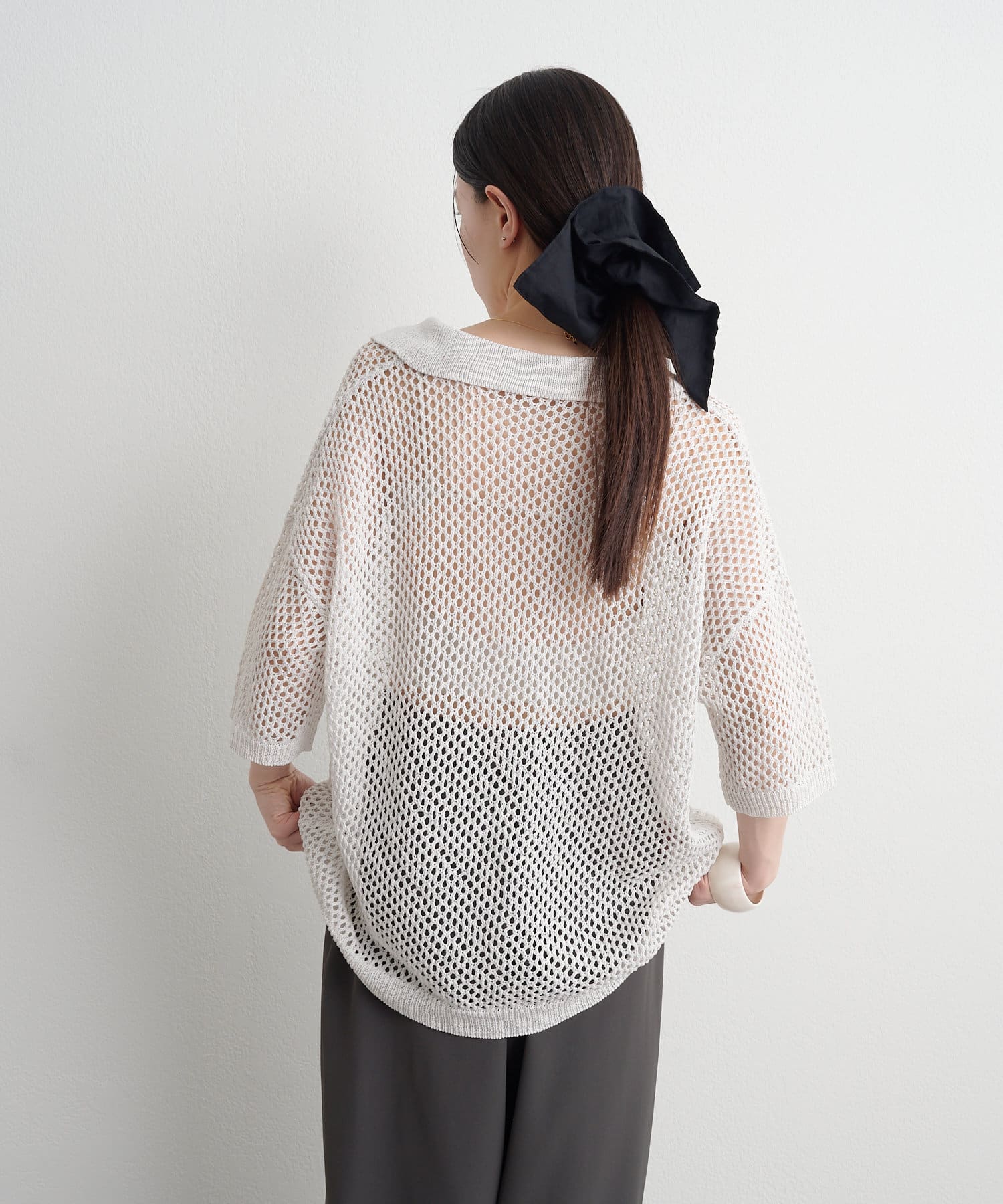 【Omekashi】襟付きメッシュヘンリーニット