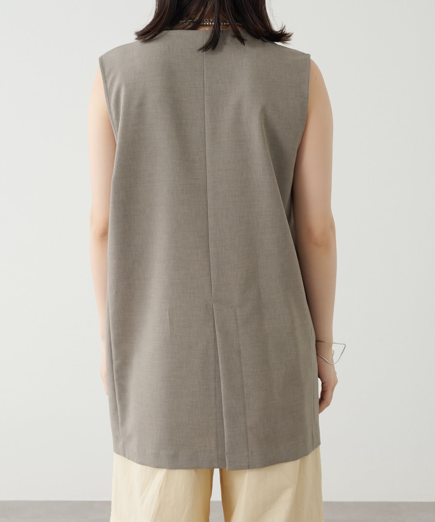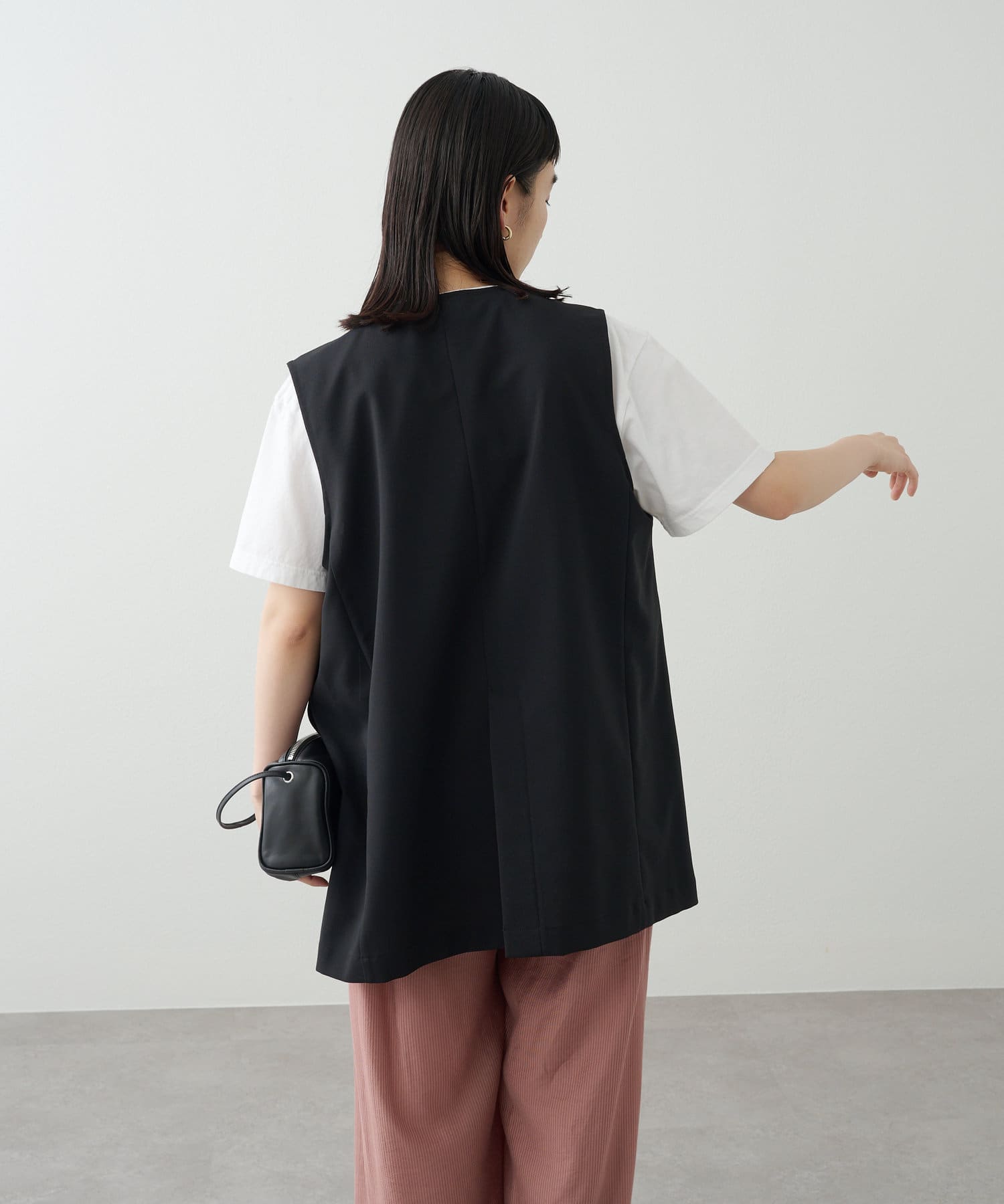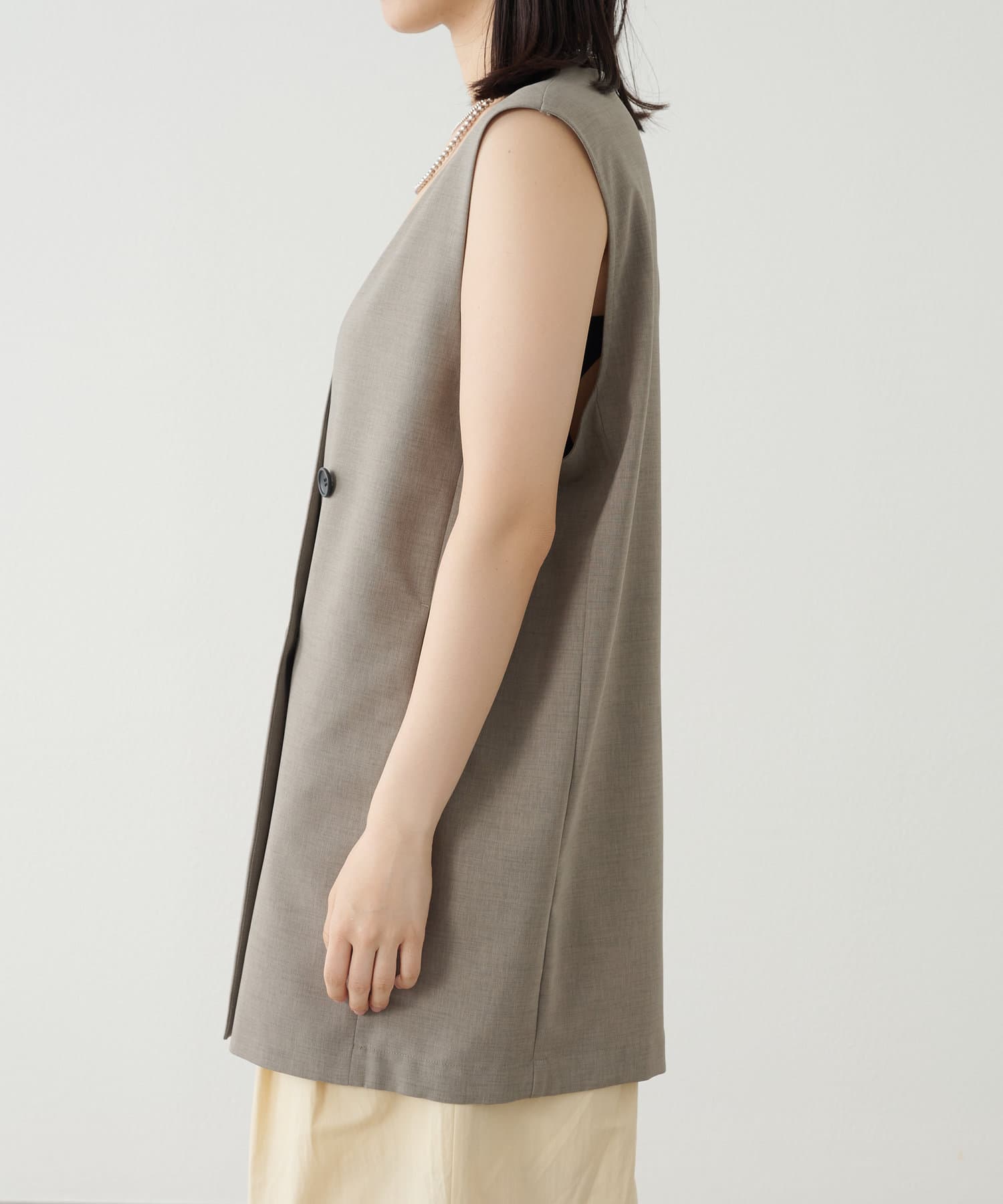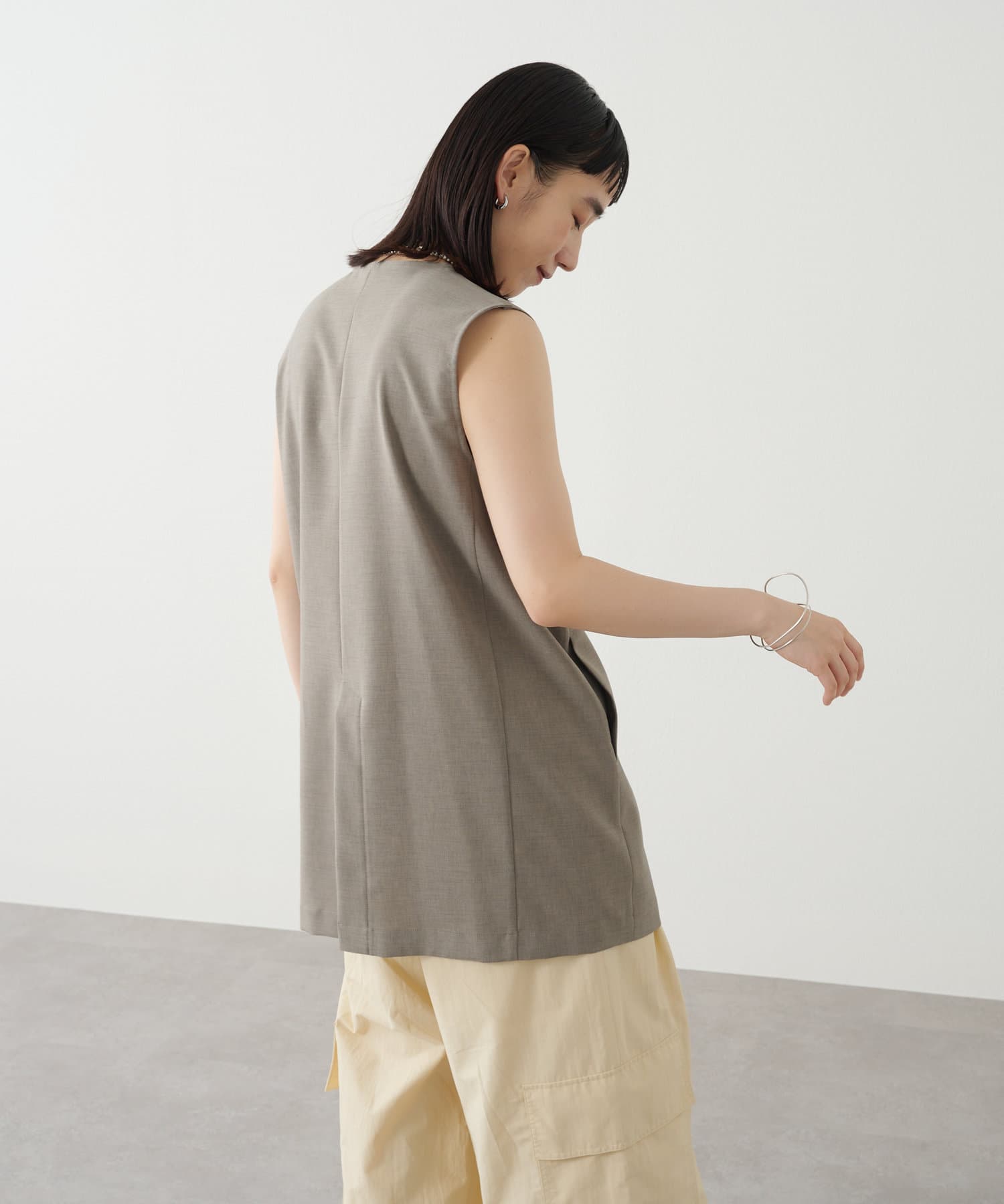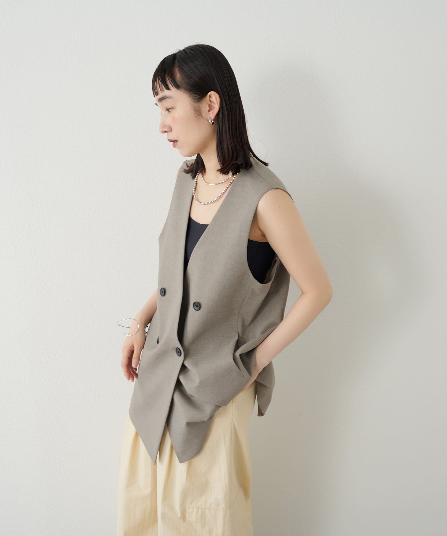 ・ノーカラーで首回りすっきりなデザインのジレ。