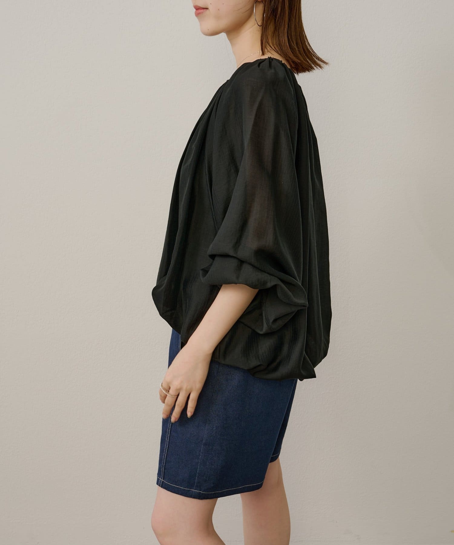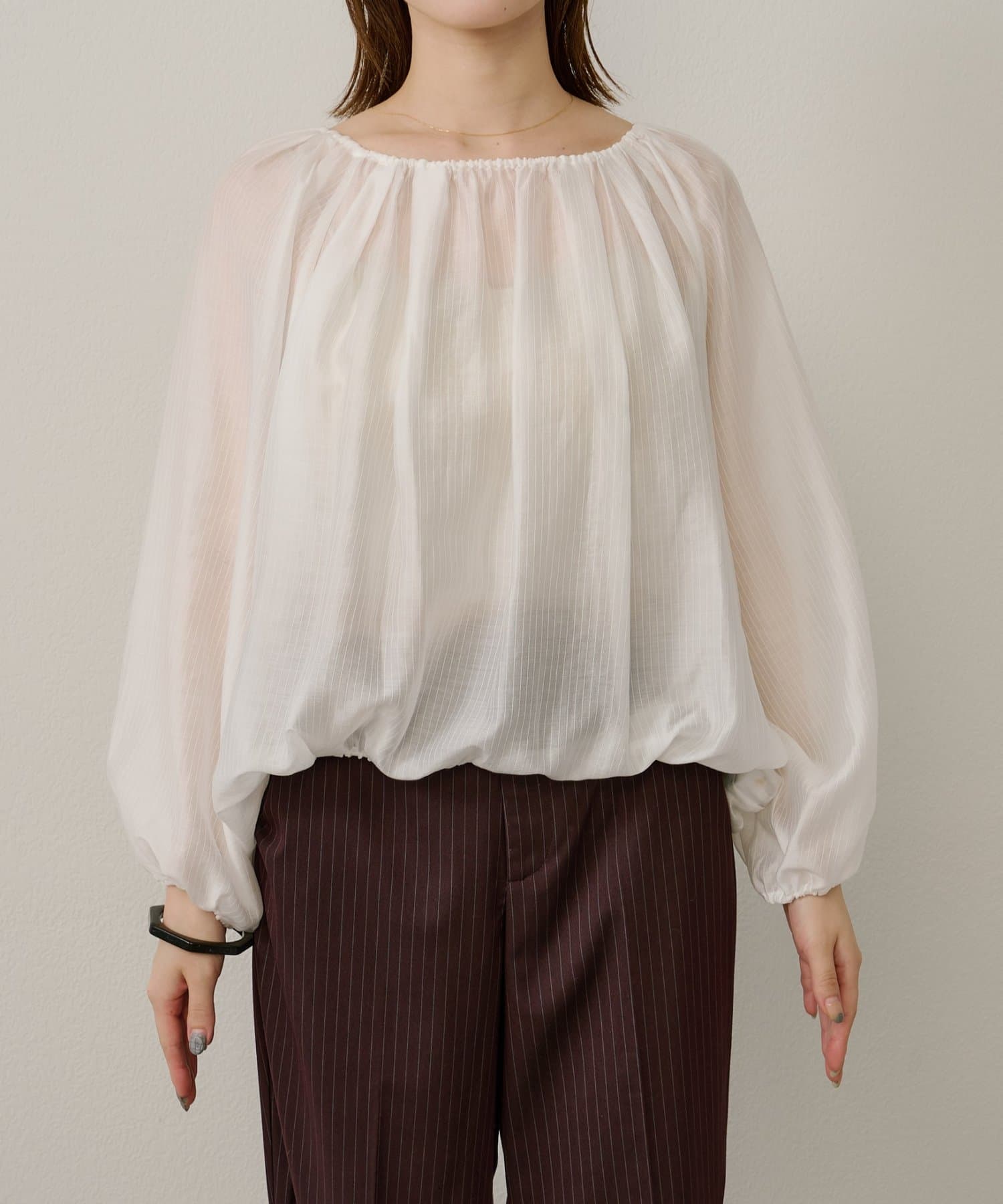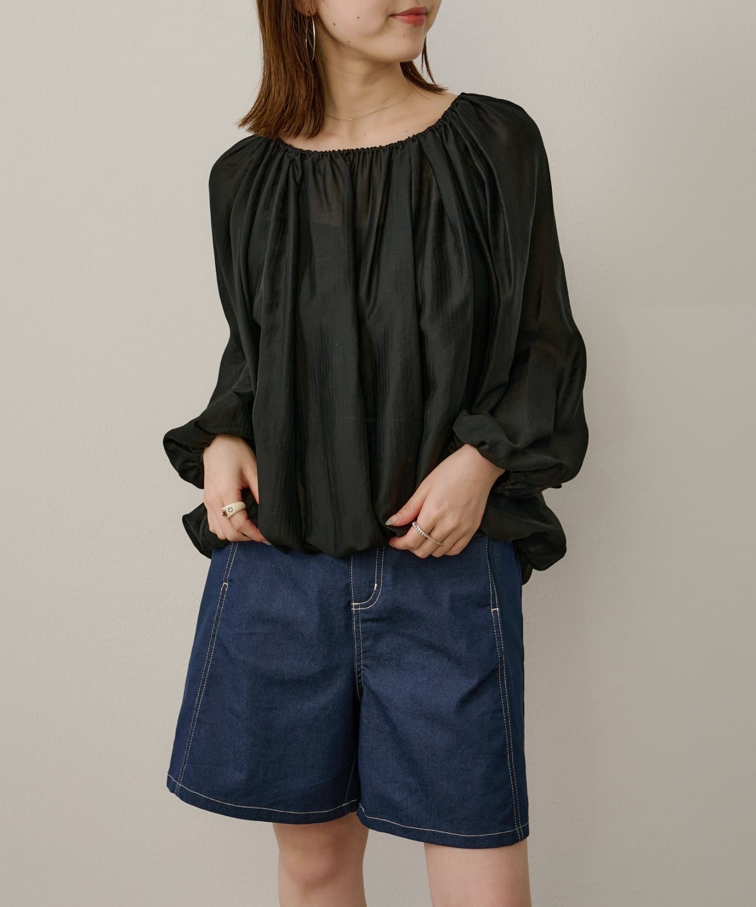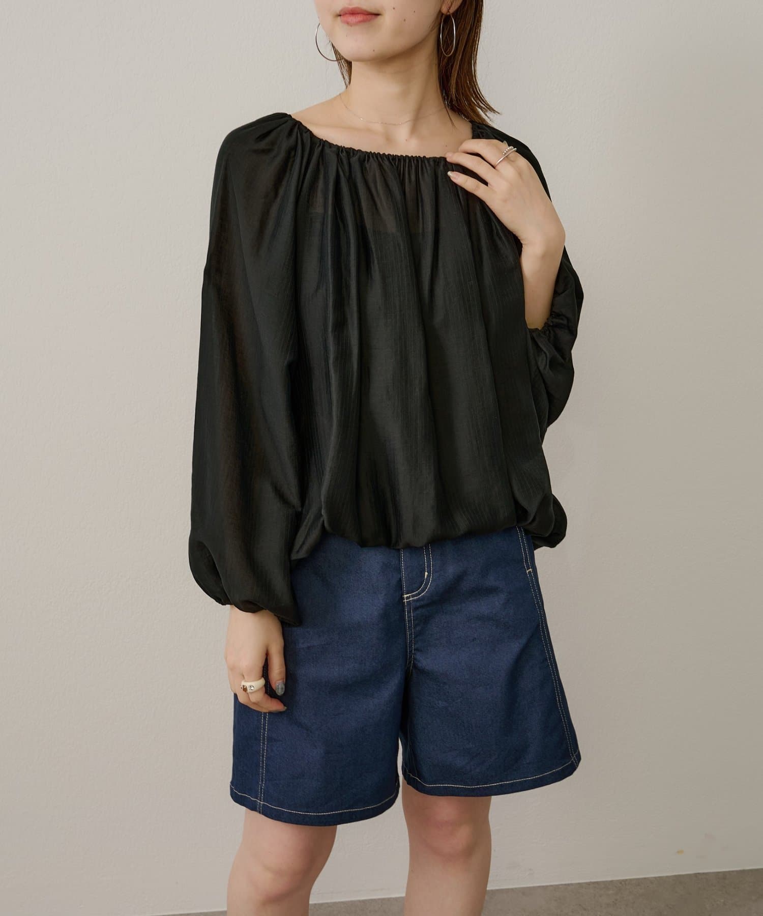 女性らしい柔らかな雰囲気をまとったギャザーブラウス