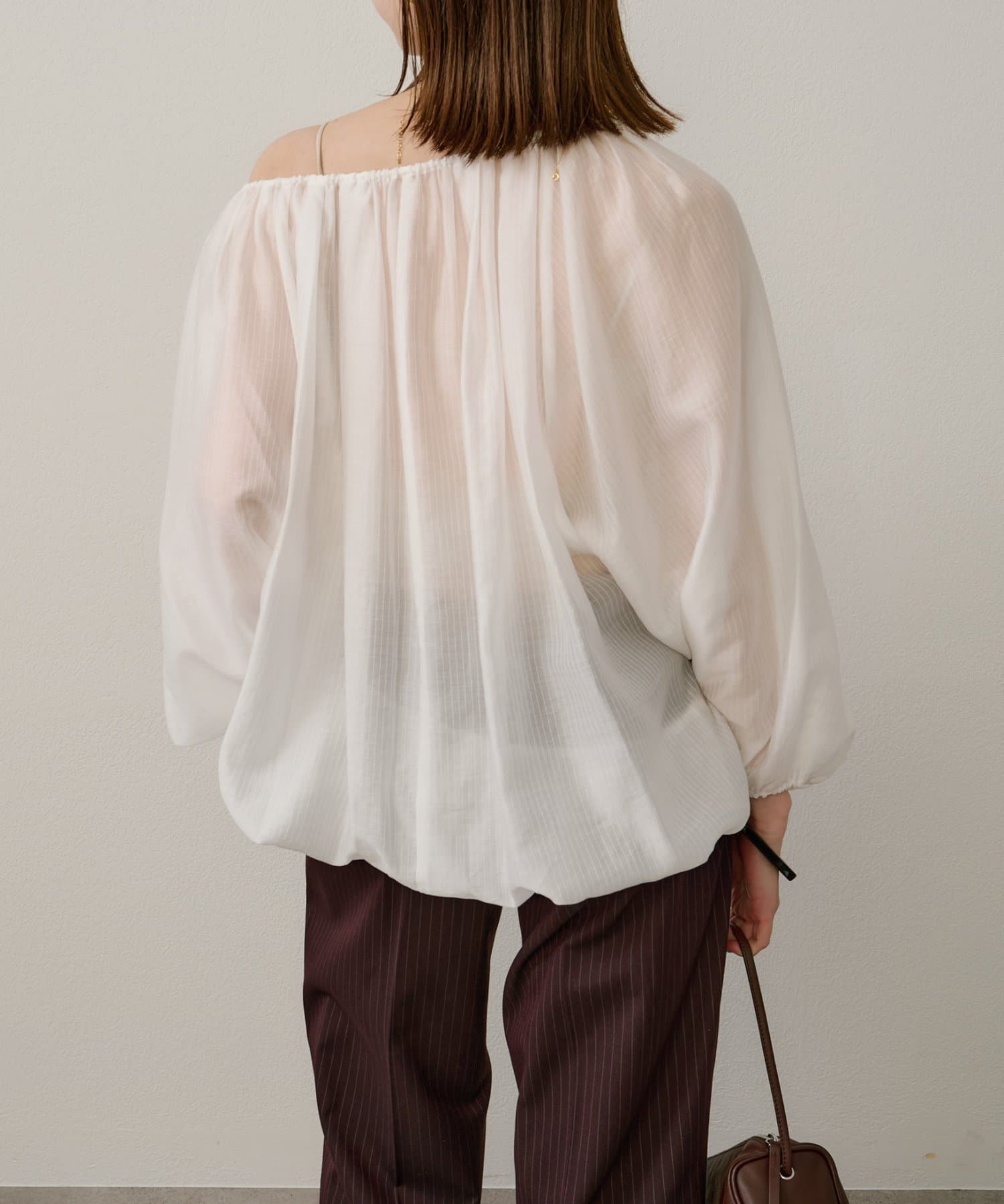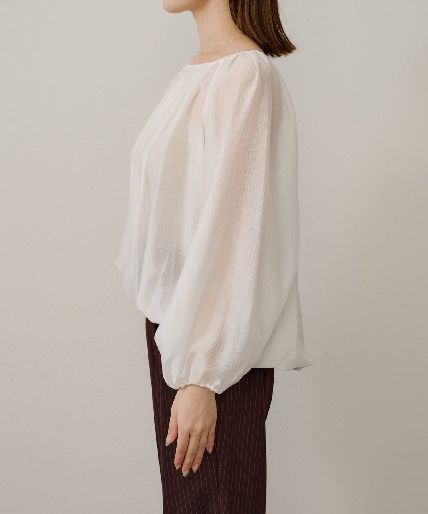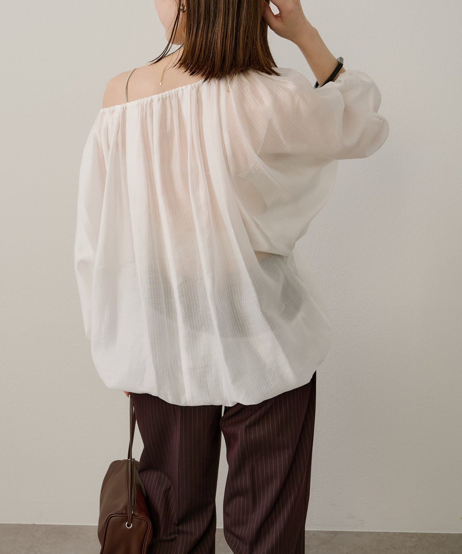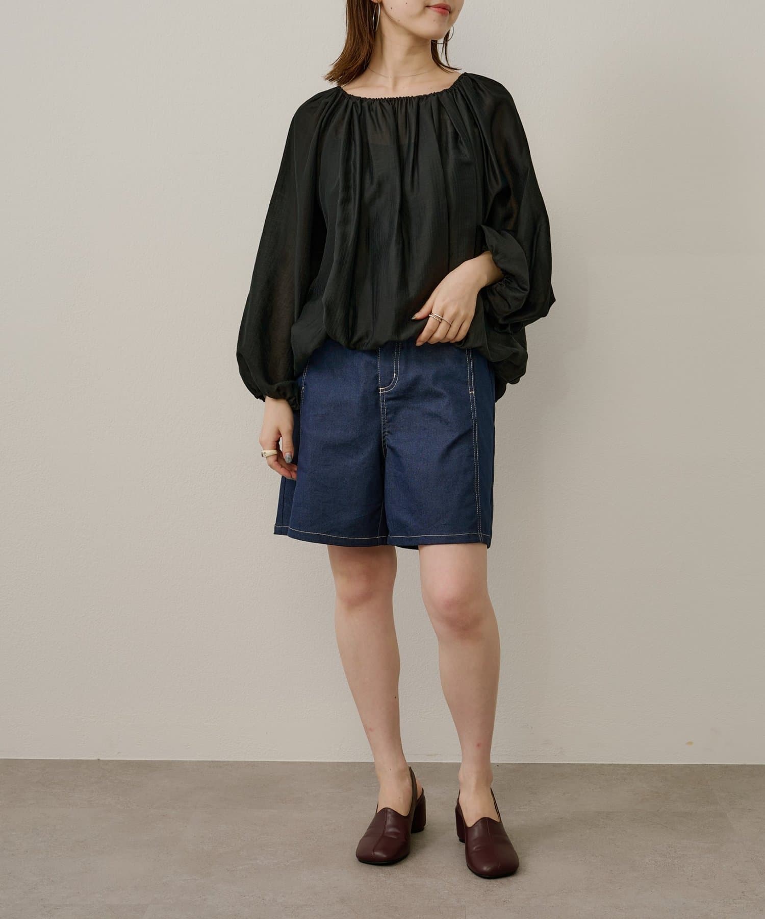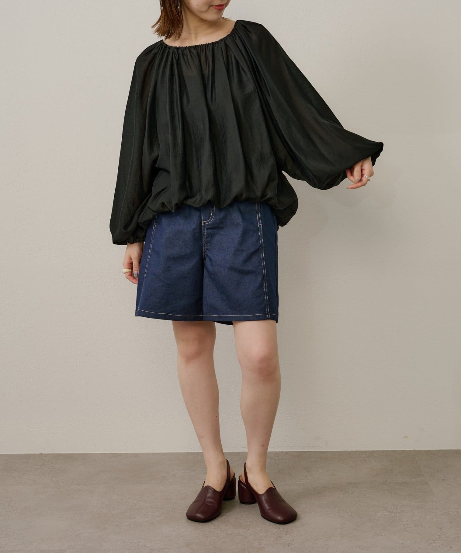 女性らしい柔らかな雰囲気をまとったギャザーブラウス