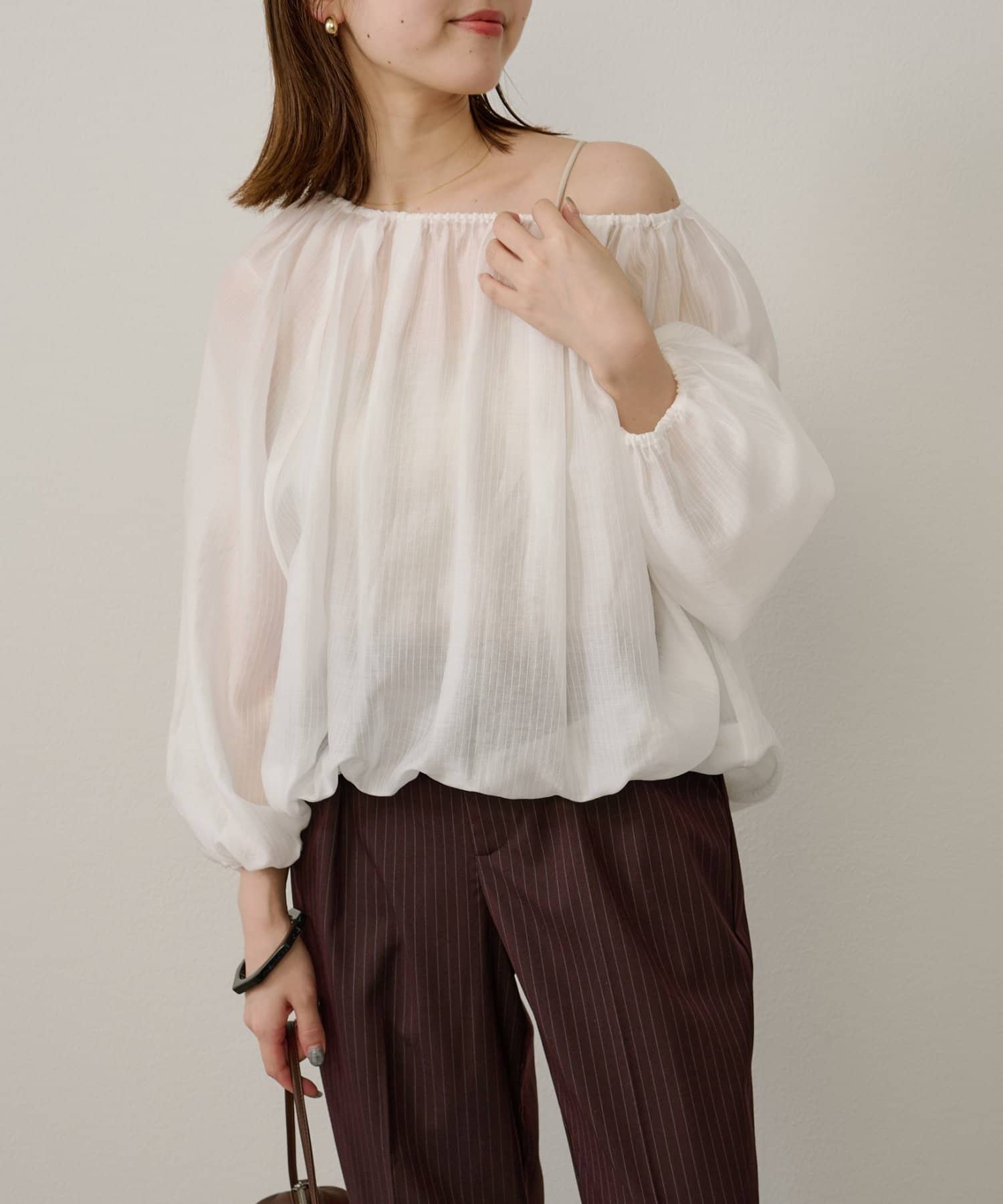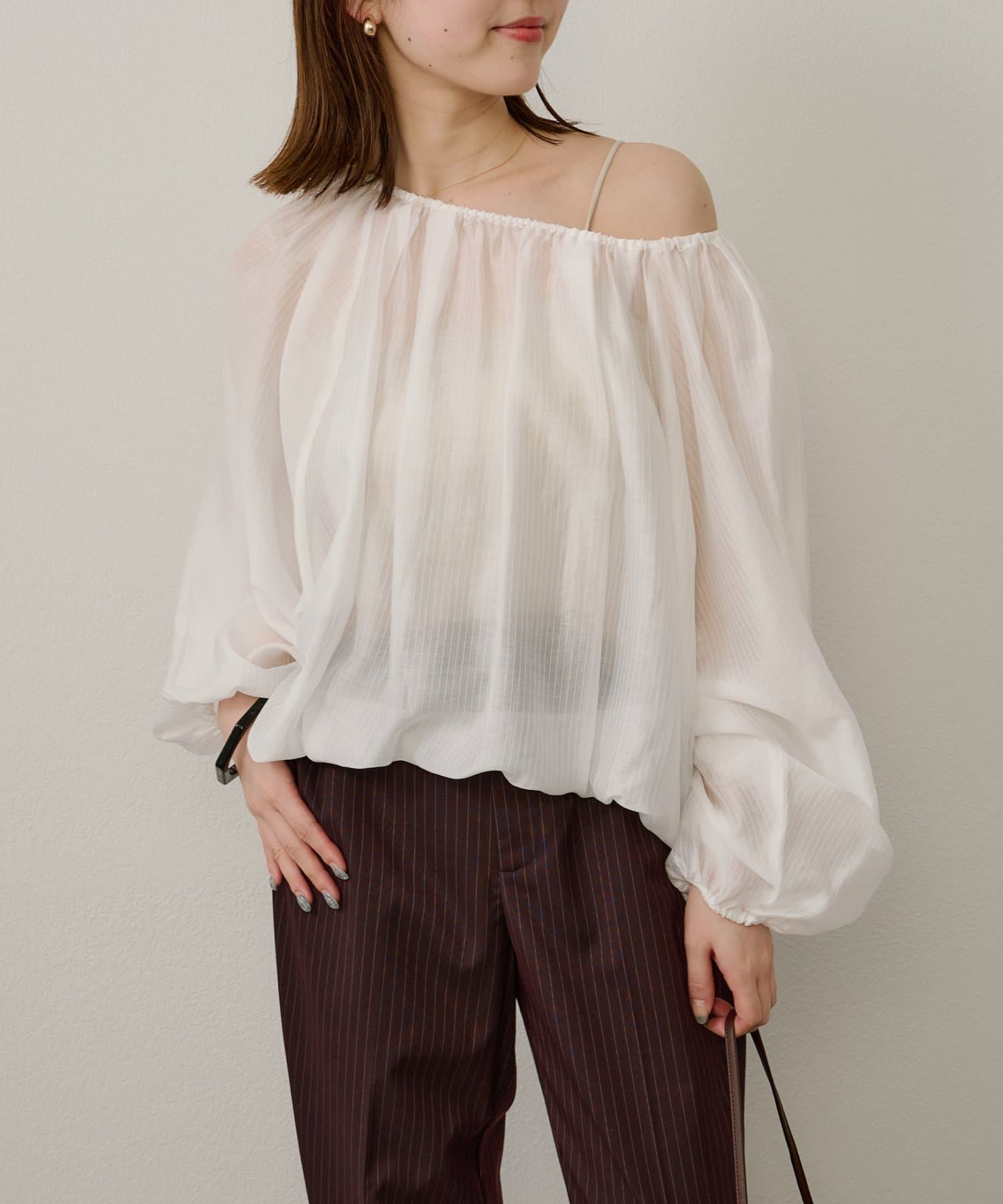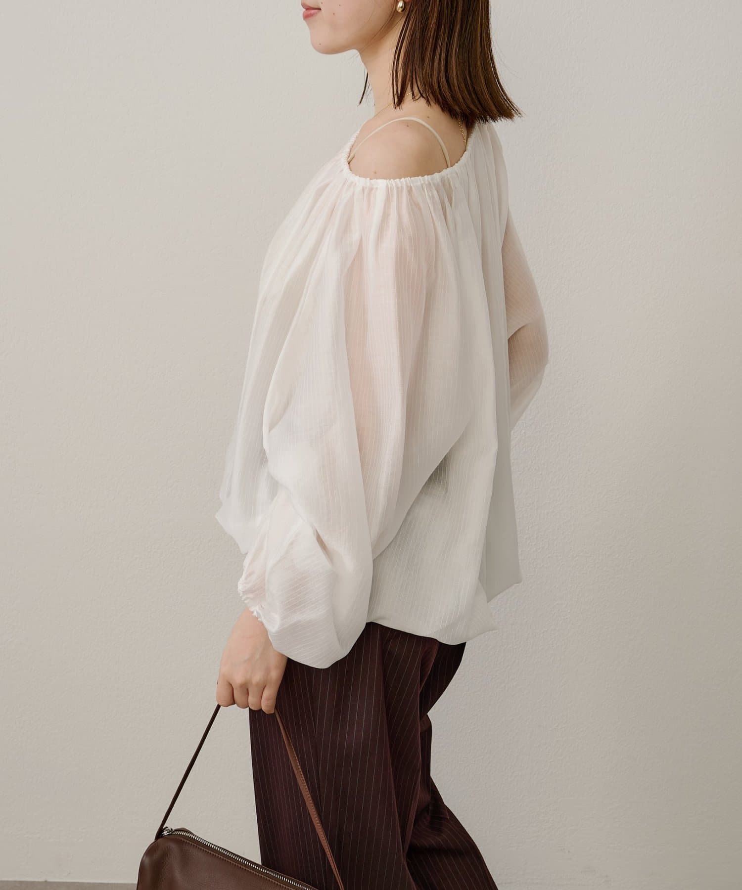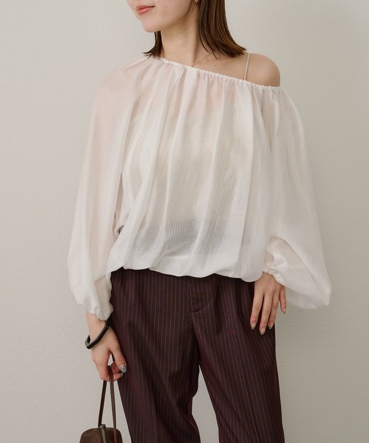 女性らしい柔らかな雰囲気をまとったギャザーブラウス