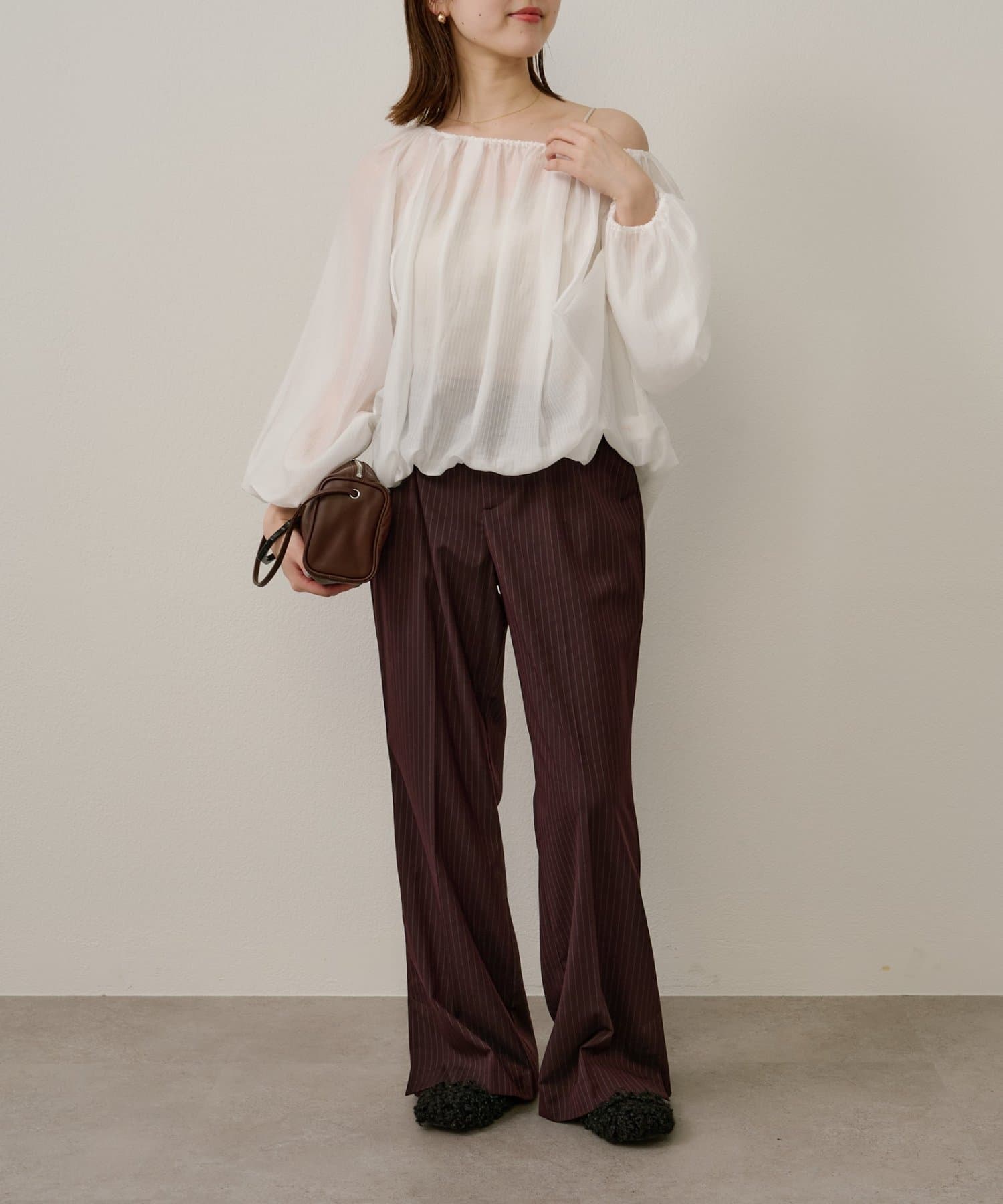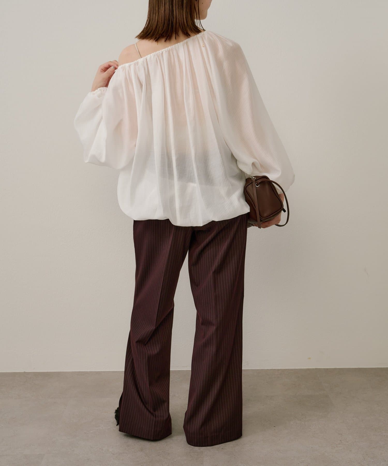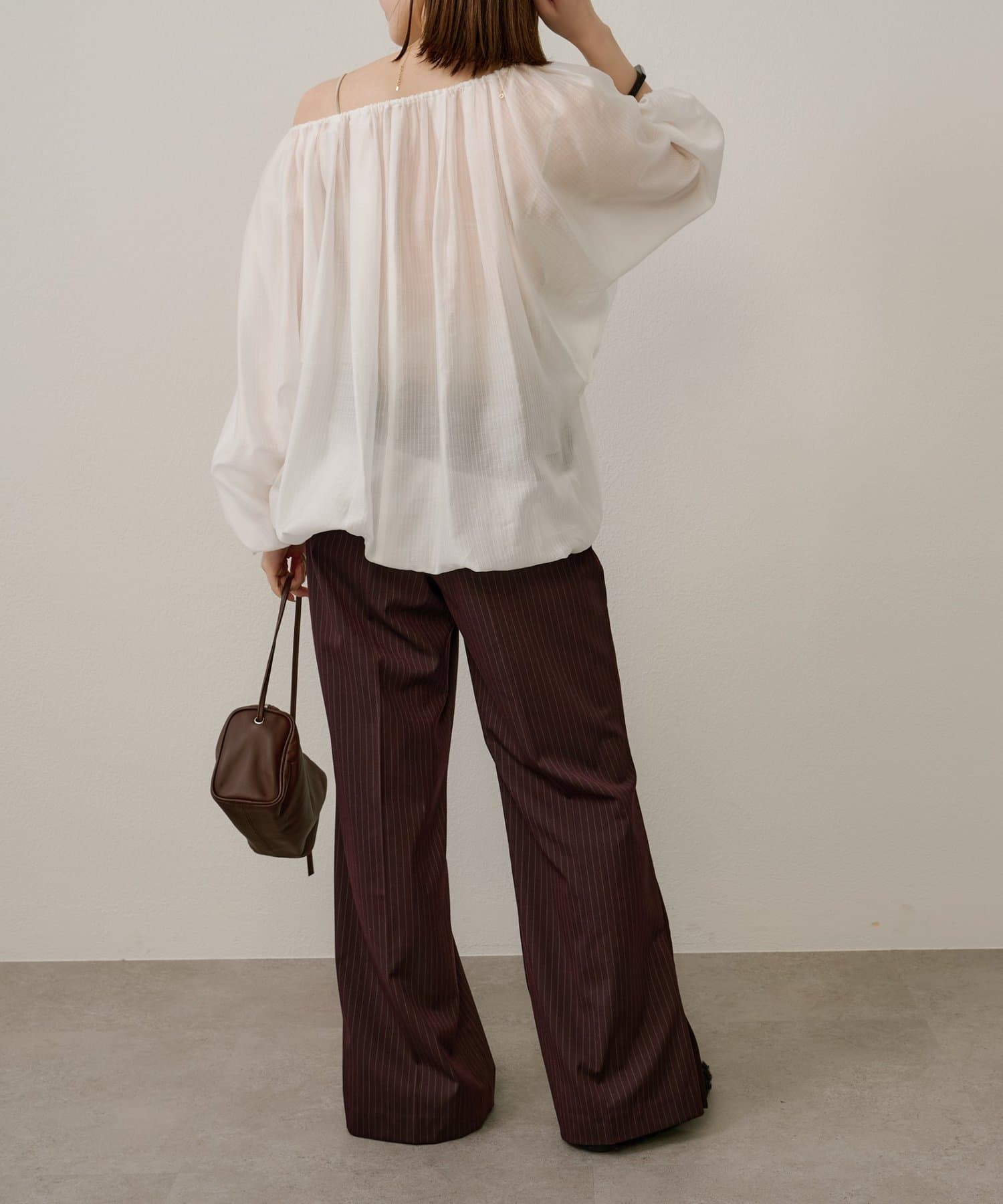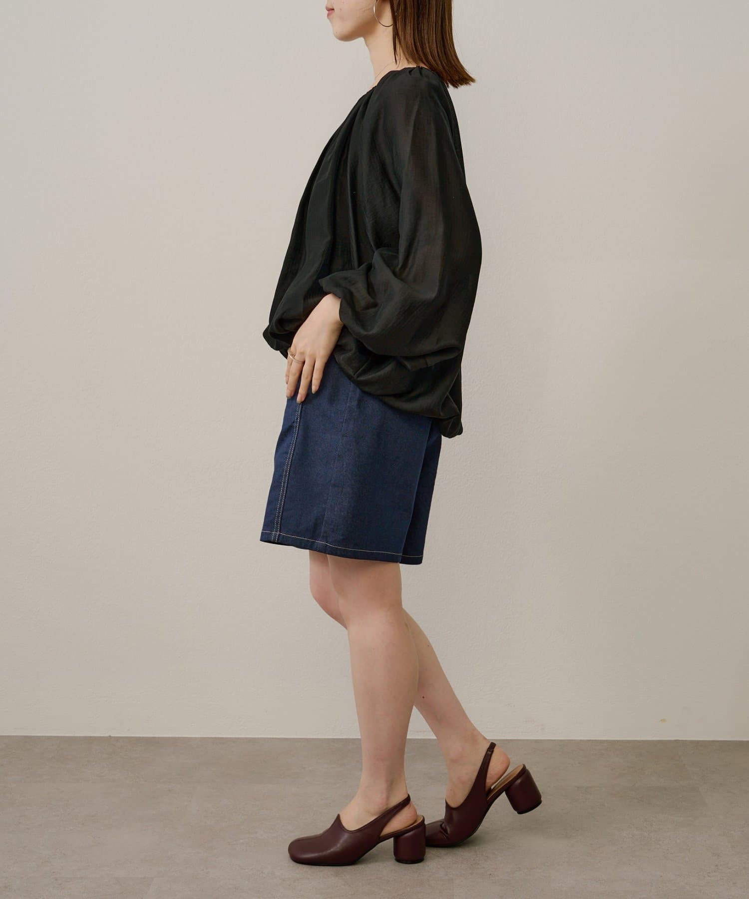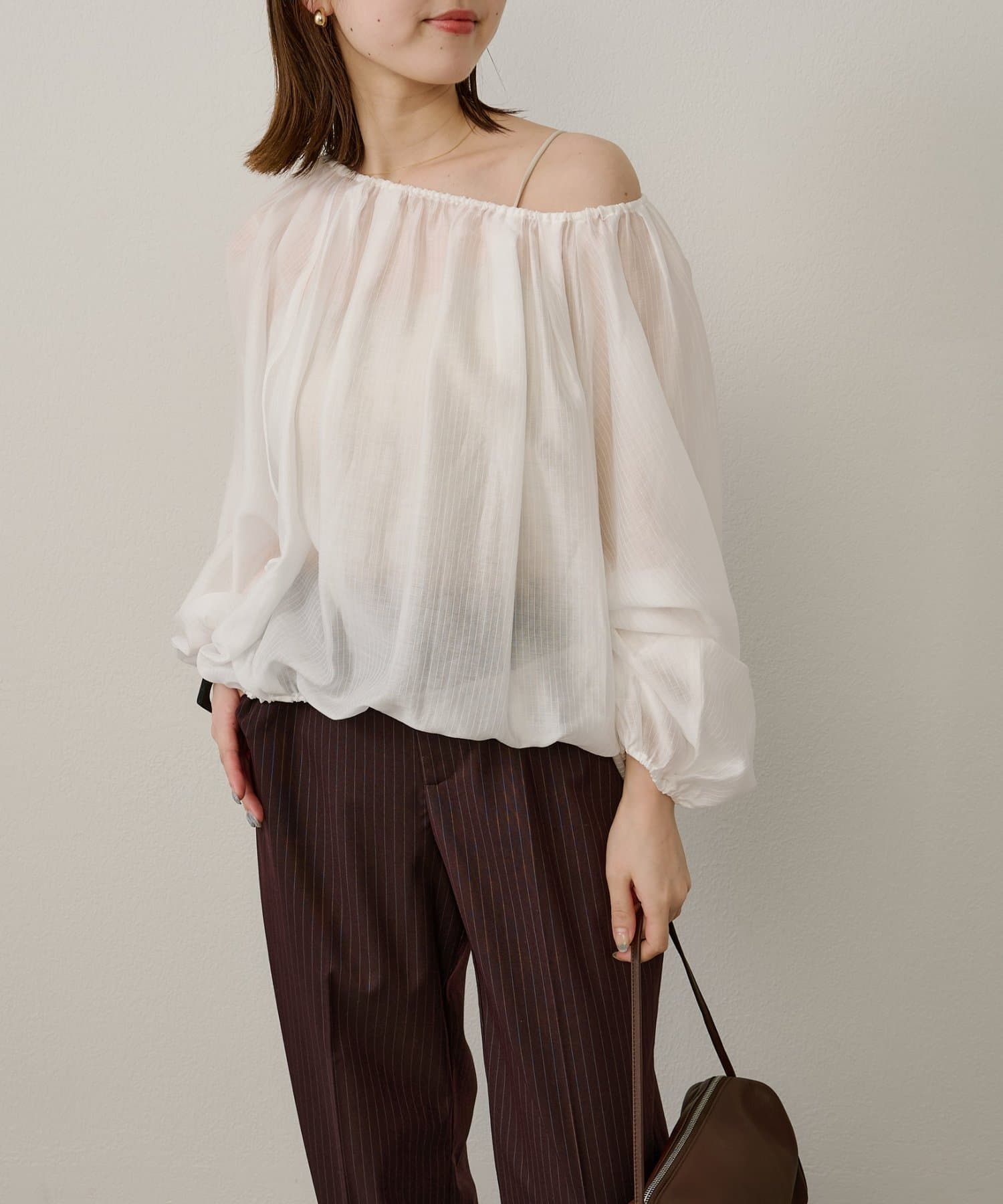 女性らしい柔らかな雰囲気をまとったギャザーブラウス