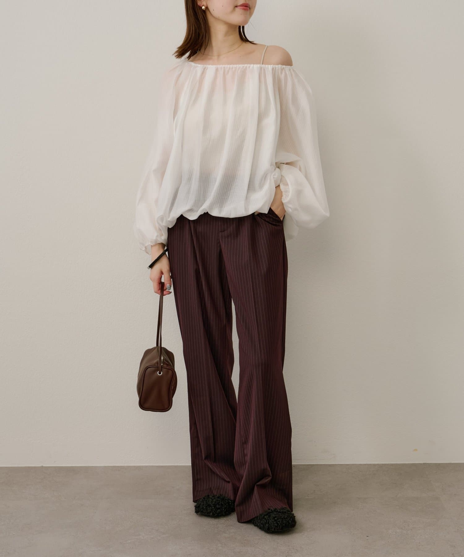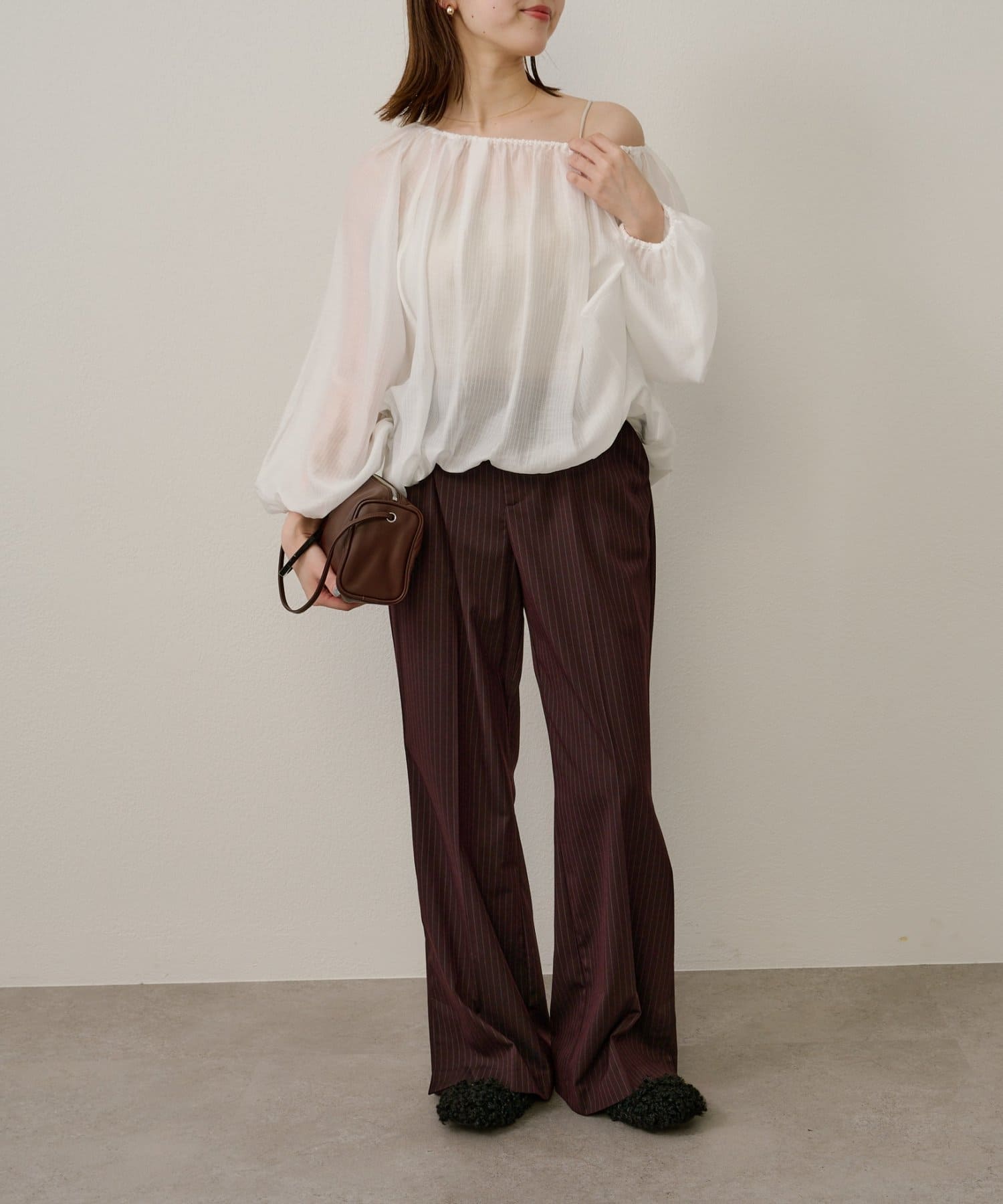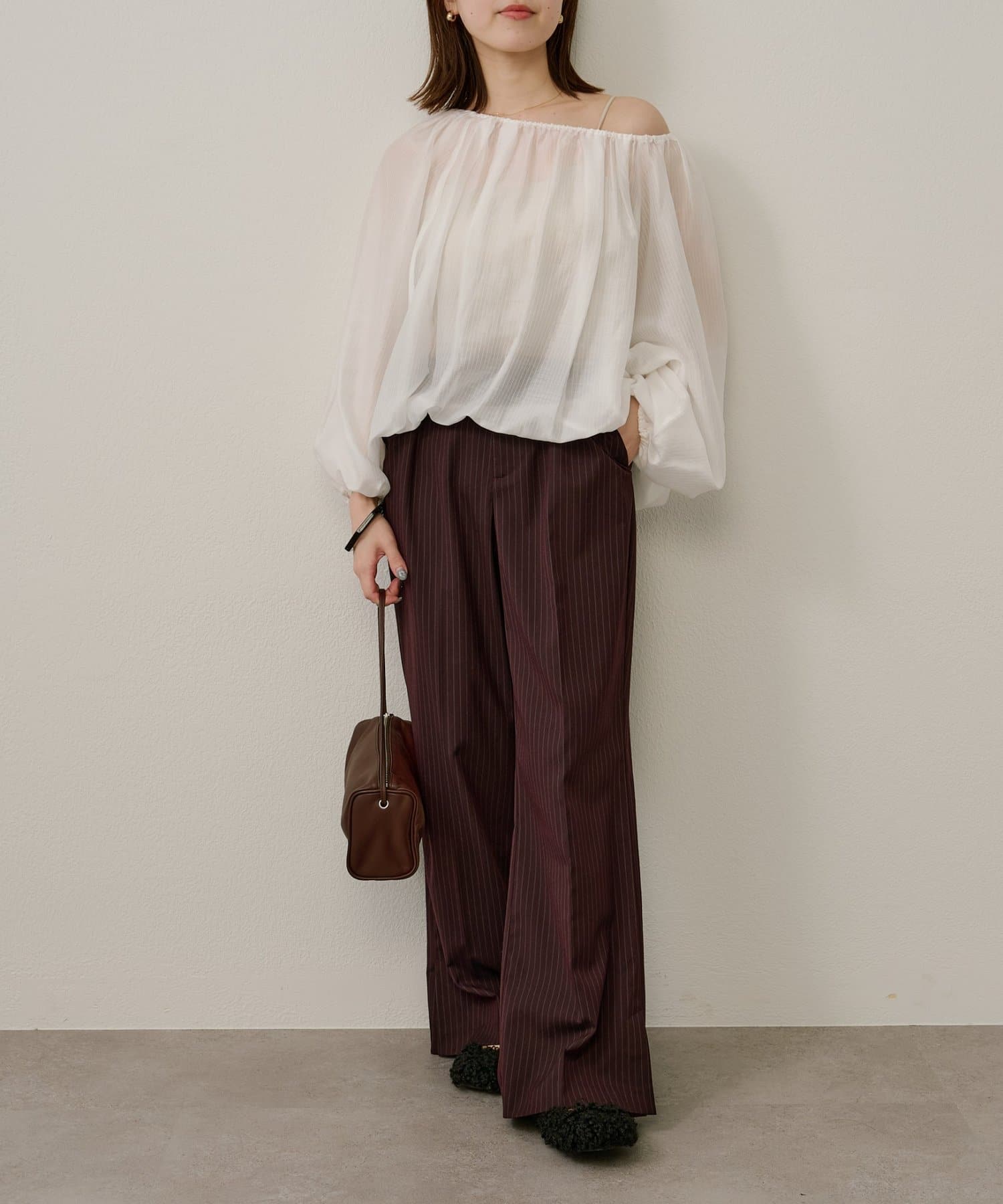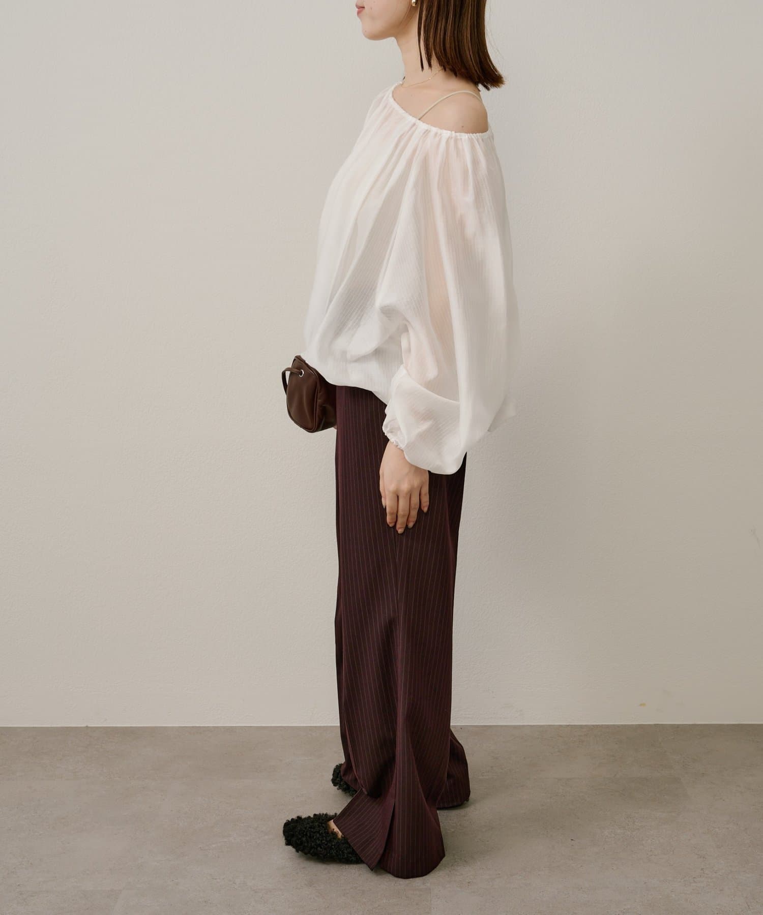 女性らしい柔らかな雰囲気をまとったギャザーブラウス