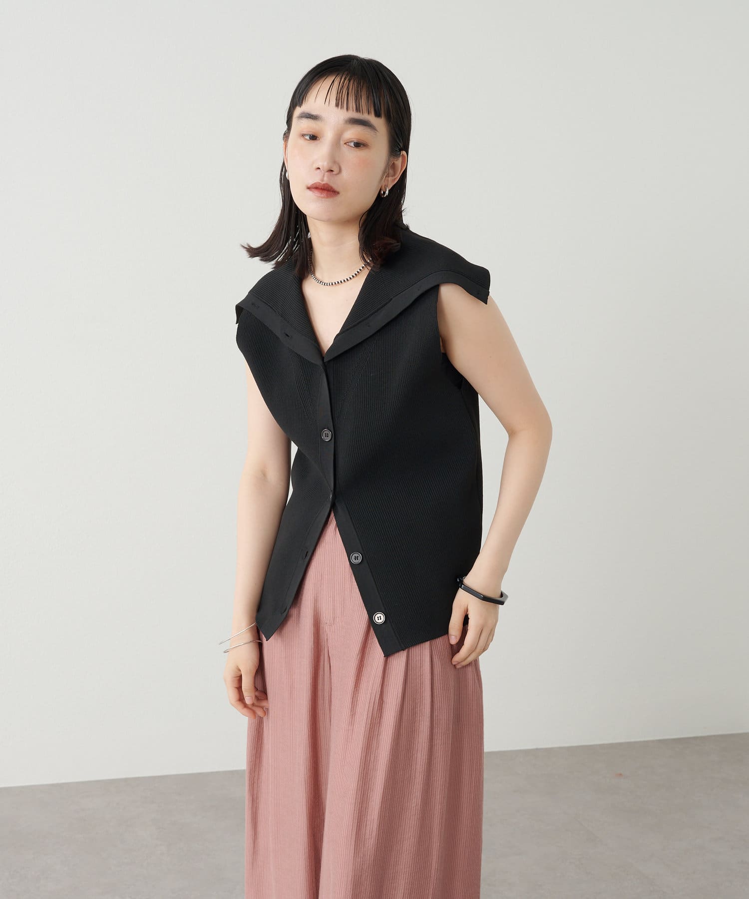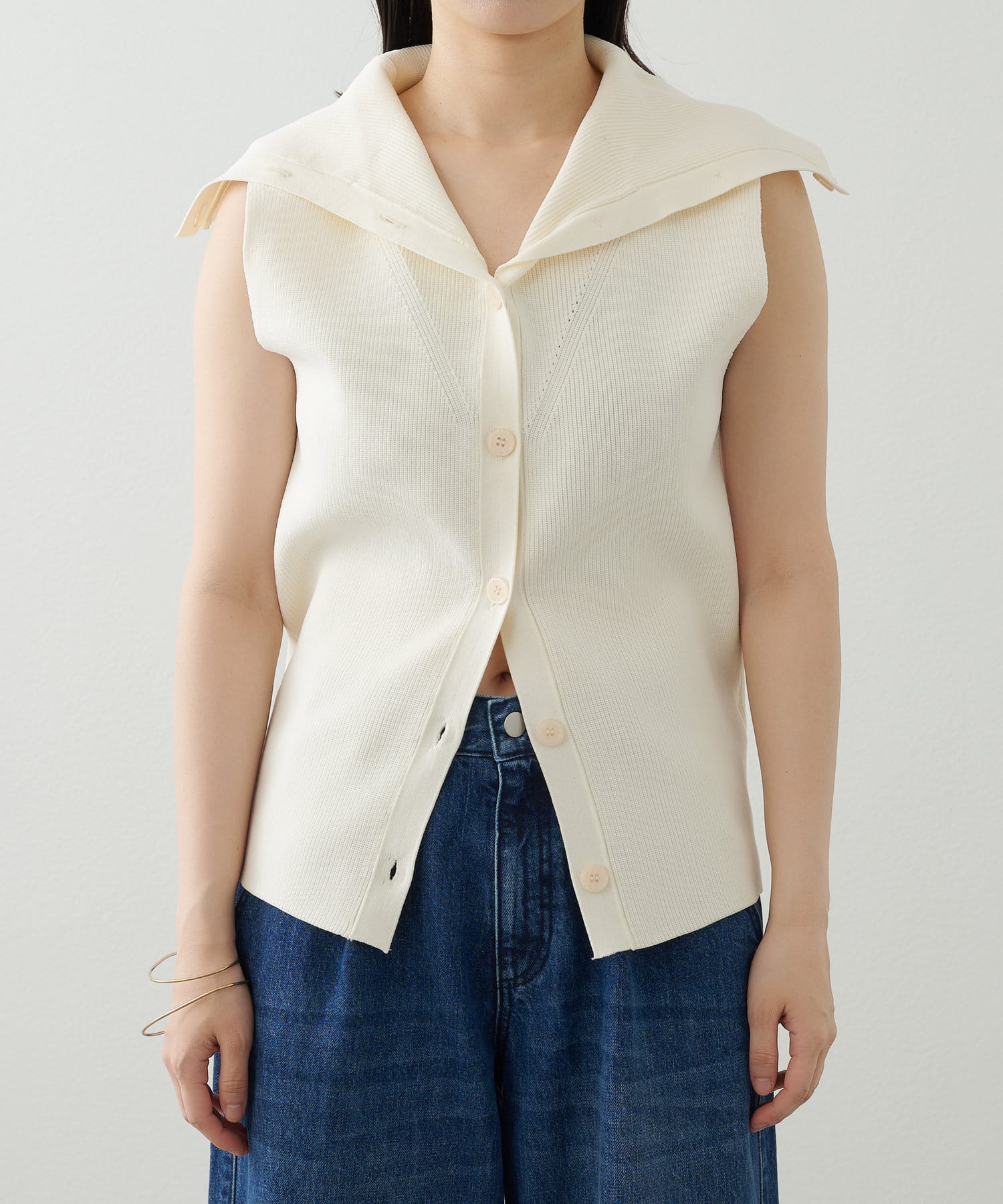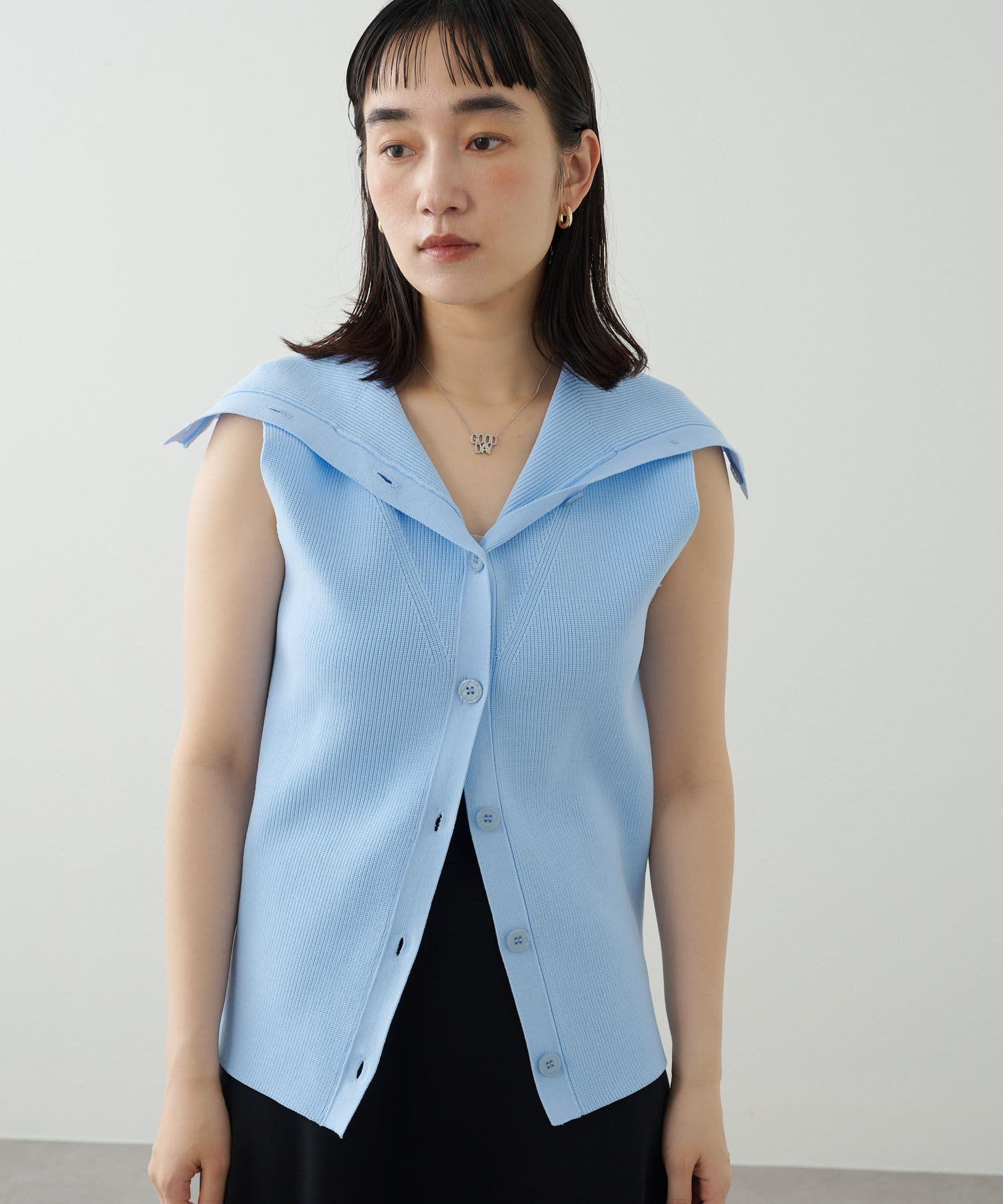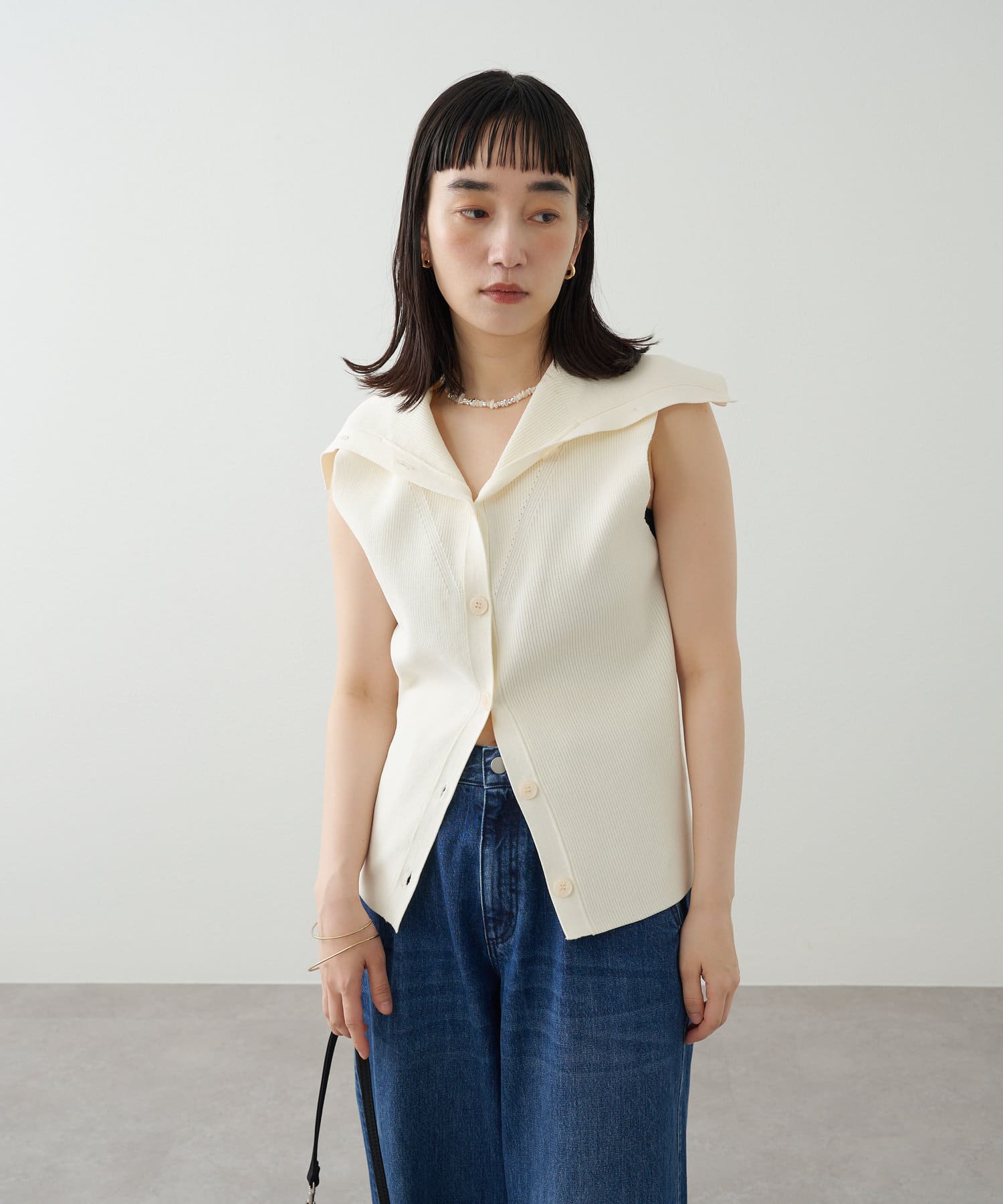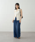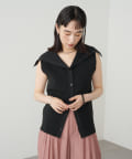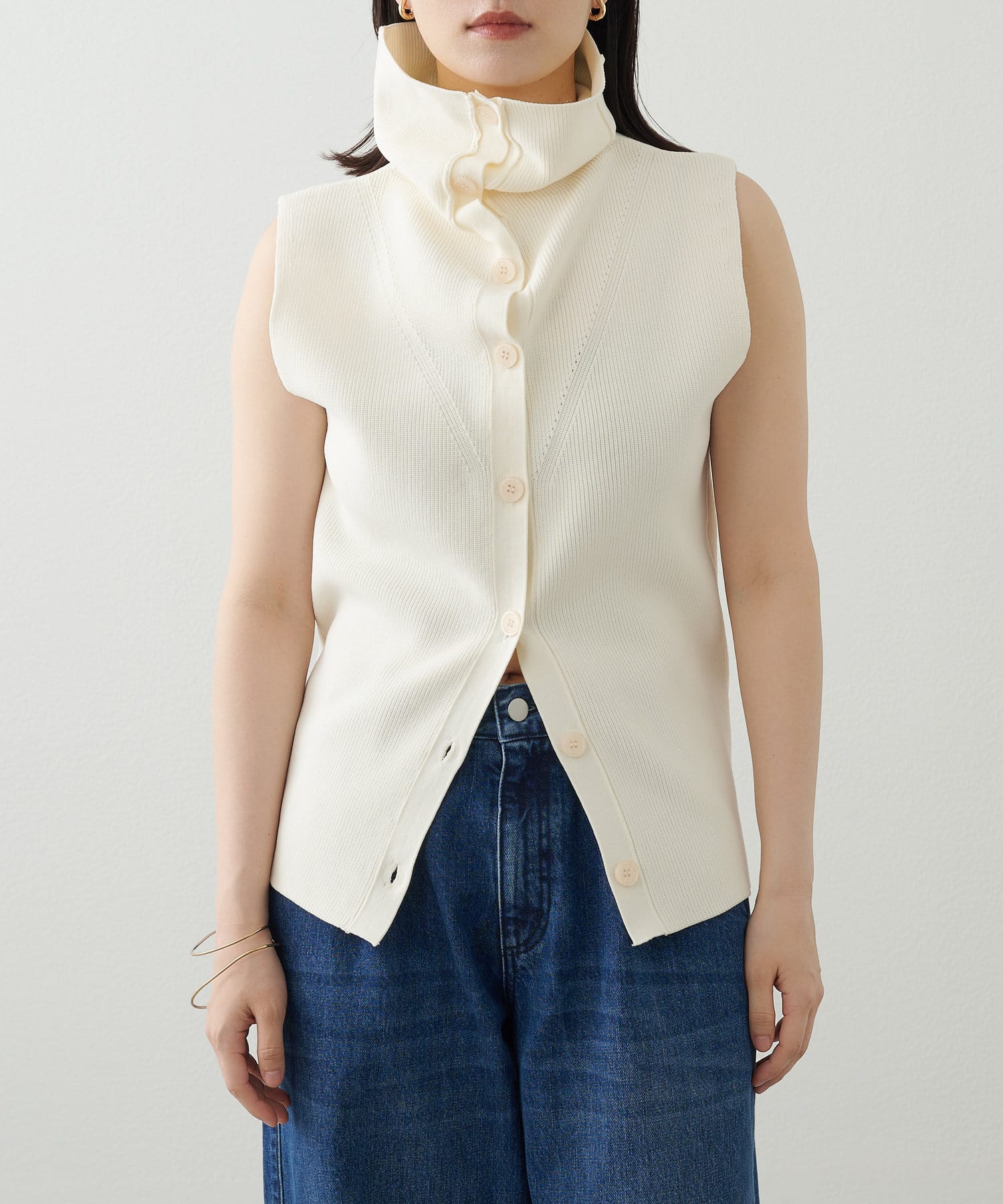 ・襟元部分のデザインがスタイリングのアクセントになるニットベスト。