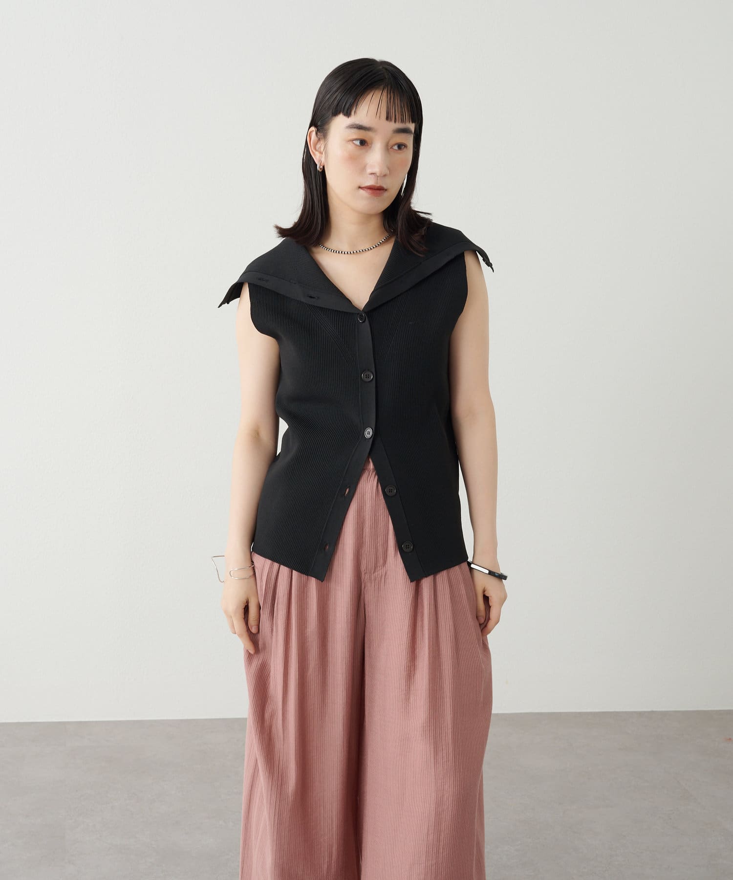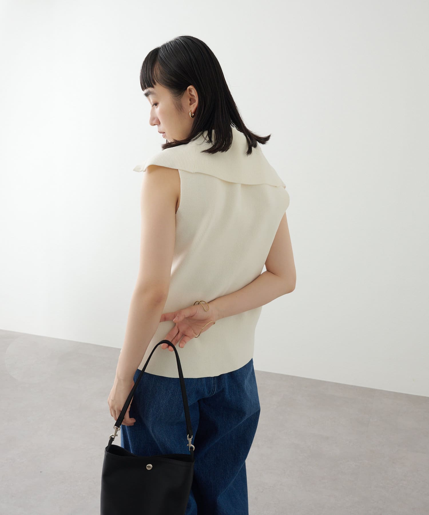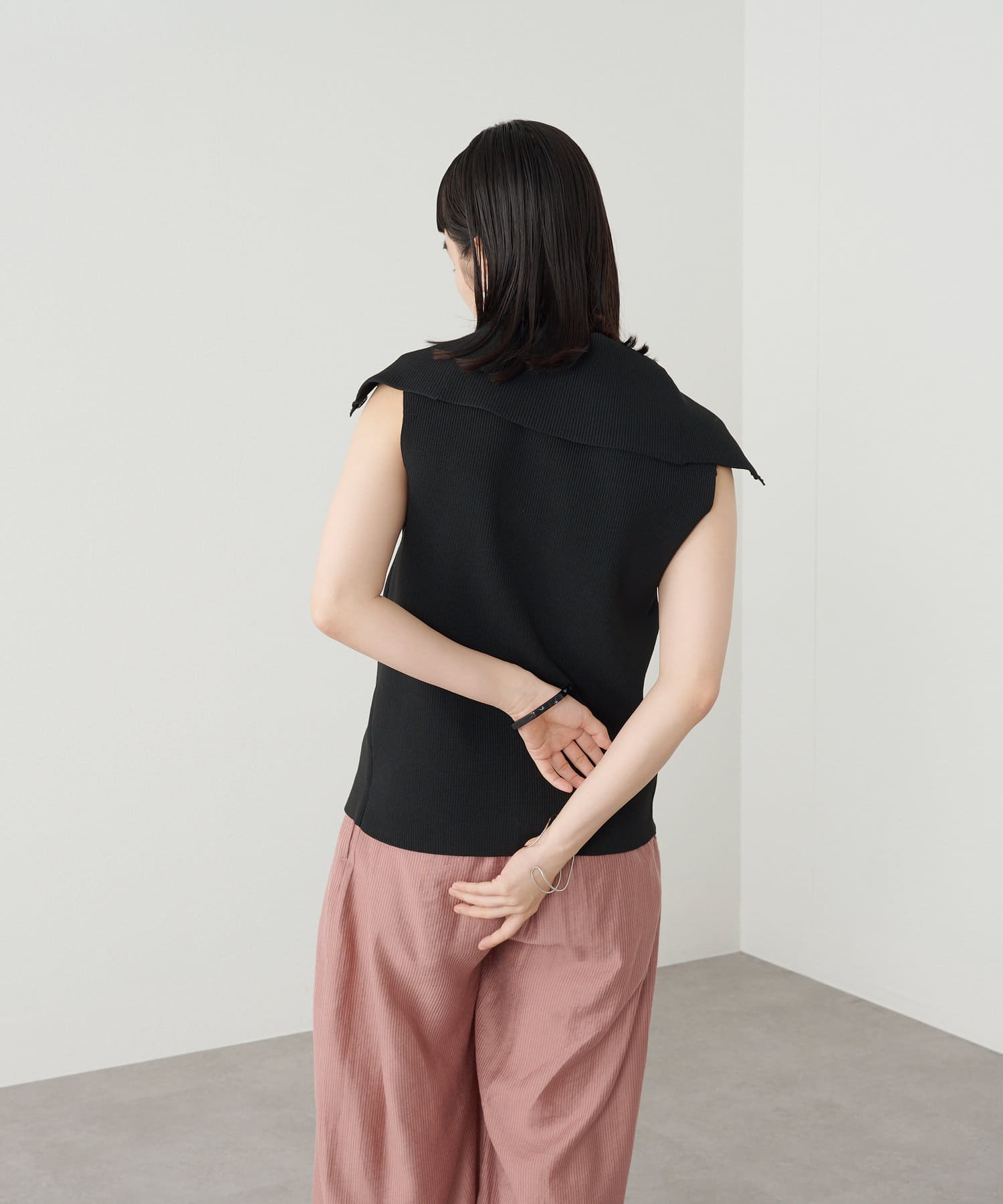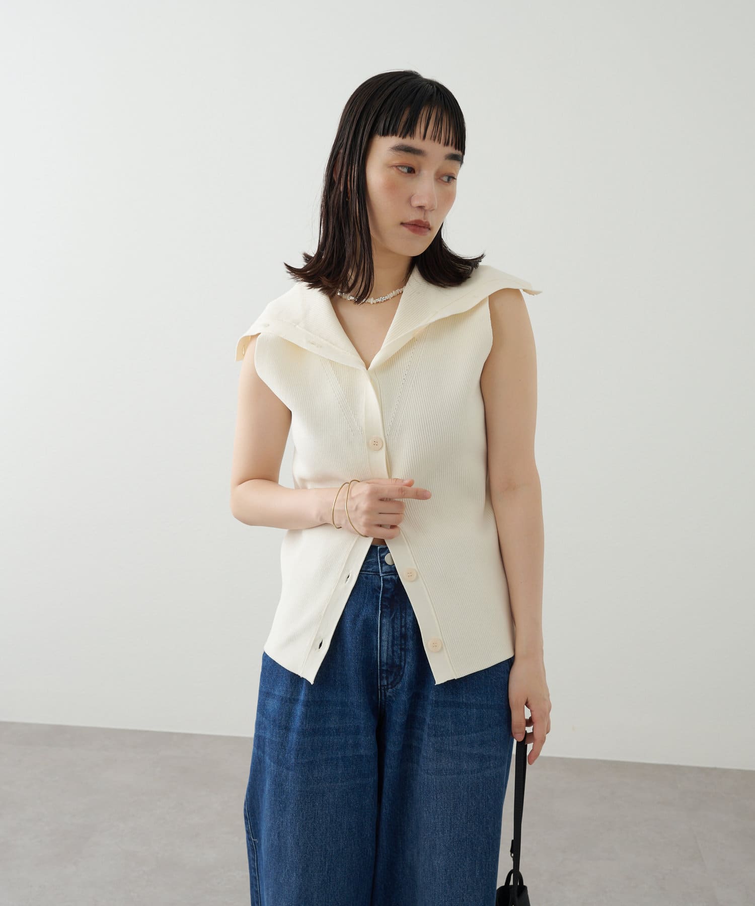 ・襟元部分のデザインがスタイリングのアクセントになるニットベスト。