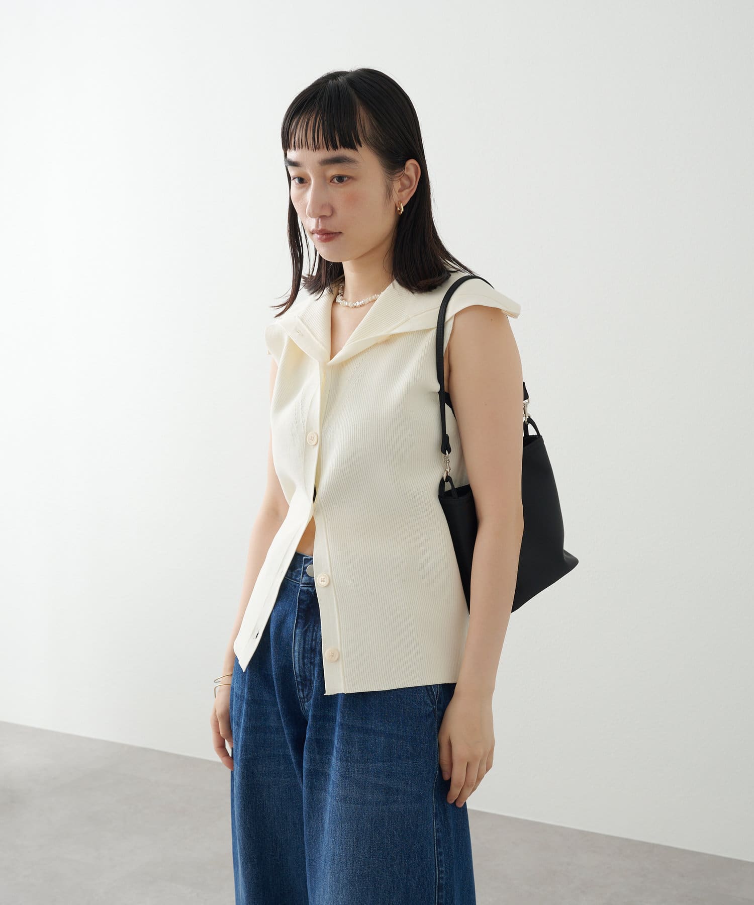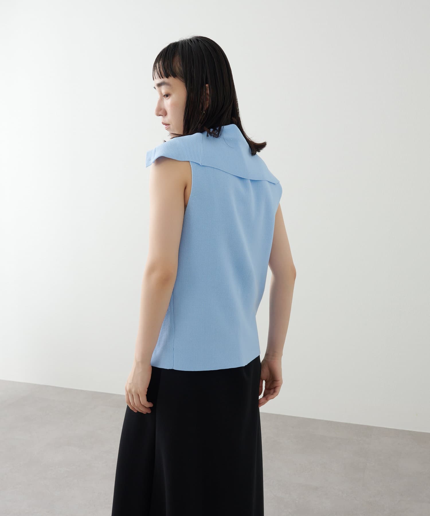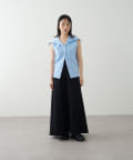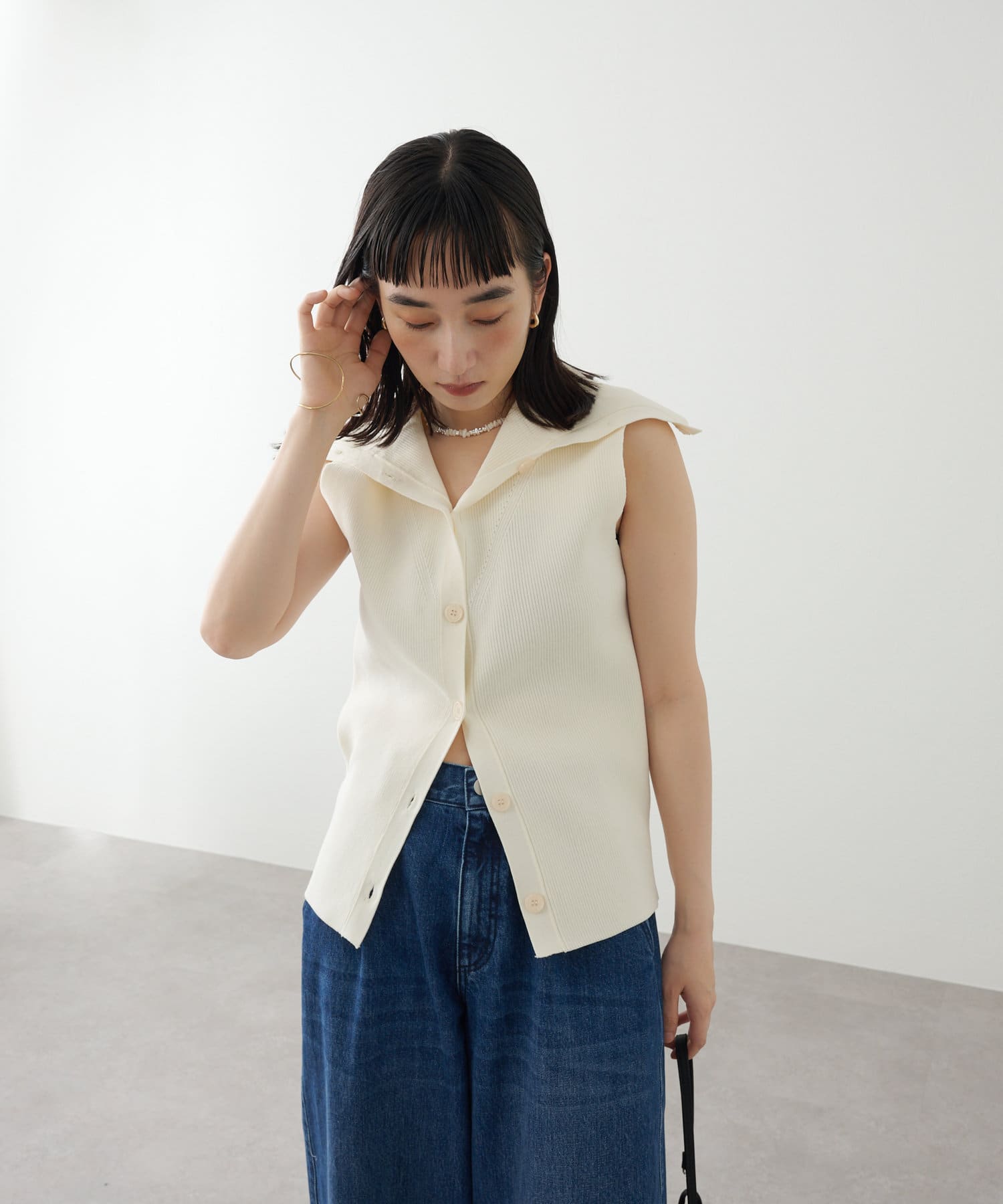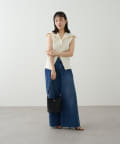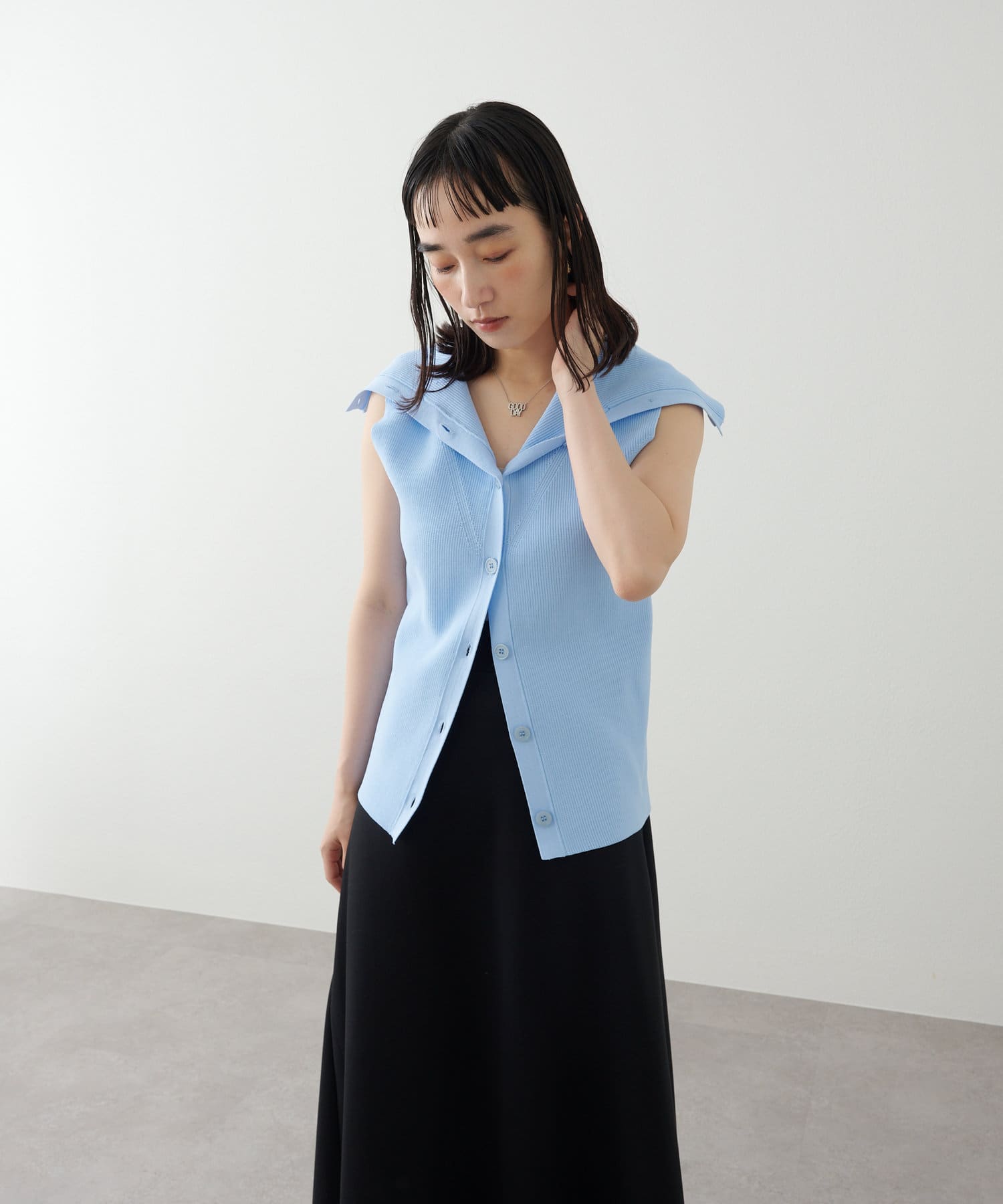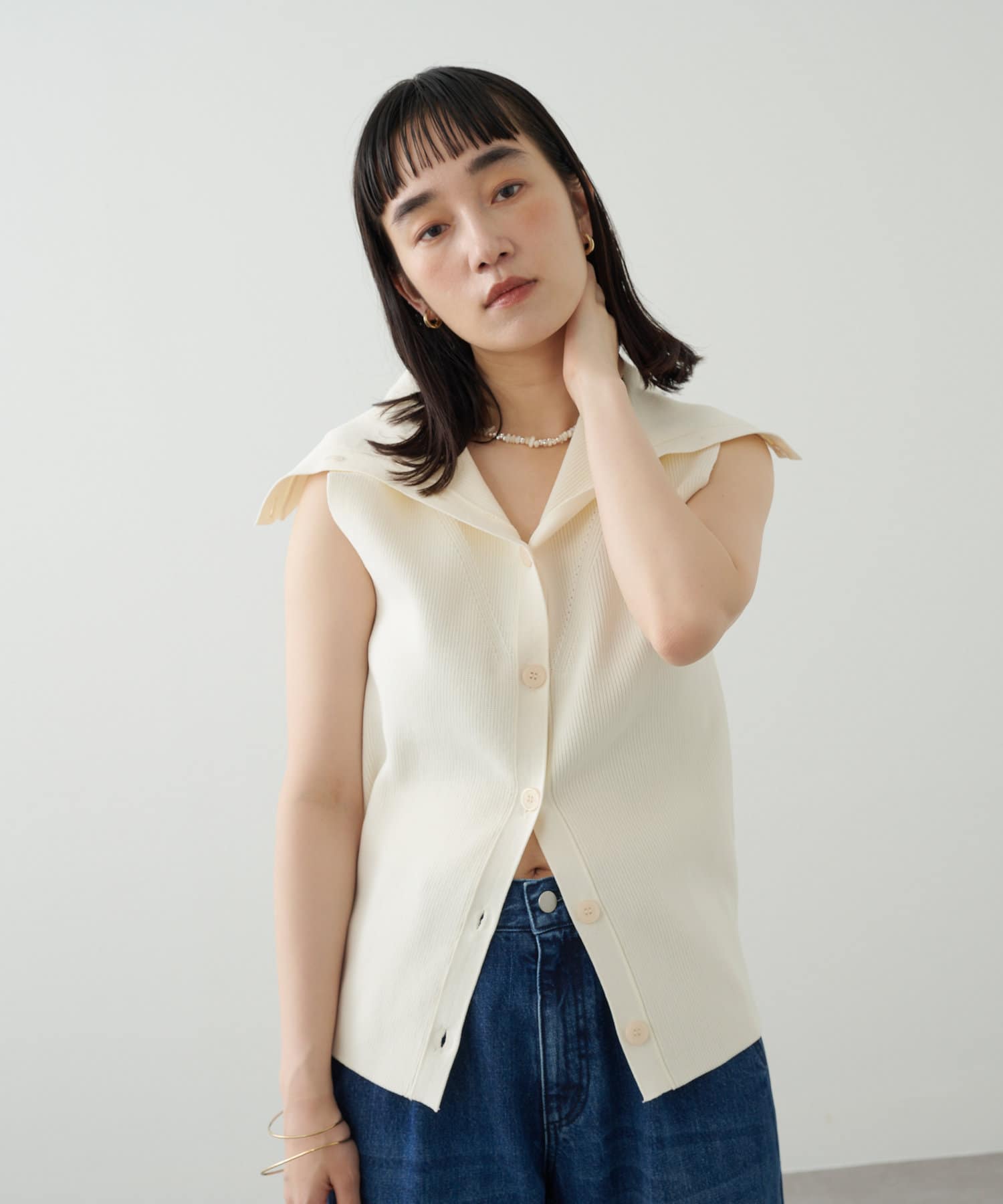 ・襟元部分のデザインがスタイリングのアクセントになるニットベスト。