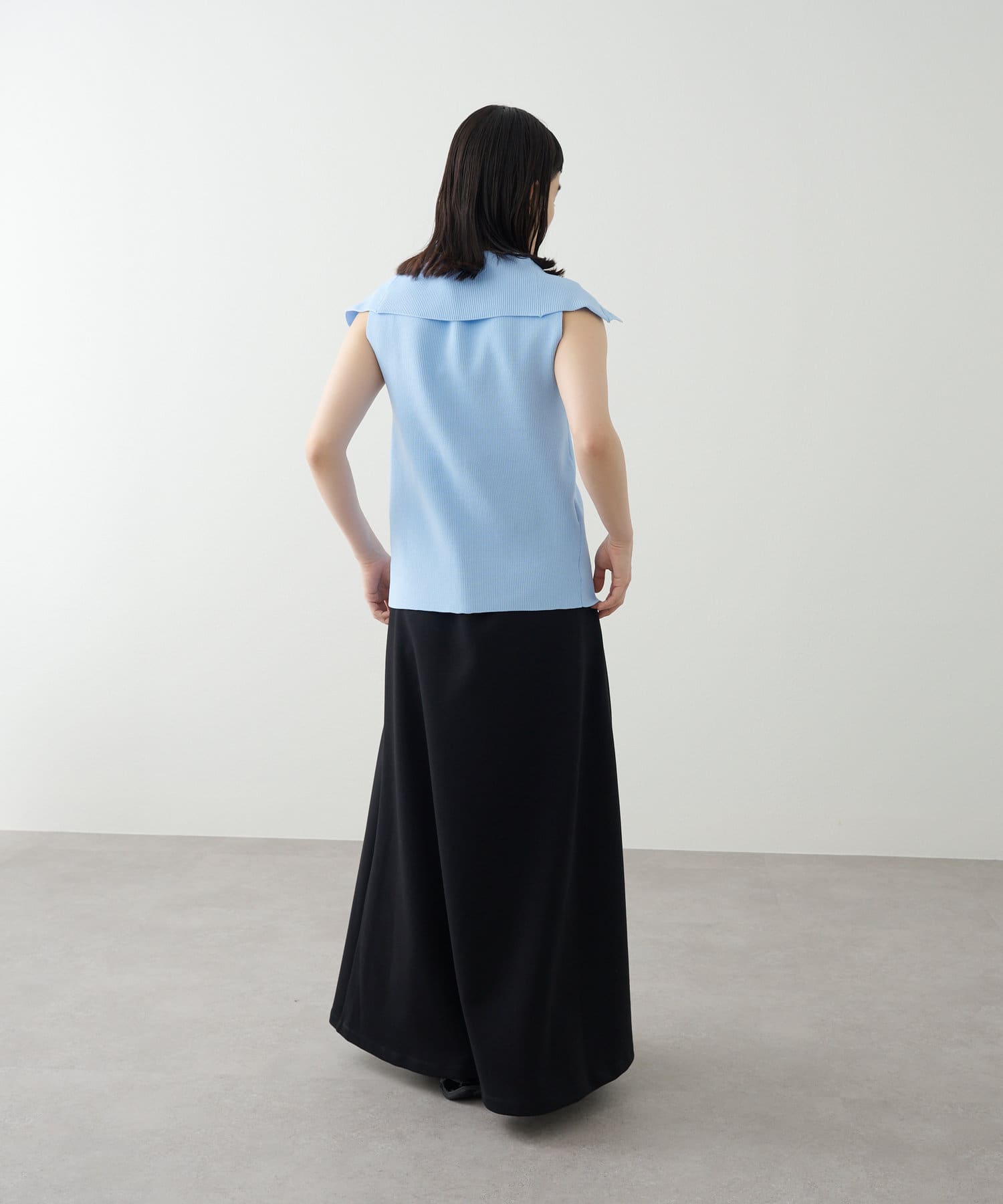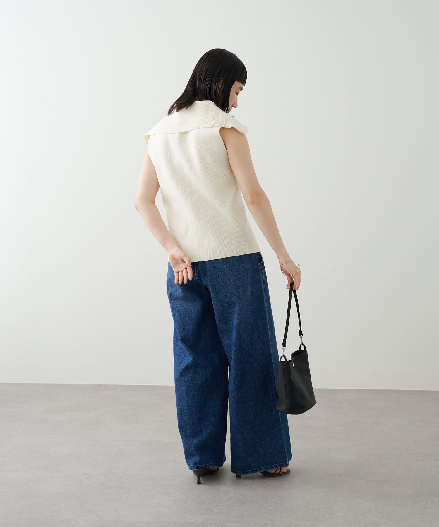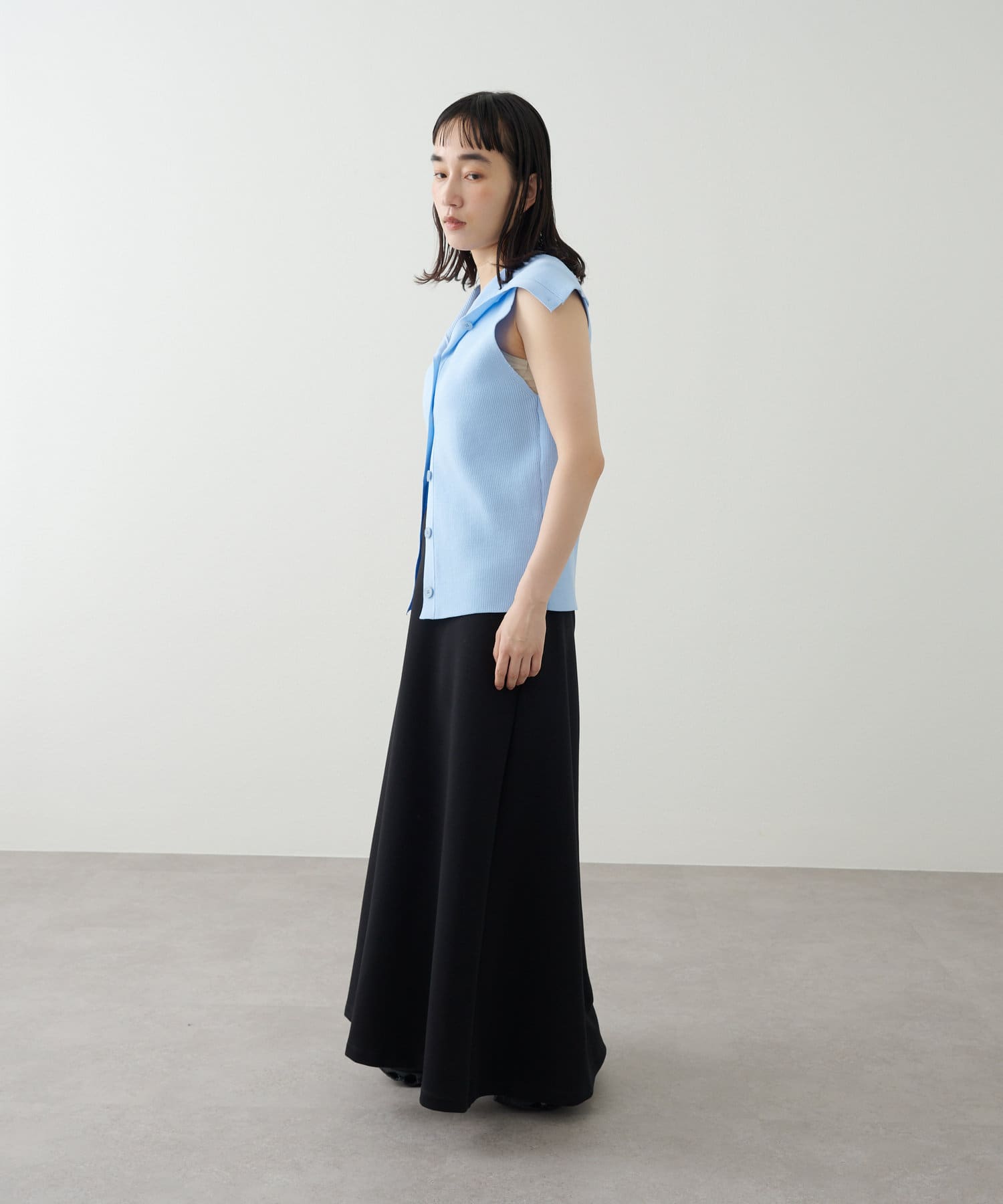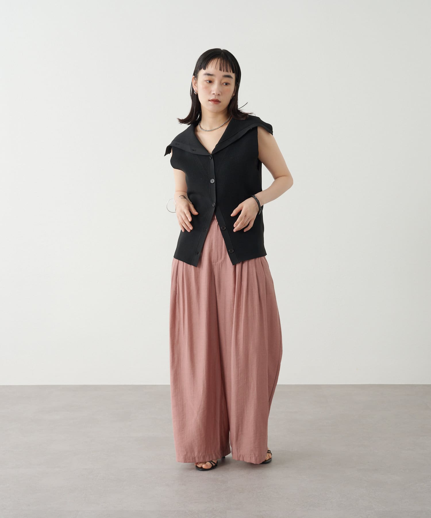 ・襟元部分のデザインがスタイリングのアクセントになるニットベスト。