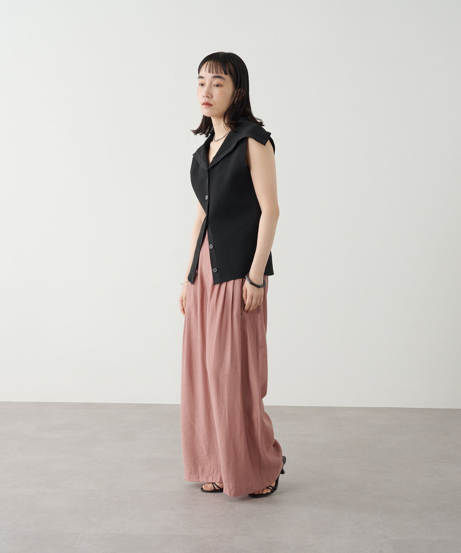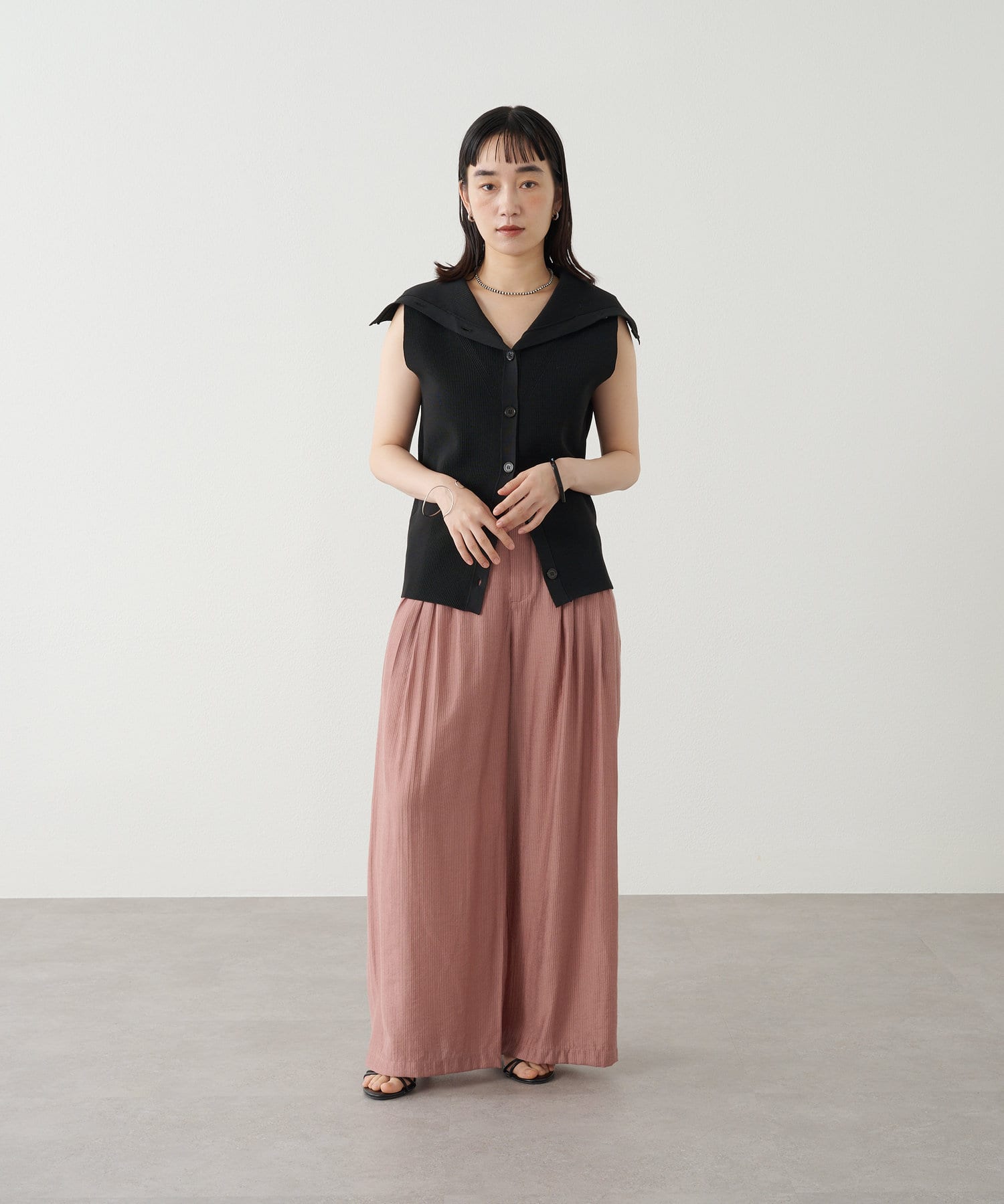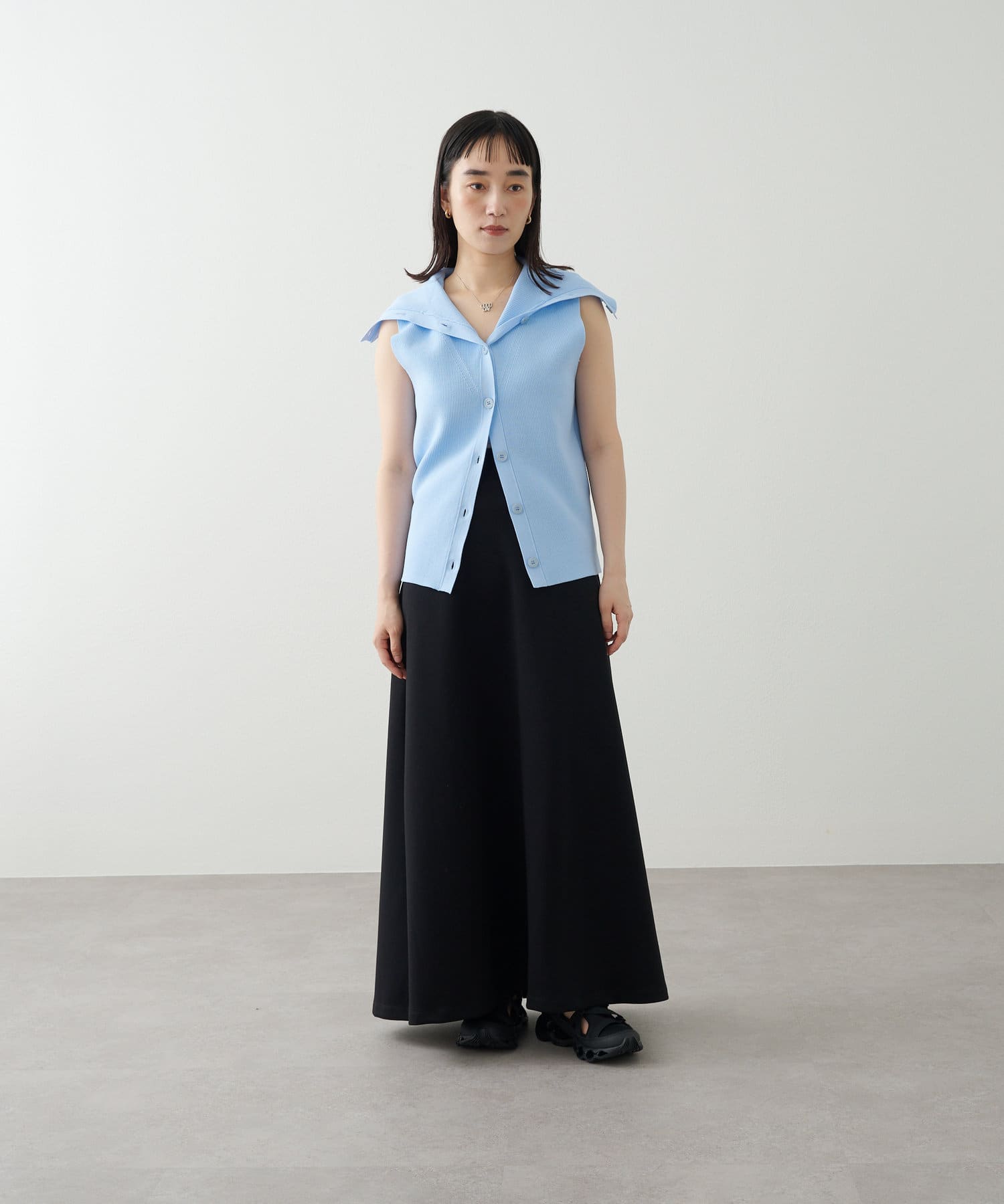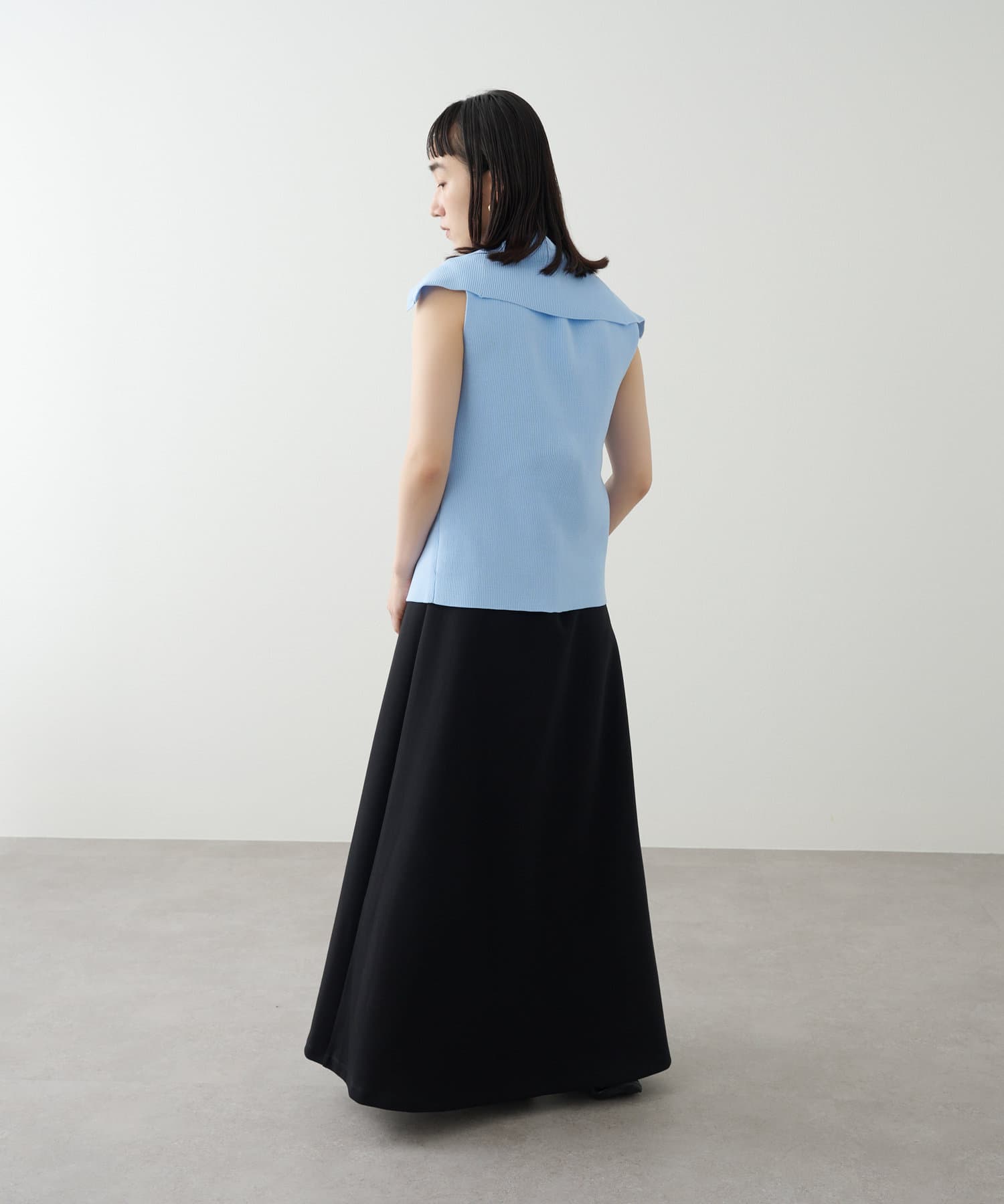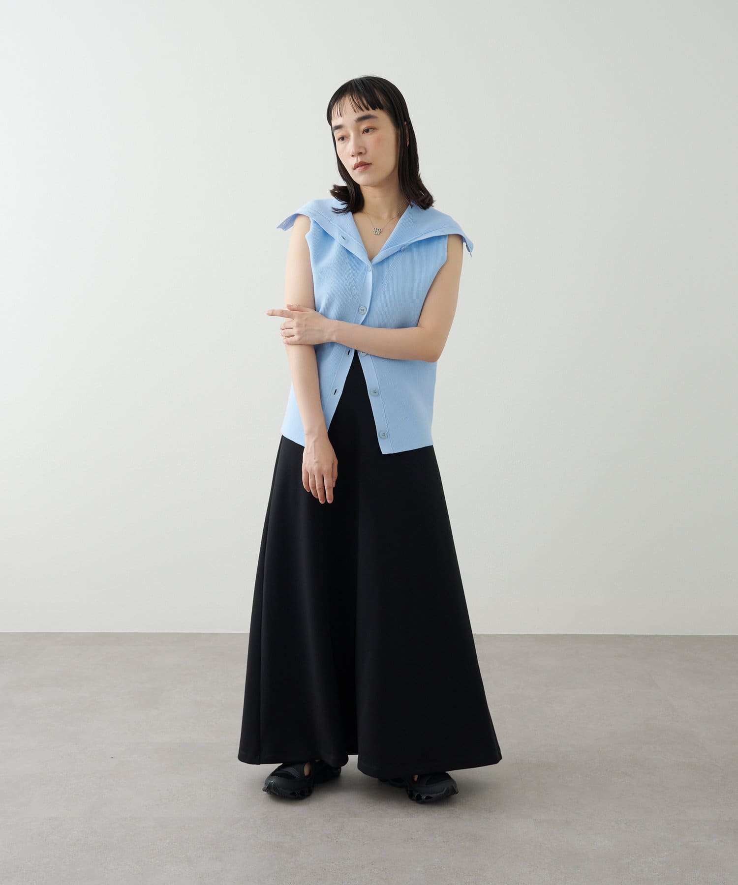 ・襟元部分のデザインがスタイリングのアクセントになるニットベスト。