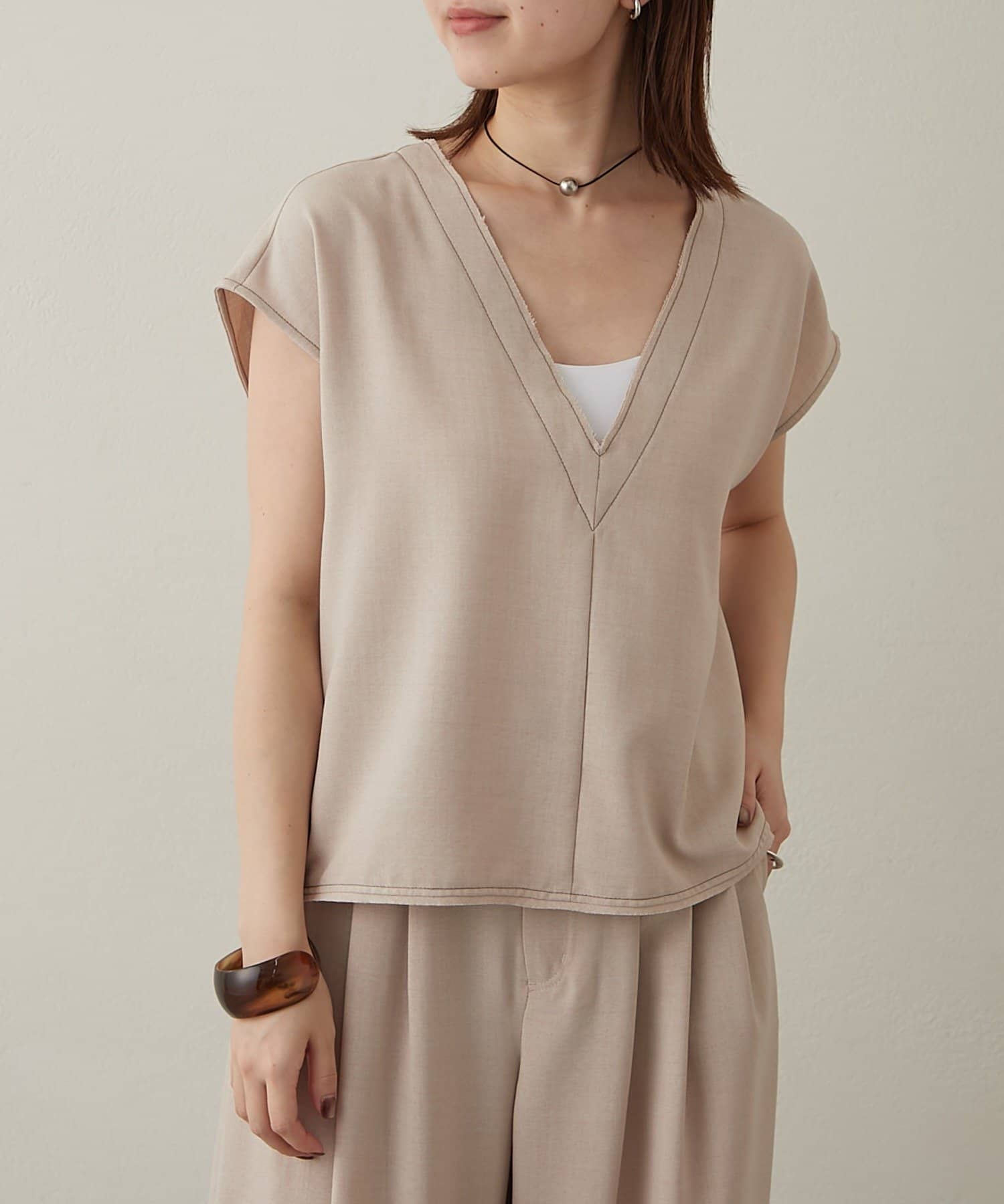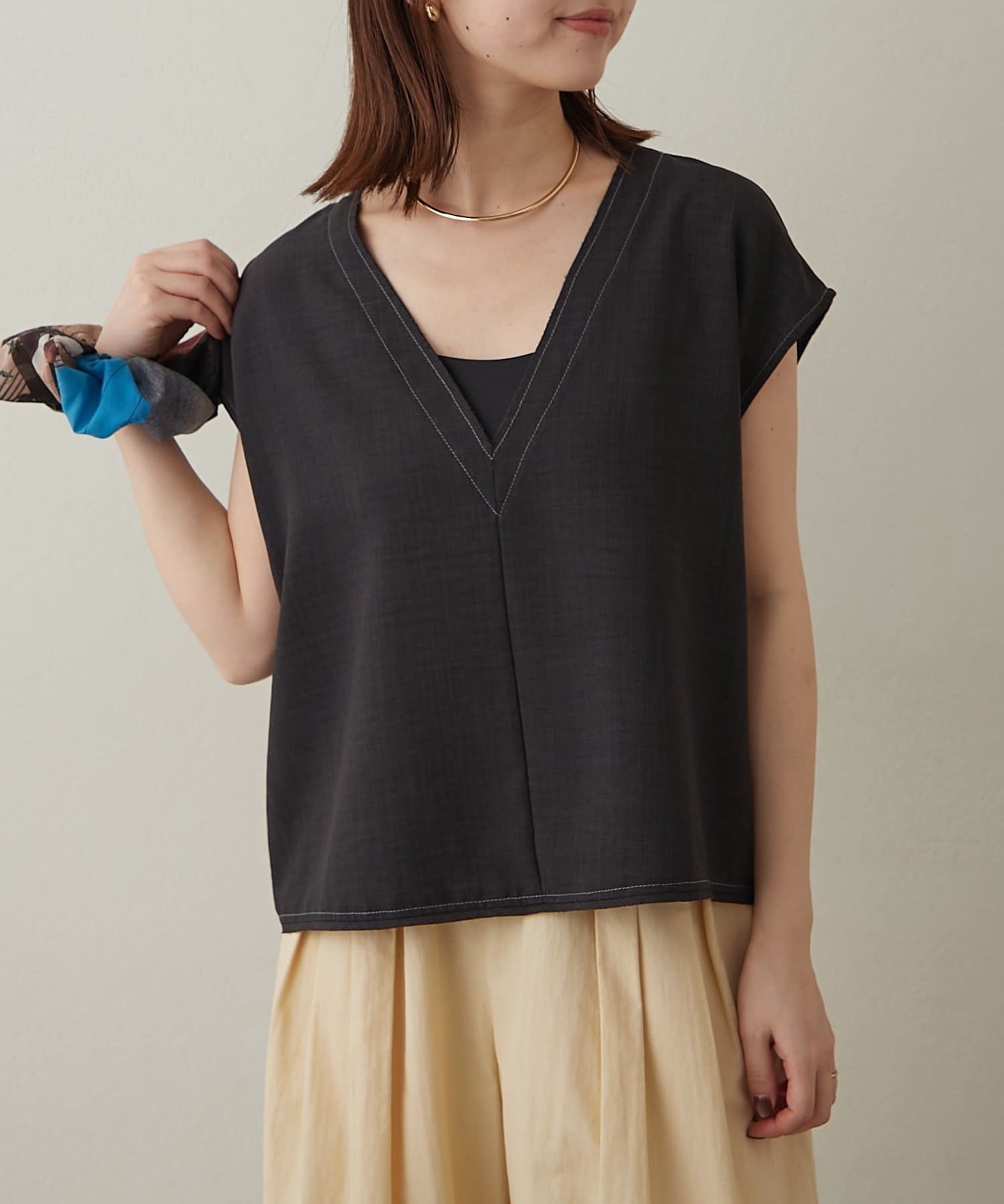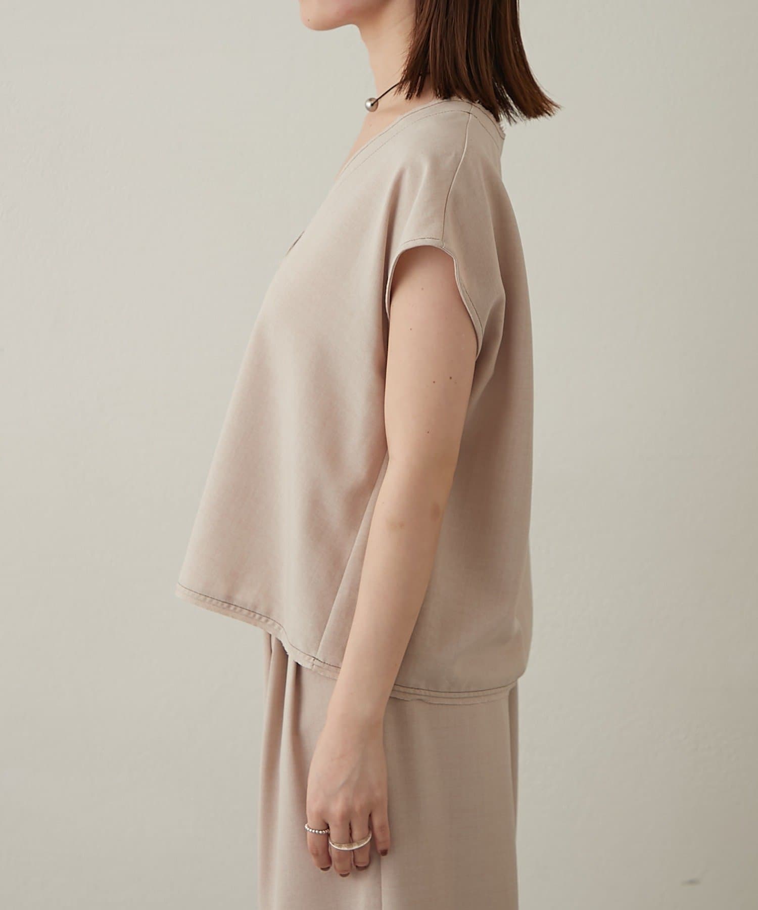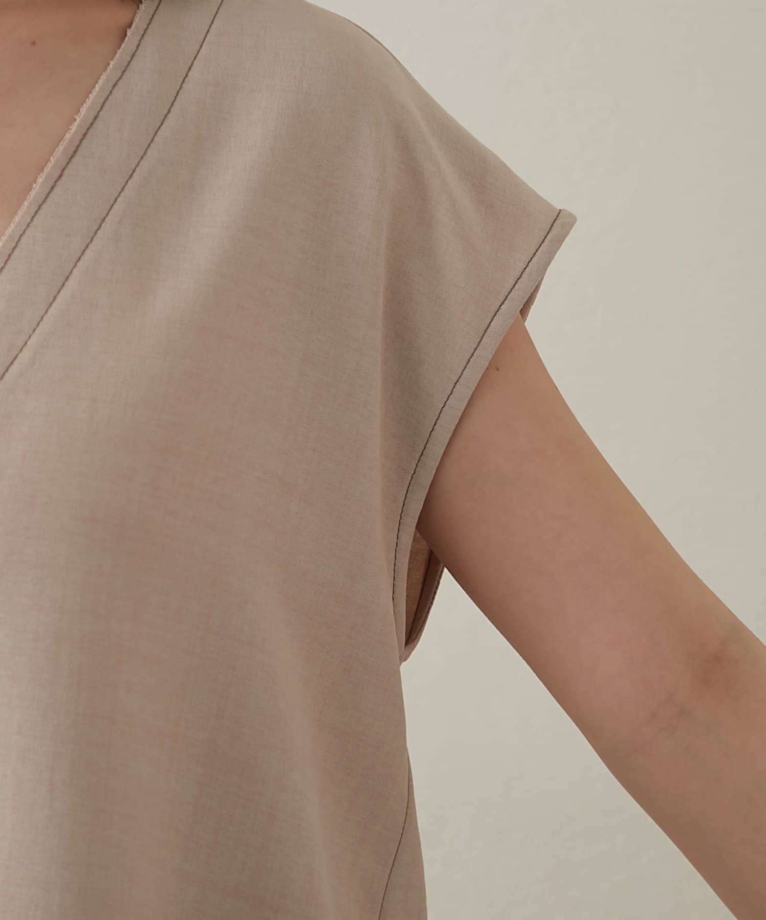 ・首回りのステッチがアクセントのVネックが印象的なノースリブラウス。