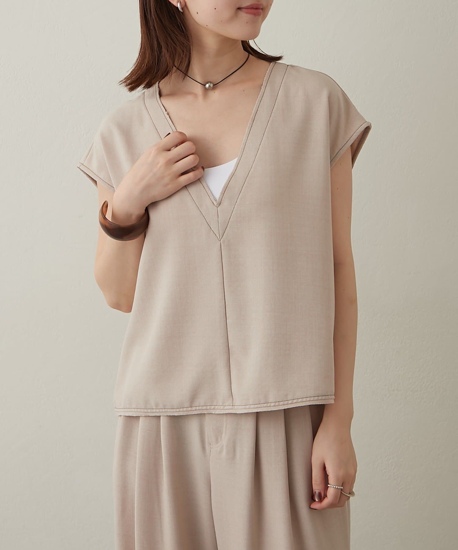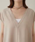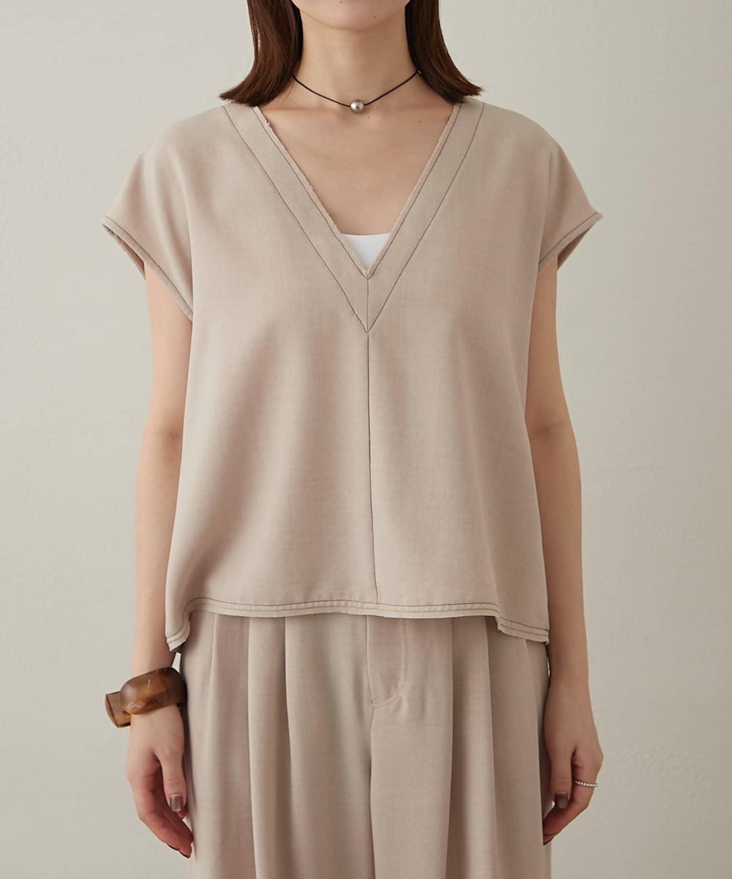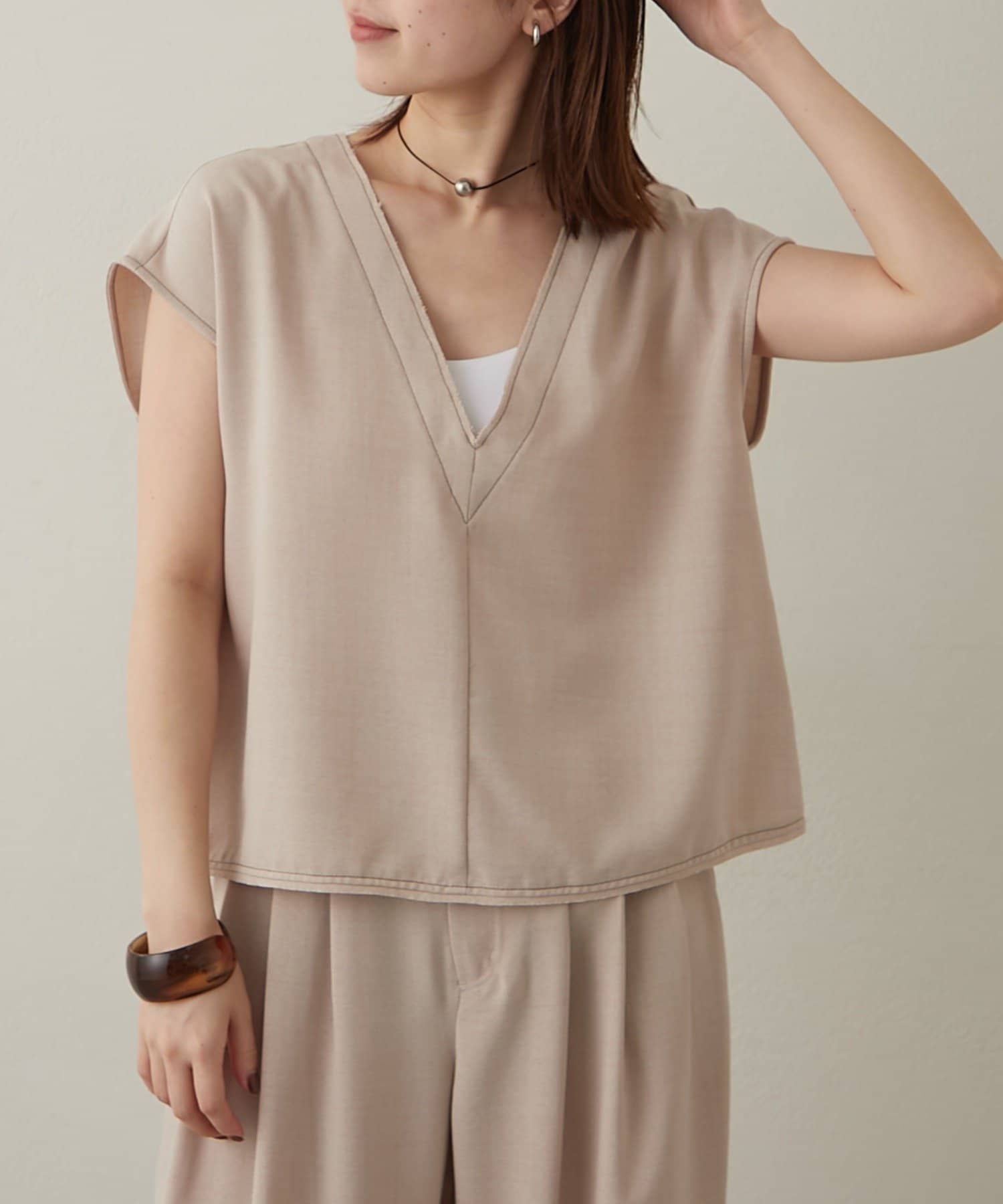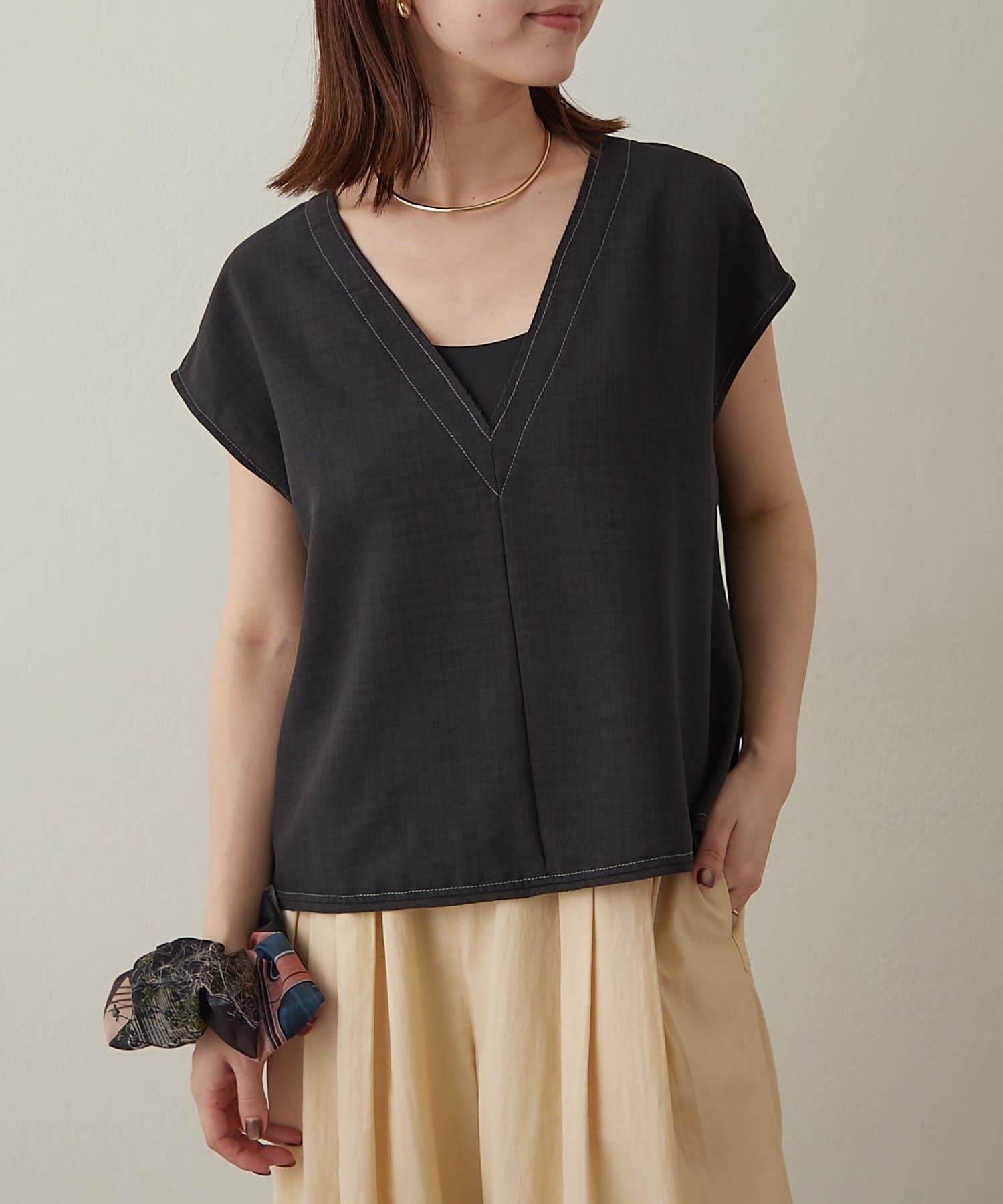 ・首回りのステッチがアクセントのVネックが印象的なノースリブラウス。