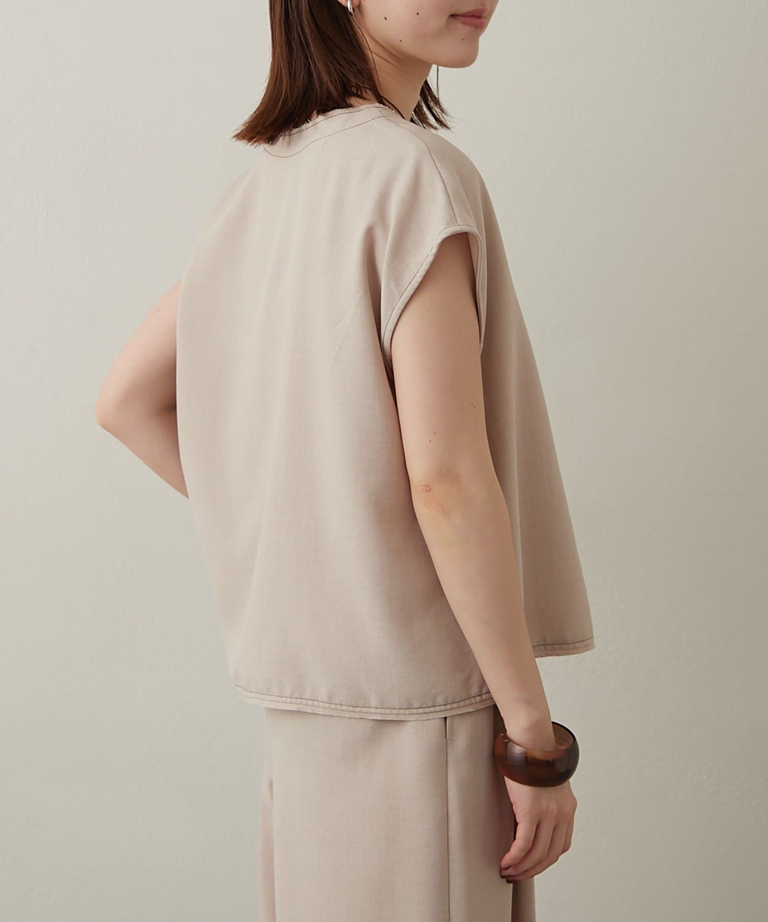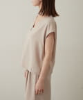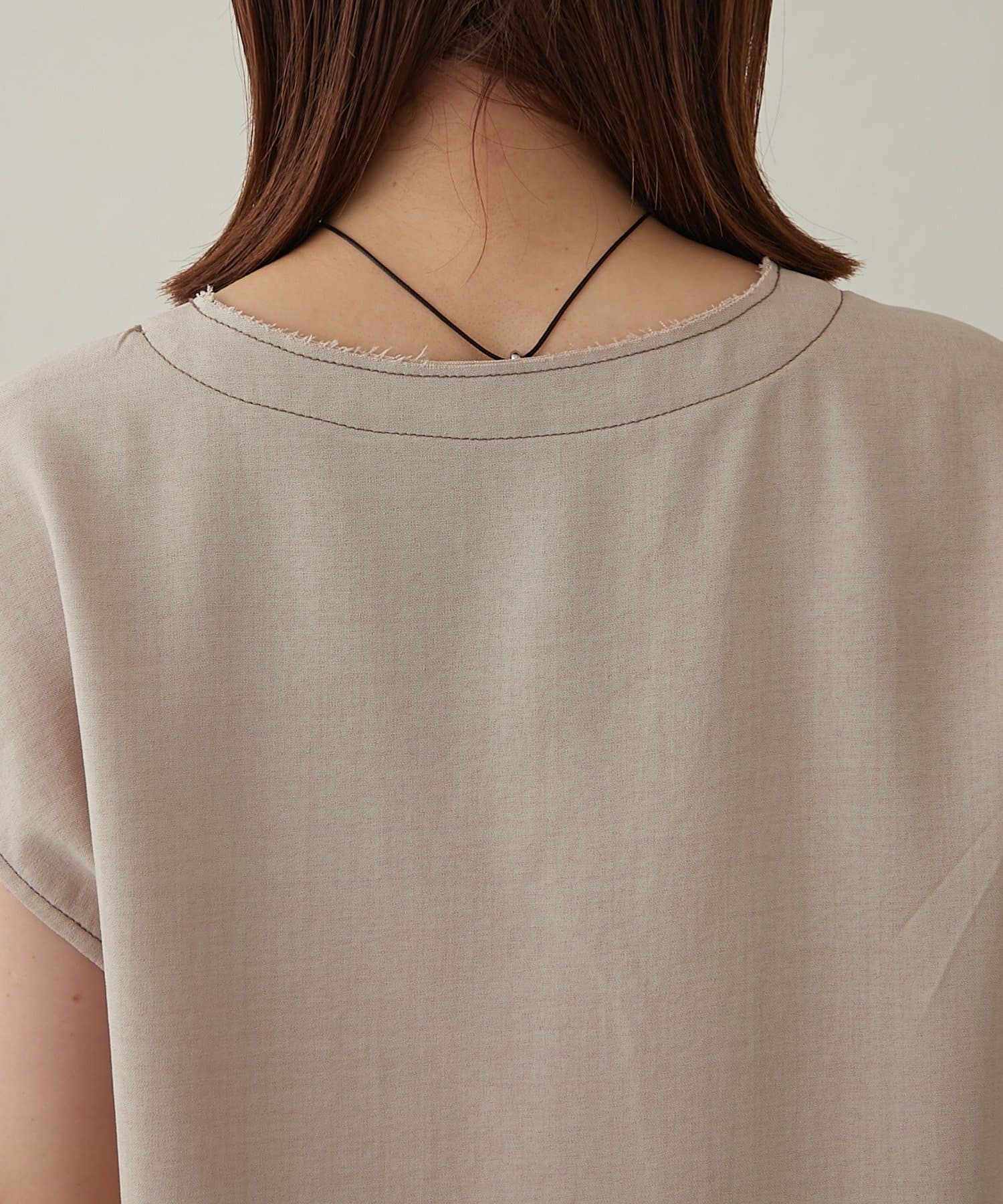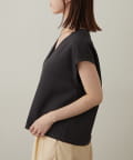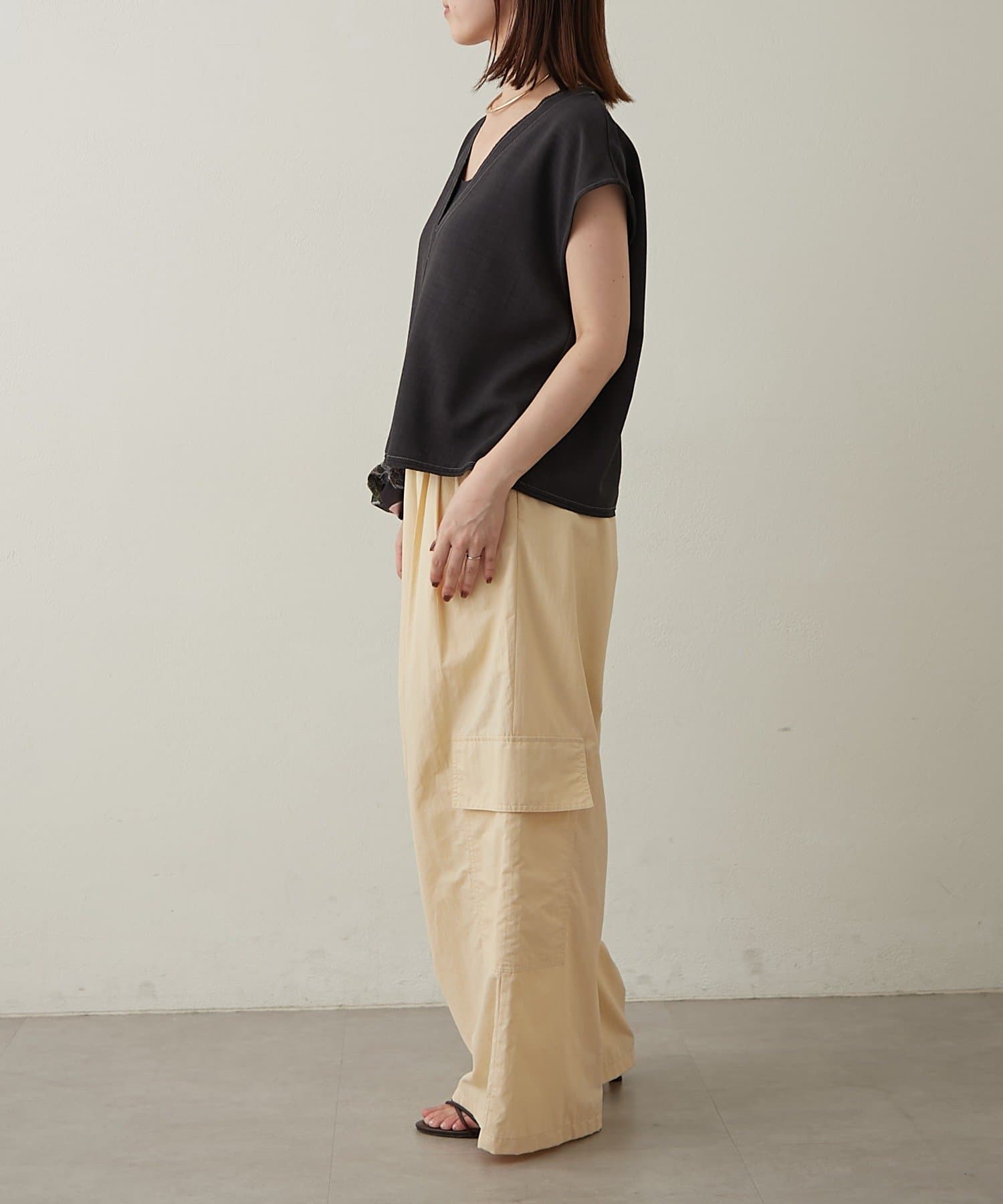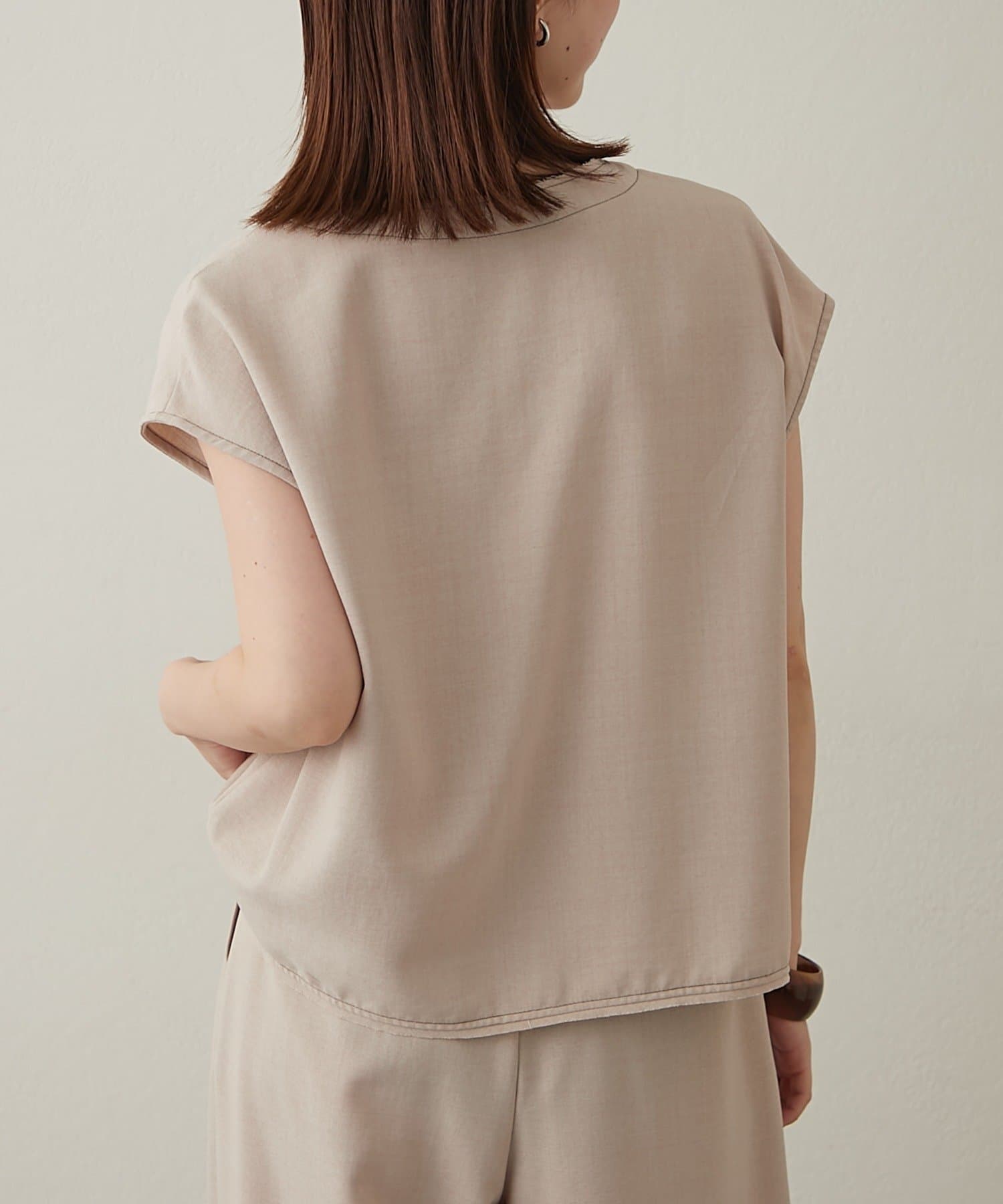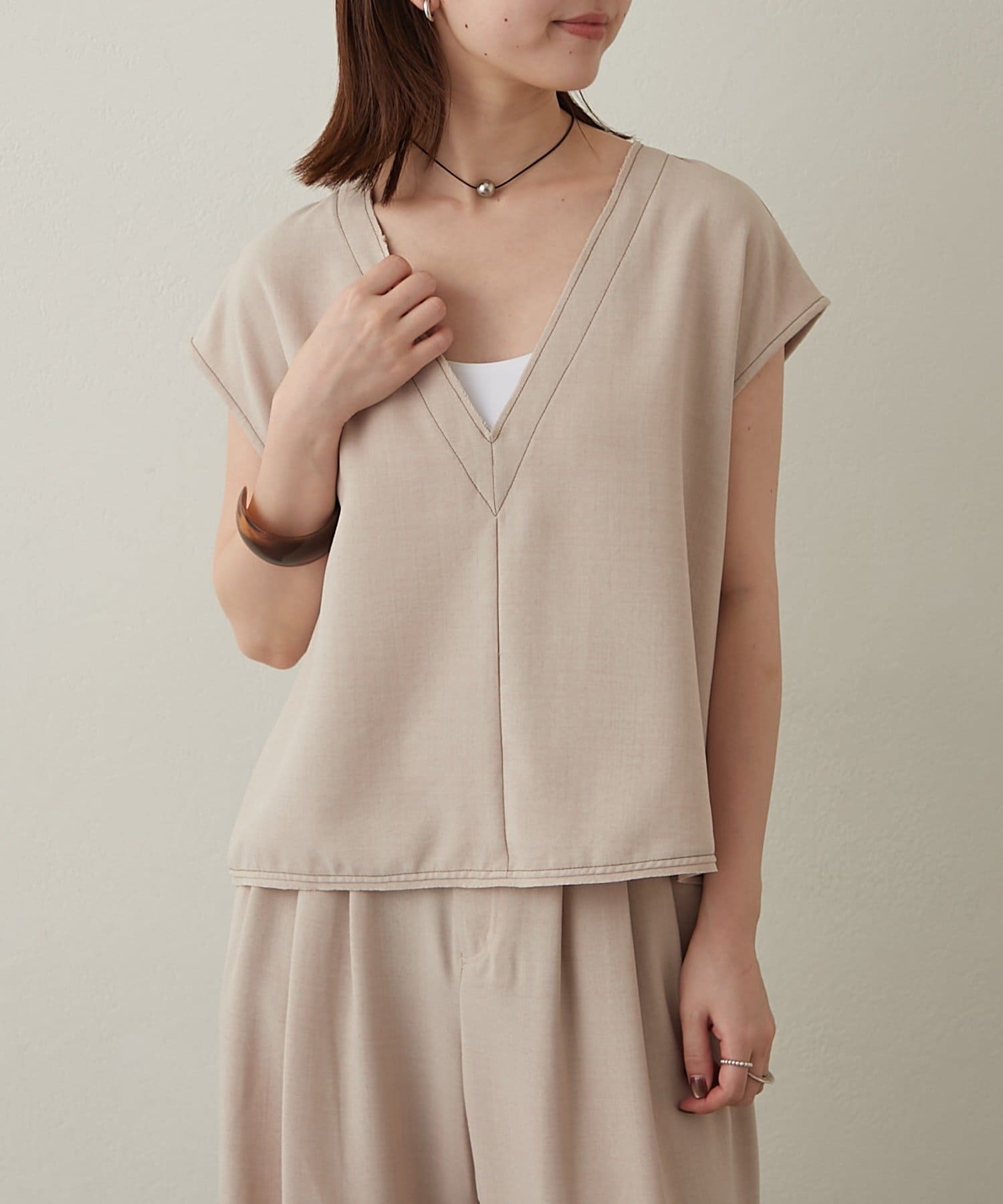 ・首回りのステッチがアクセントのVネックが印象的なノースリブラウス。