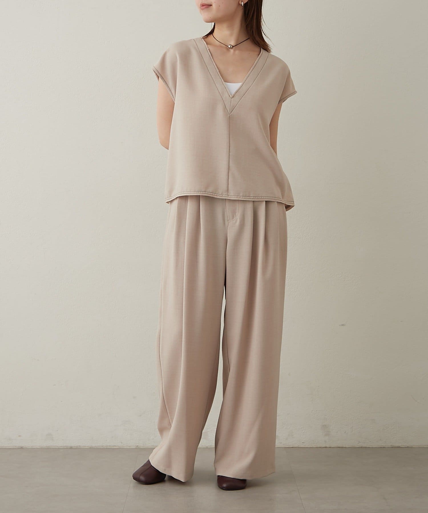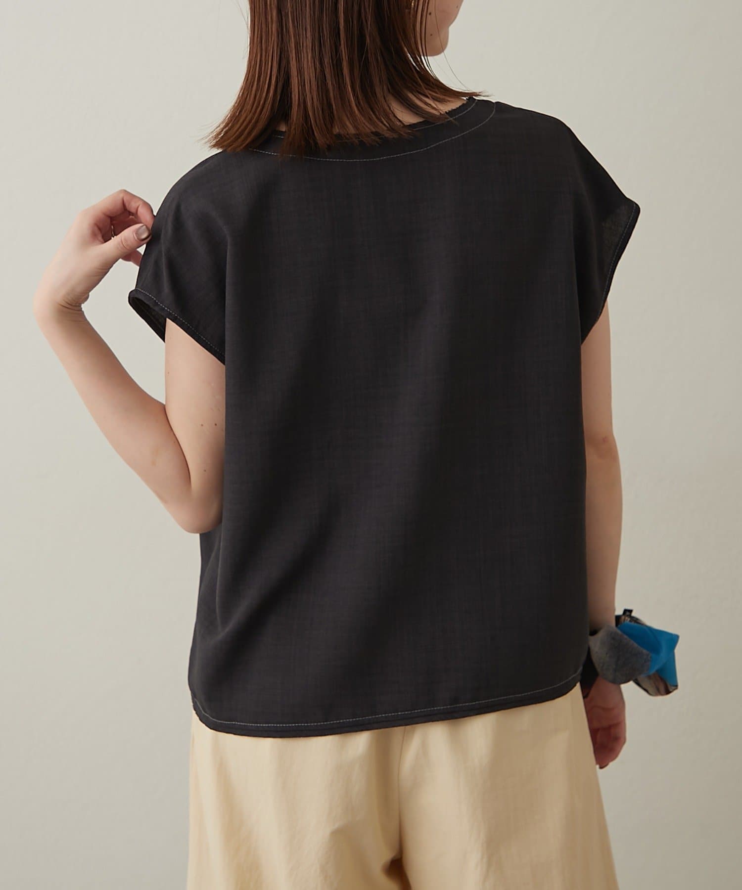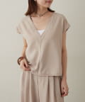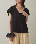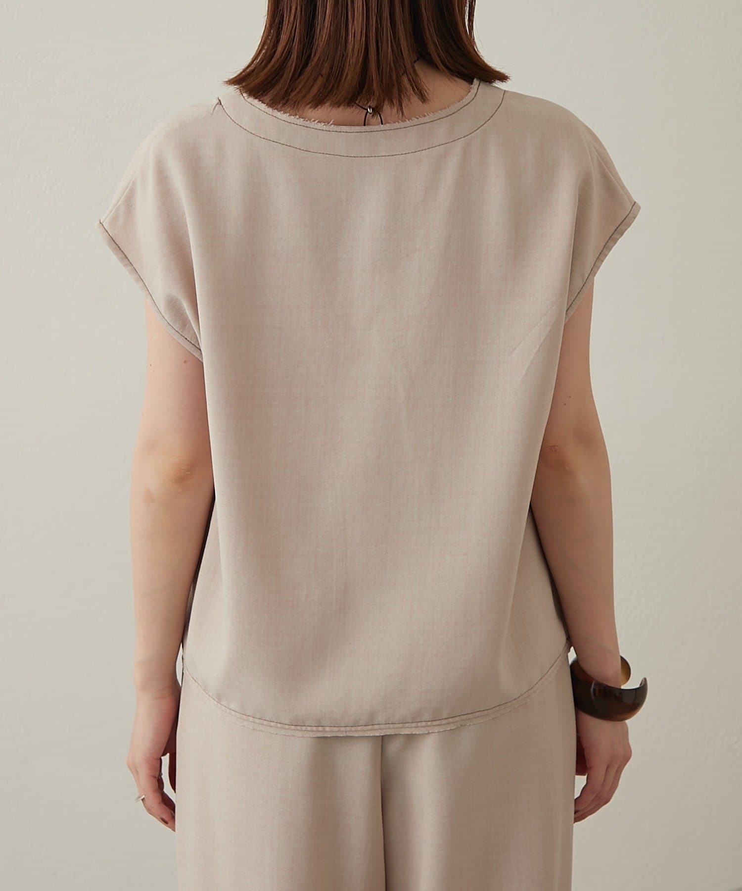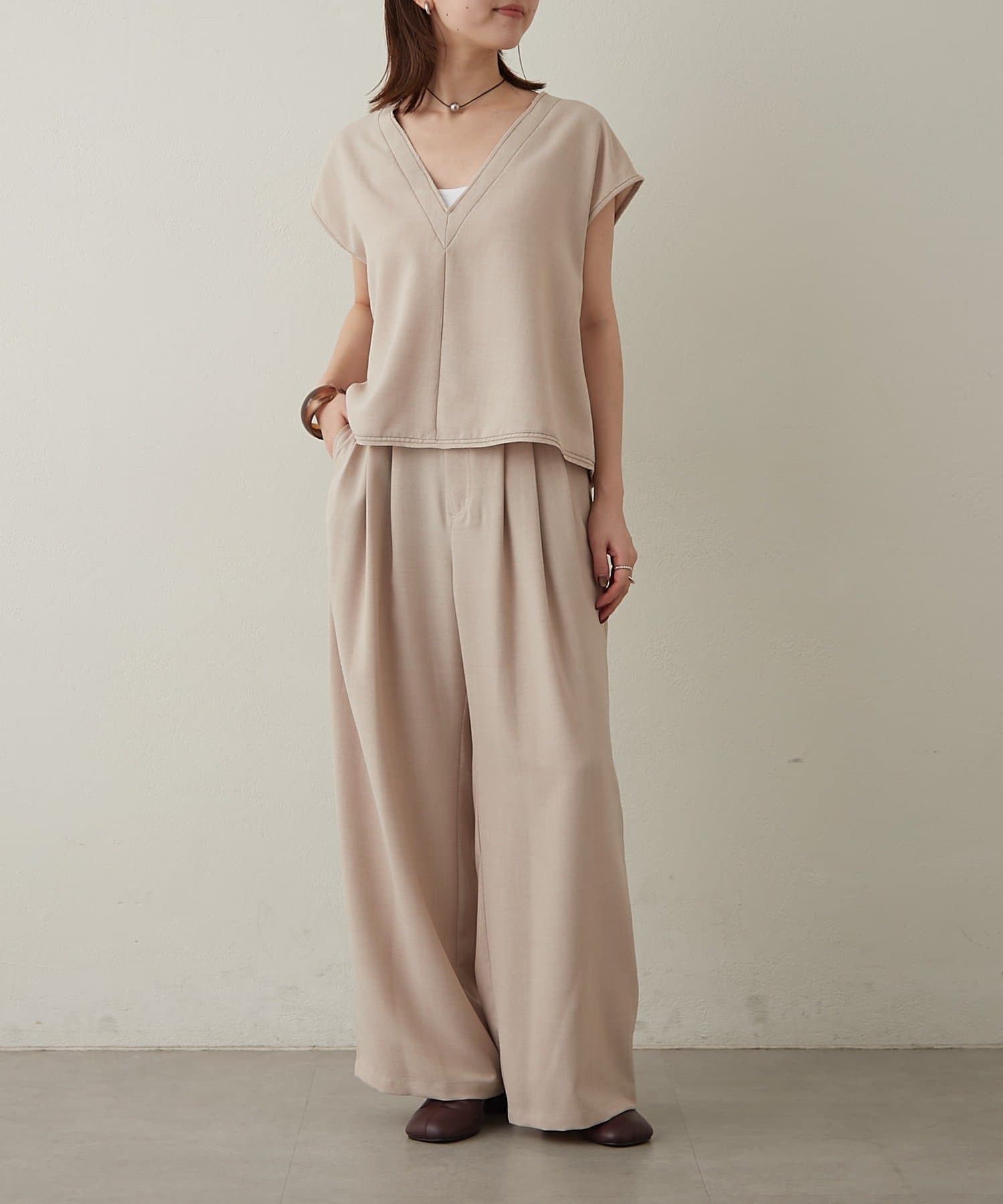 ・首回りのステッチがアクセントのVネックが印象的なノースリブラウス。