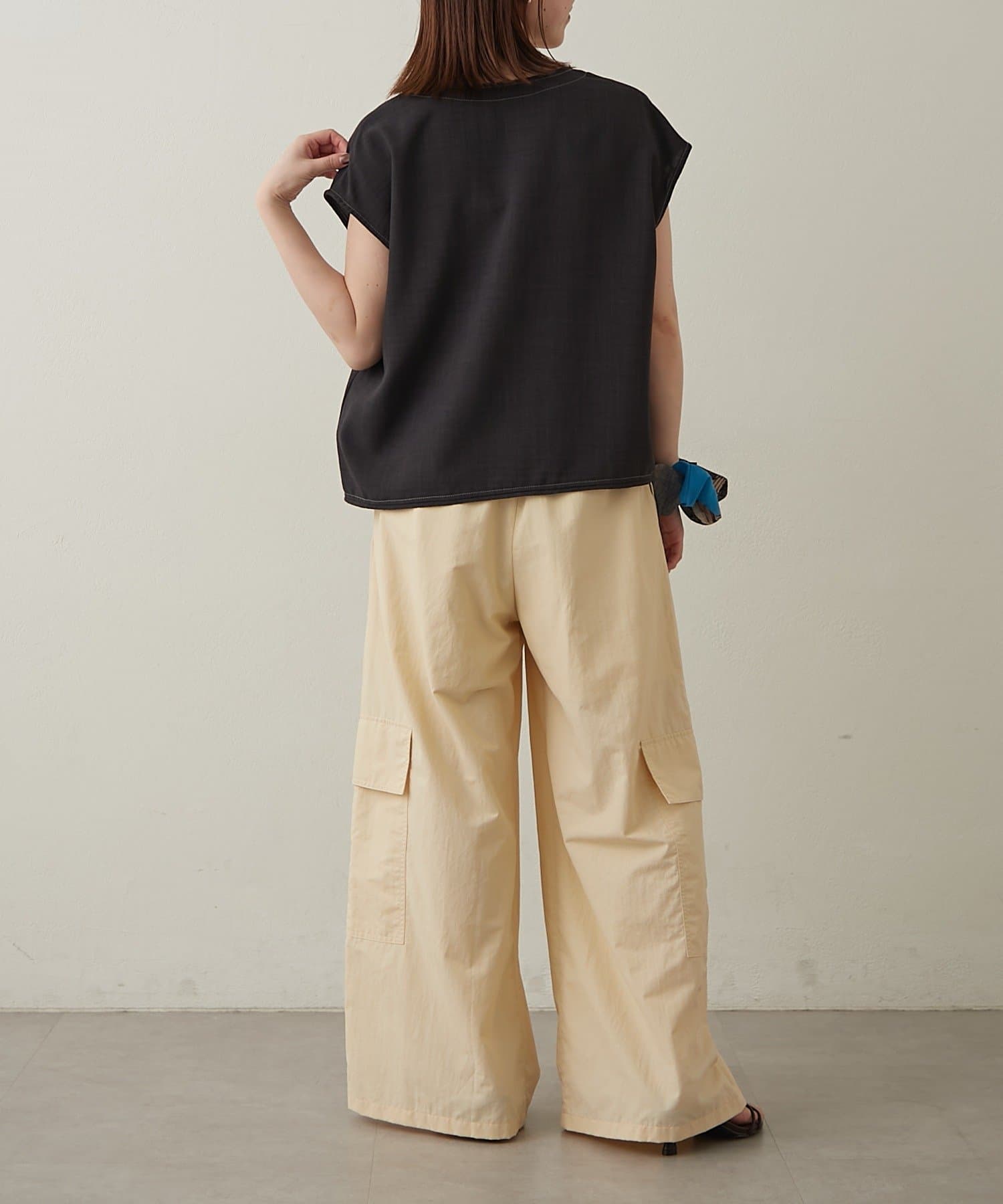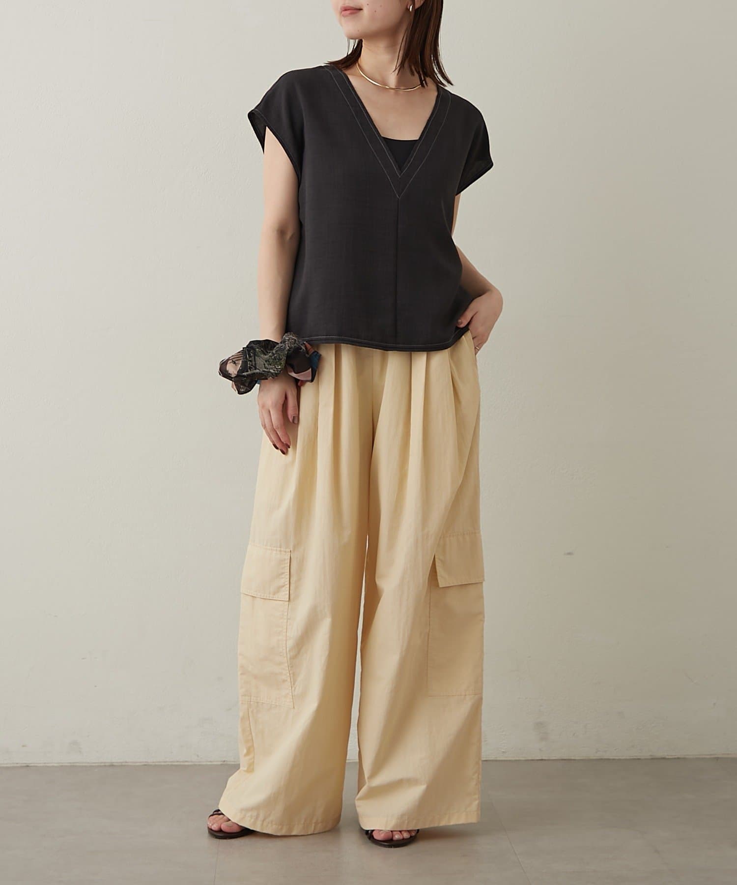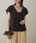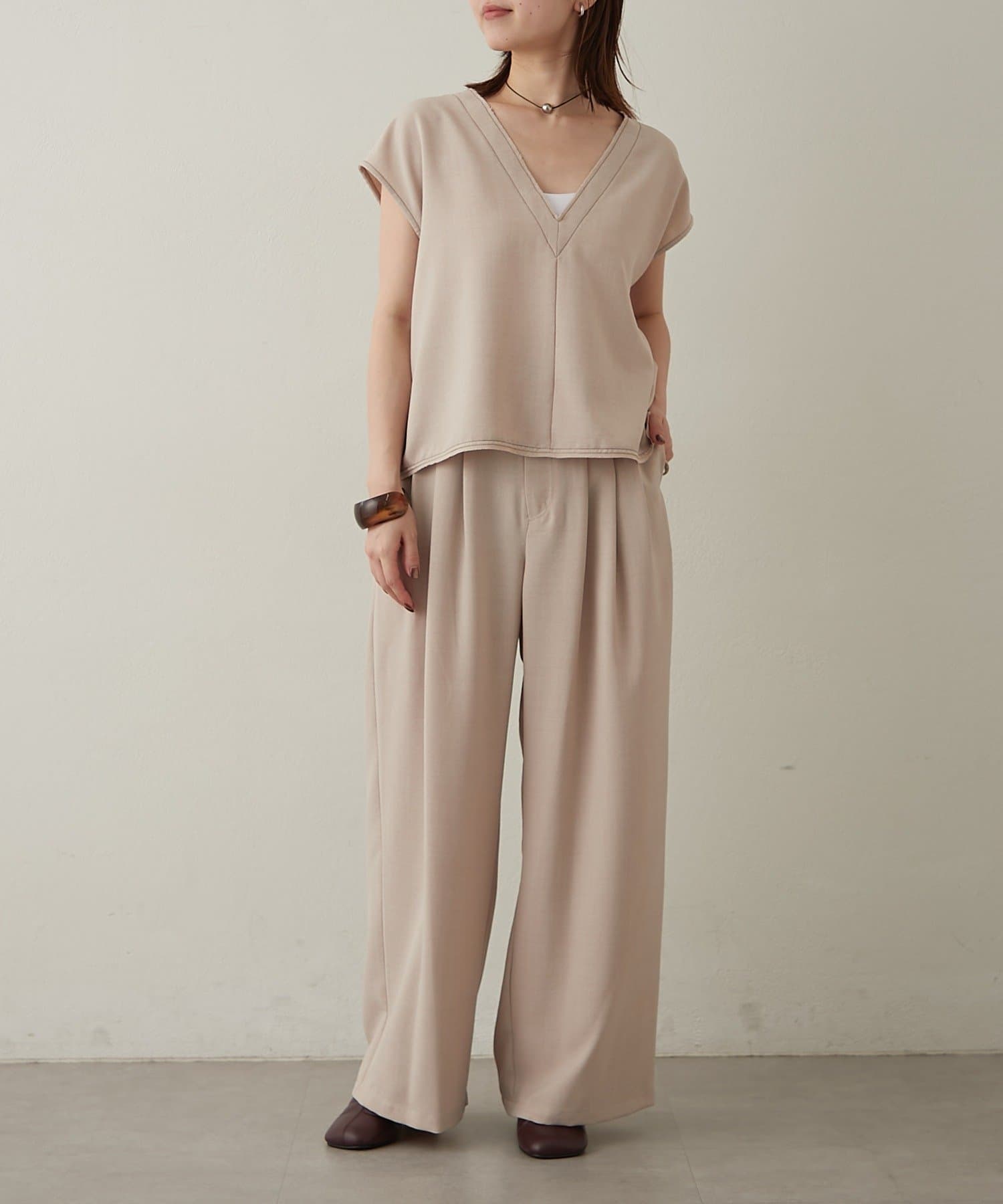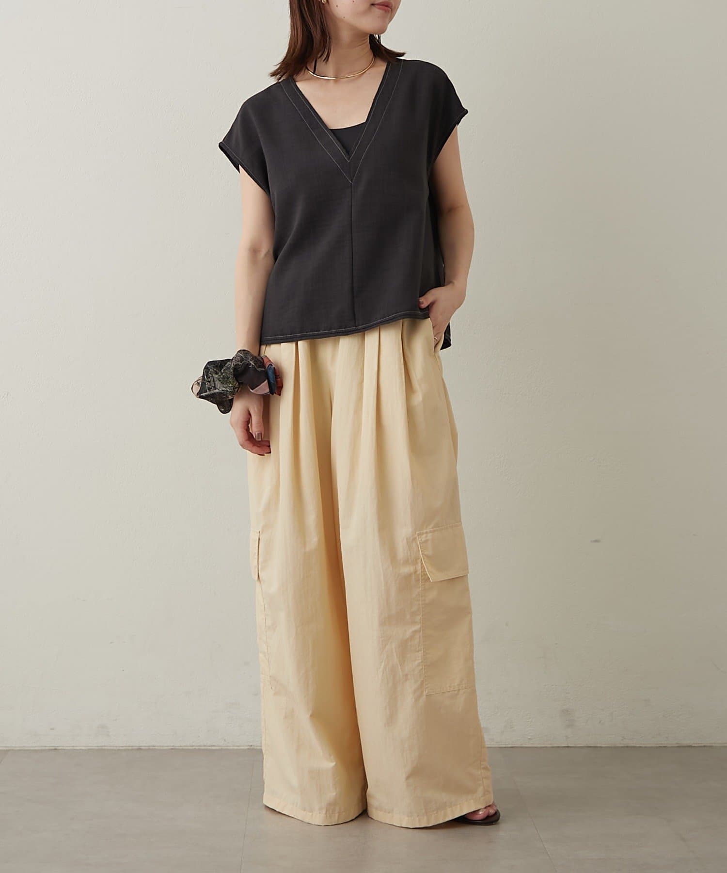 ・首回りのステッチがアクセントのVネックが印象的なノースリブラウス。