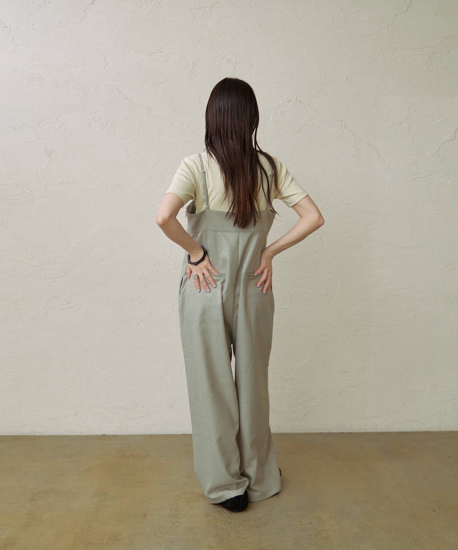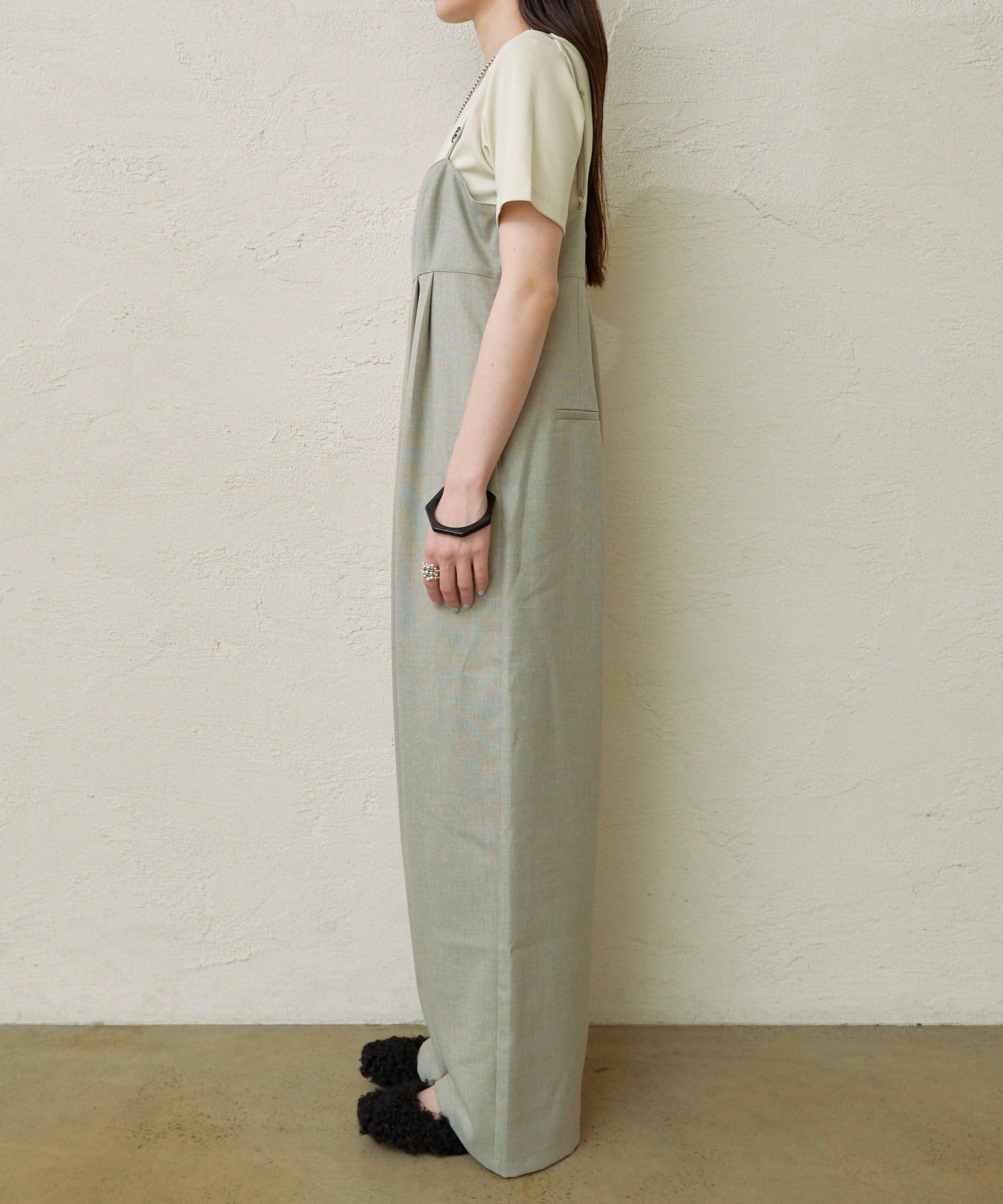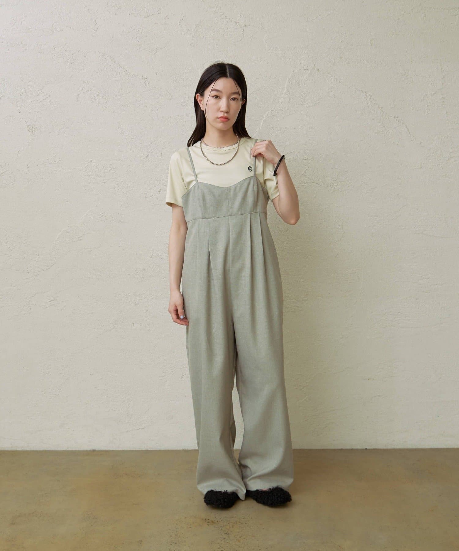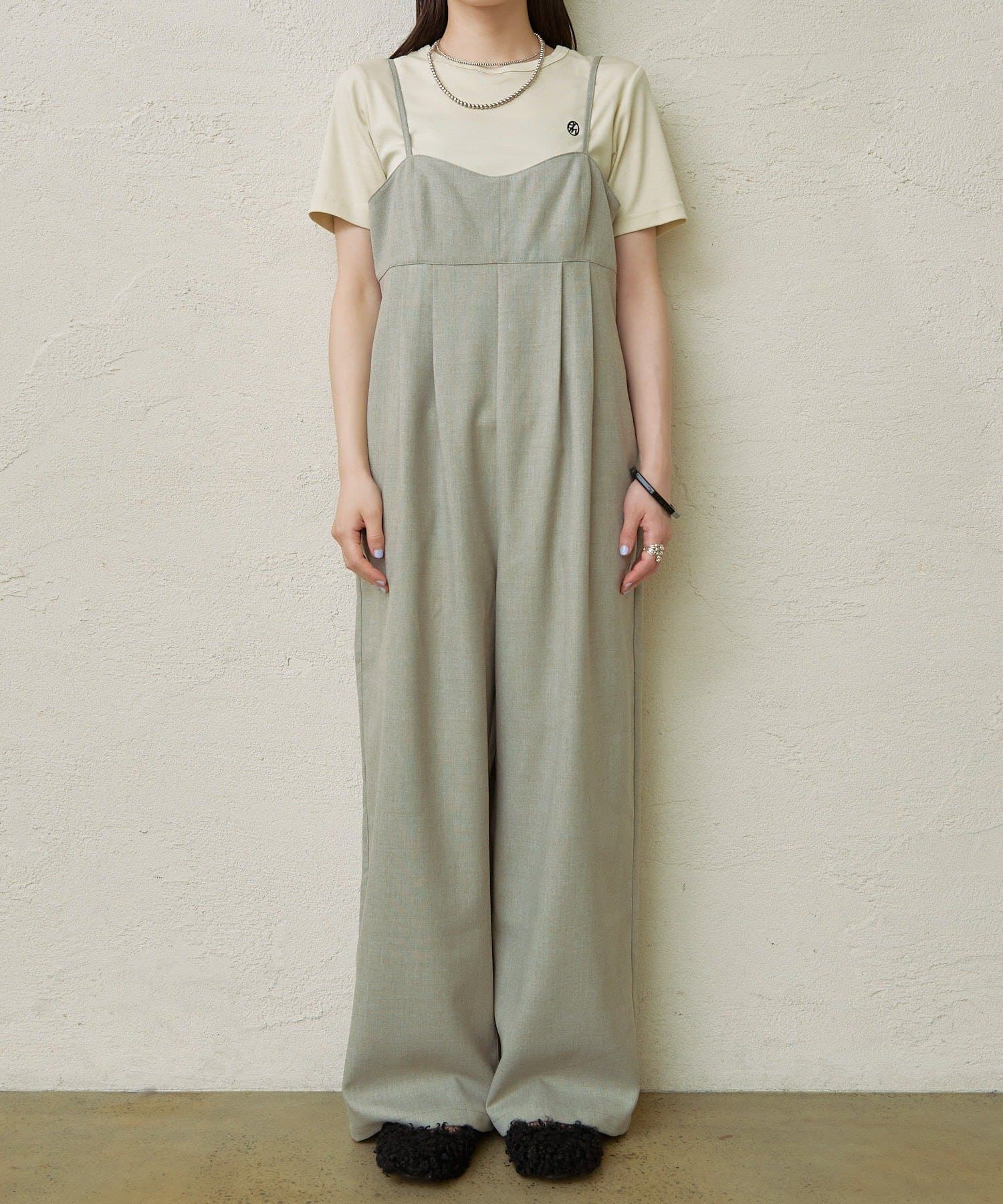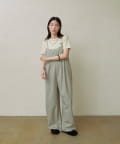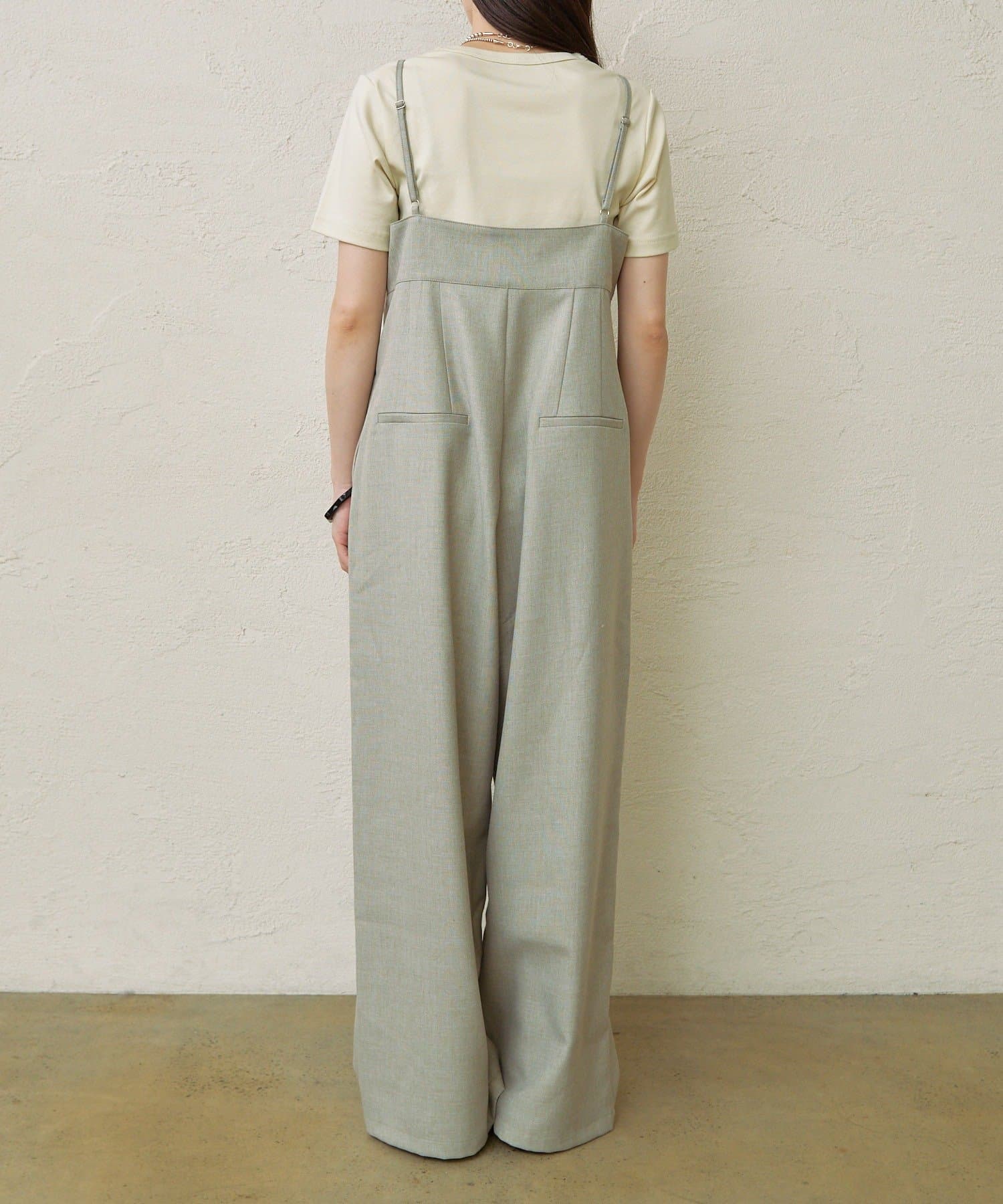 ・華奢な肩紐と2タックが入り、女性らしく大人カジュアルに着ていただけるキャミサロペット