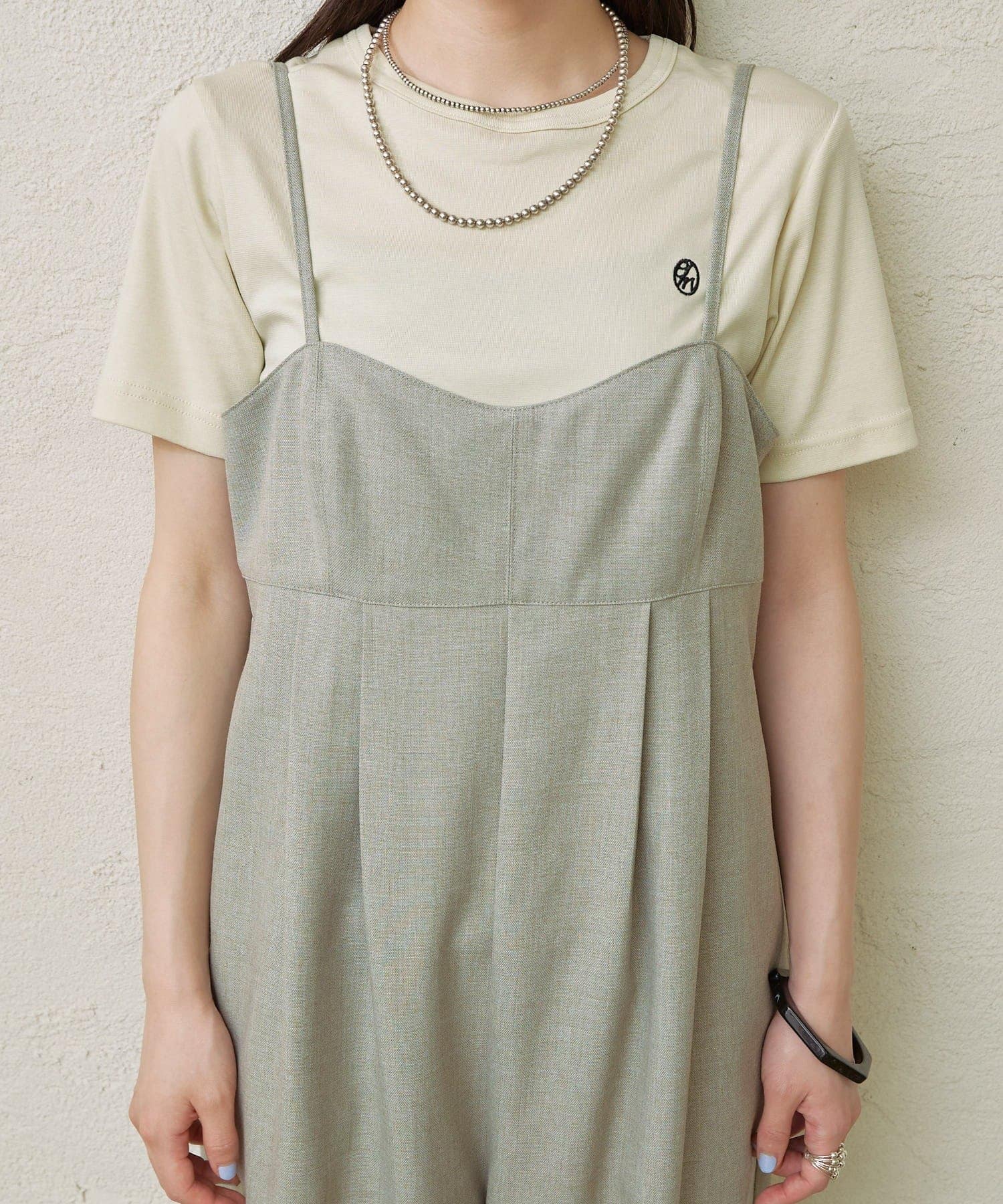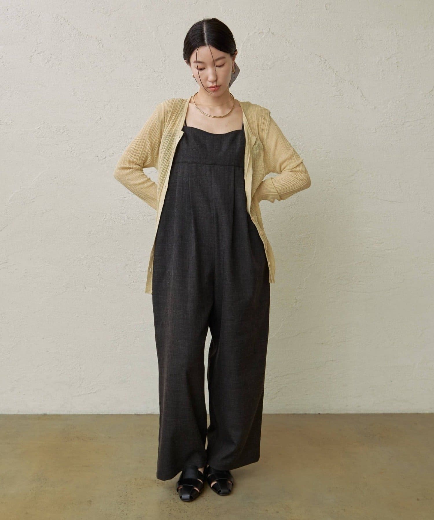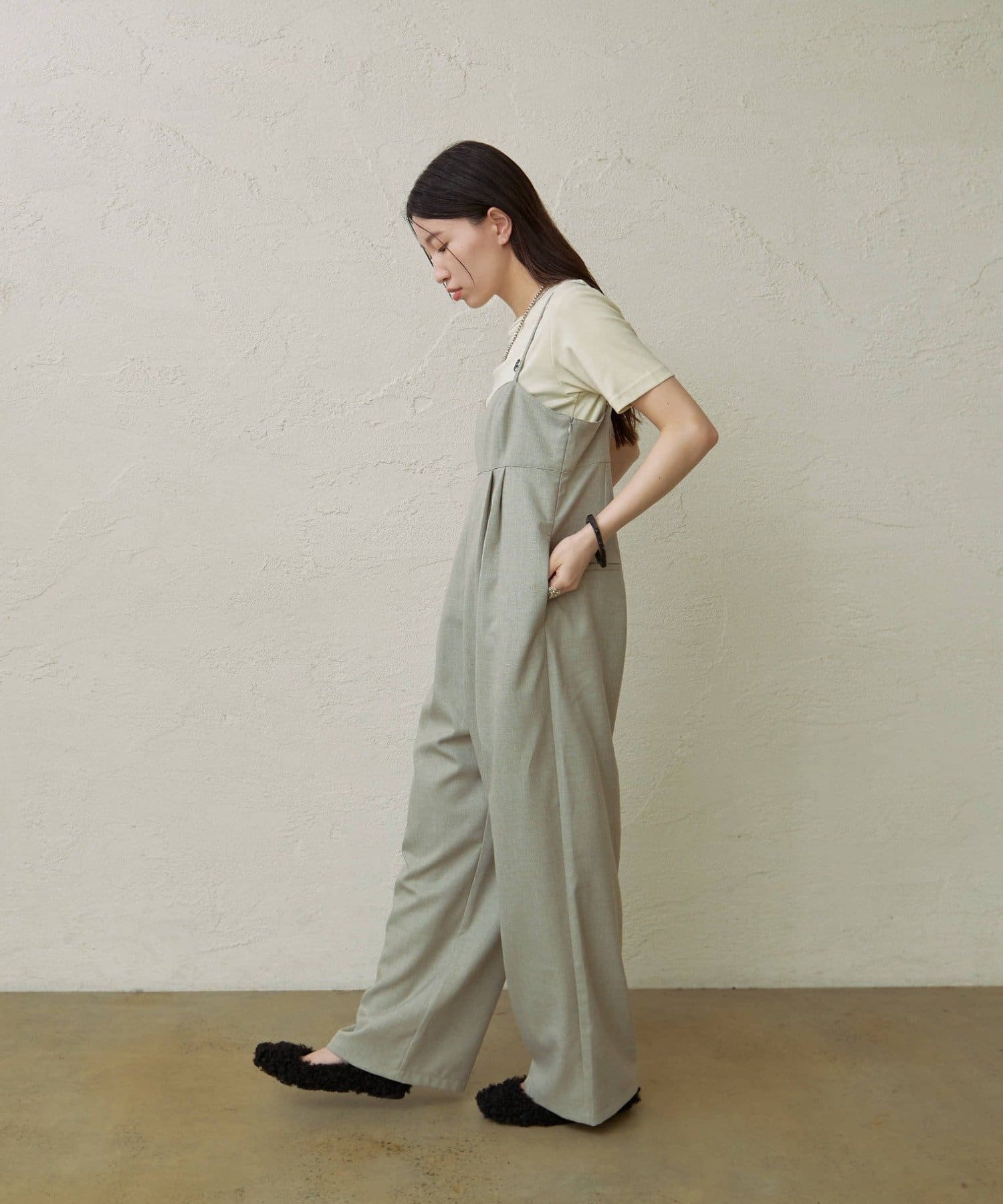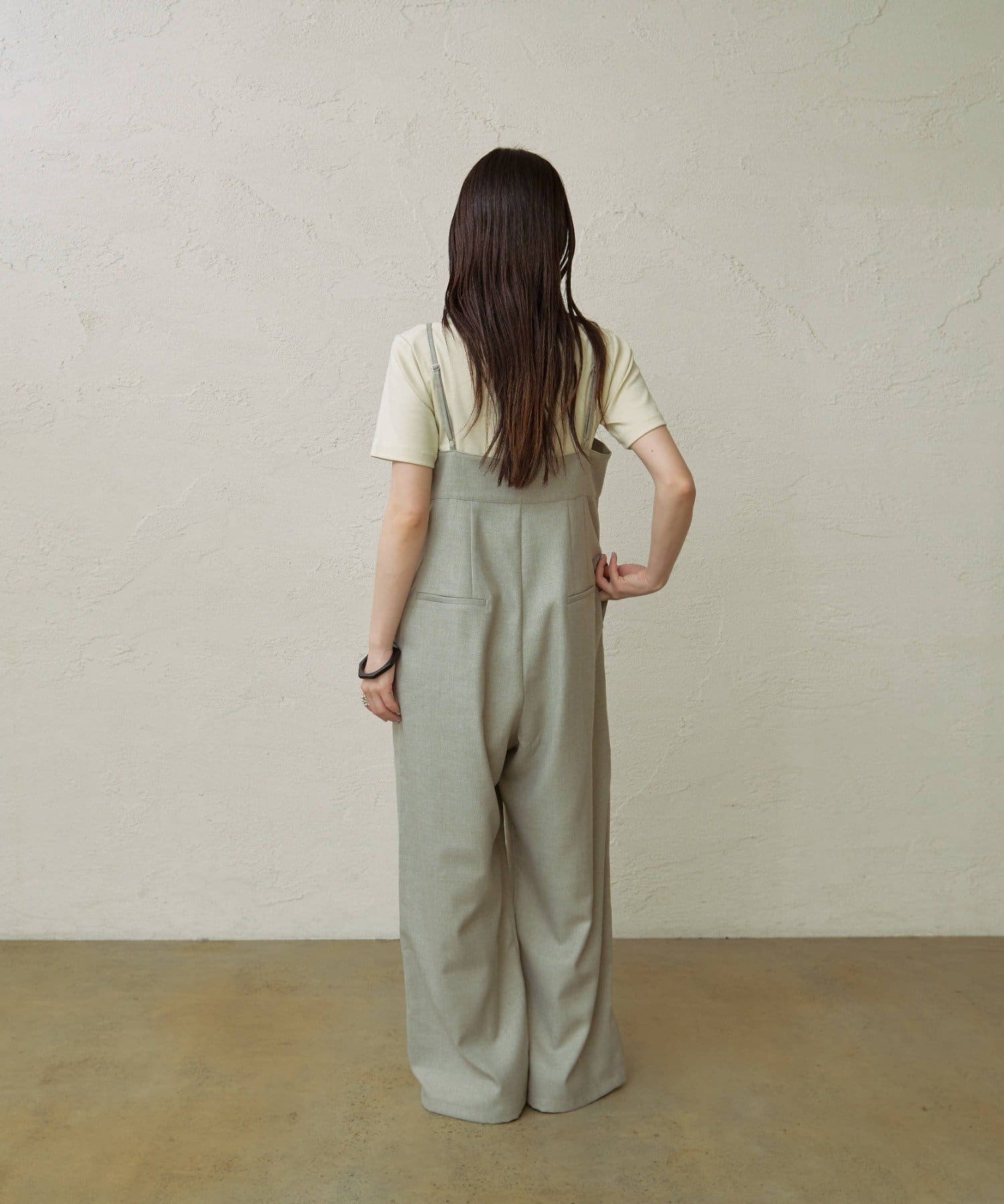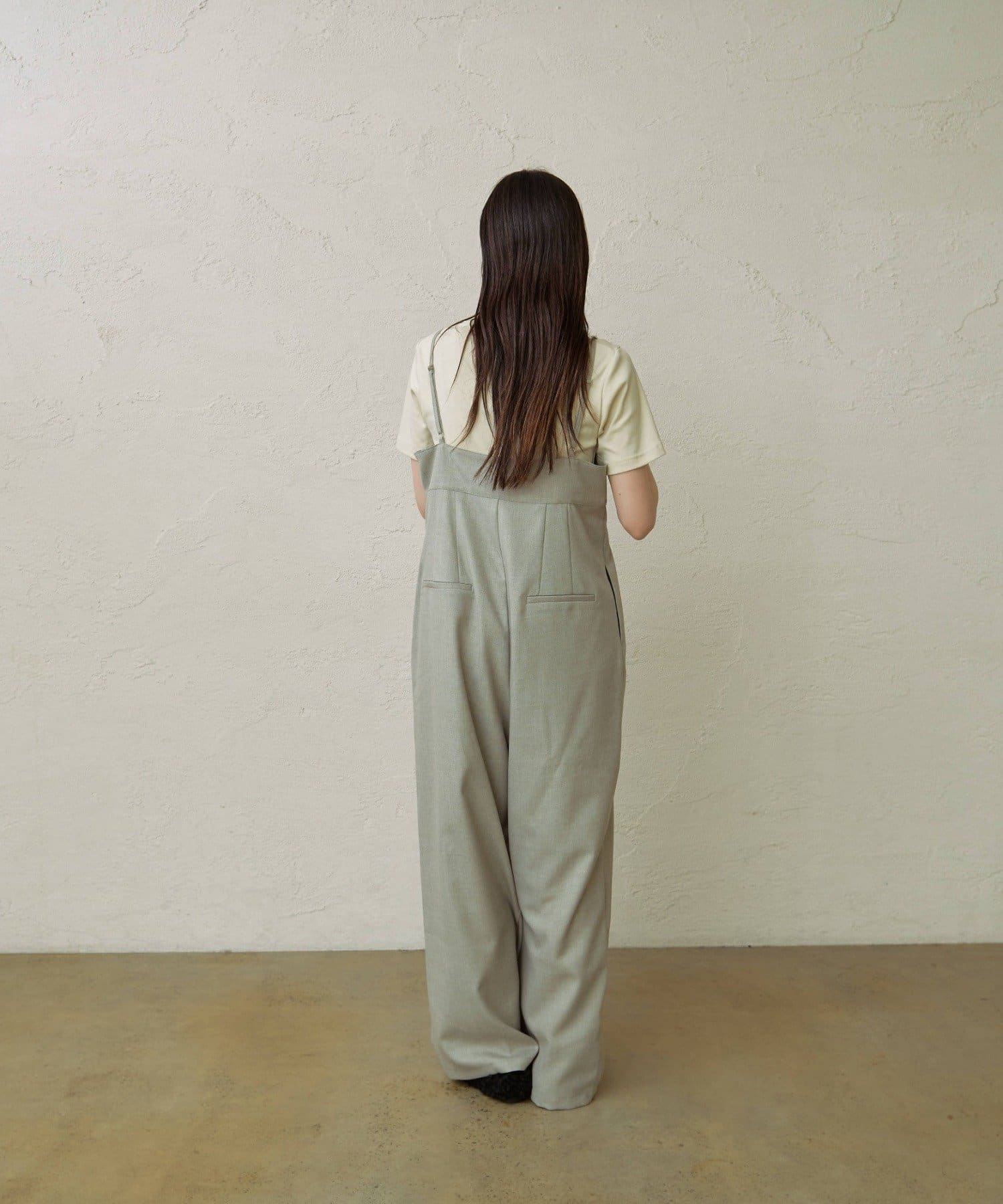 ・華奢な肩紐と2タックが入り、女性らしく大人カジュアルに着ていただけるキャミサロペット
