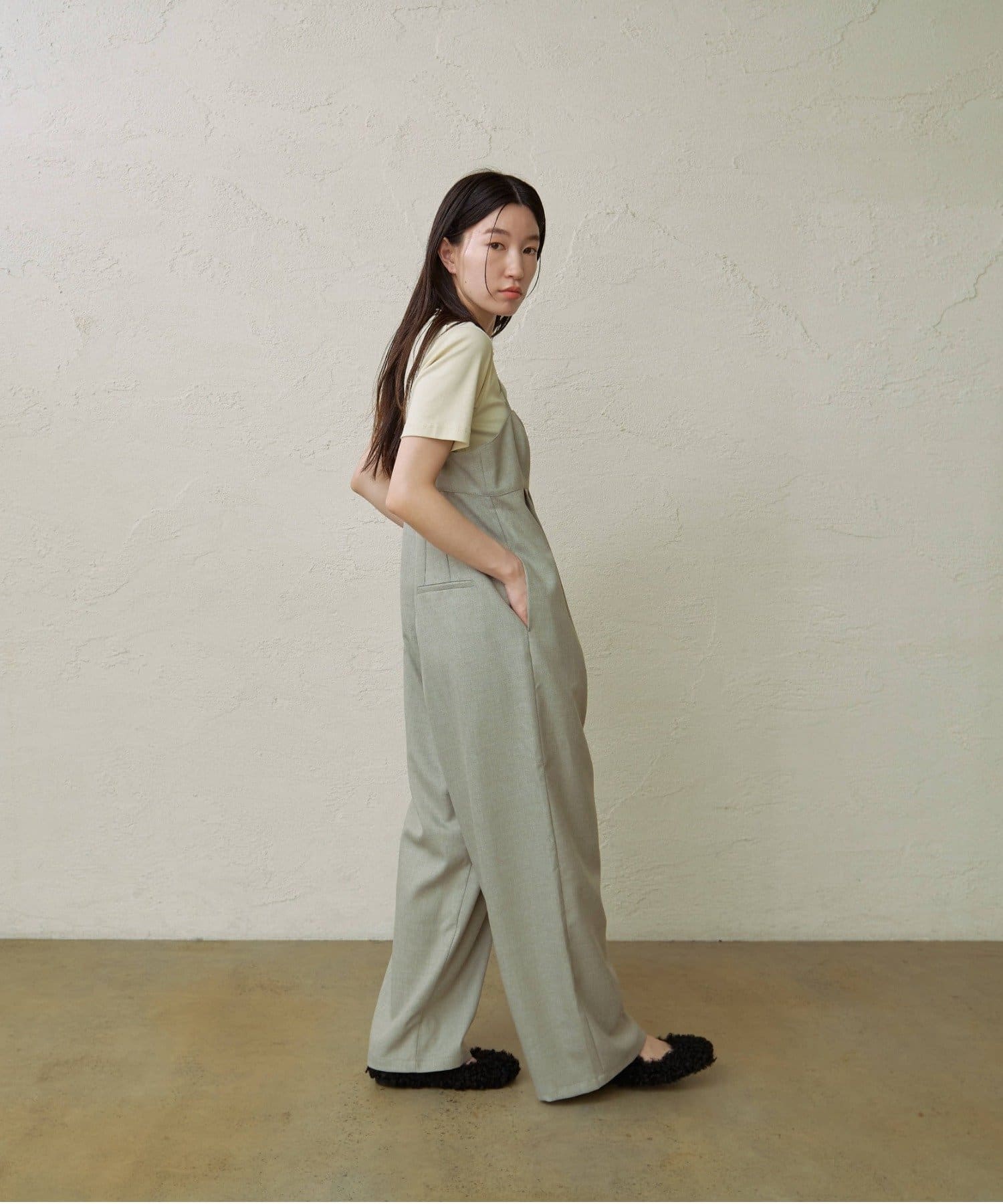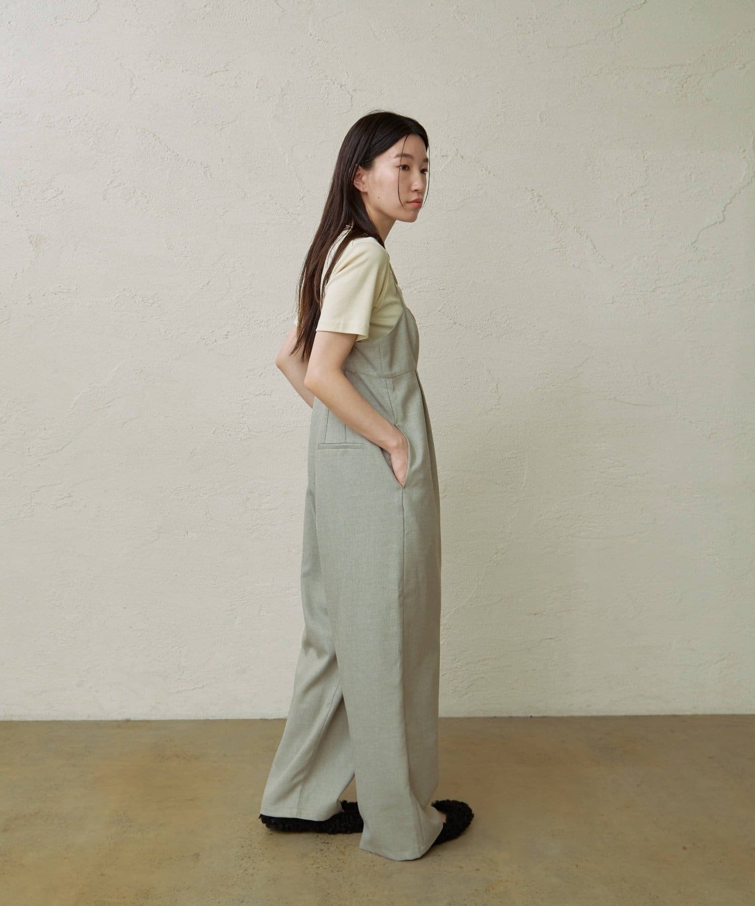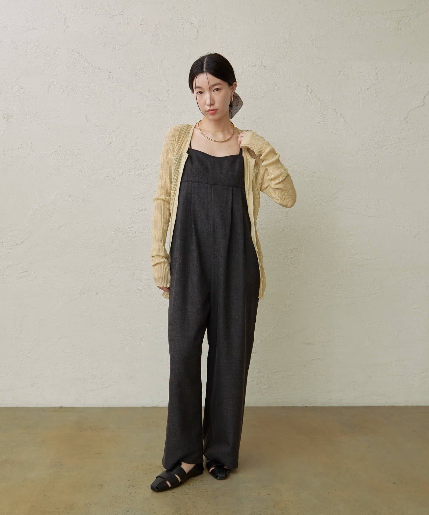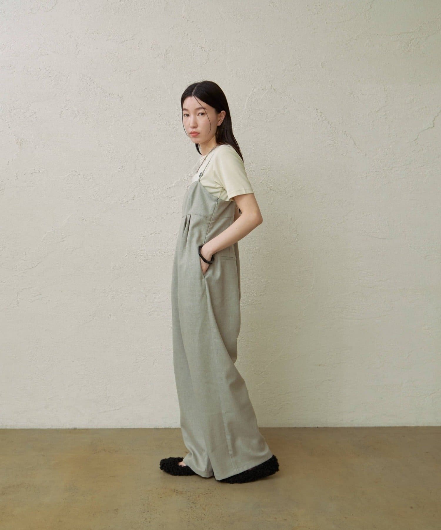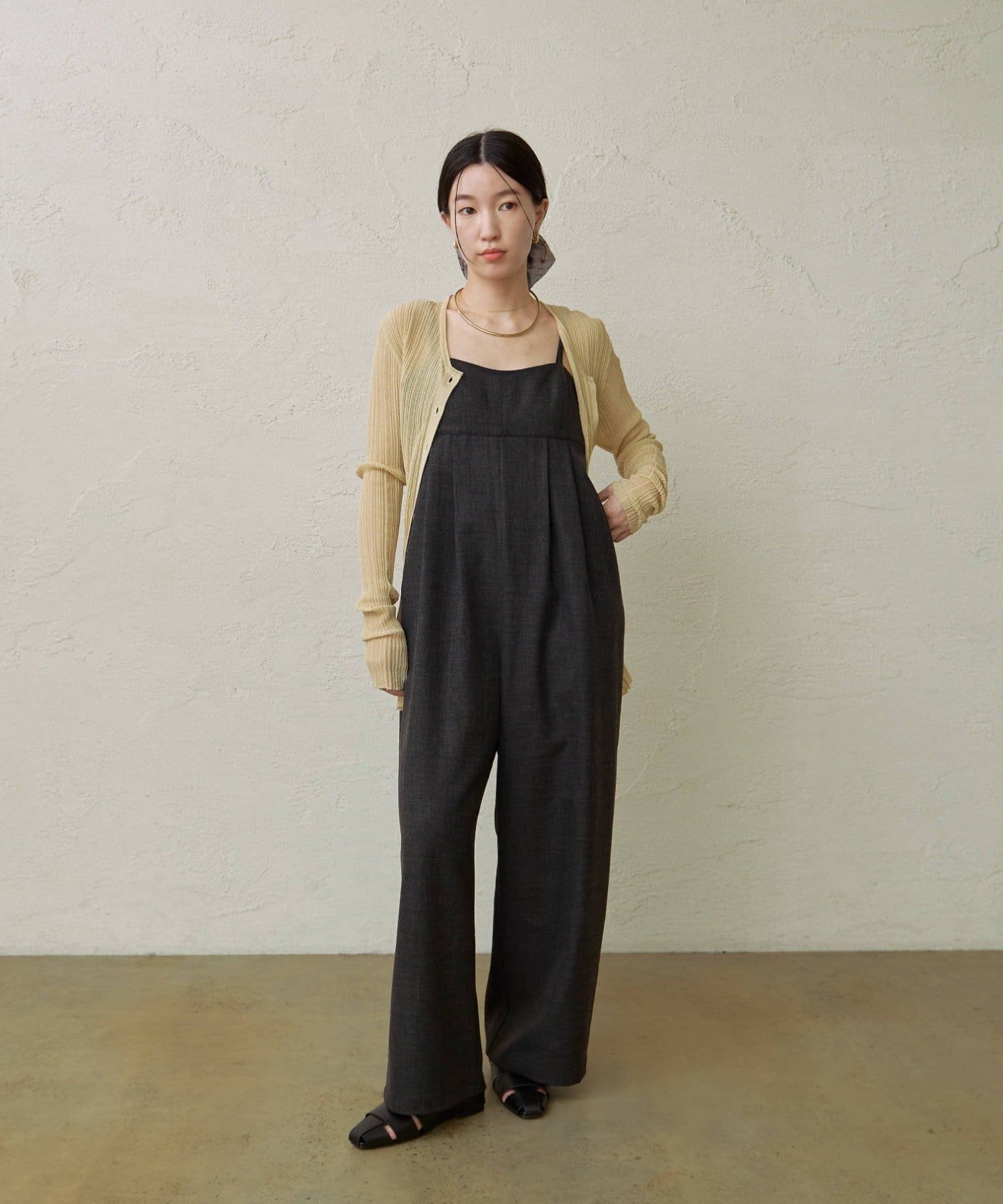 ・華奢な肩紐と2タックが入り、女性らしく大人カジュアルに着ていただけるキャミサロペット