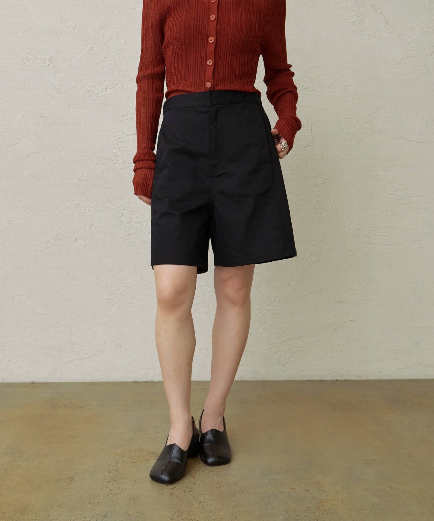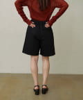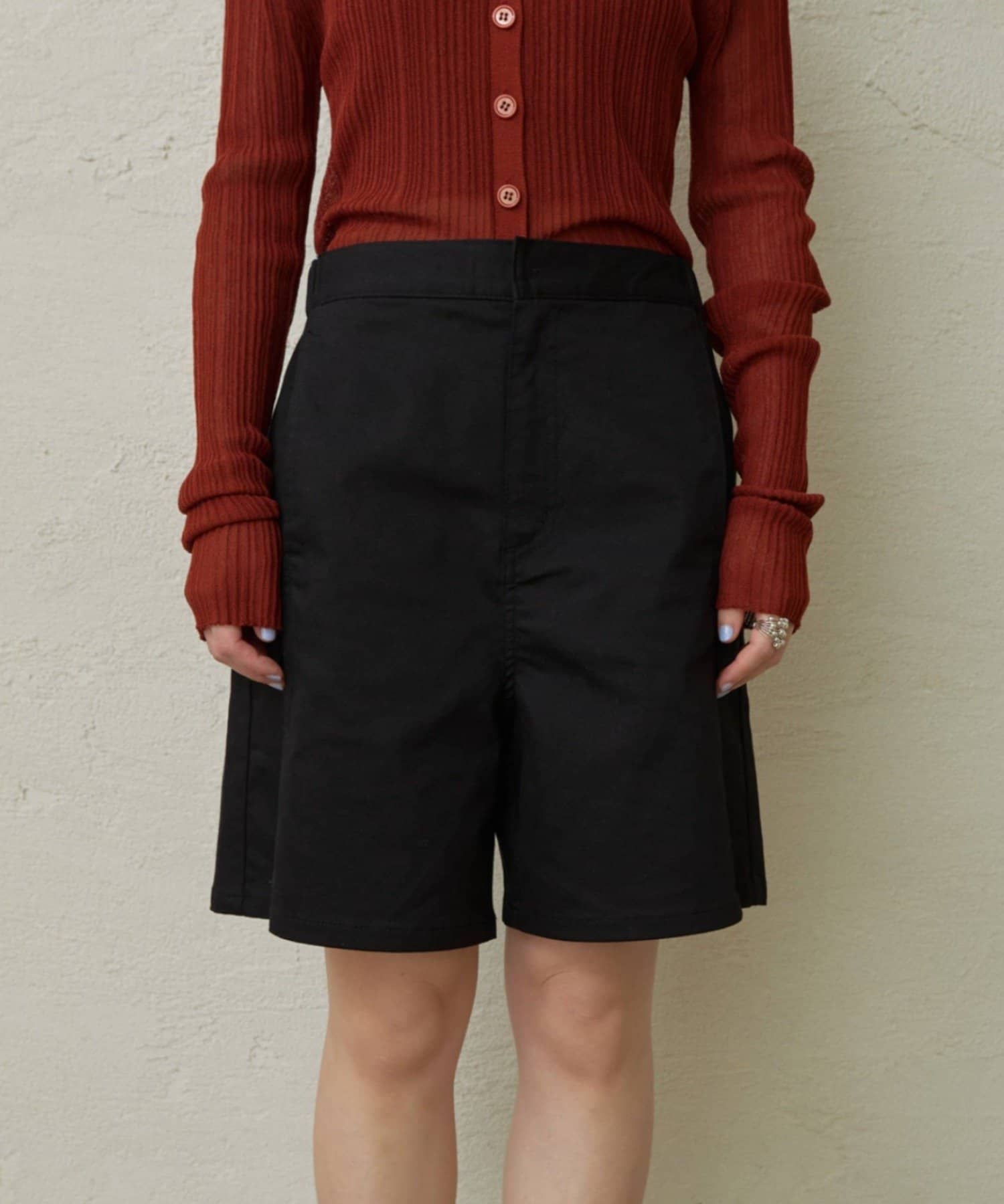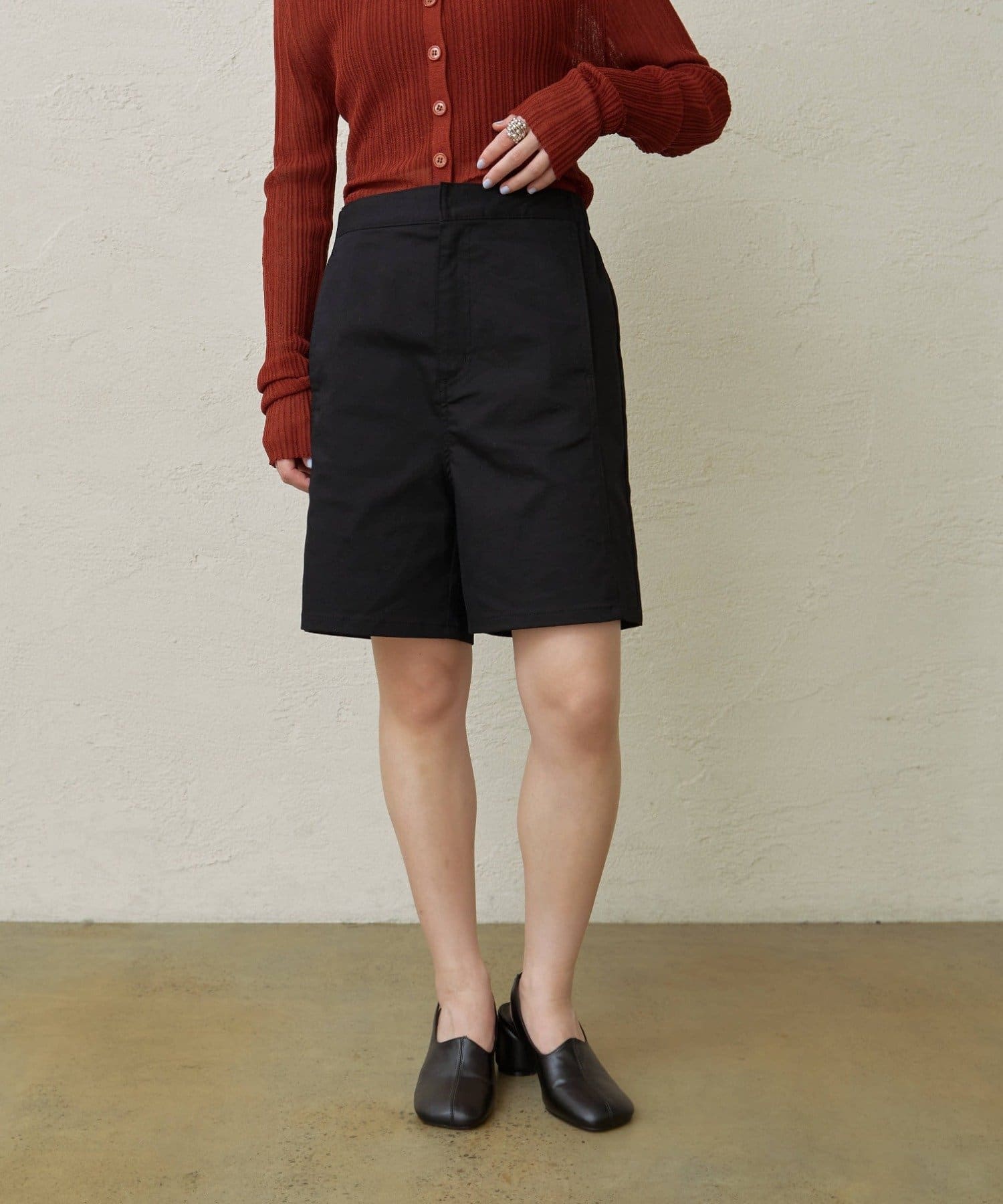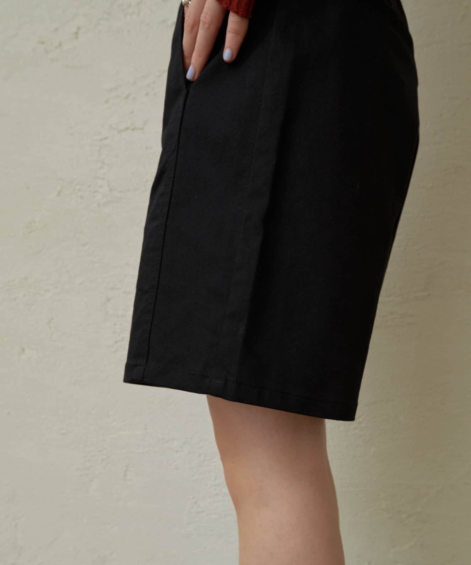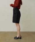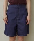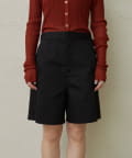 ・程よい丈感とフレアなシルエットで脚を細見えさせてくれるショートパンツ。