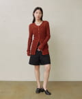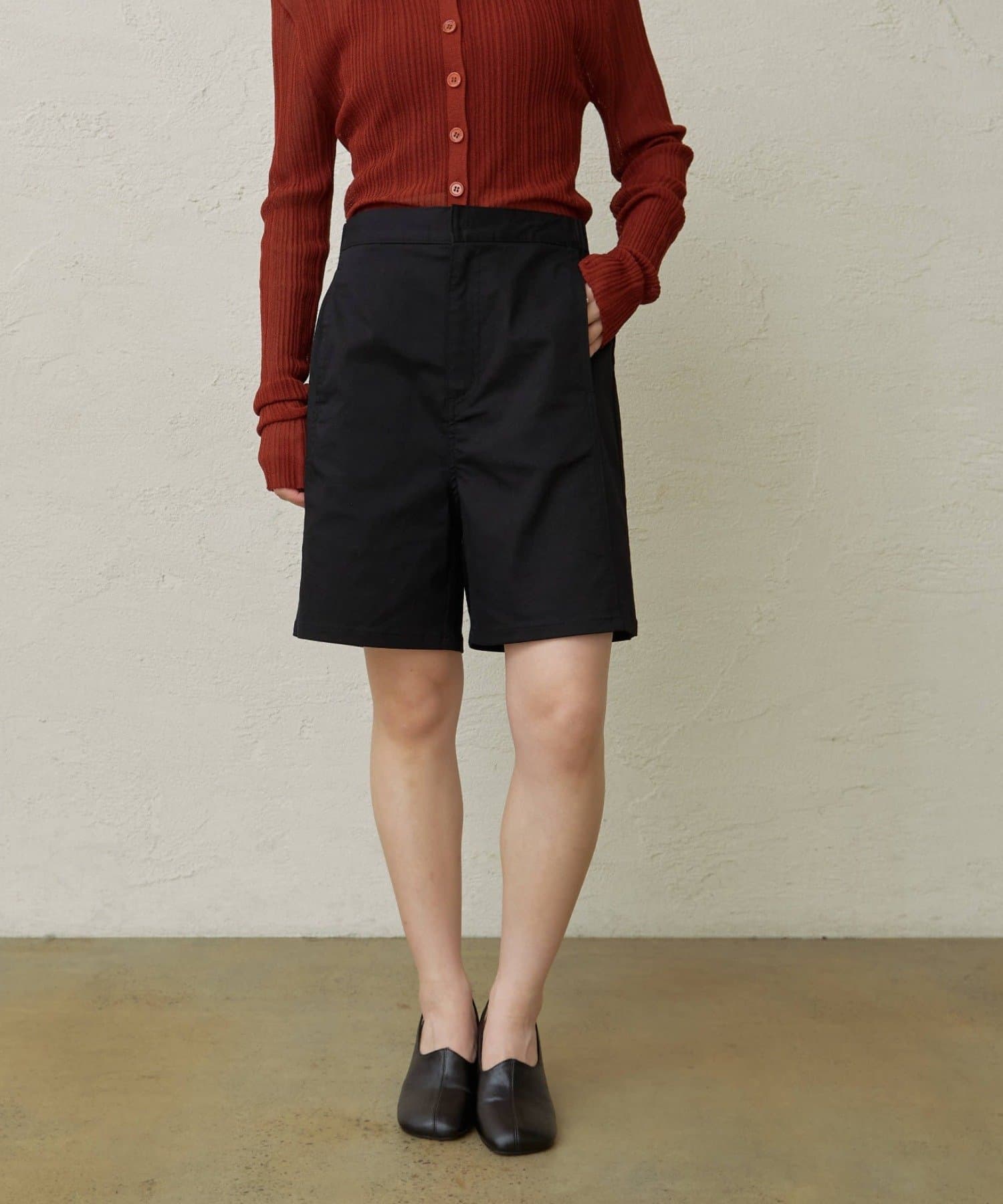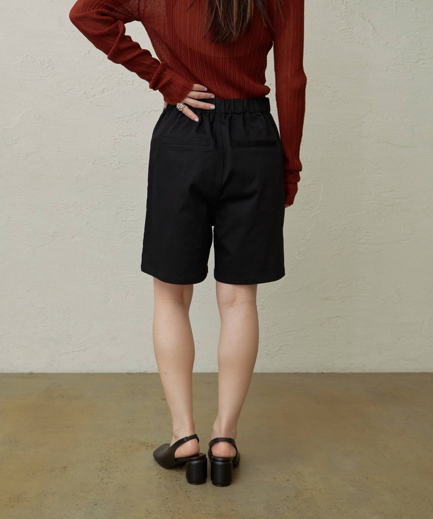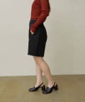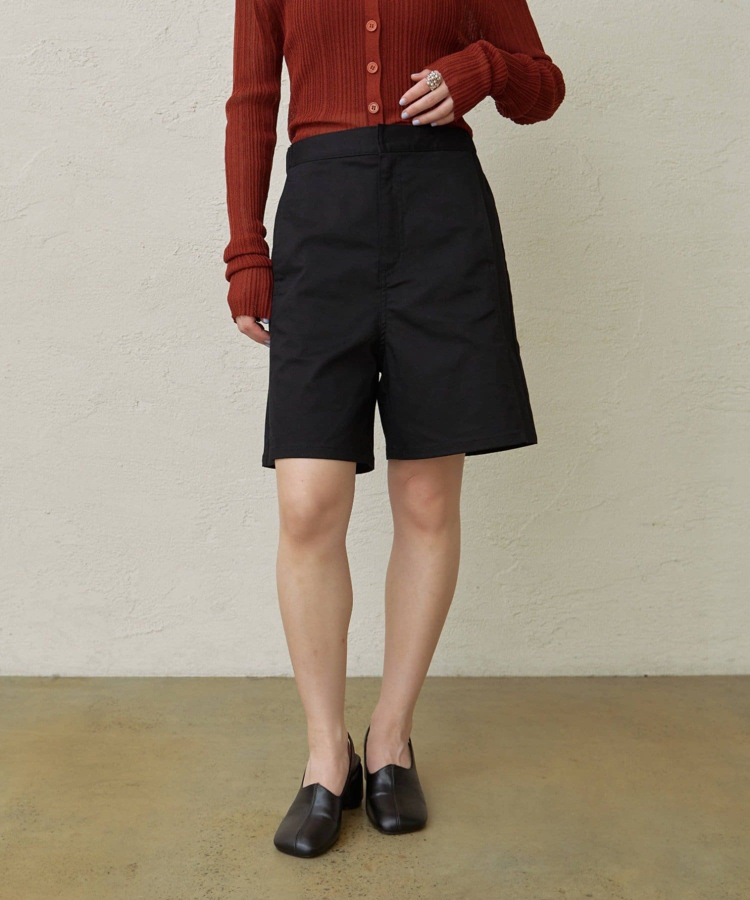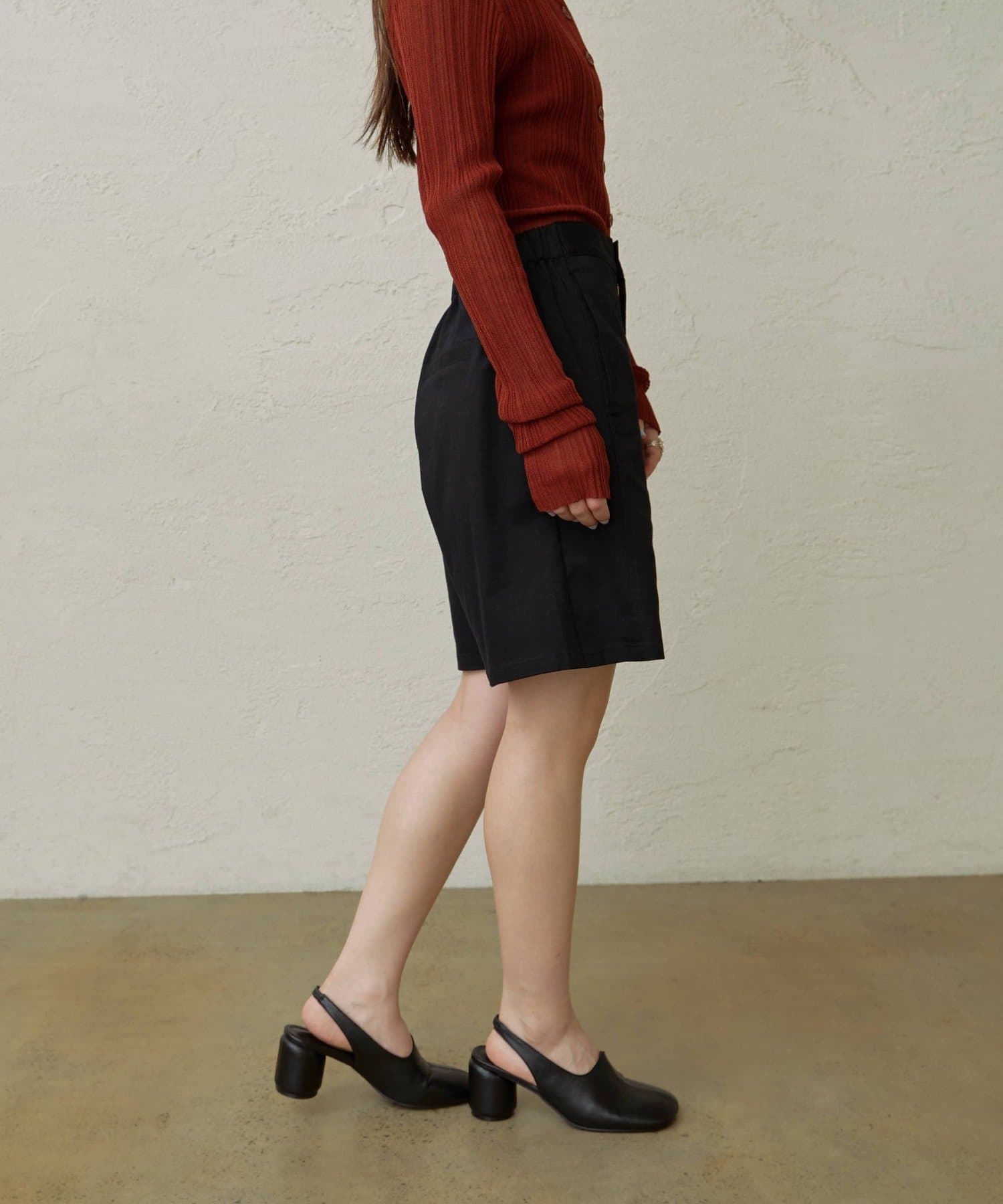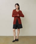 ・程よい丈感とフレアなシルエットで脚を細見えさせてくれるショートパンツ。