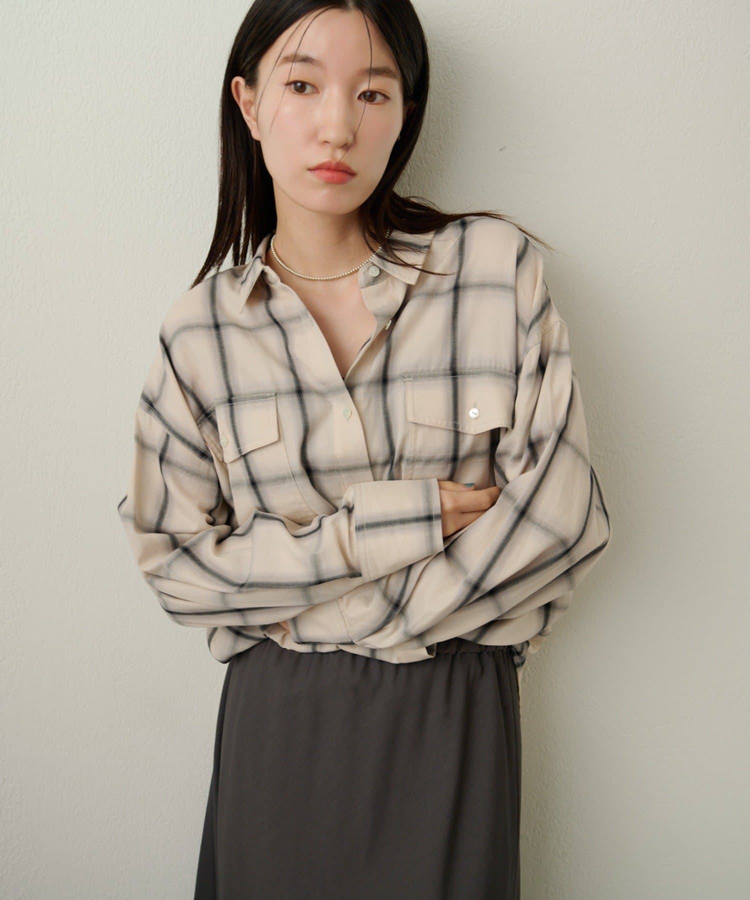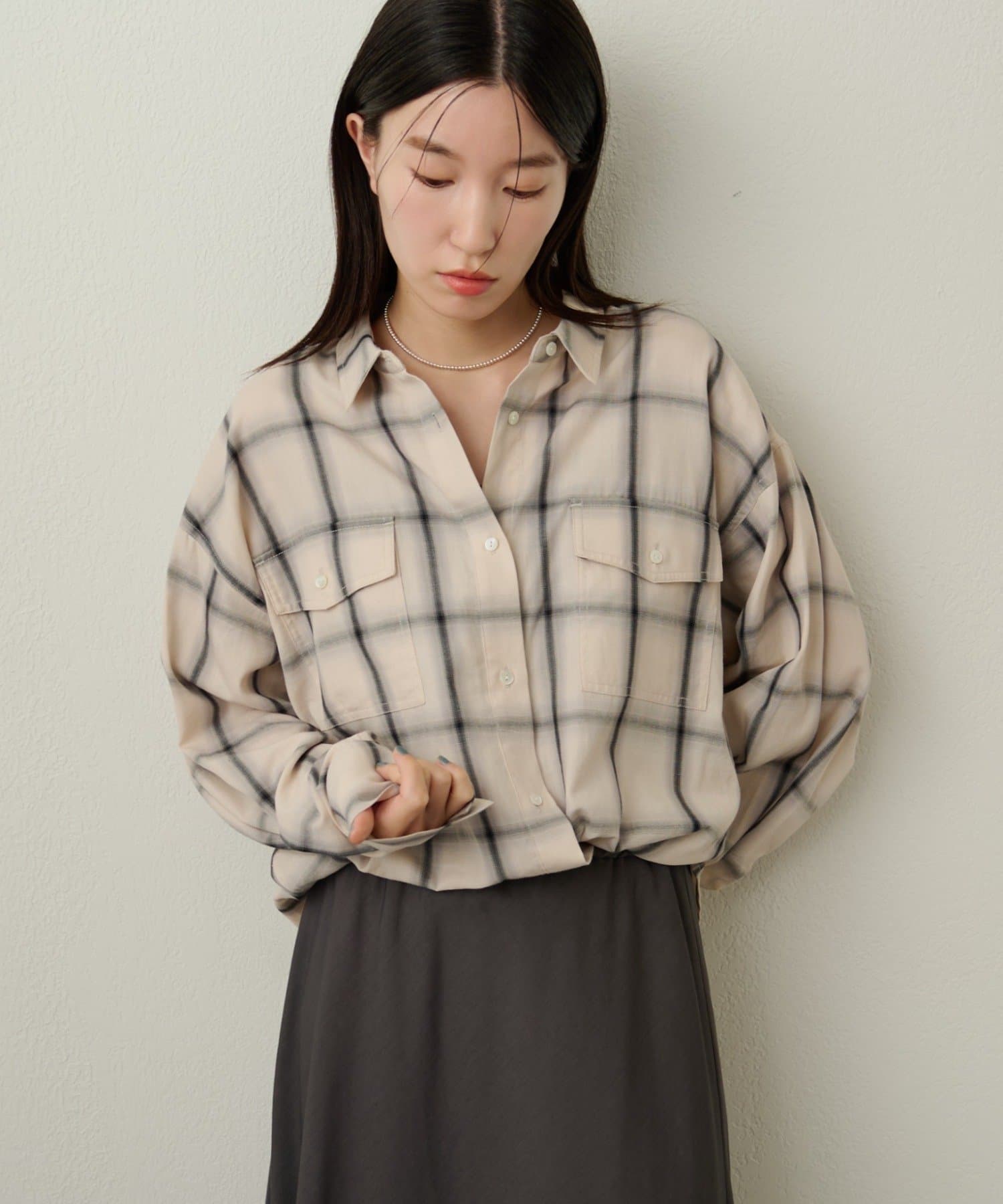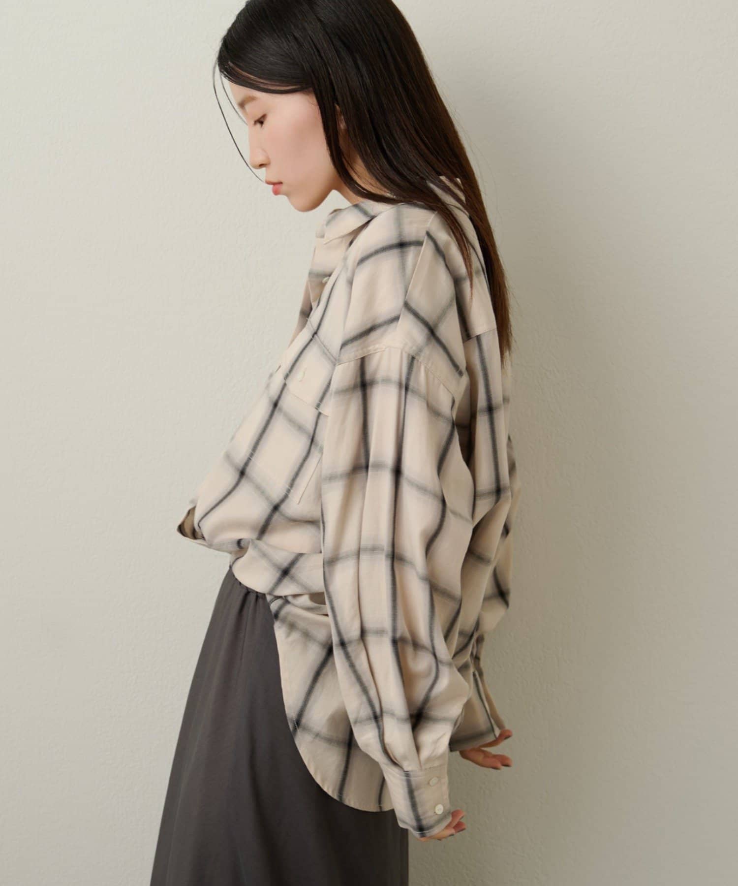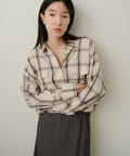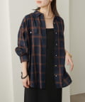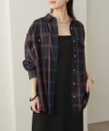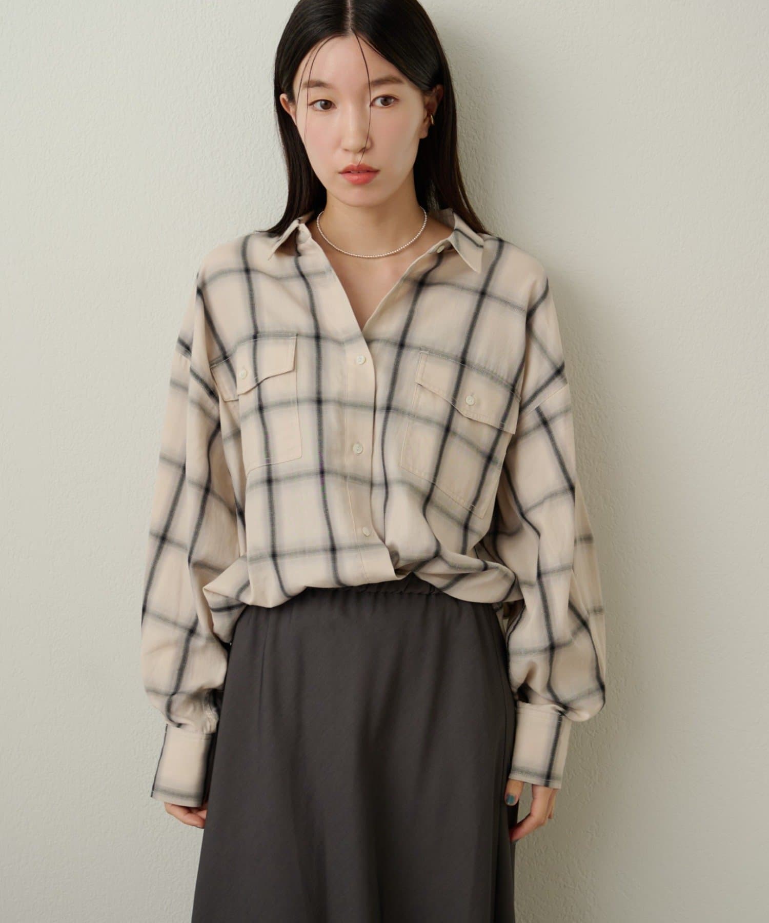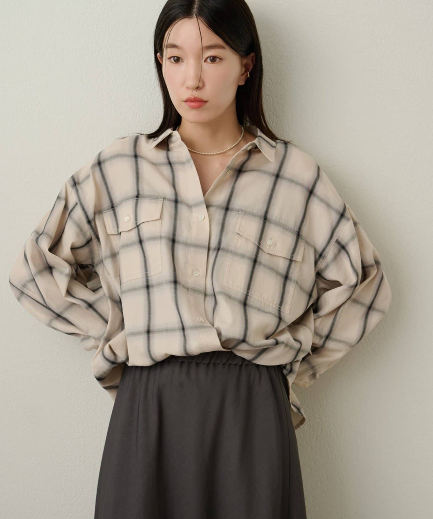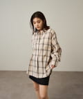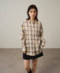 ・ややオーバーシルエットのチェック柄シャツ。