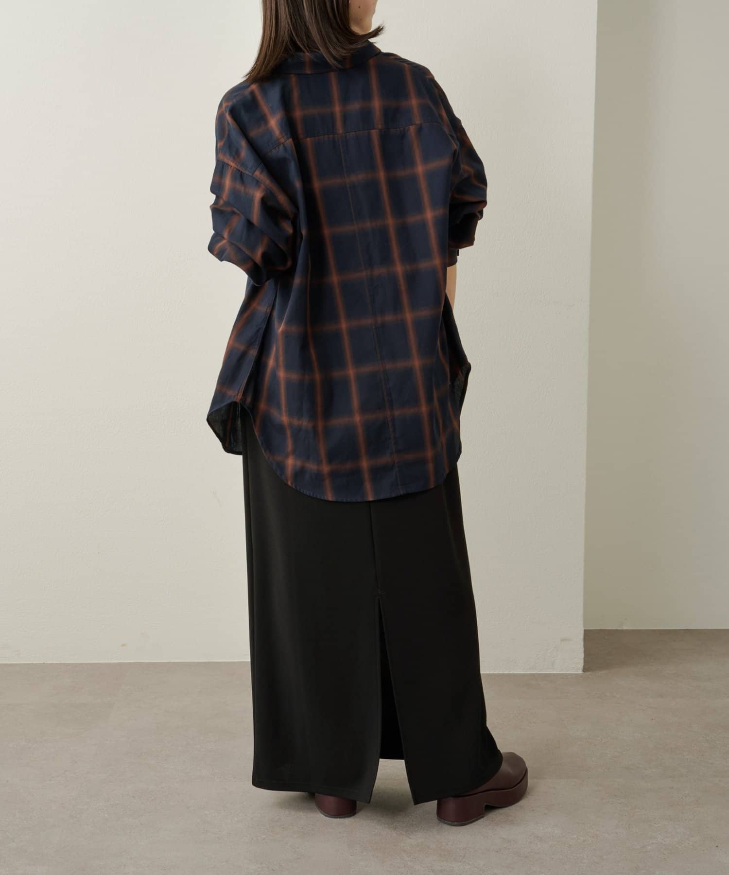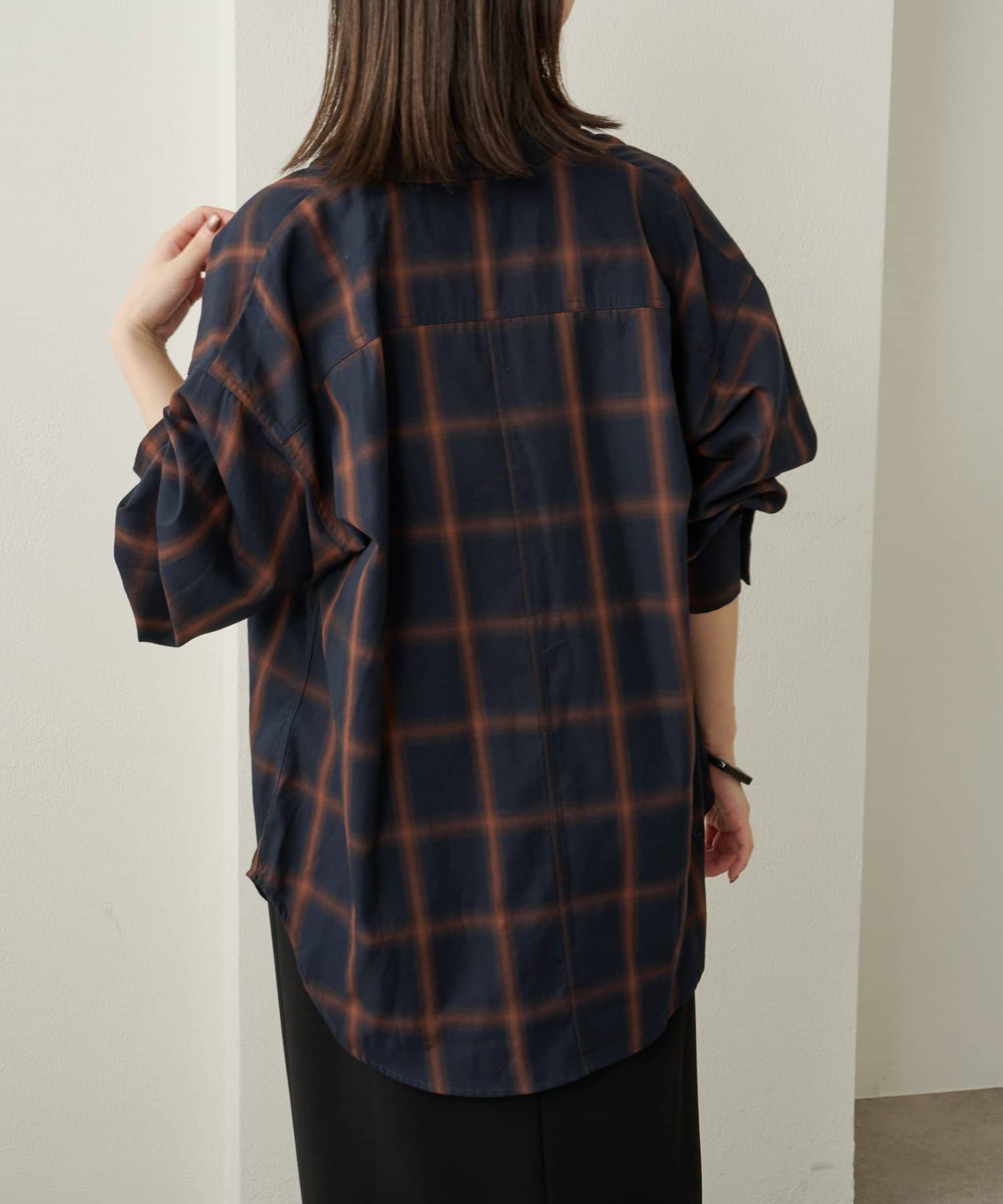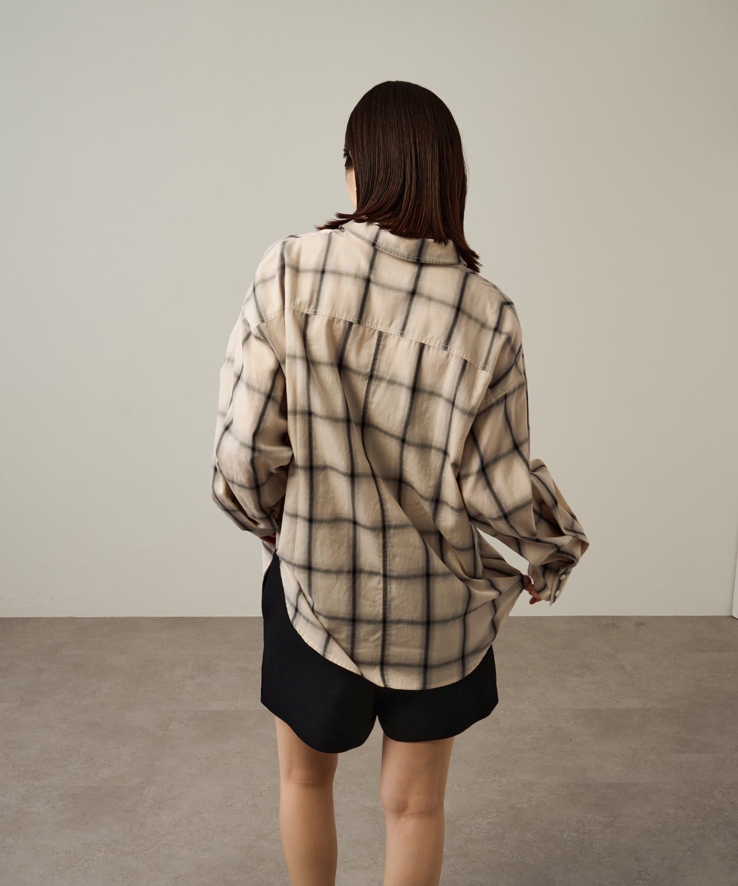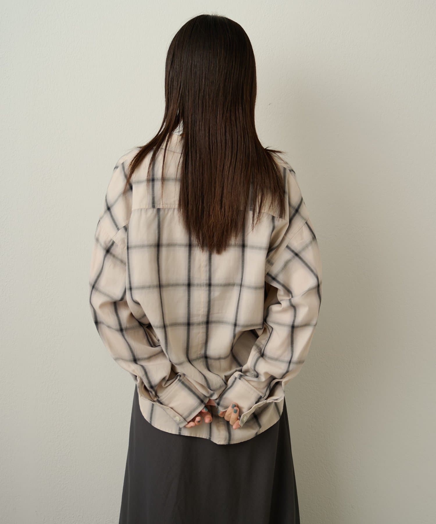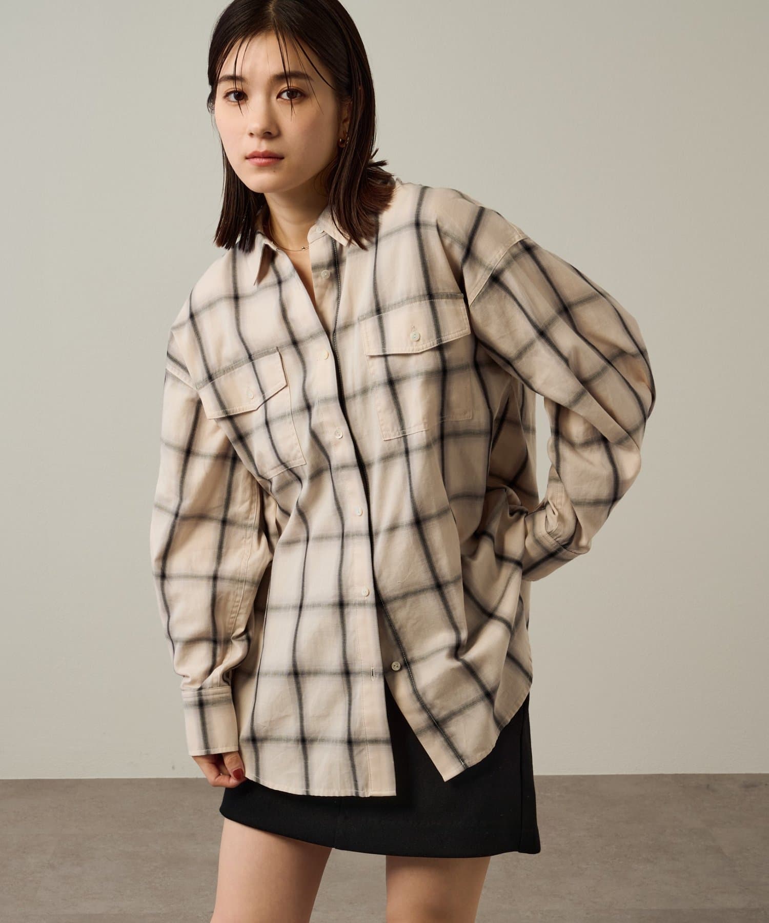 ・ややオーバーシルエットのチェック柄シャツ。