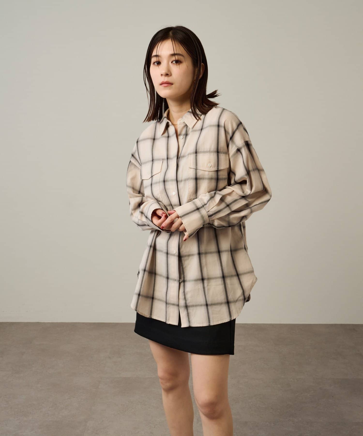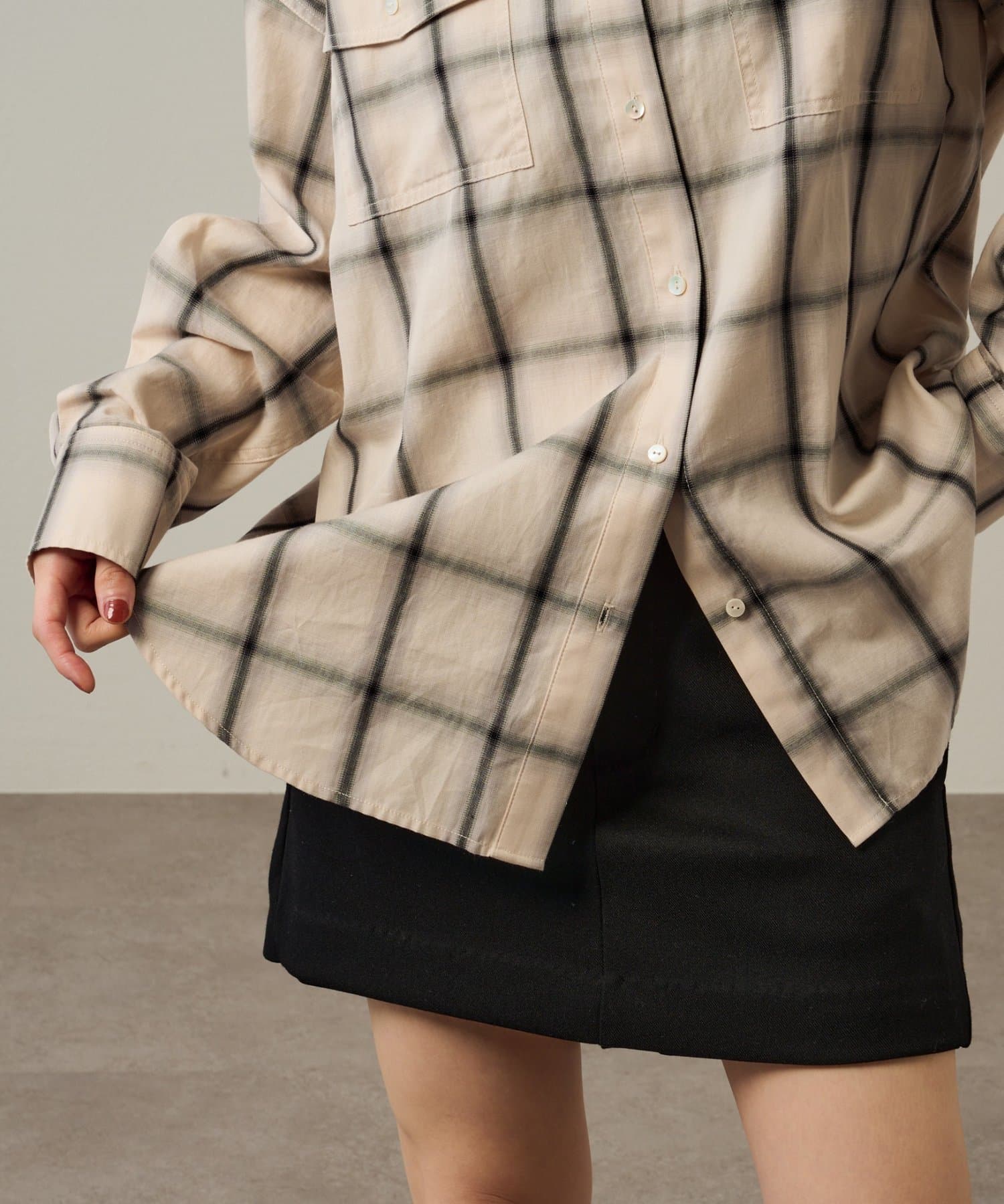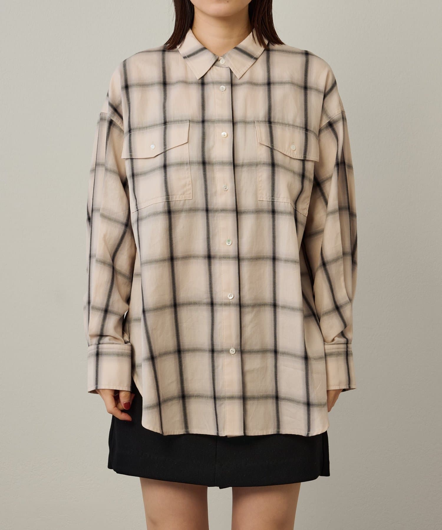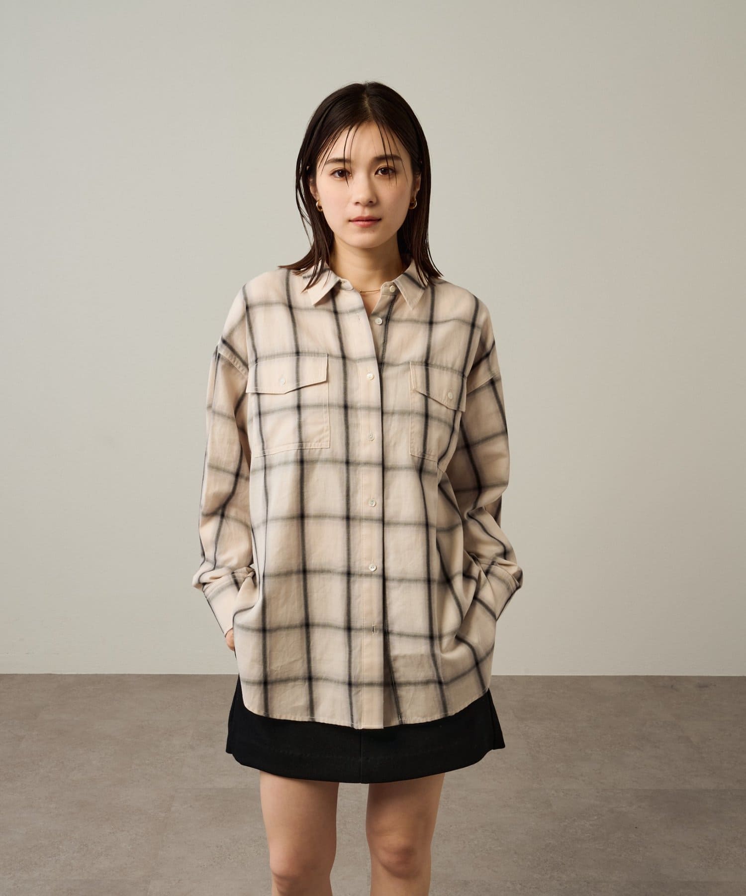 ・ややオーバーシルエットのチェック柄シャツ。