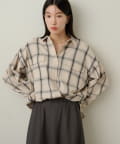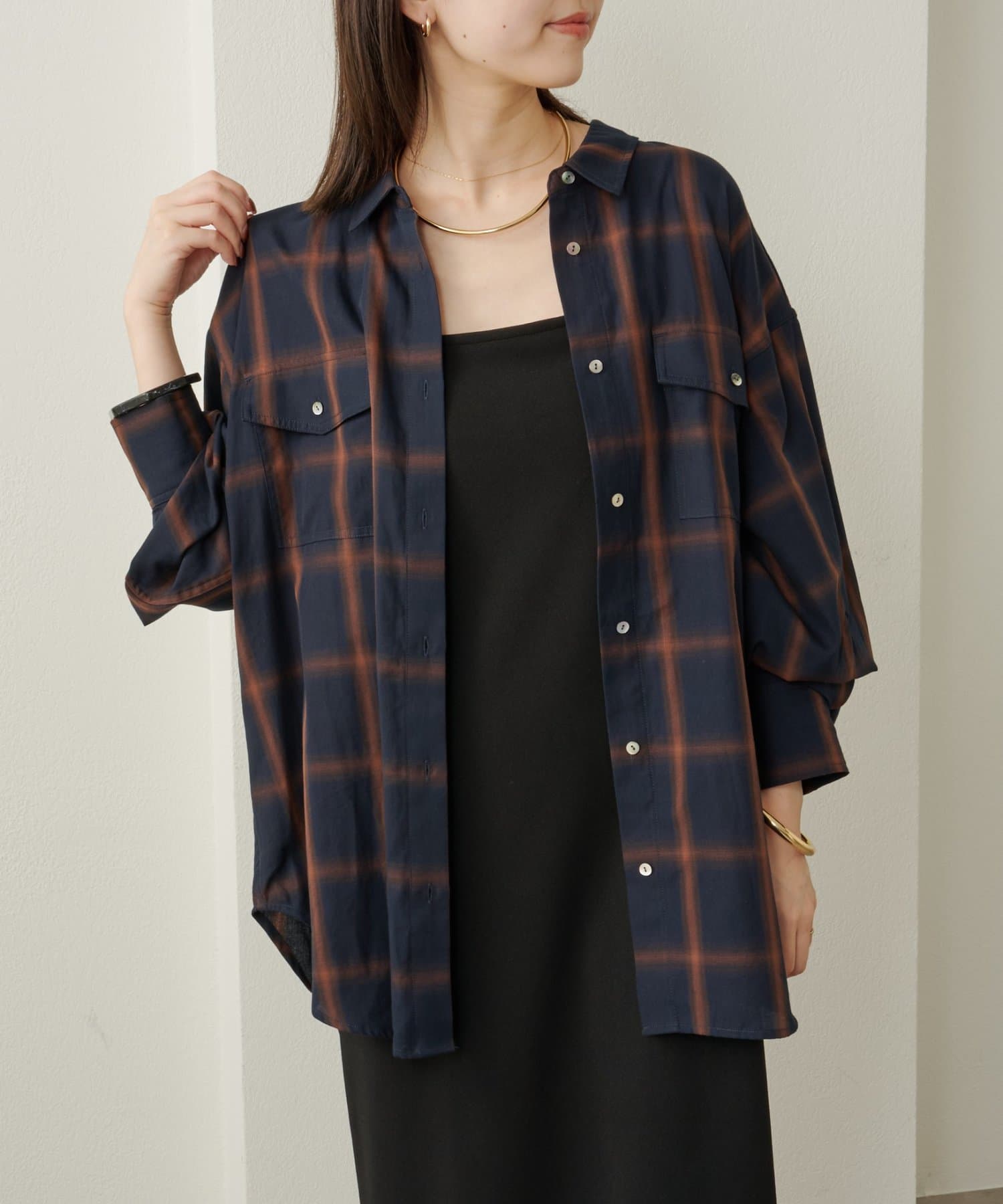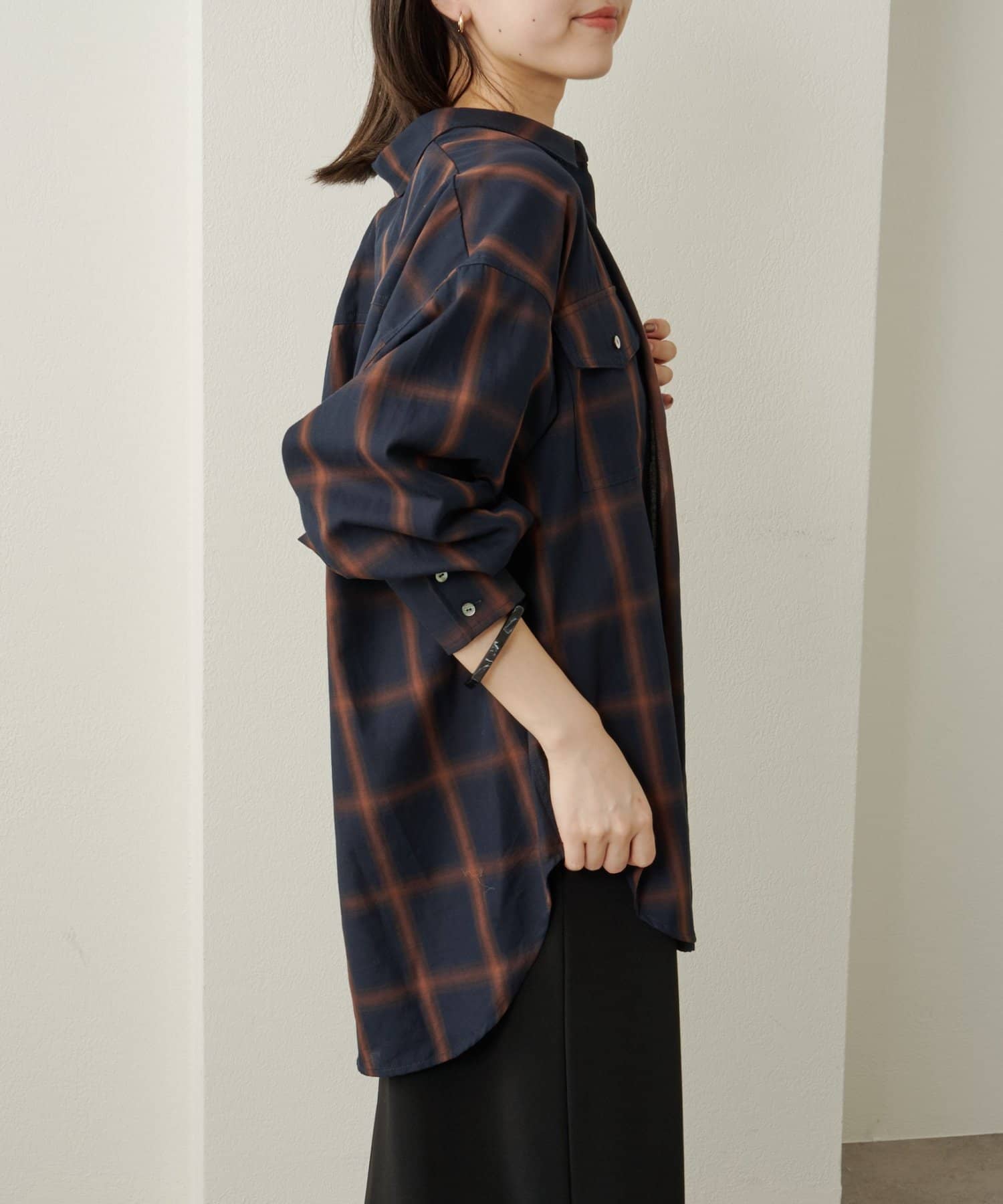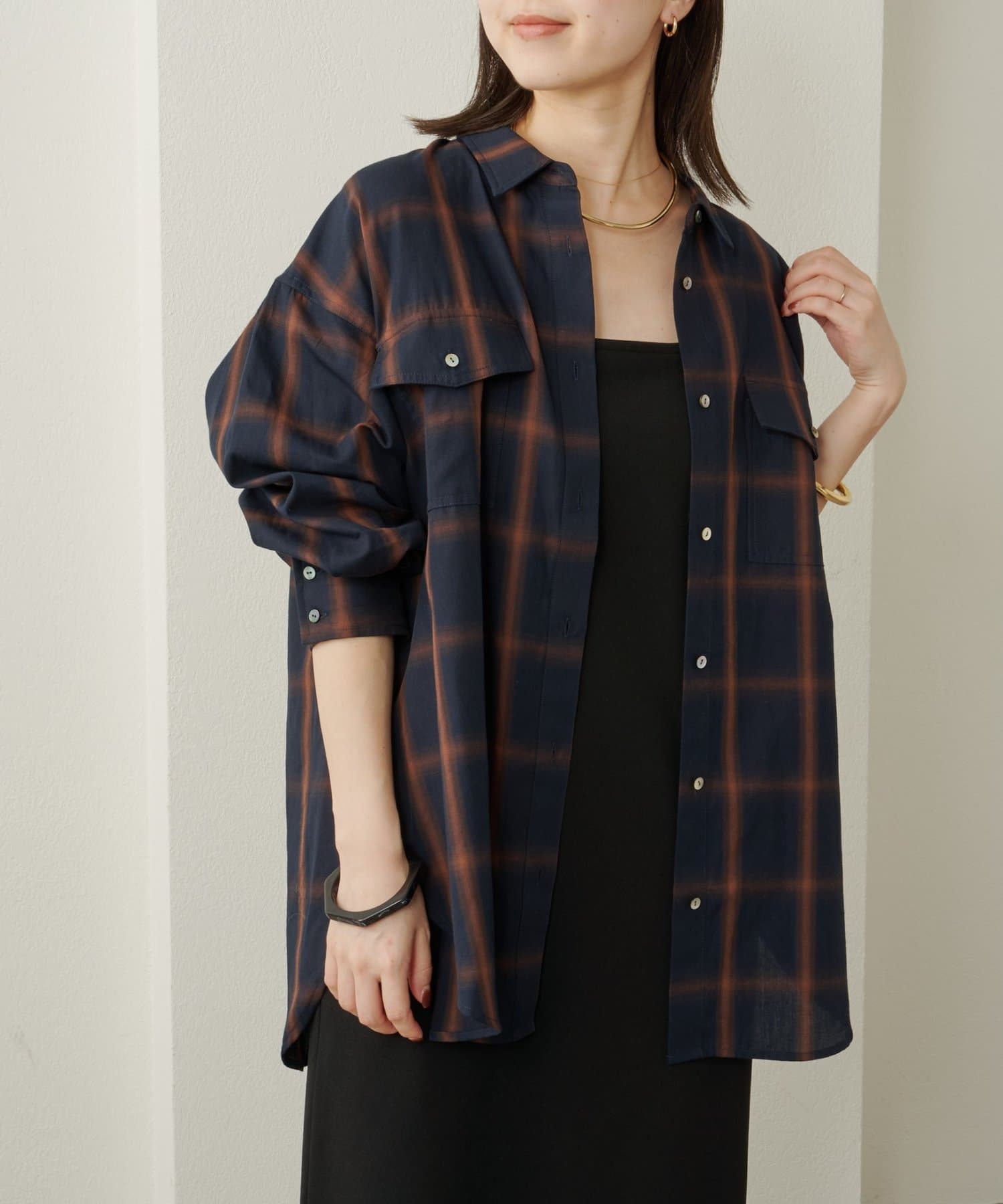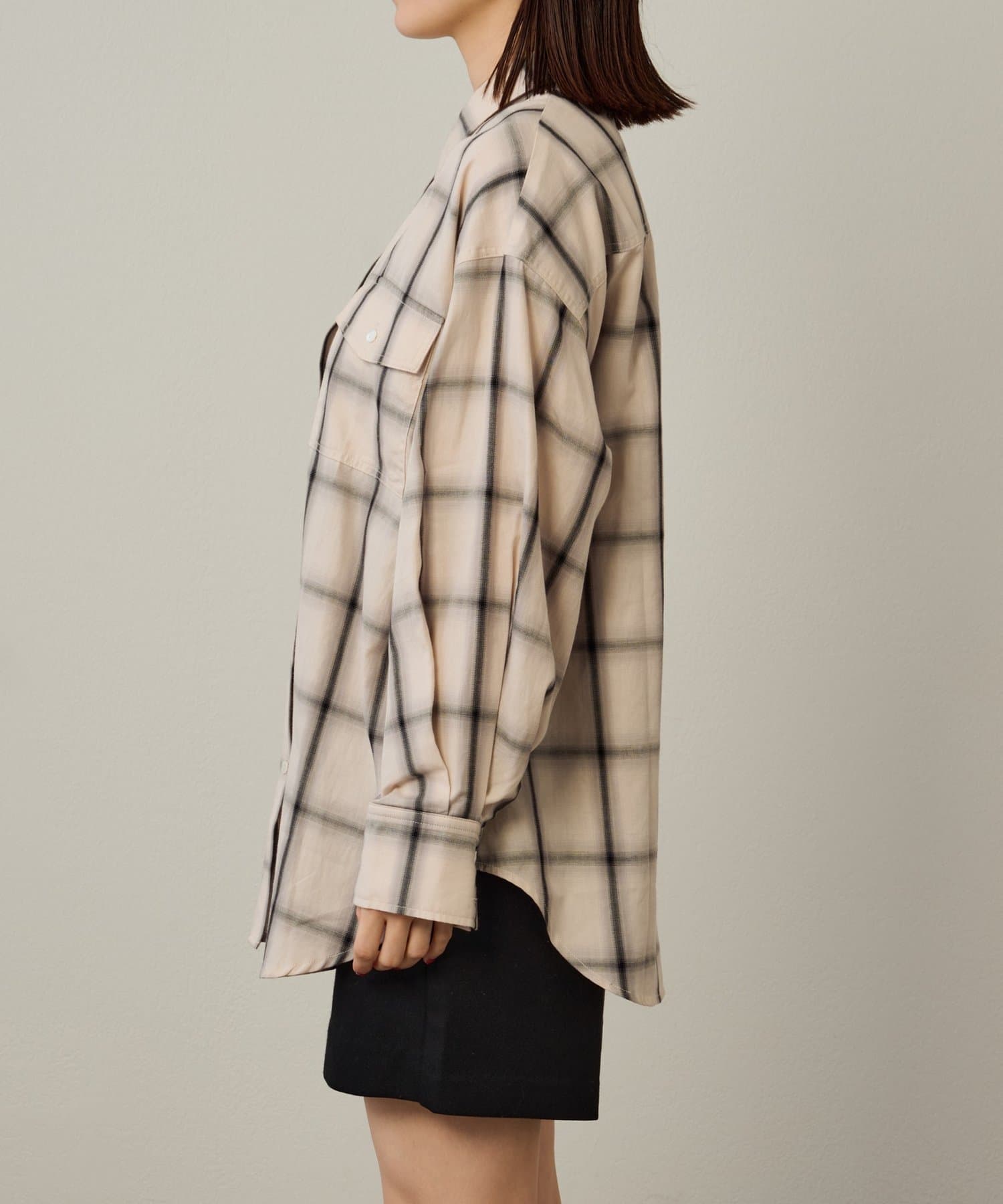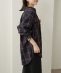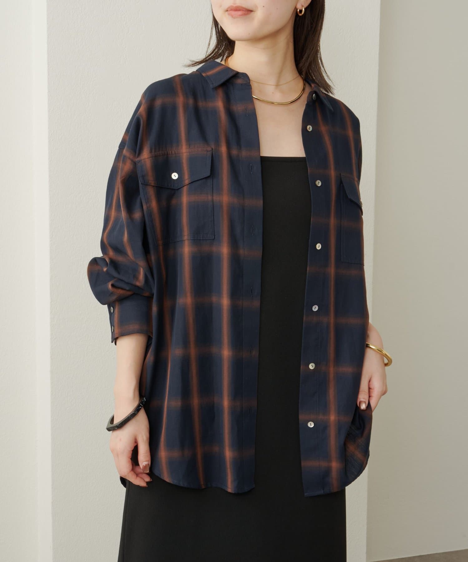 ・ややオーバーシルエットのチェック柄シャツ。