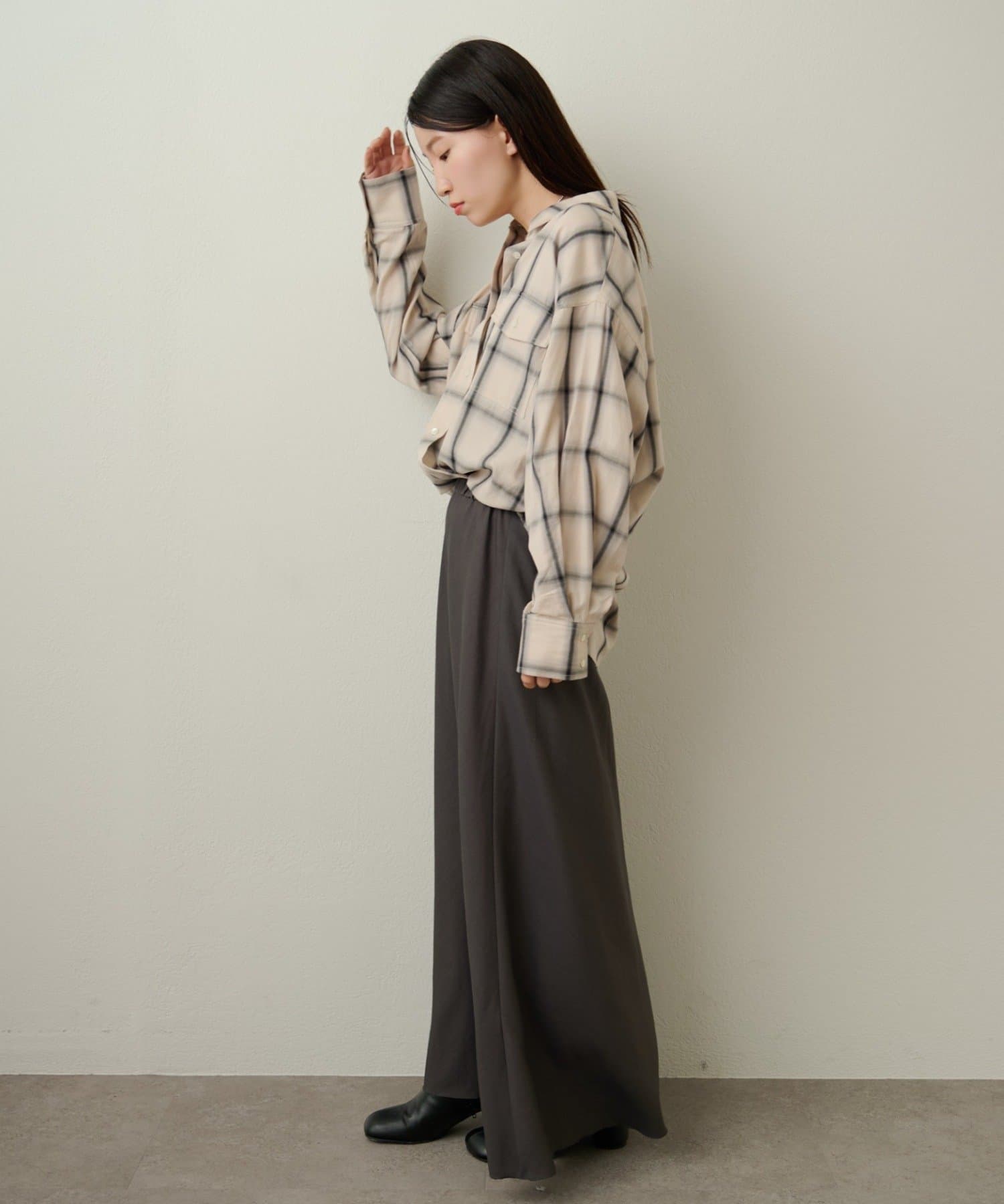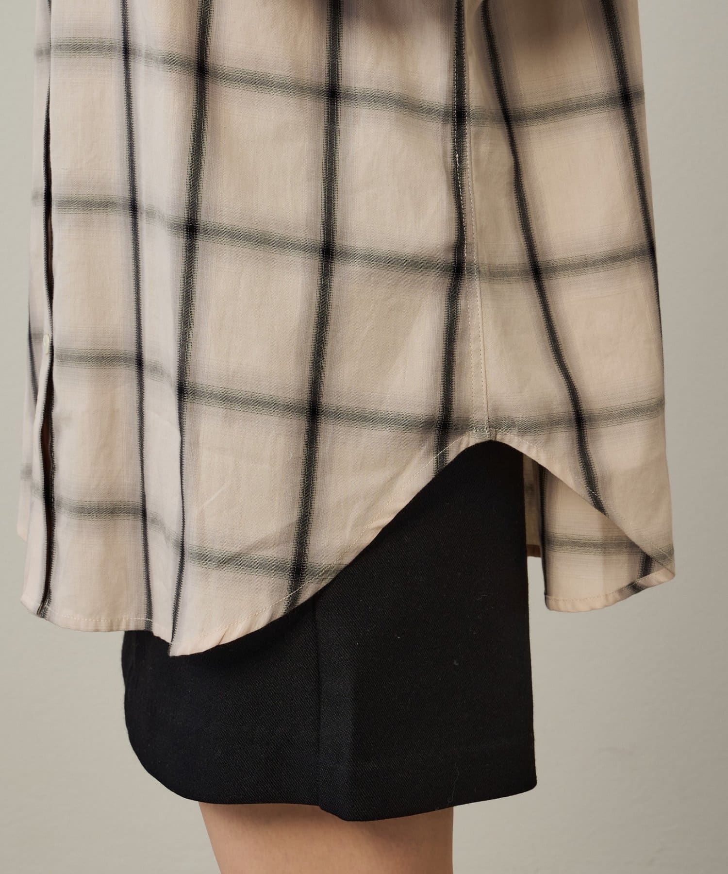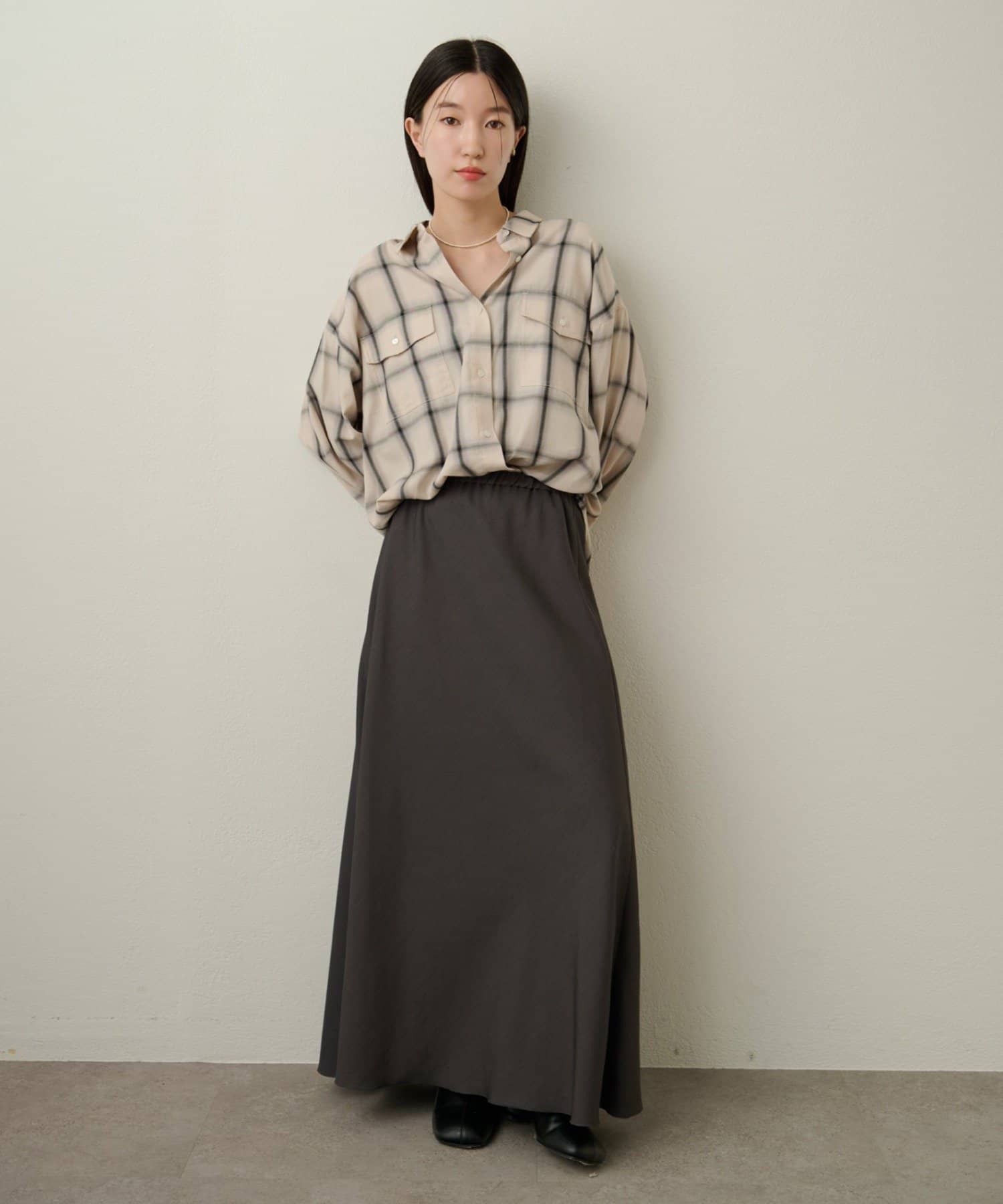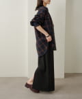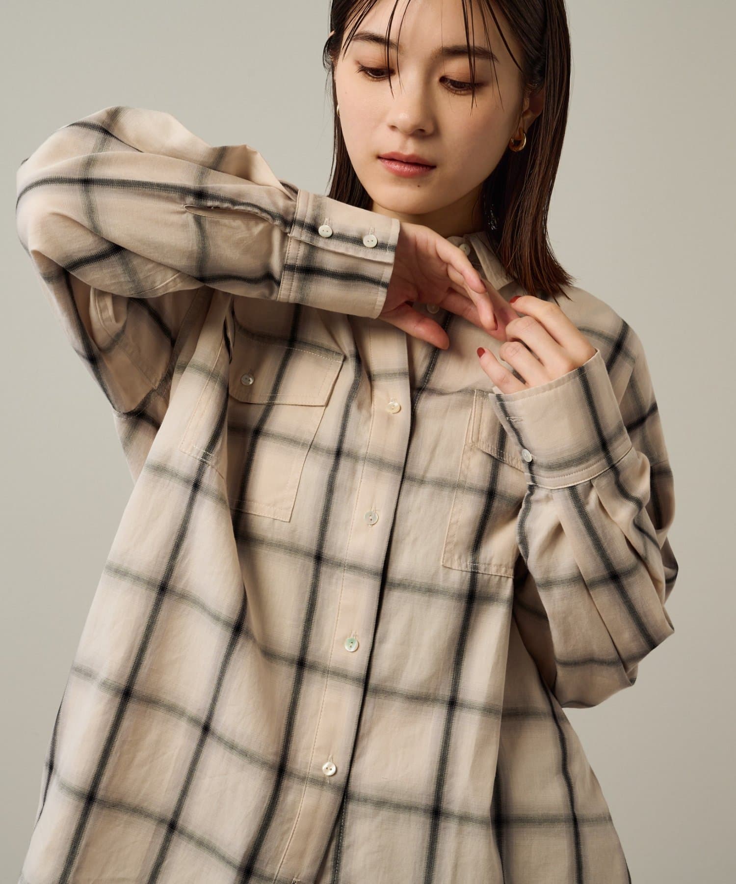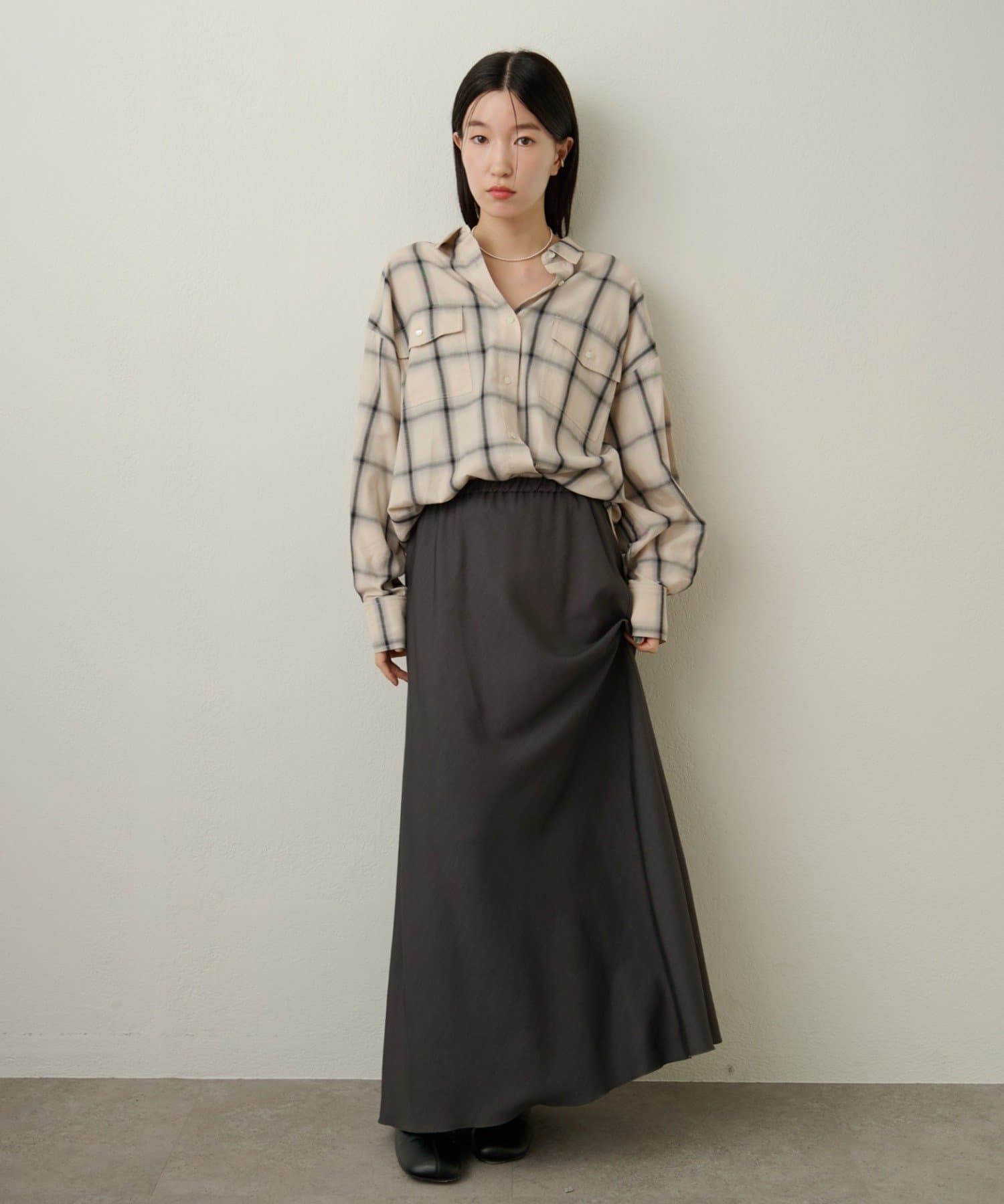 ・ややオーバーシルエットのチェック柄シャツ。