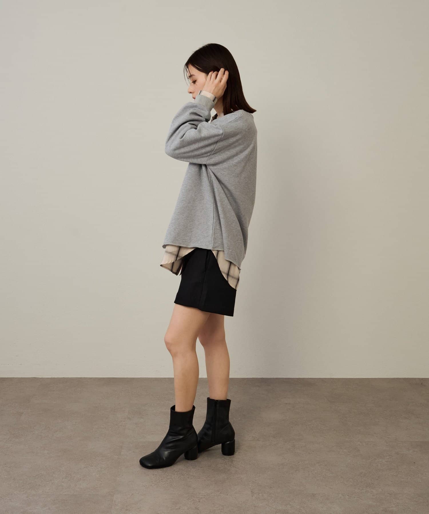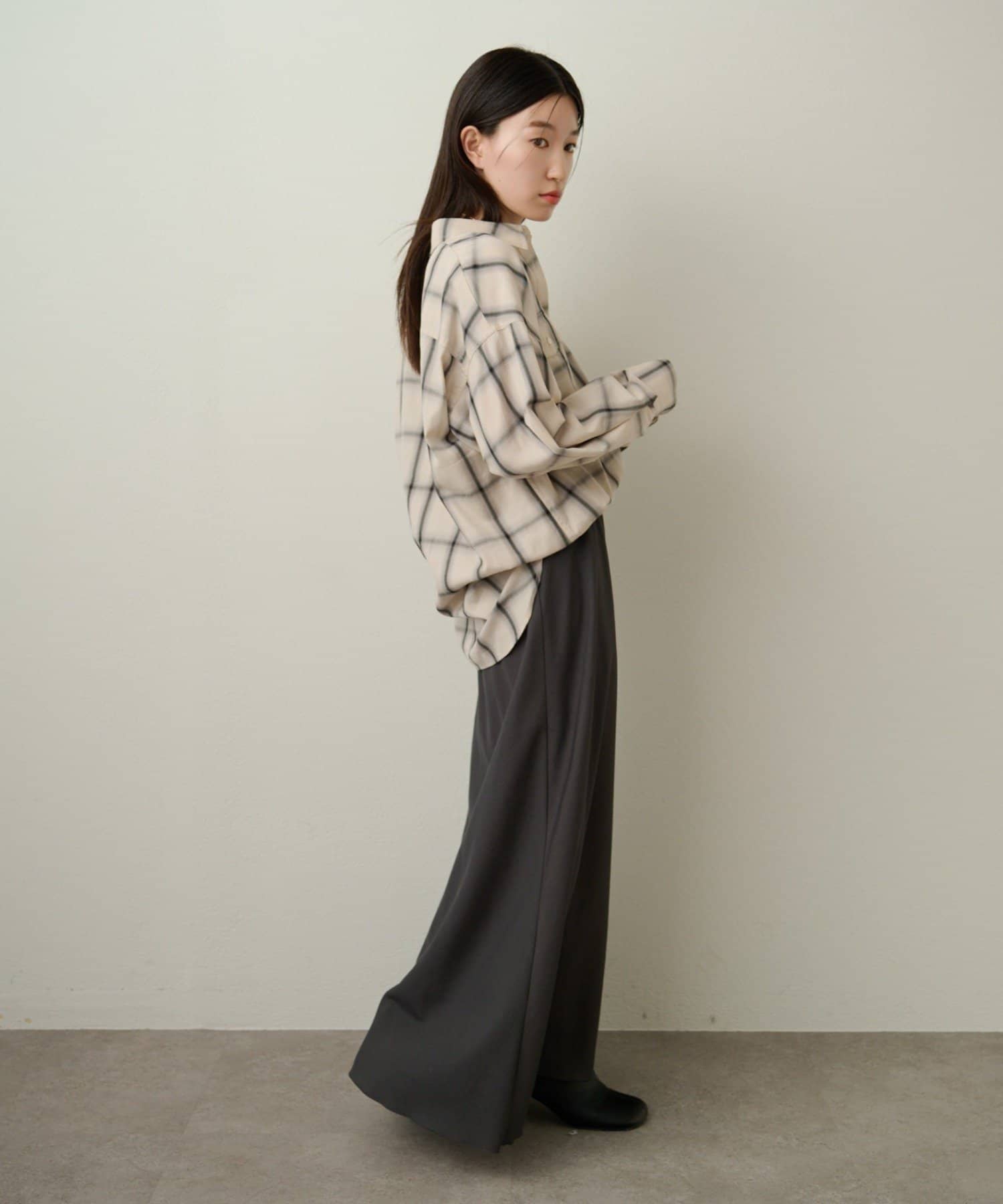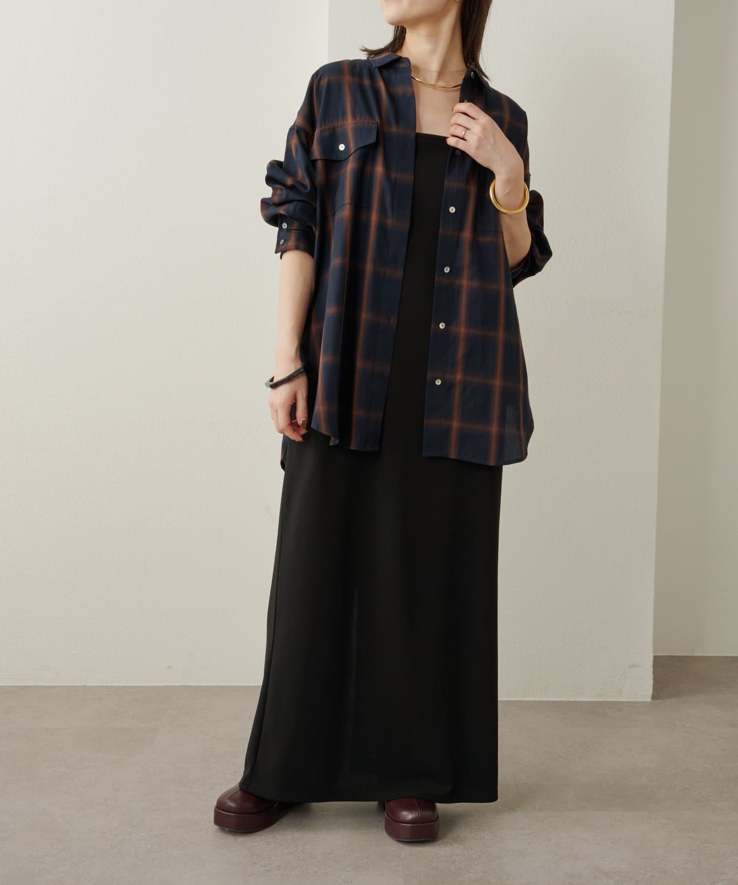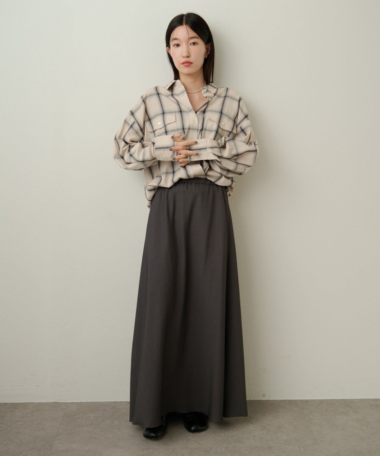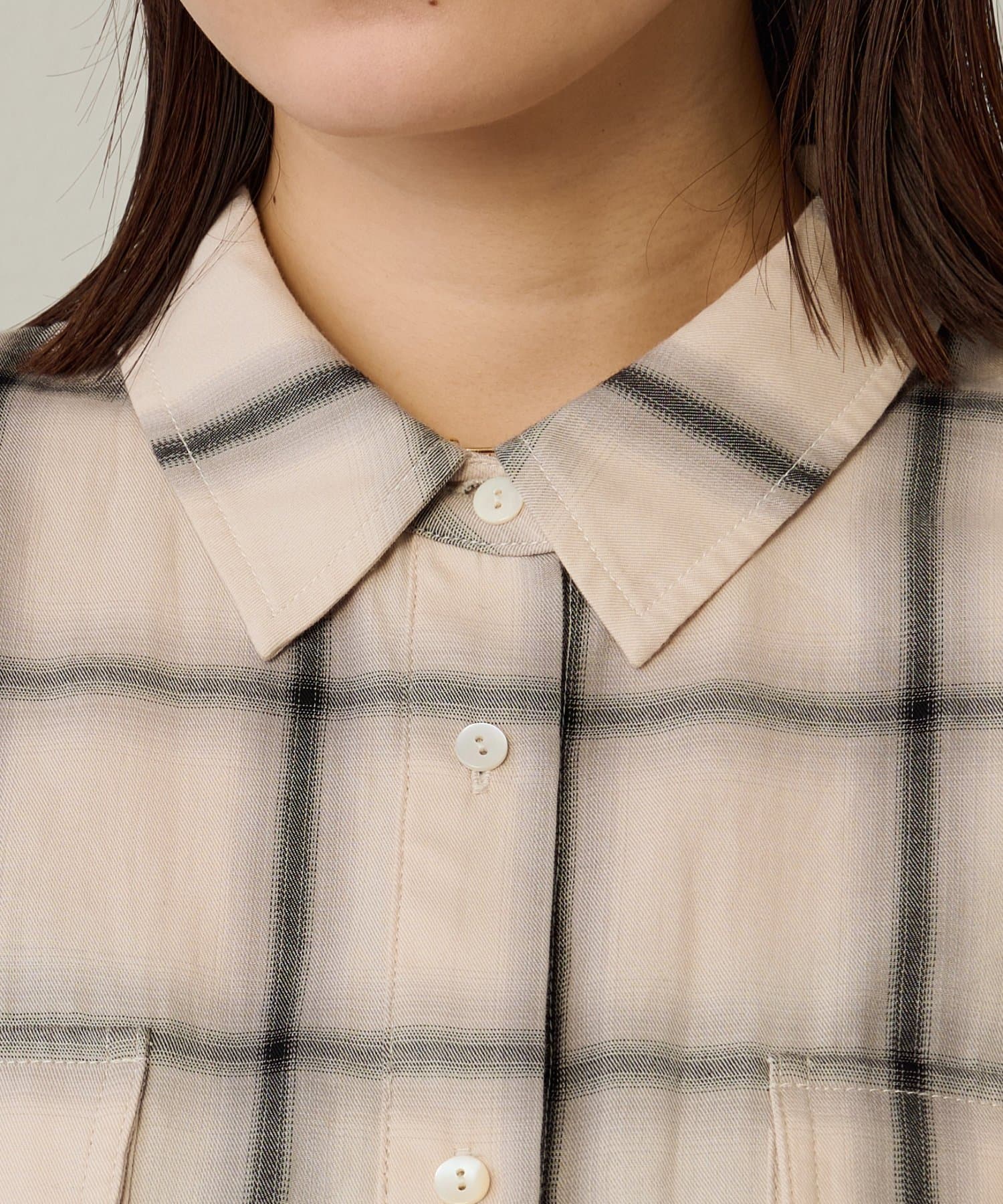 ・ややオーバーシルエットのチェック柄シャツ。