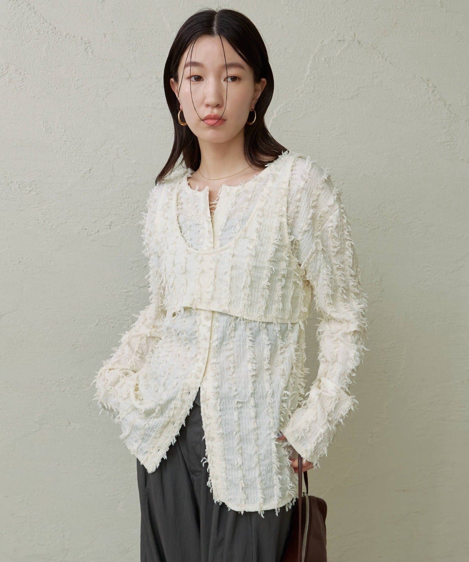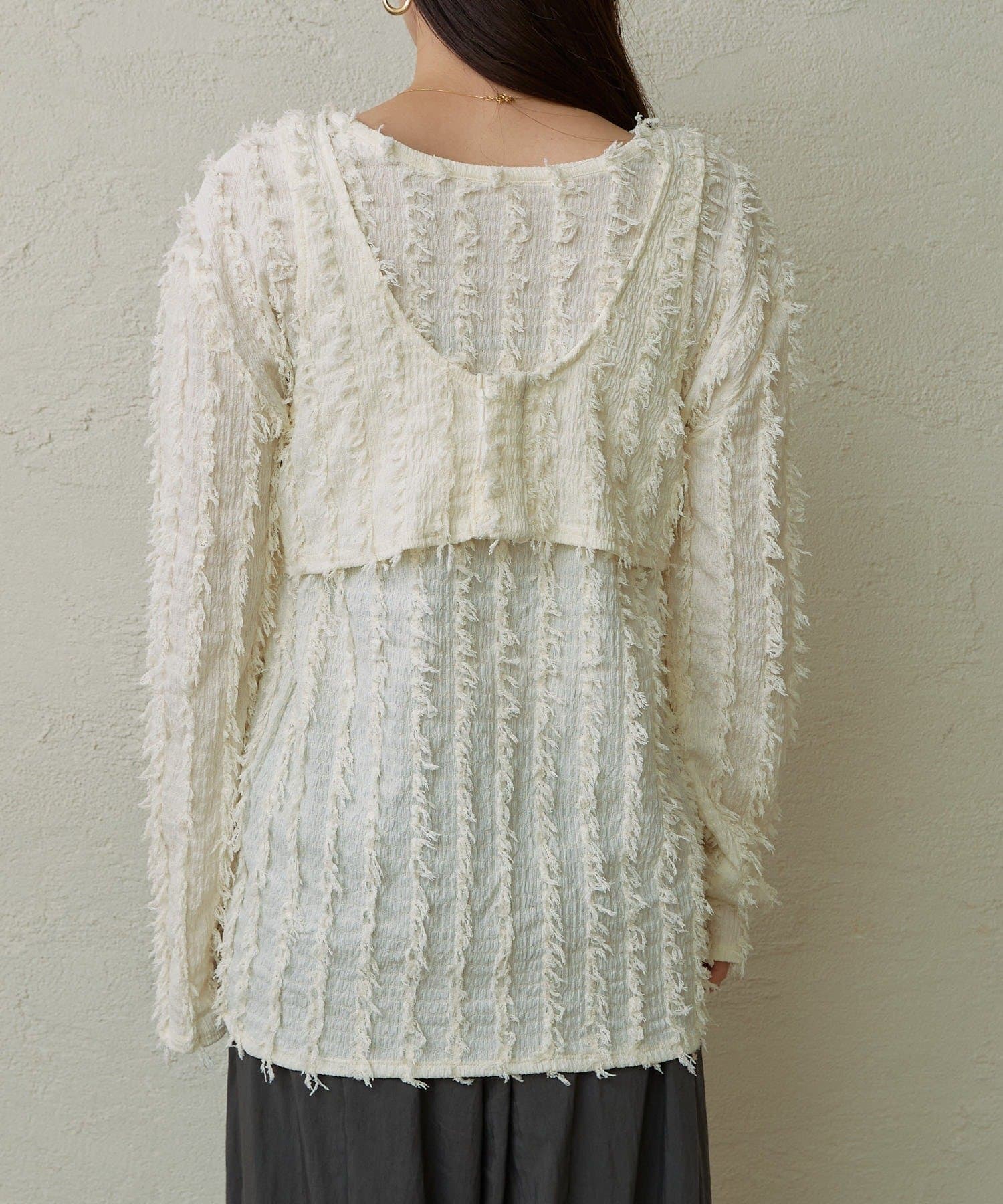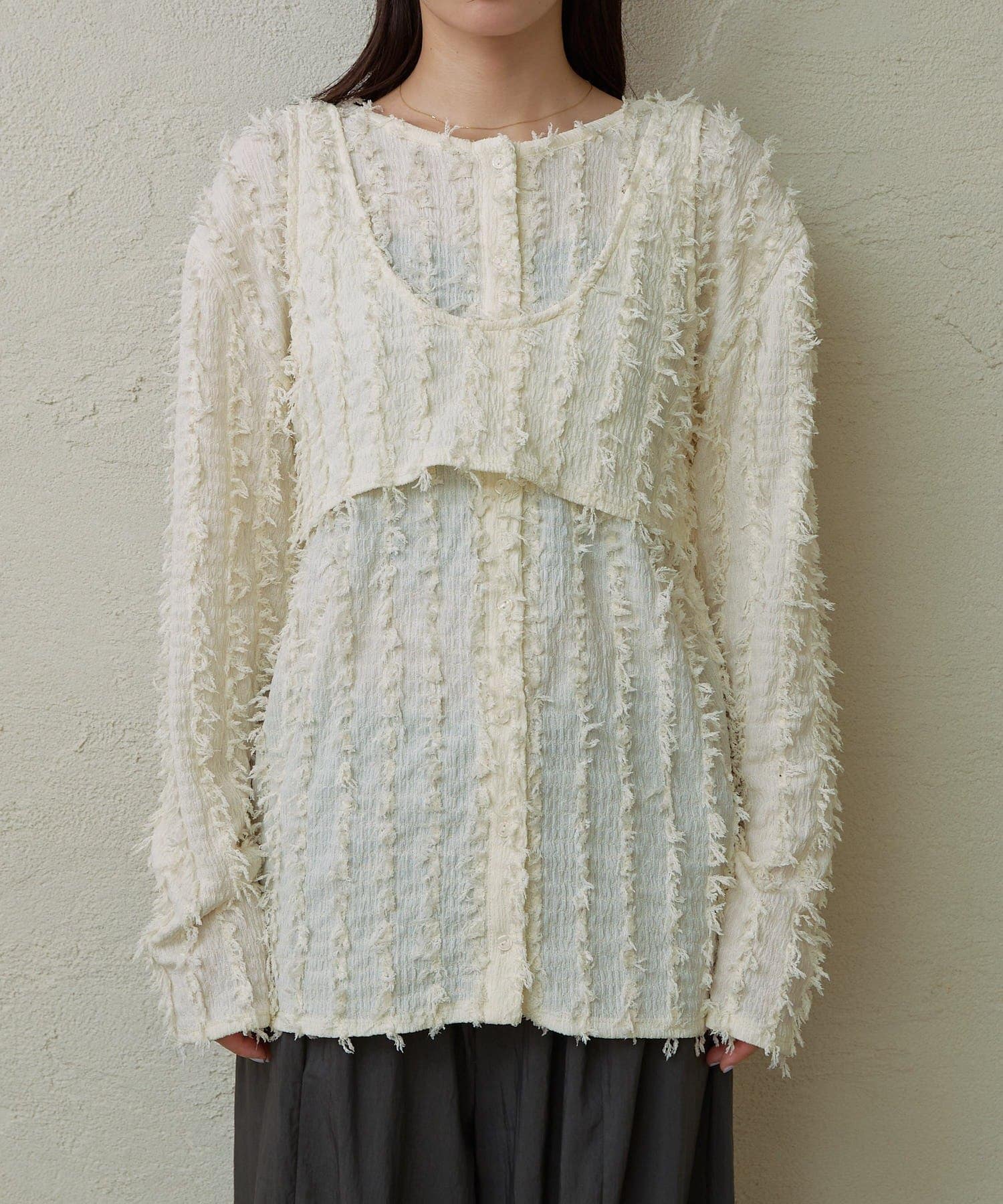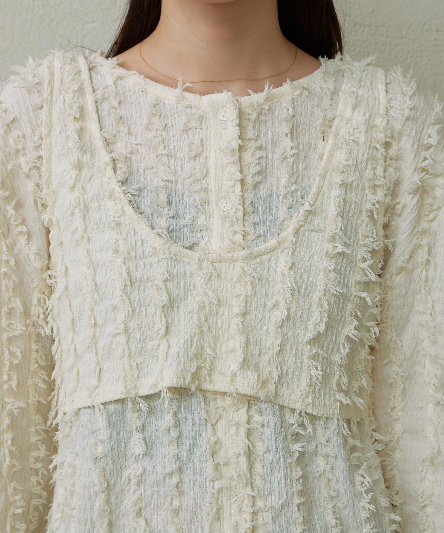 ・フリンジ素材のカーディガンにビスチェがセットになったアイテム。