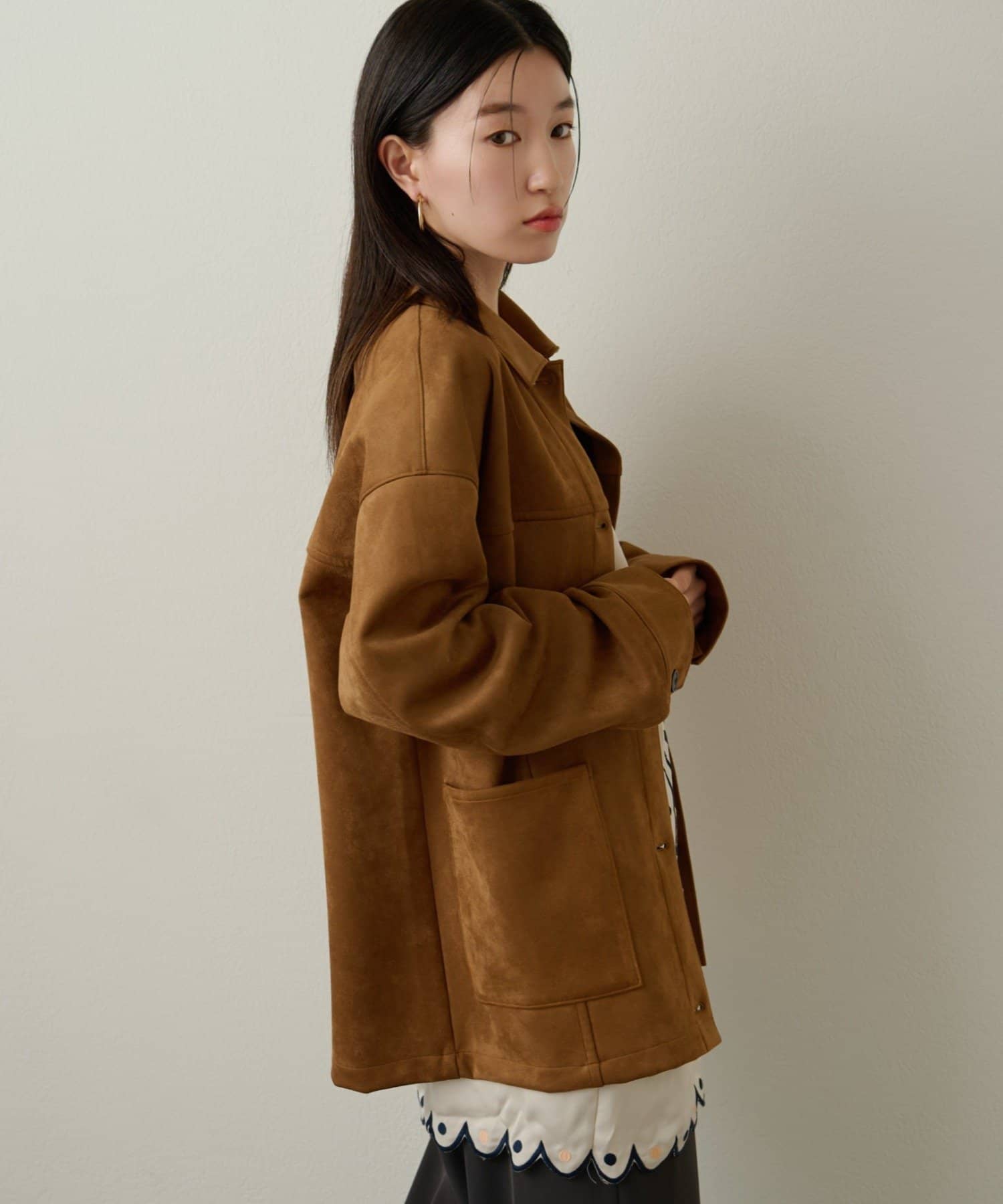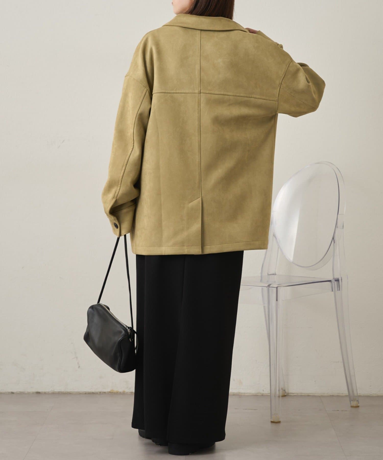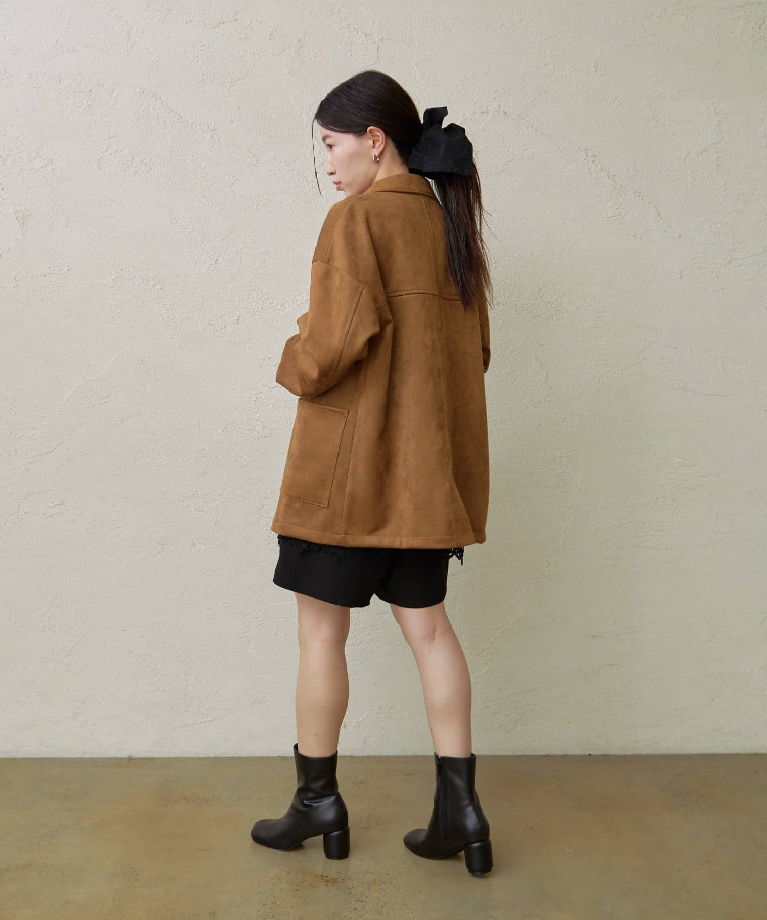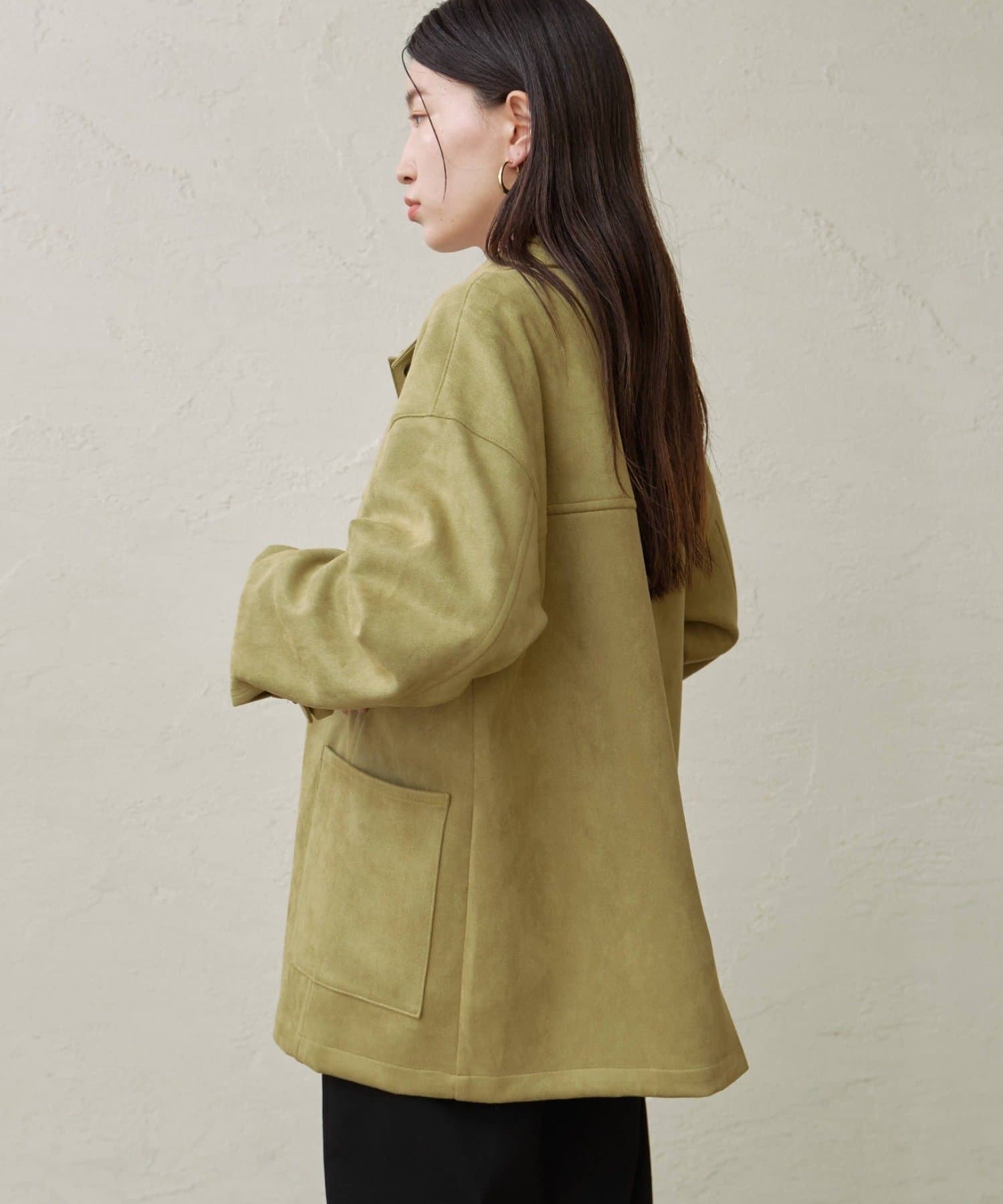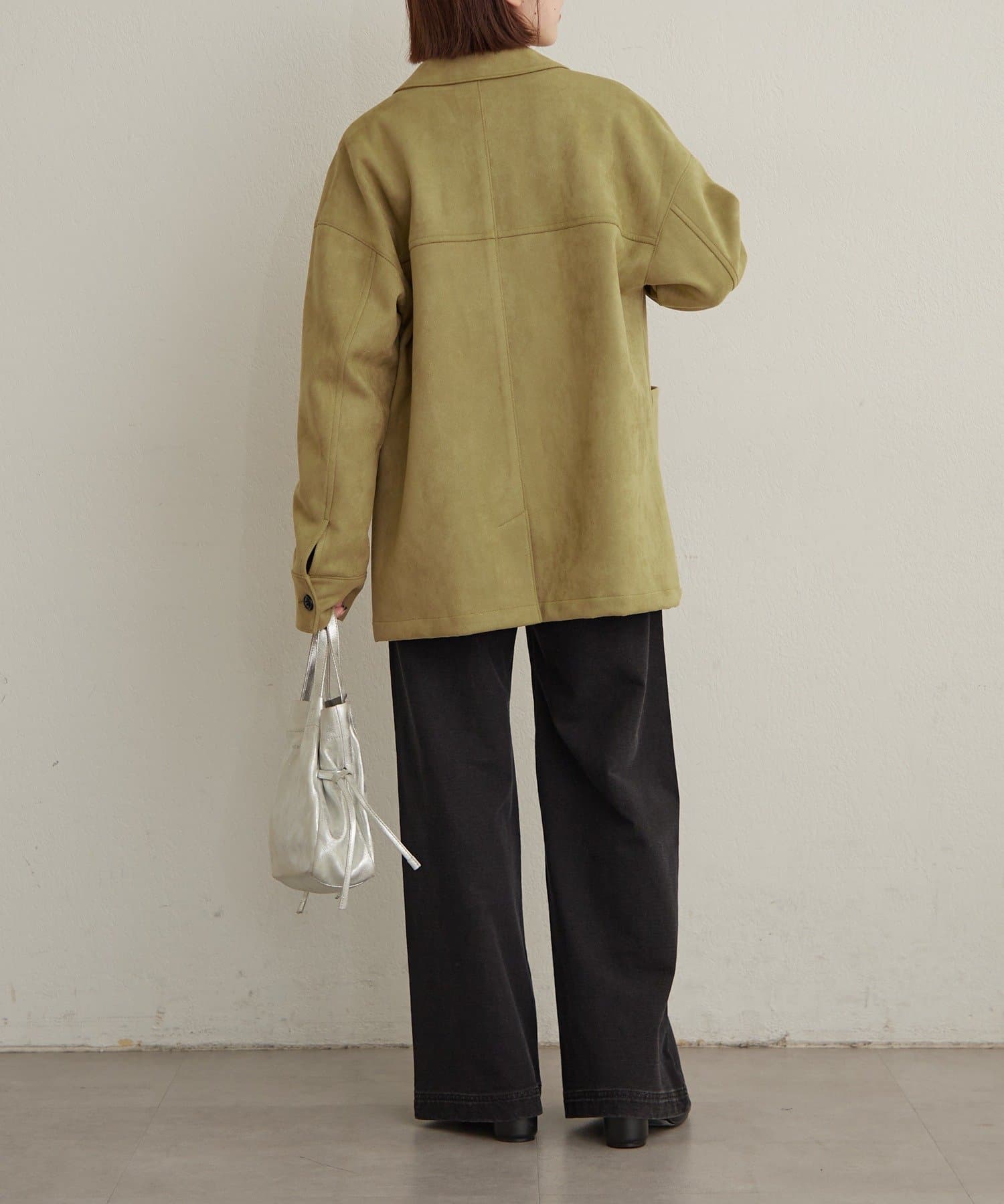 ・トレンドのスエード素材で、羽織るだけで秋らしい雰囲気のジャケット。