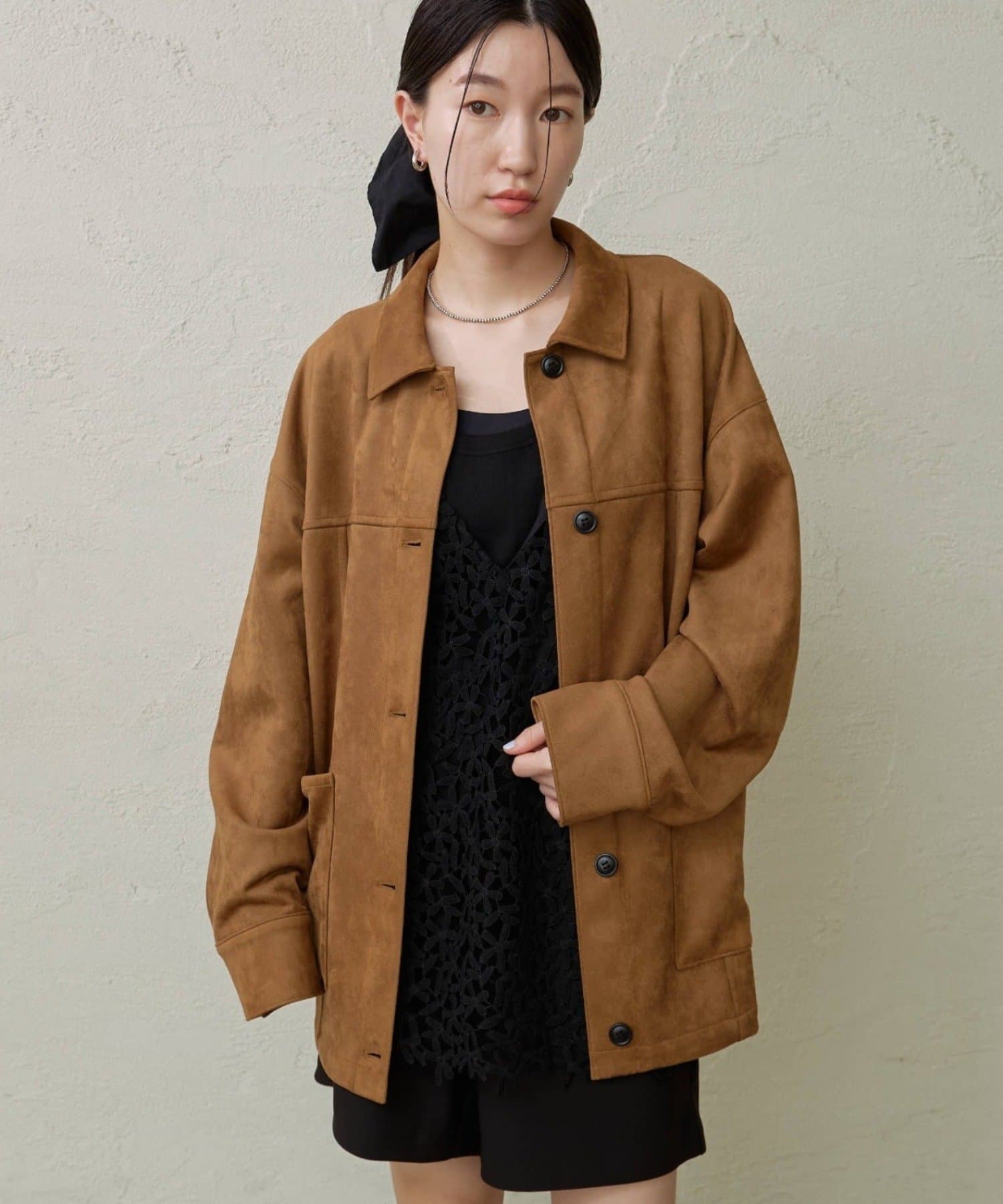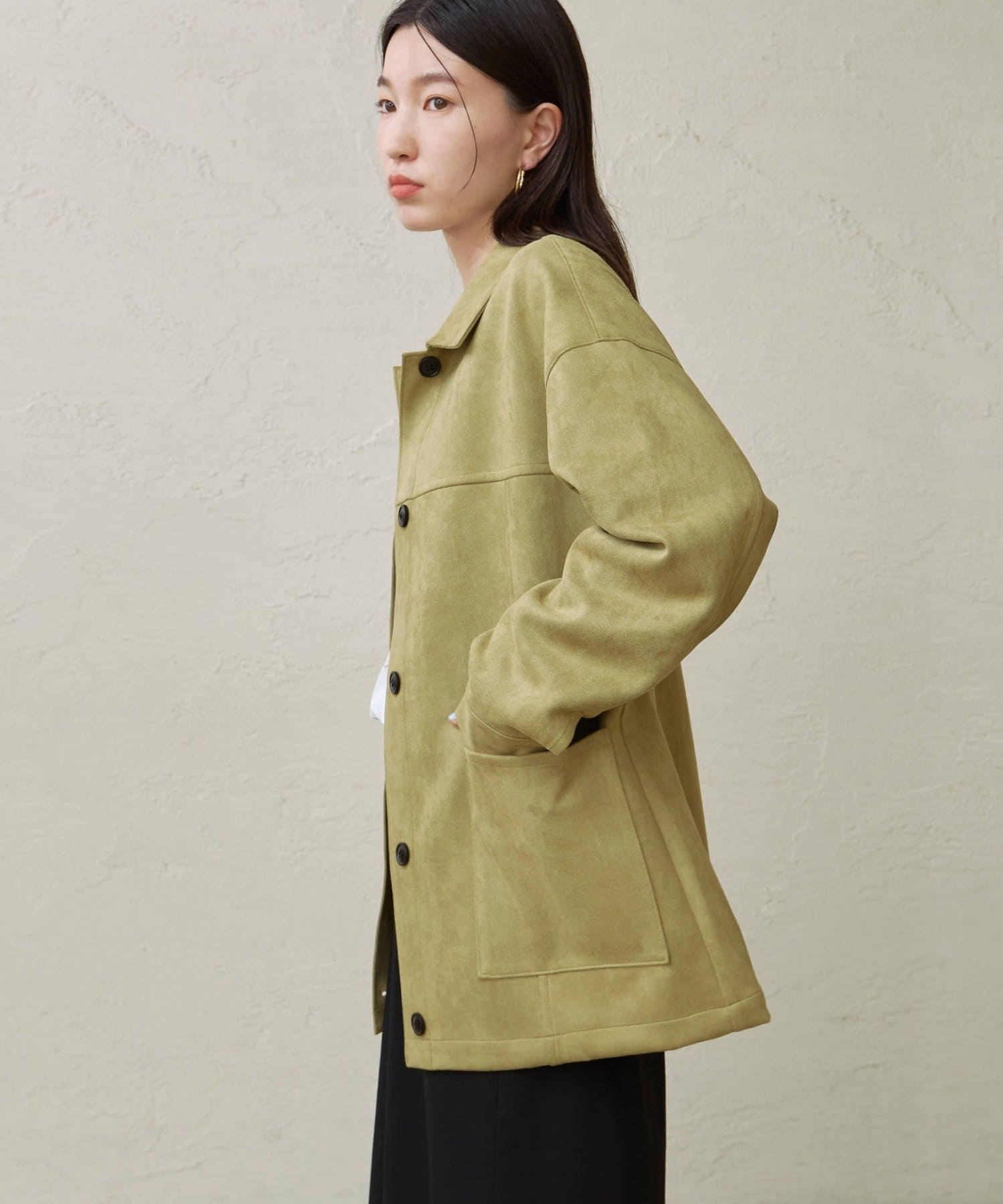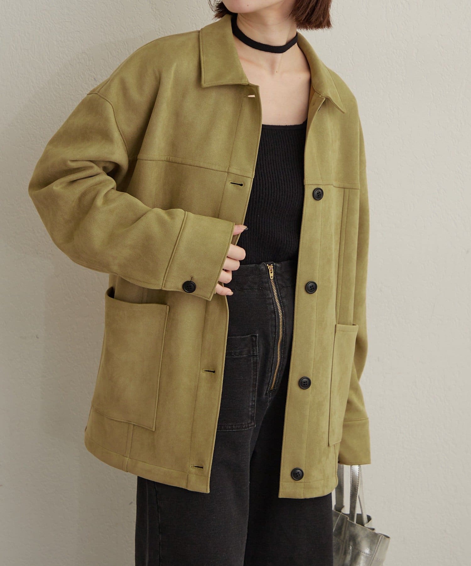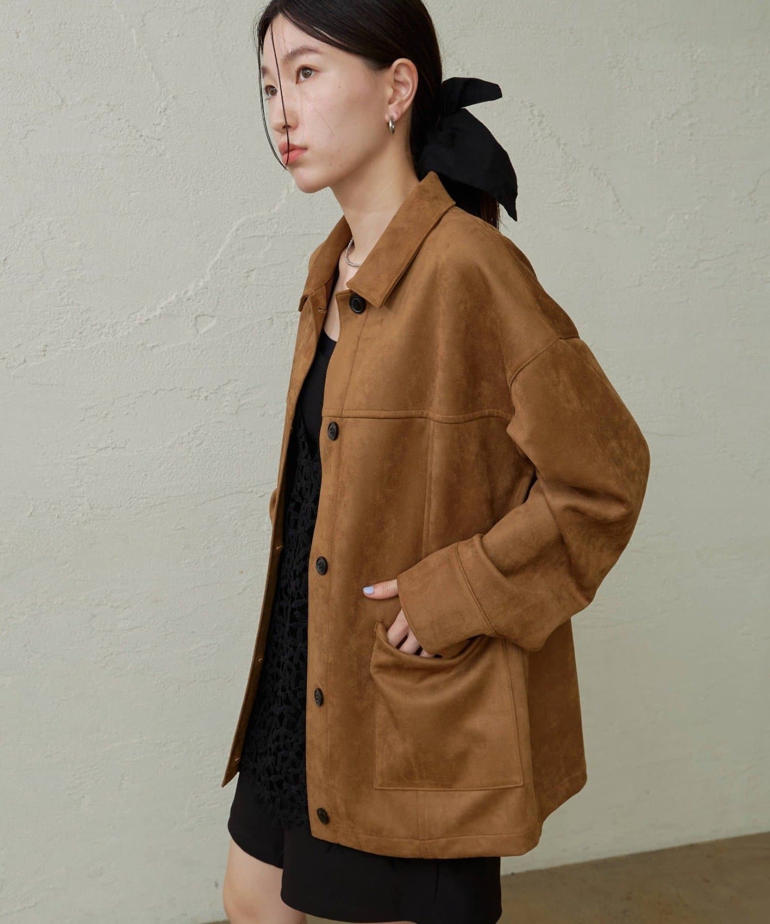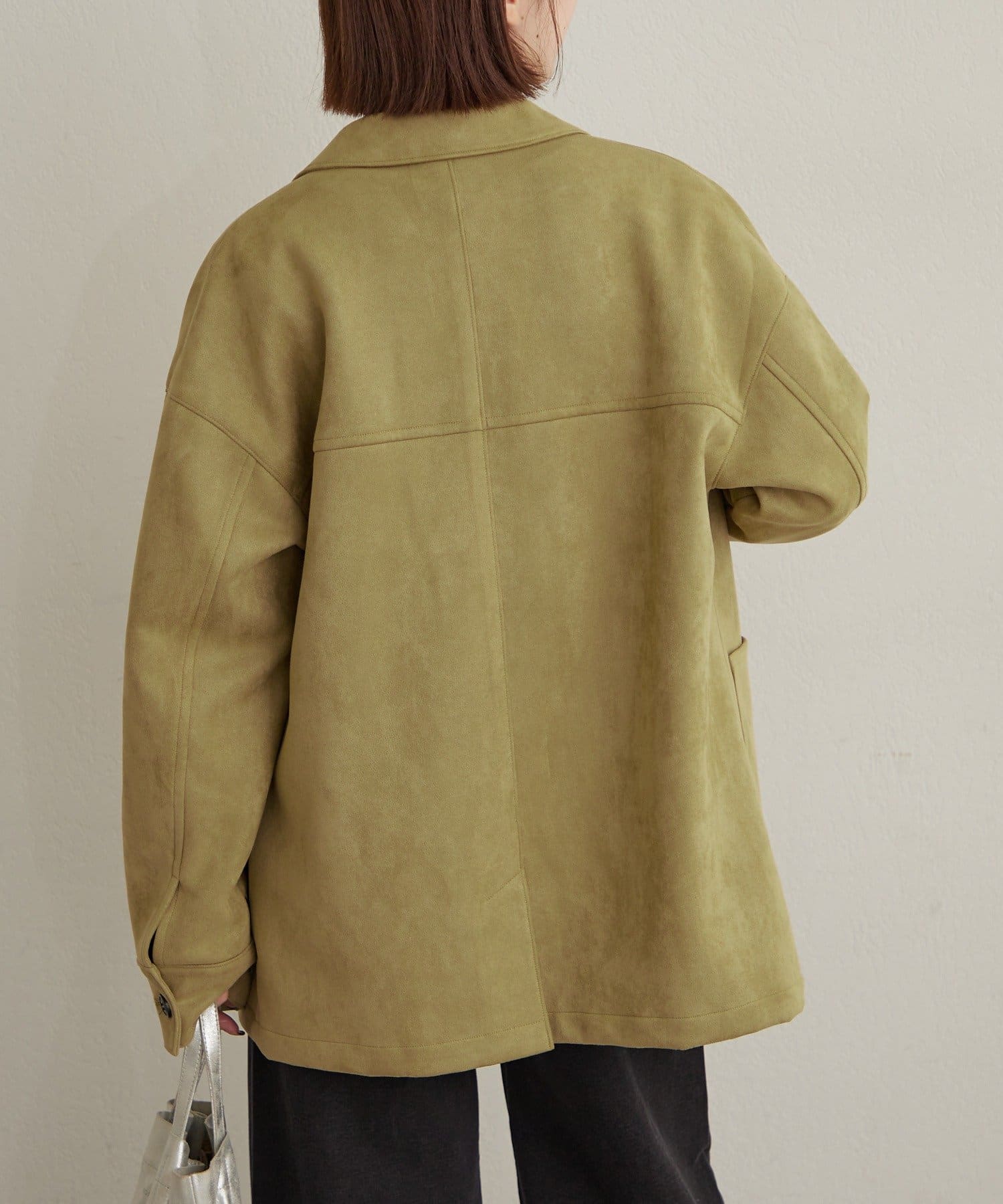 ・トレンドのスエード素材で、羽織るだけで秋らしい雰囲気のジャケット。
