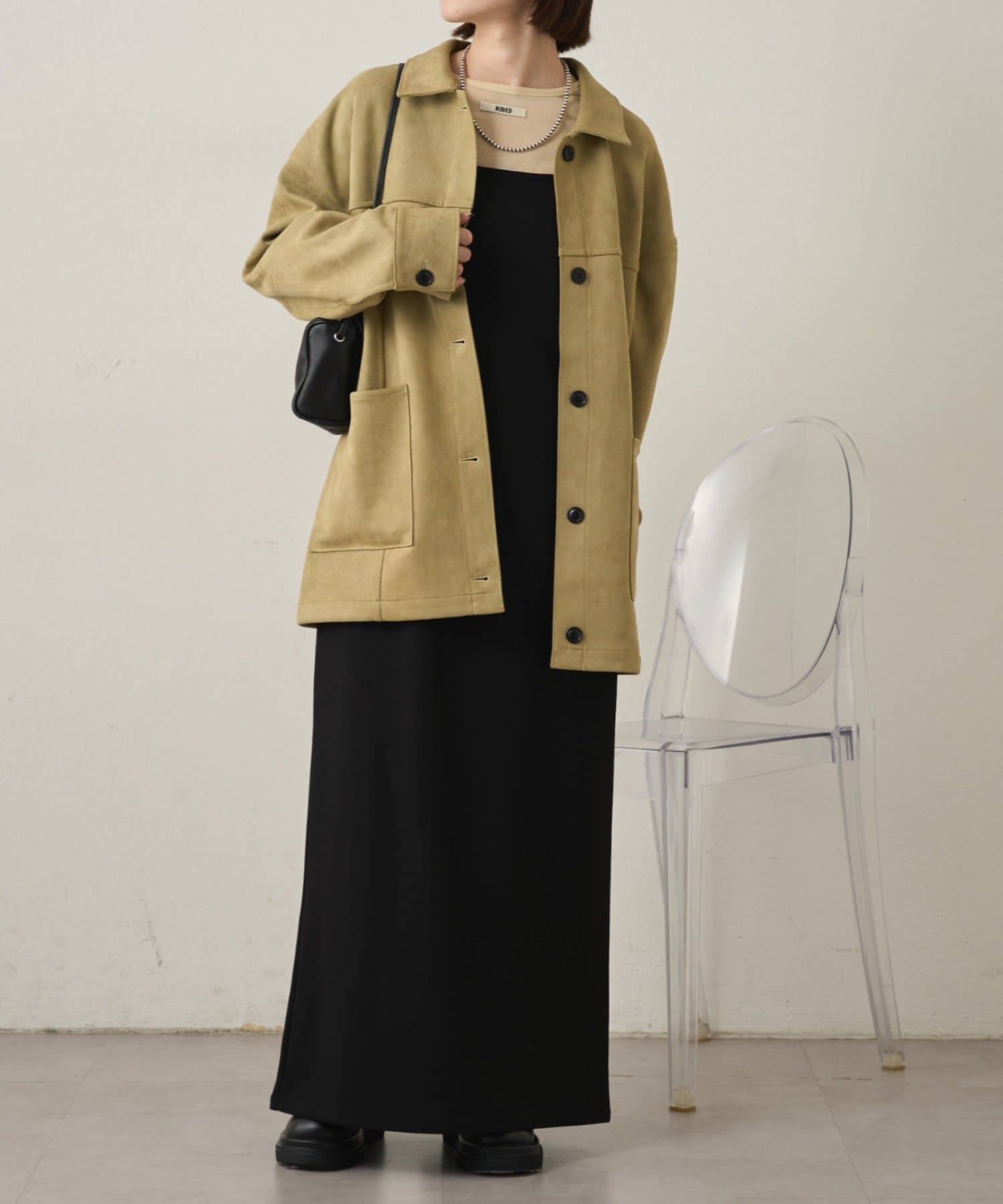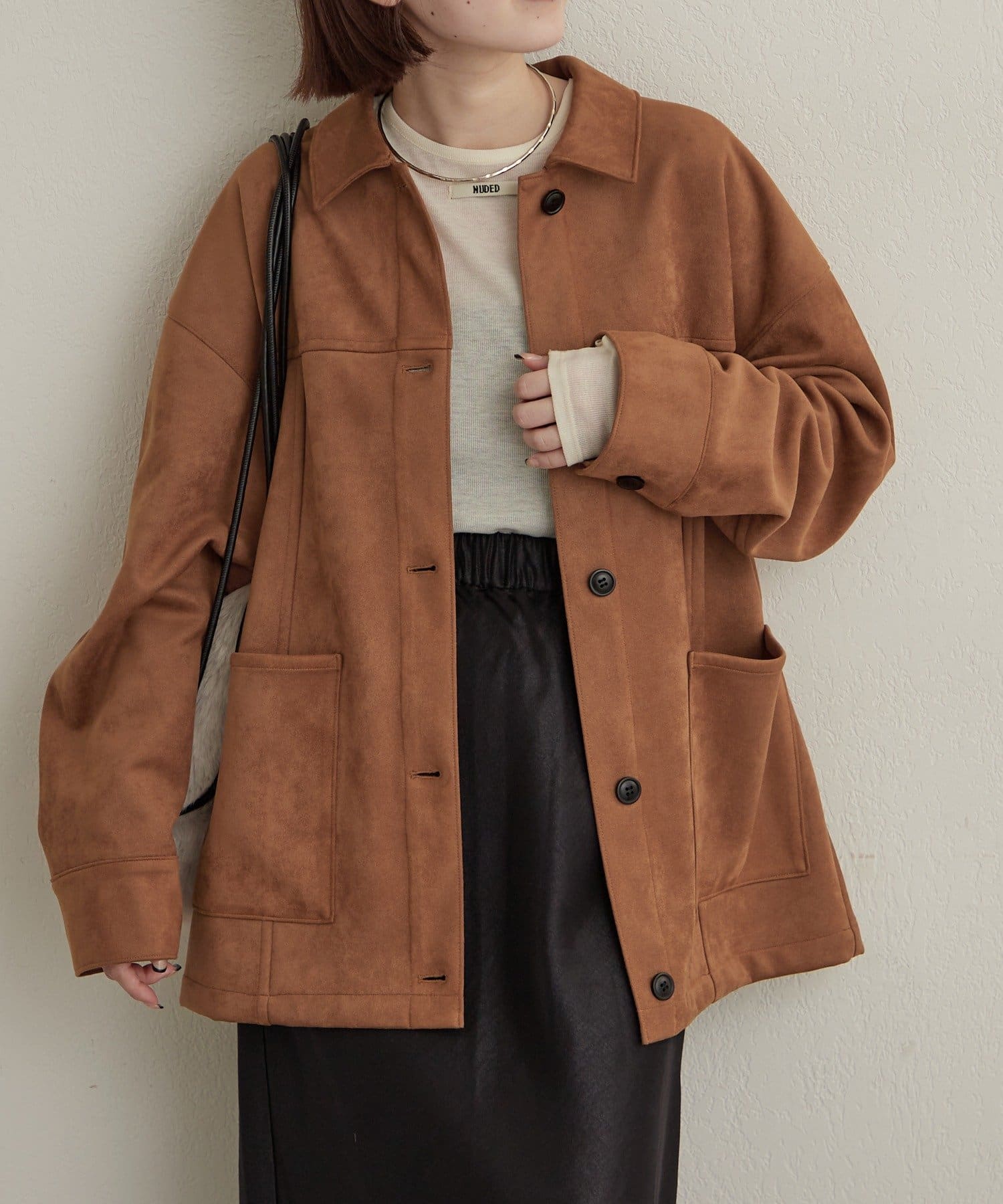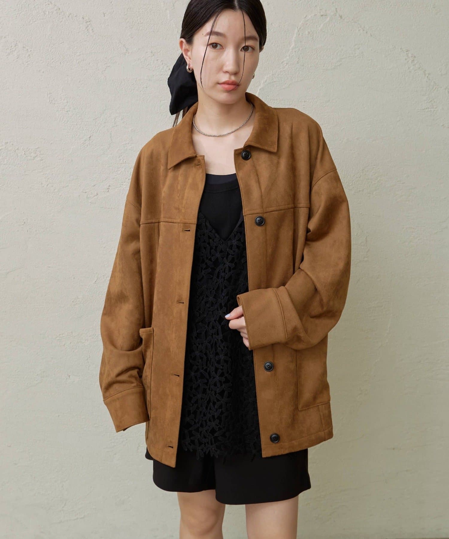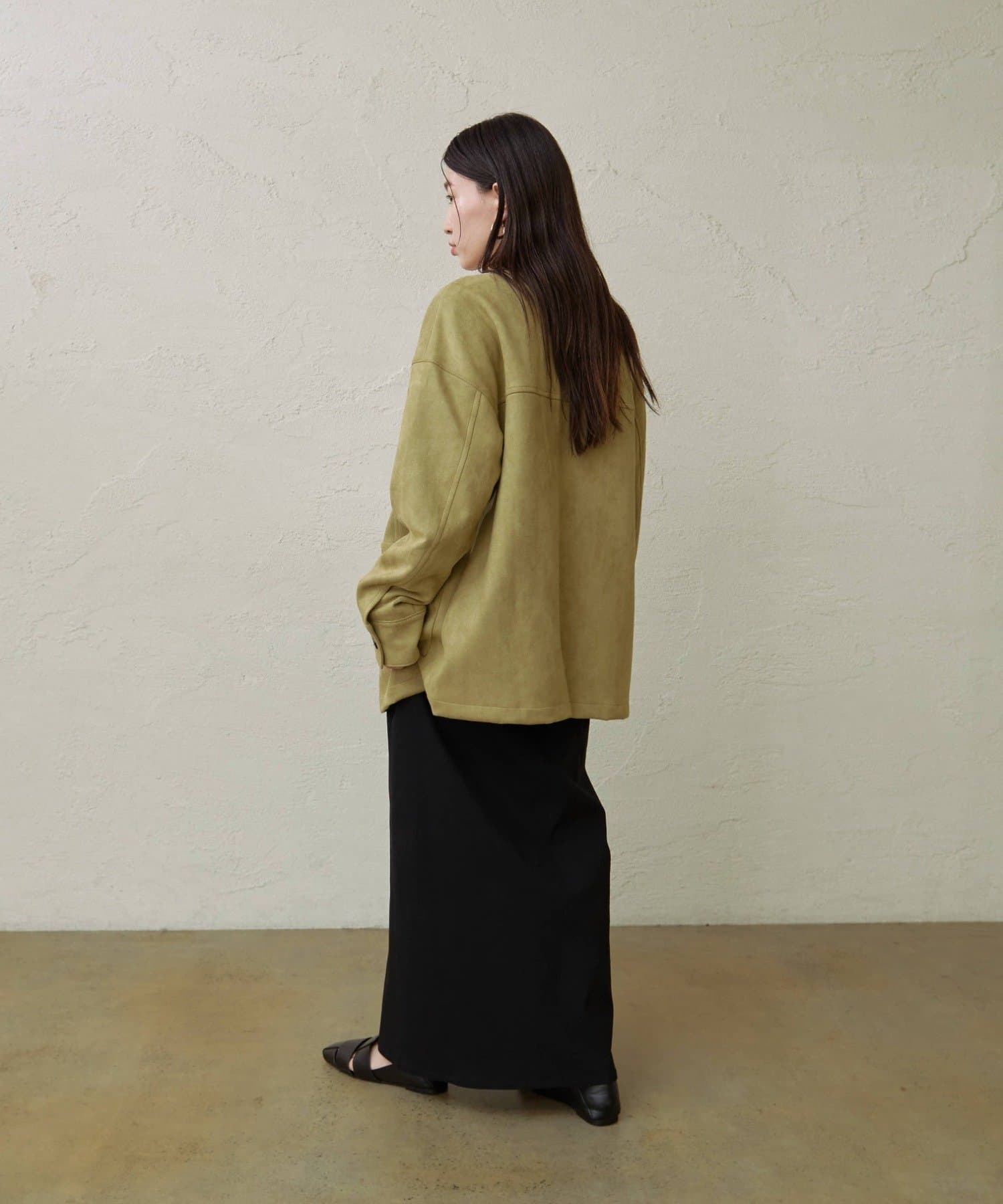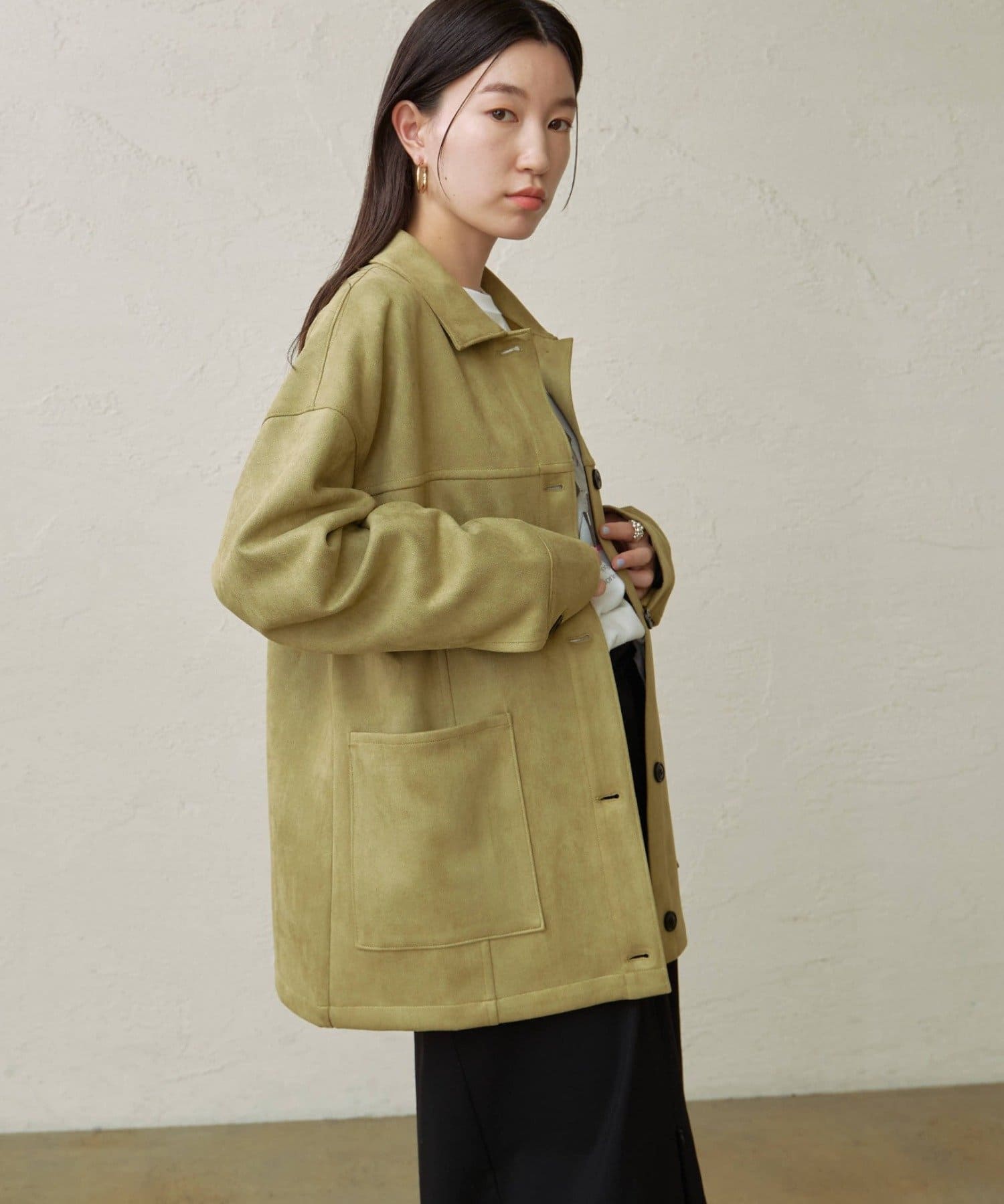 ・トレンドのスエード素材で、羽織るだけで秋らしい雰囲気のジャケット。