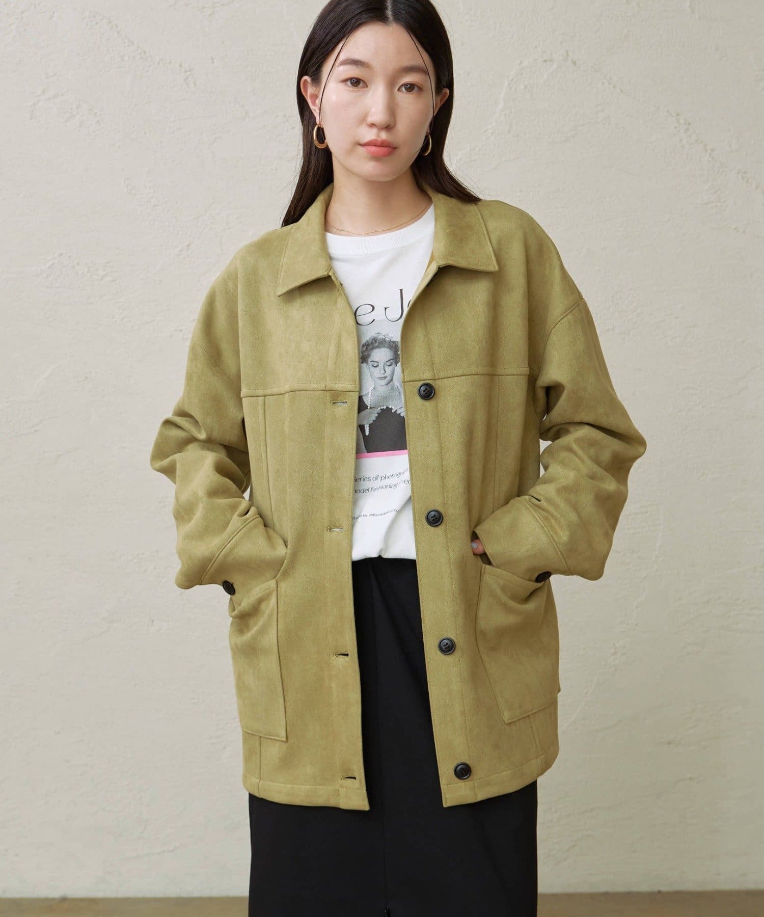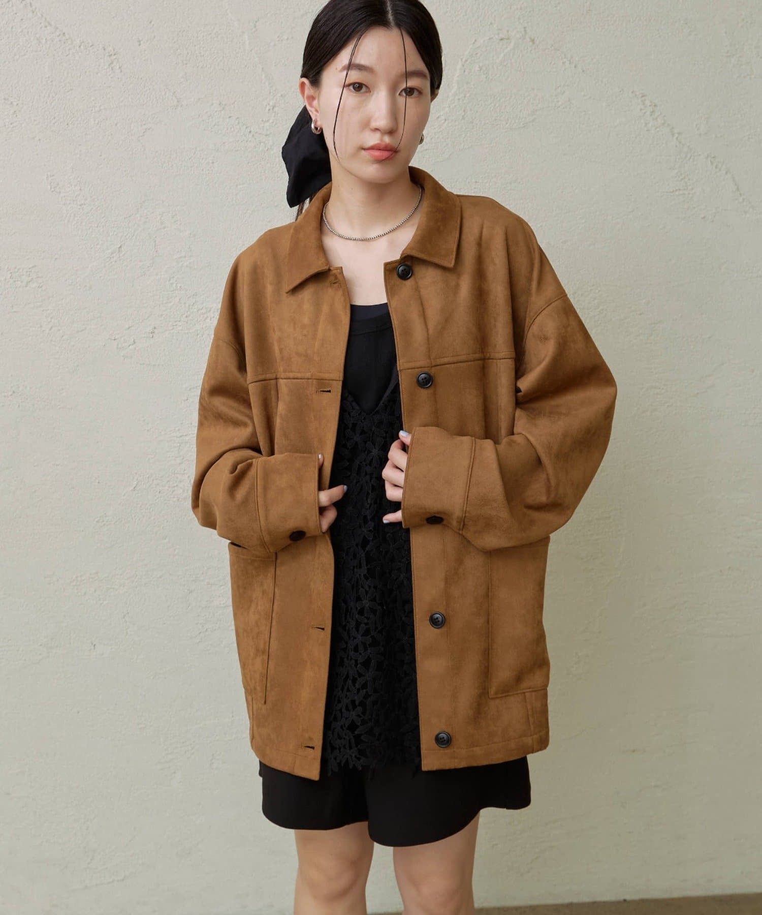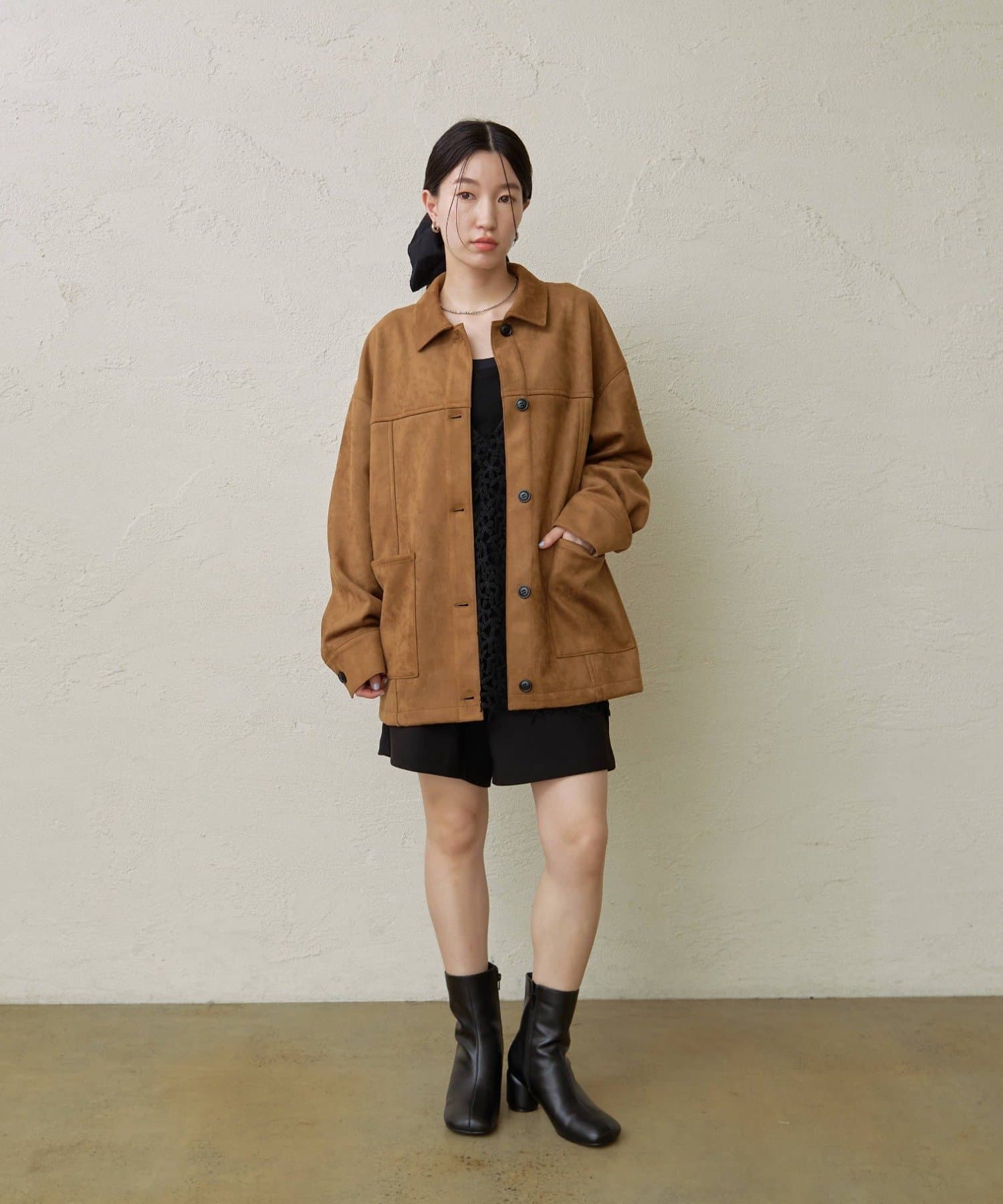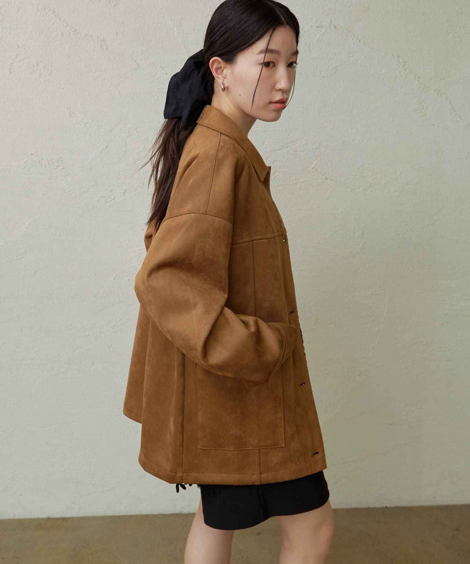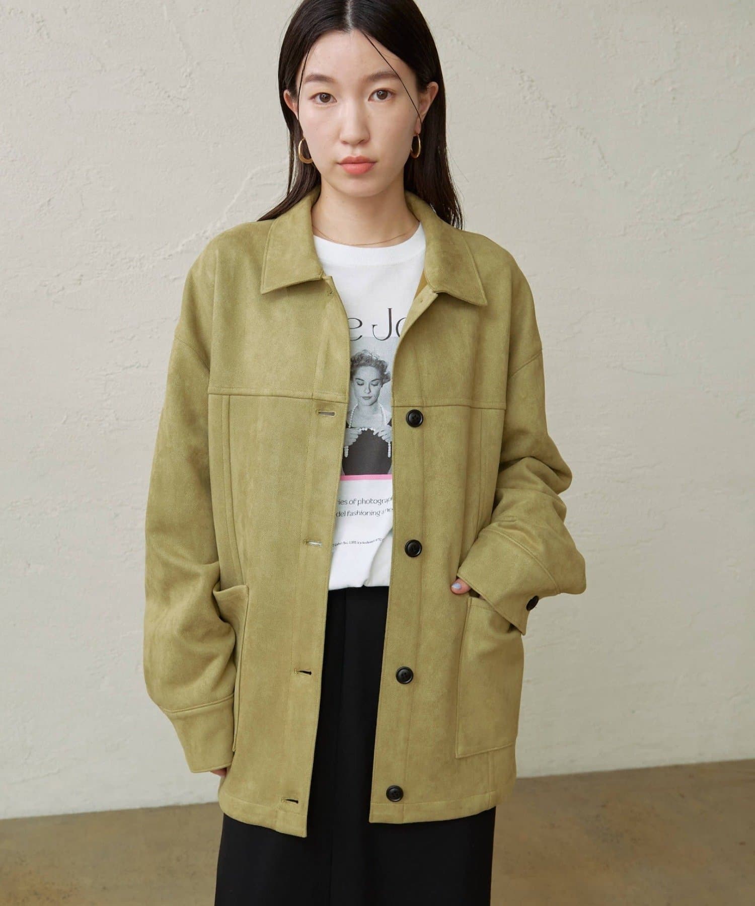 ・トレンドのスエード素材で、羽織るだけで秋らしい雰囲気のジャケット。