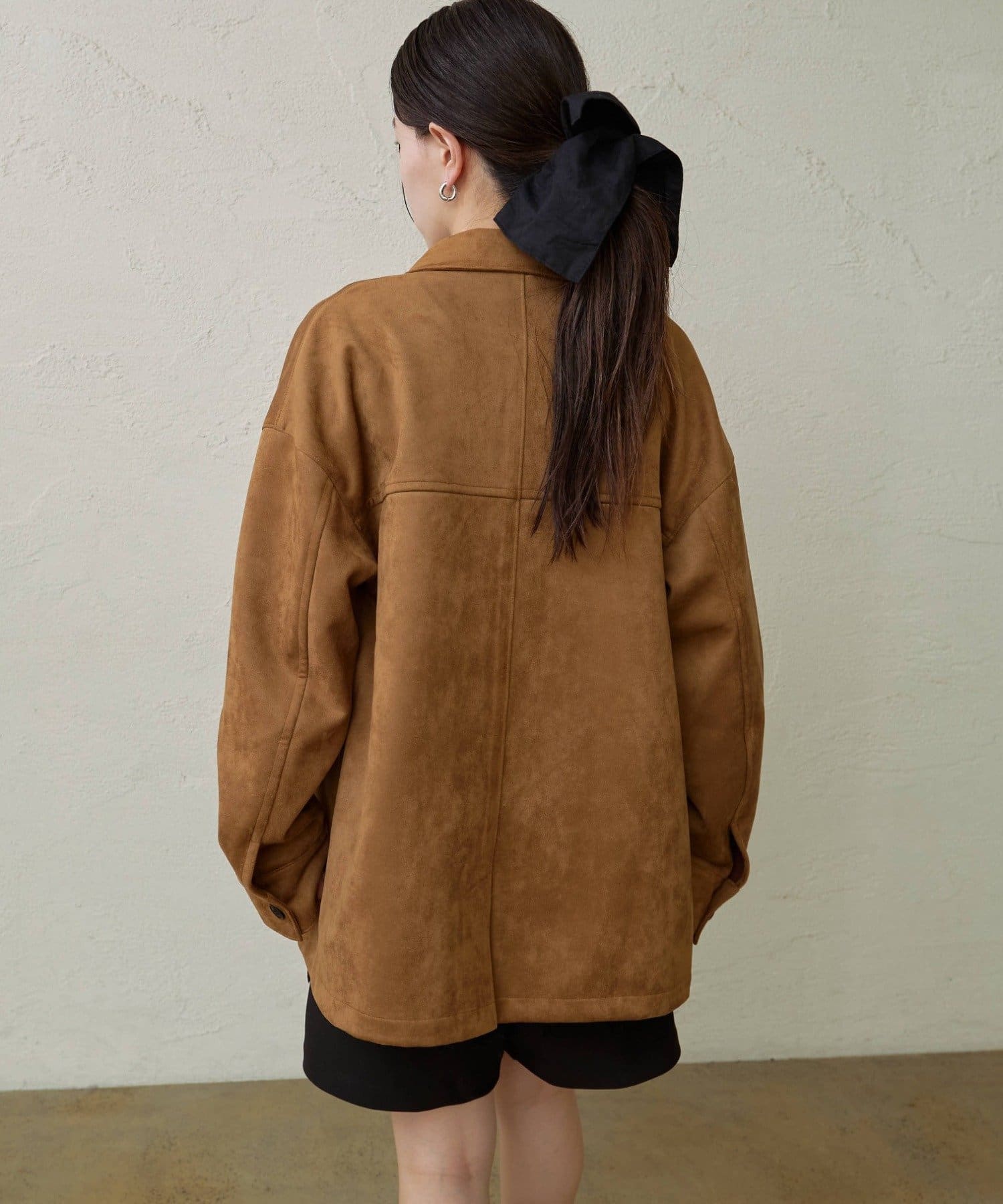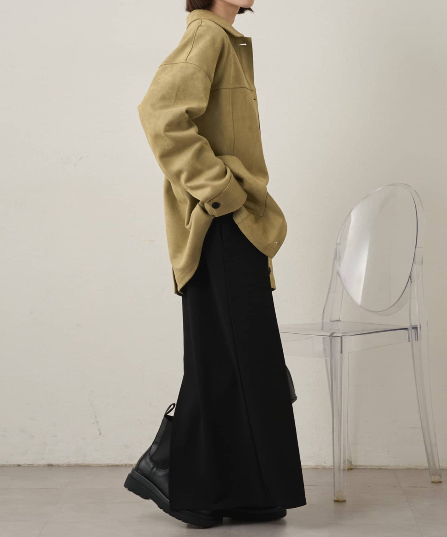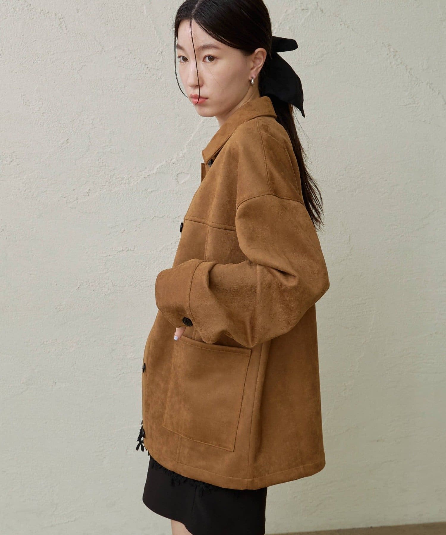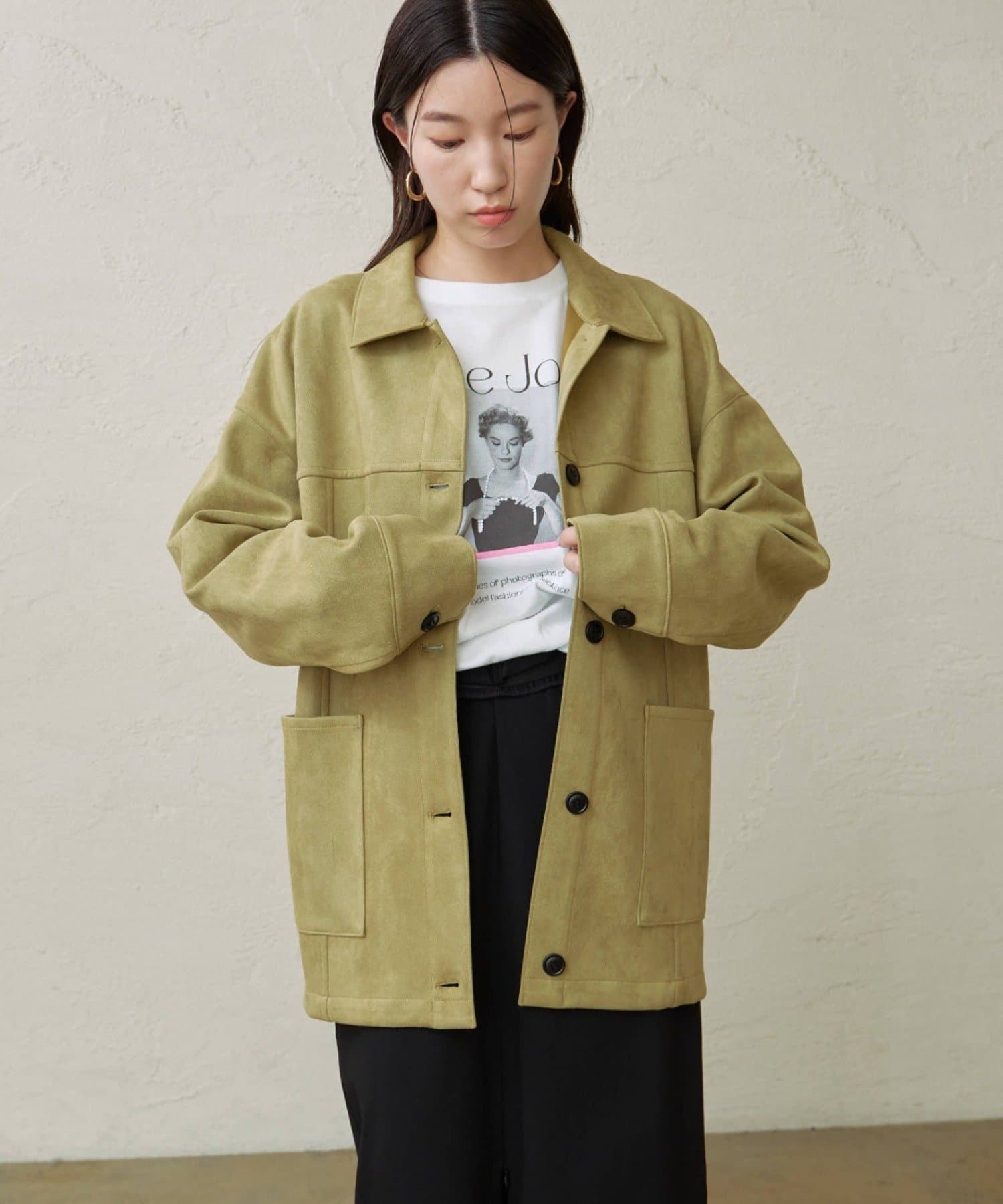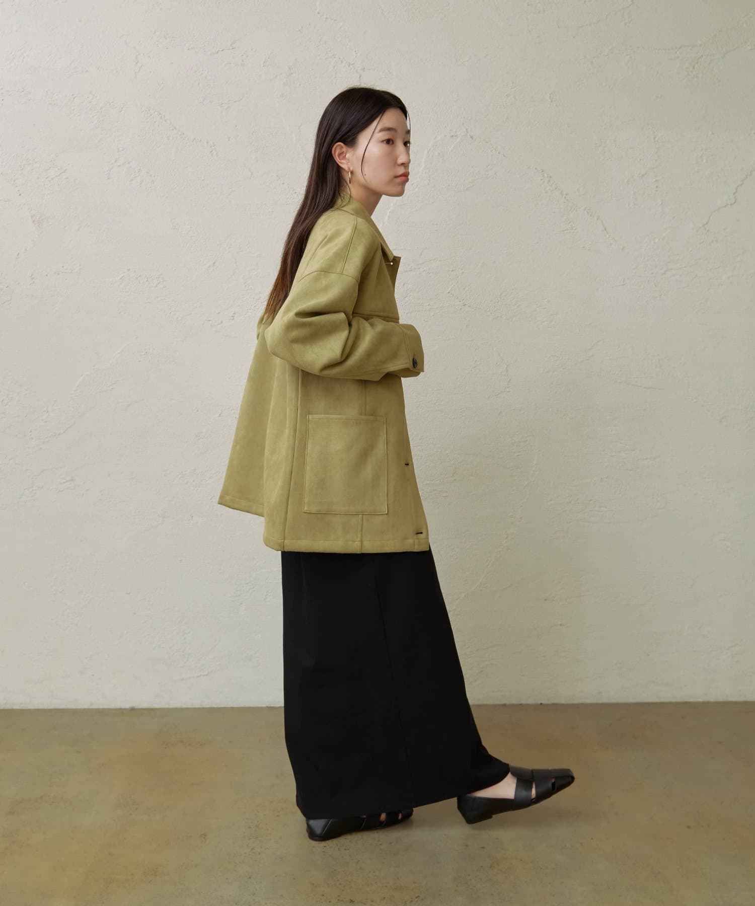 ・トレンドのスエード素材で、羽織るだけで秋らしい雰囲気のジャケット。